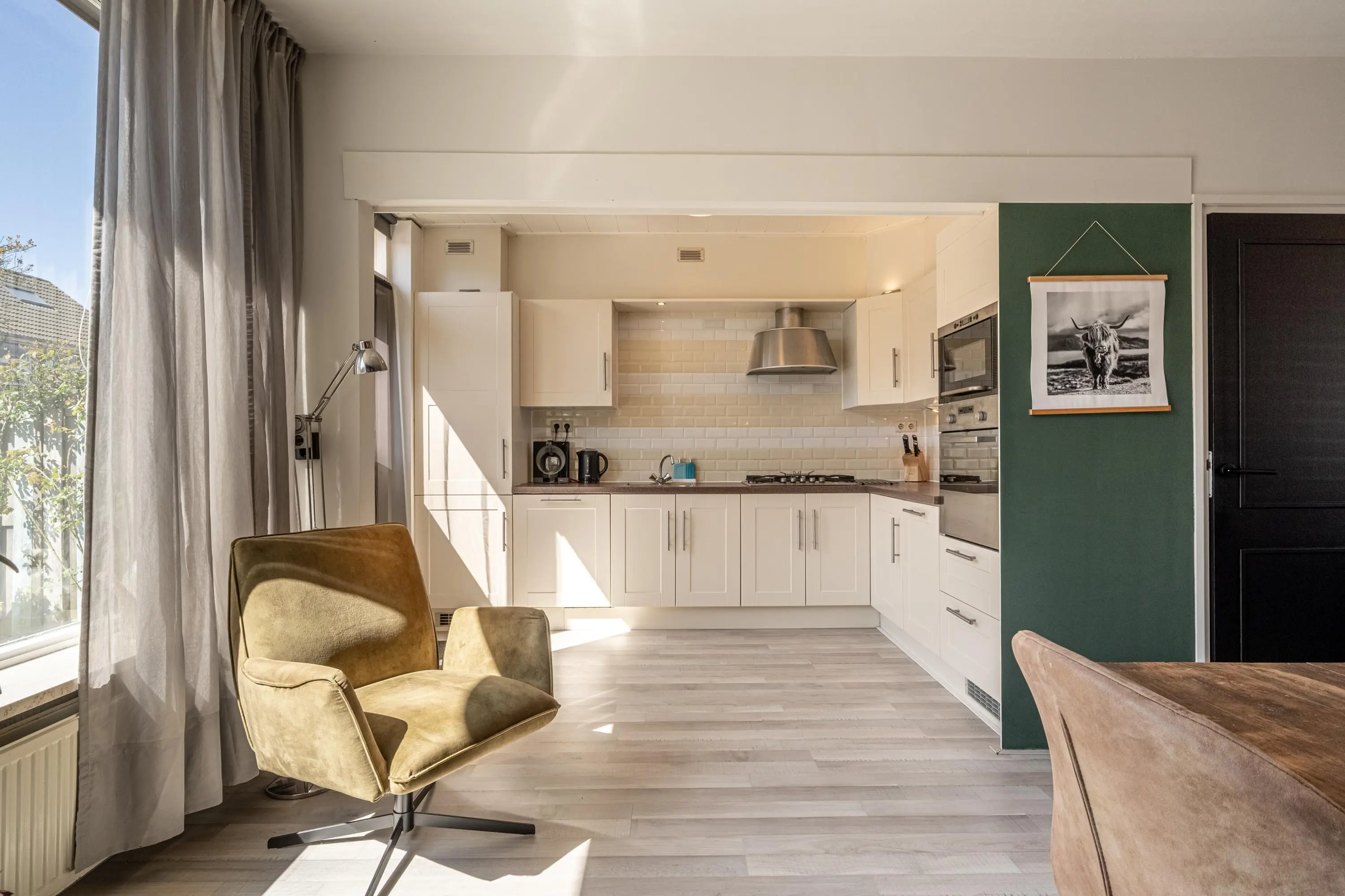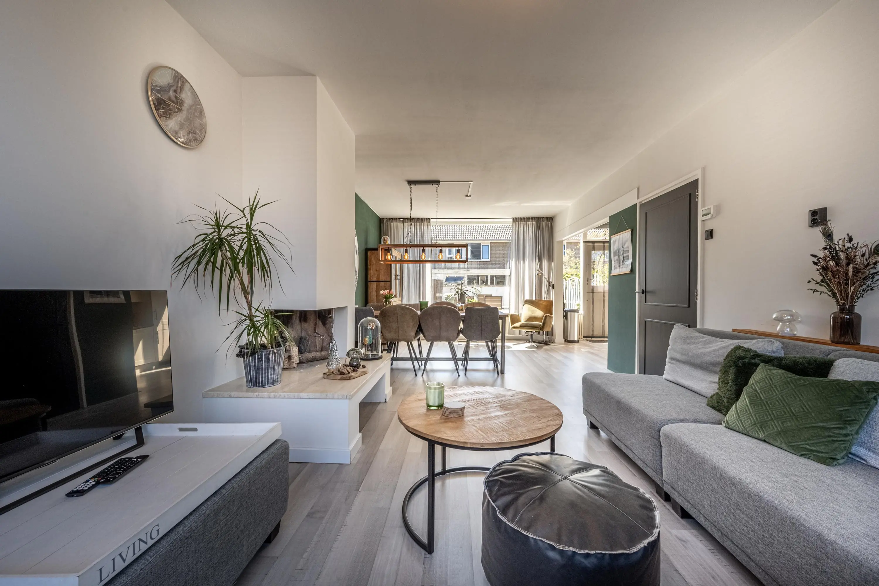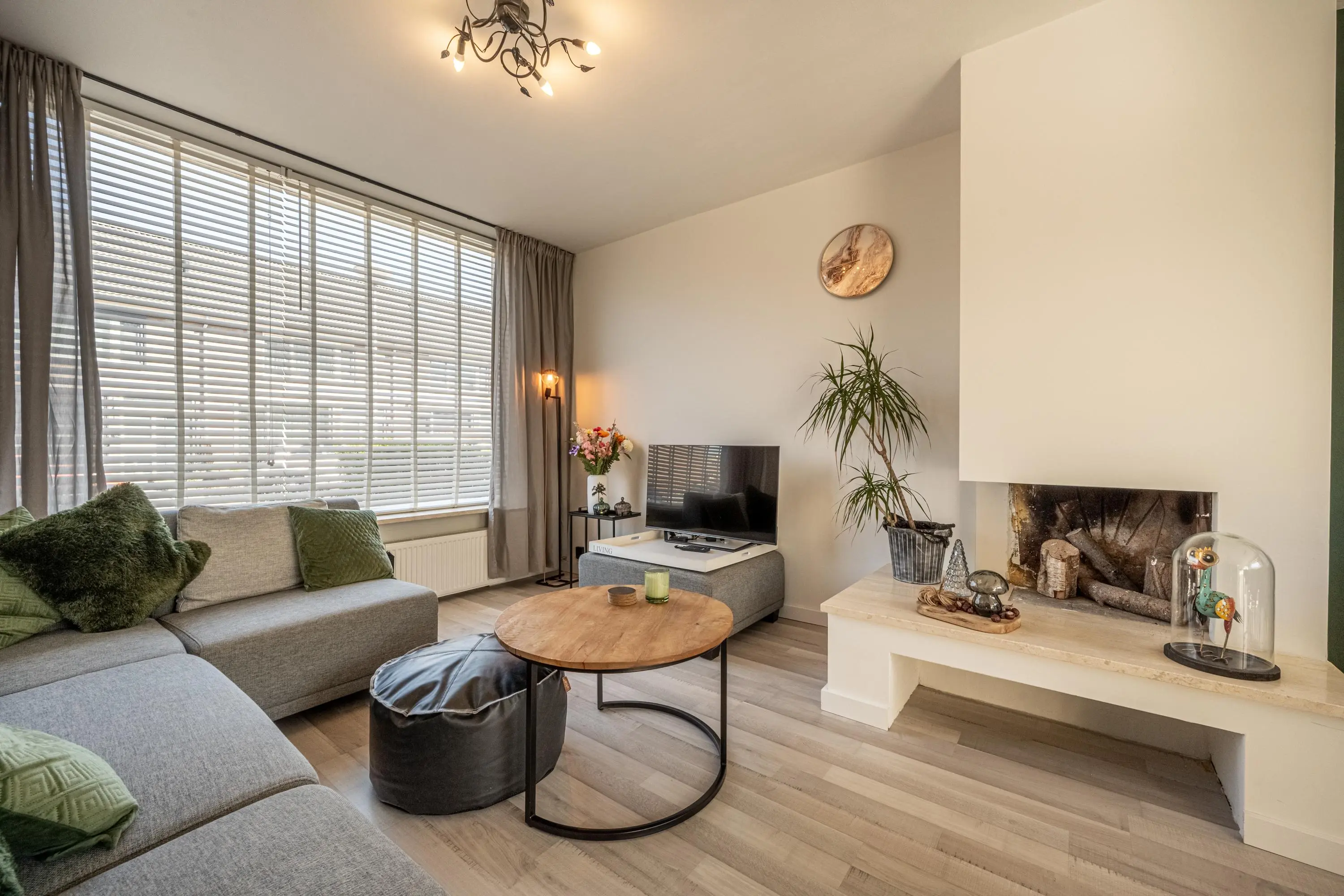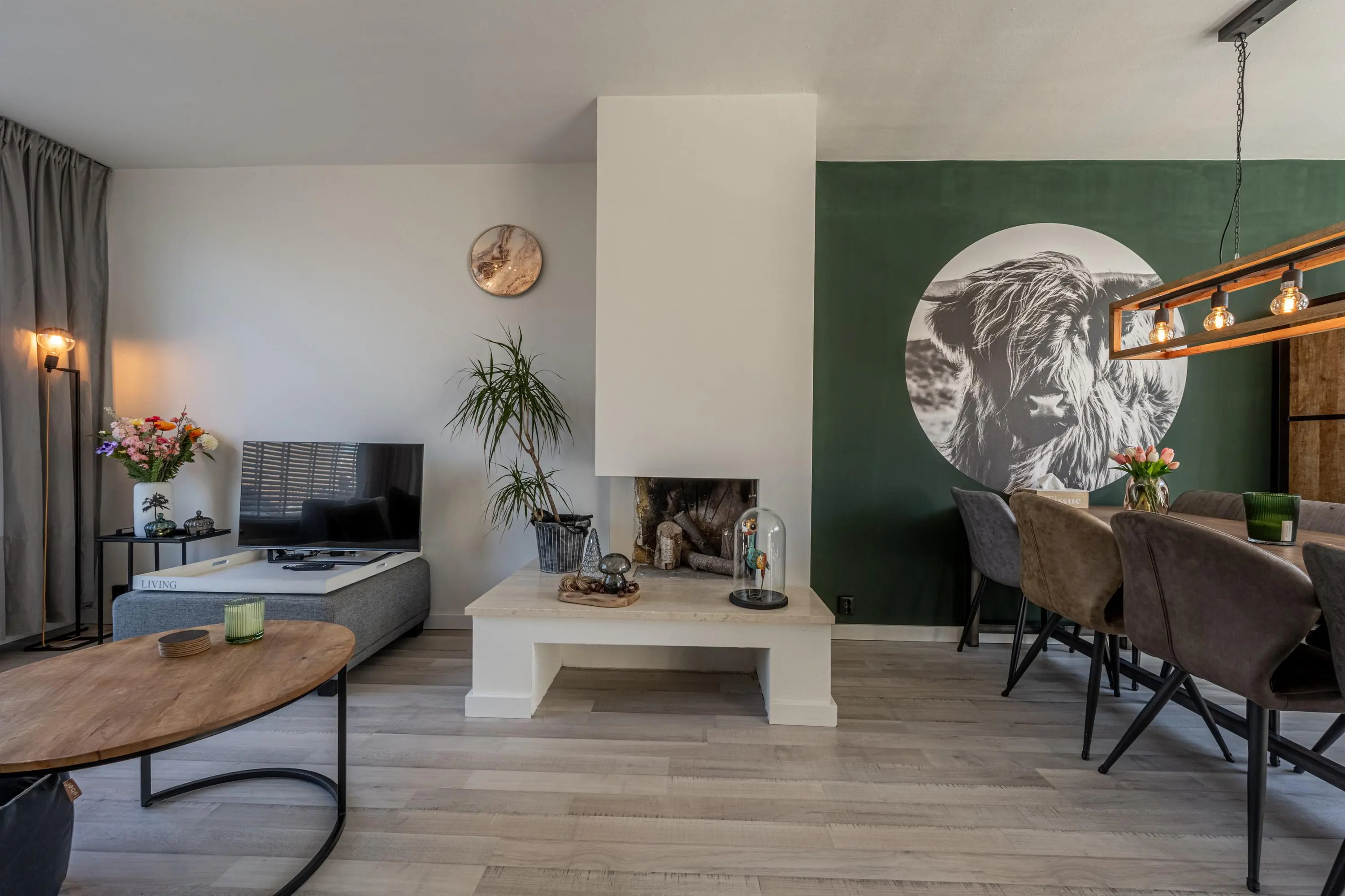 Vanuit de hal loopt u naar de woonkamer met open keuken. Dankzij de grote raampartijen aan zowel de voor- als achterzijde is de woonkamer heerlijk licht en ontstaat er een prettige, open leefruimte. De centraal geplaatste haard zorgt hierbij voor extra sfeer en warmte.