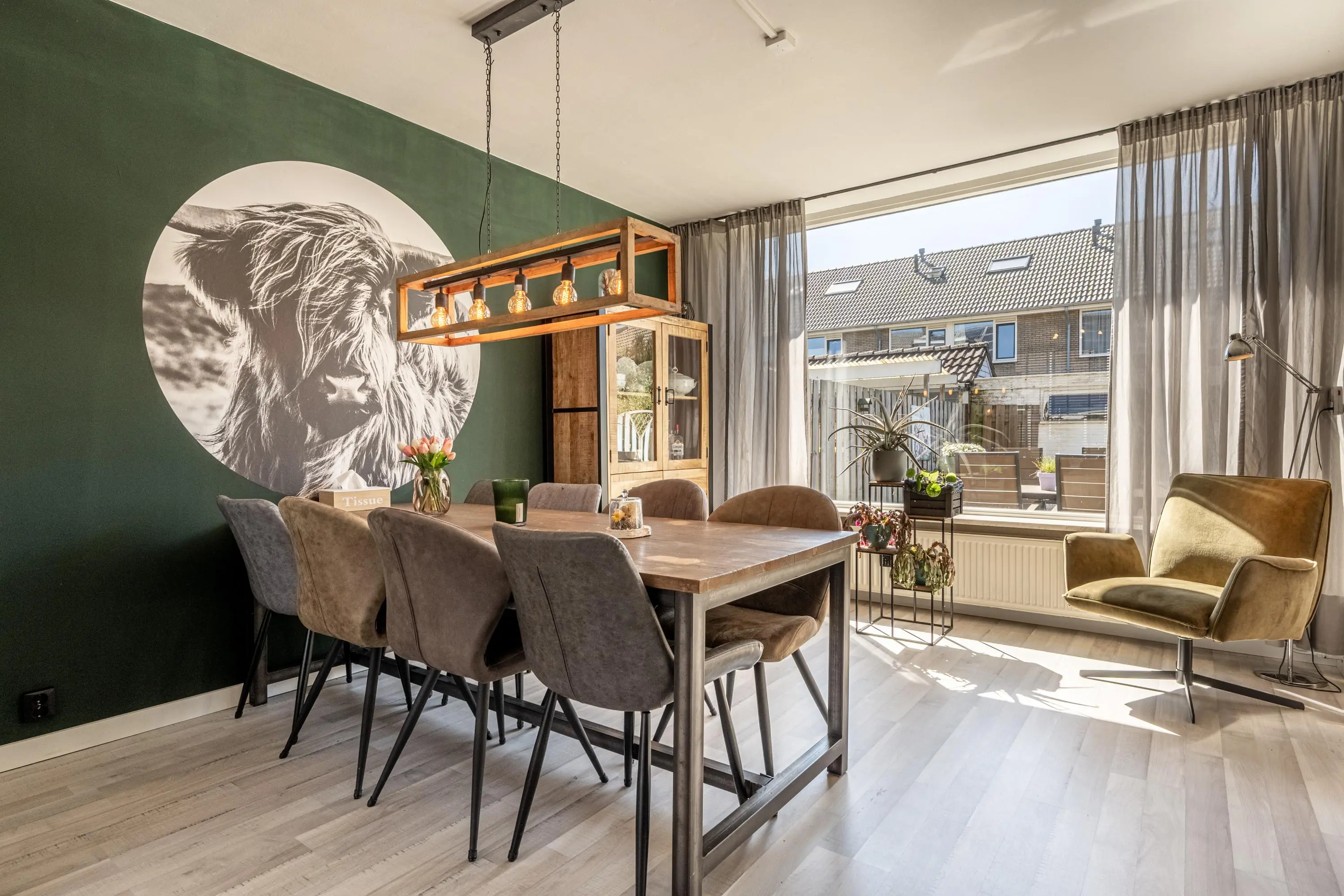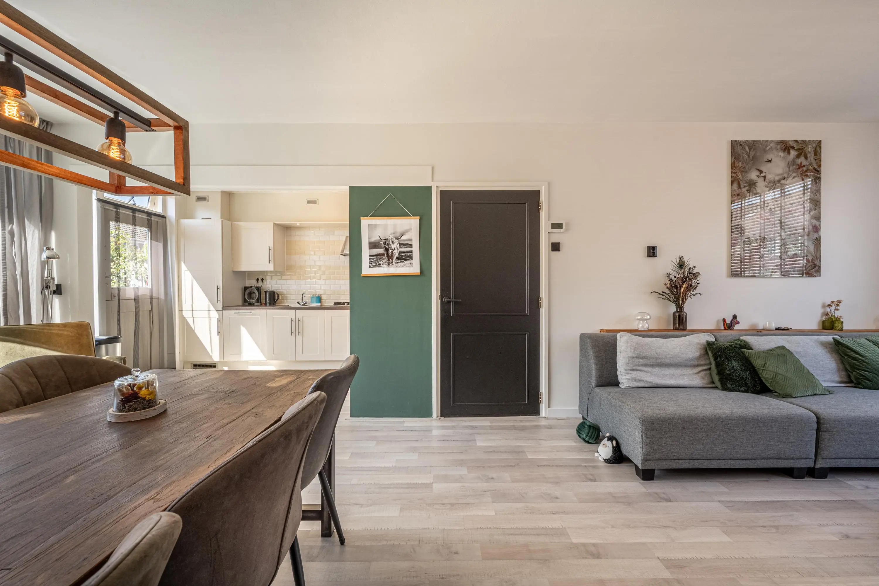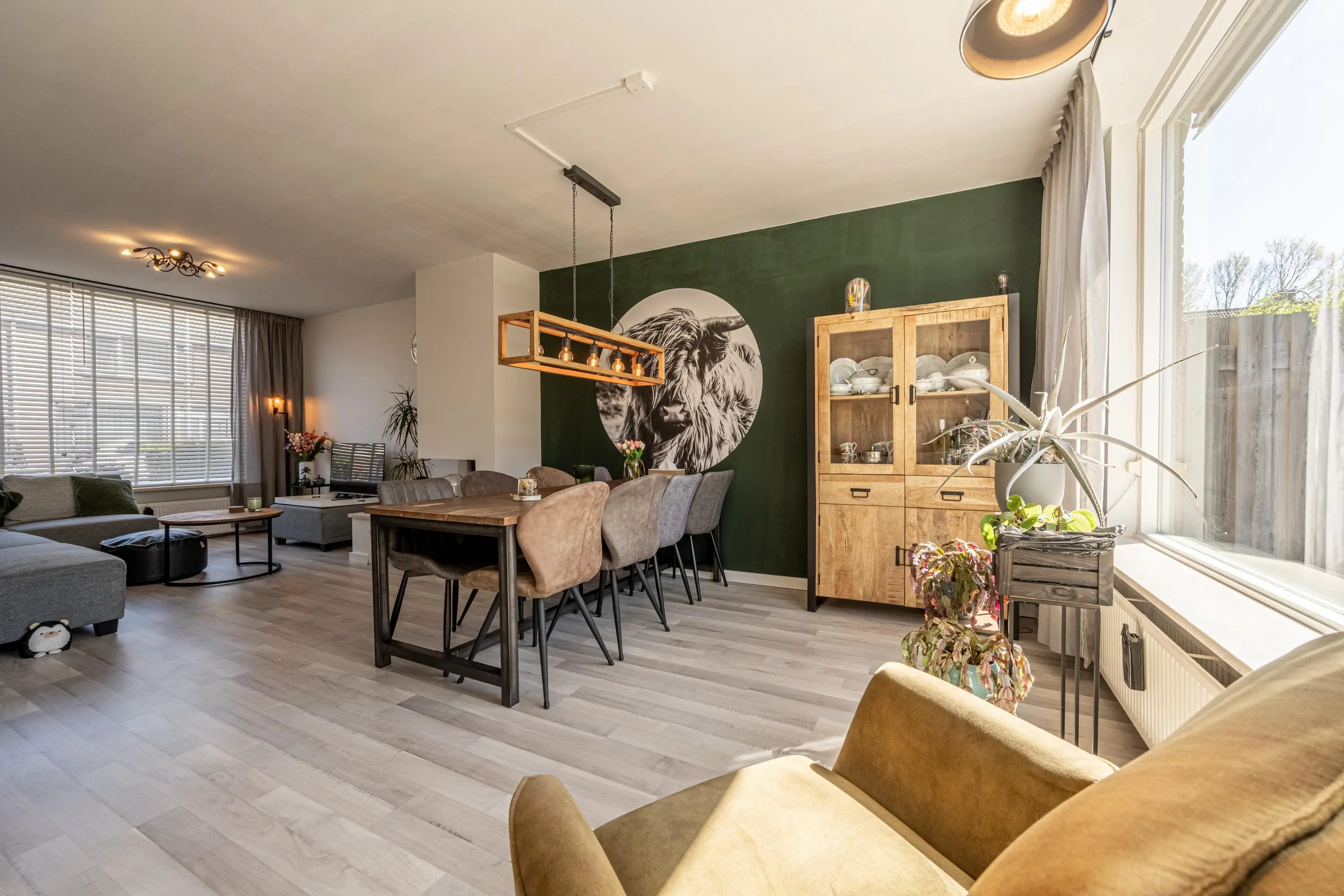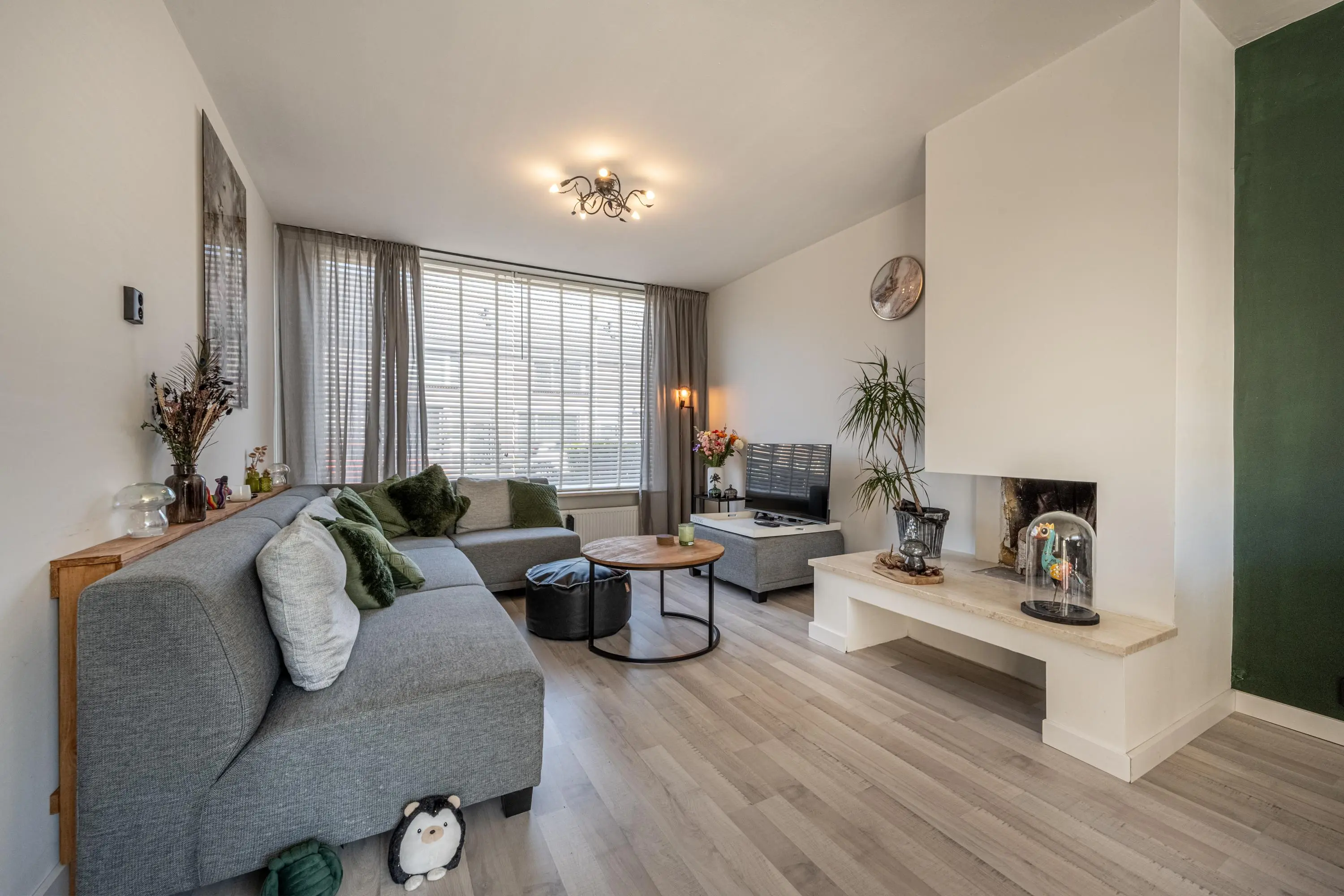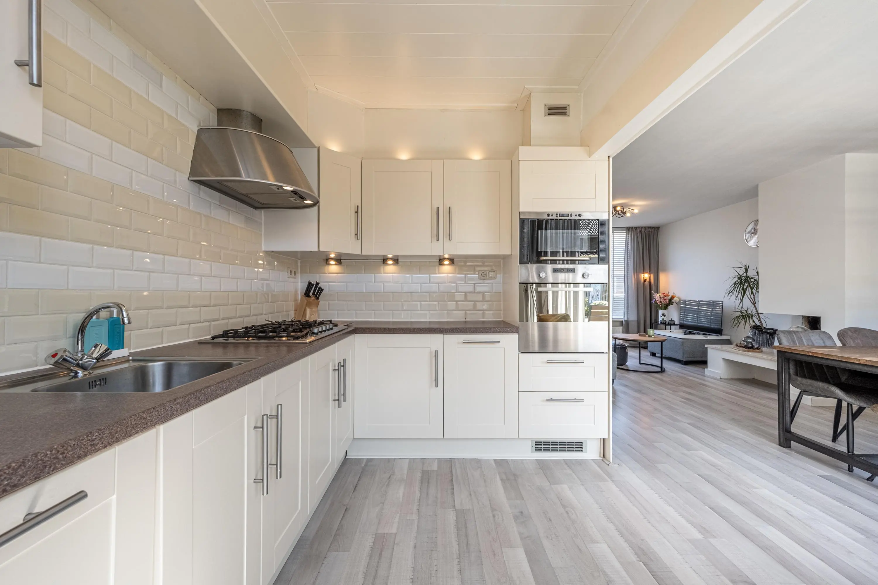 Vanuit de hal loopt u naar de woonkamer met open keuken. Dankzij de grote raampartijen aan zowel de voor- als achterzijde is de woonkamer heerlijk licht en ontstaat er een prettige, open leefruimte. De centraal geplaatste haard zorgt hierbij voor extra sfeer en warmte.