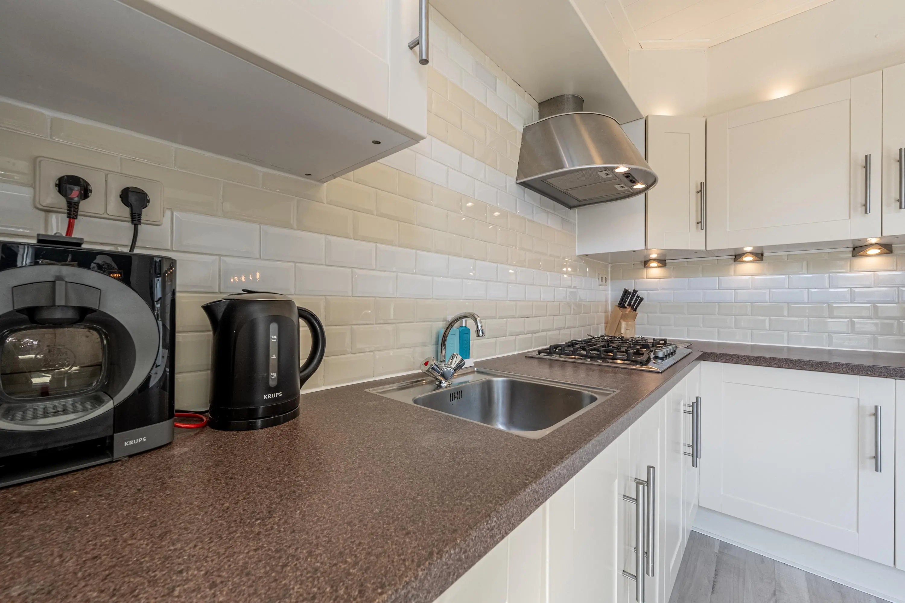 De keuken bevindt zich aan de achterzijde en is uitgevoerd in een praktische L-opstelling. Deze is uitgerust met diverse inbouwapparatuur, waaronder een koel-/vriescombinatie, vaatwasser, 5-pits gaskookplaat, afzuigkap, magnetron en oven.