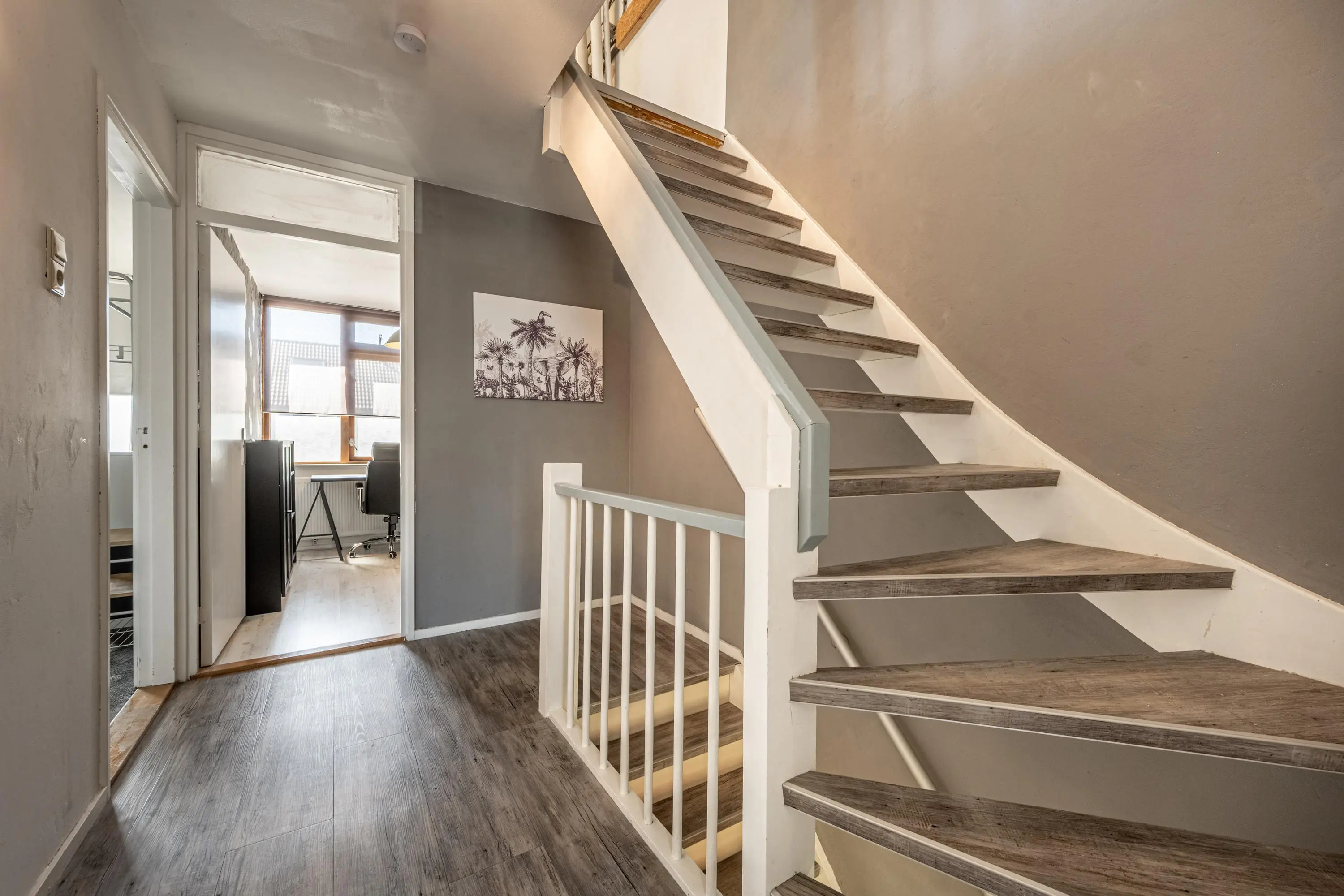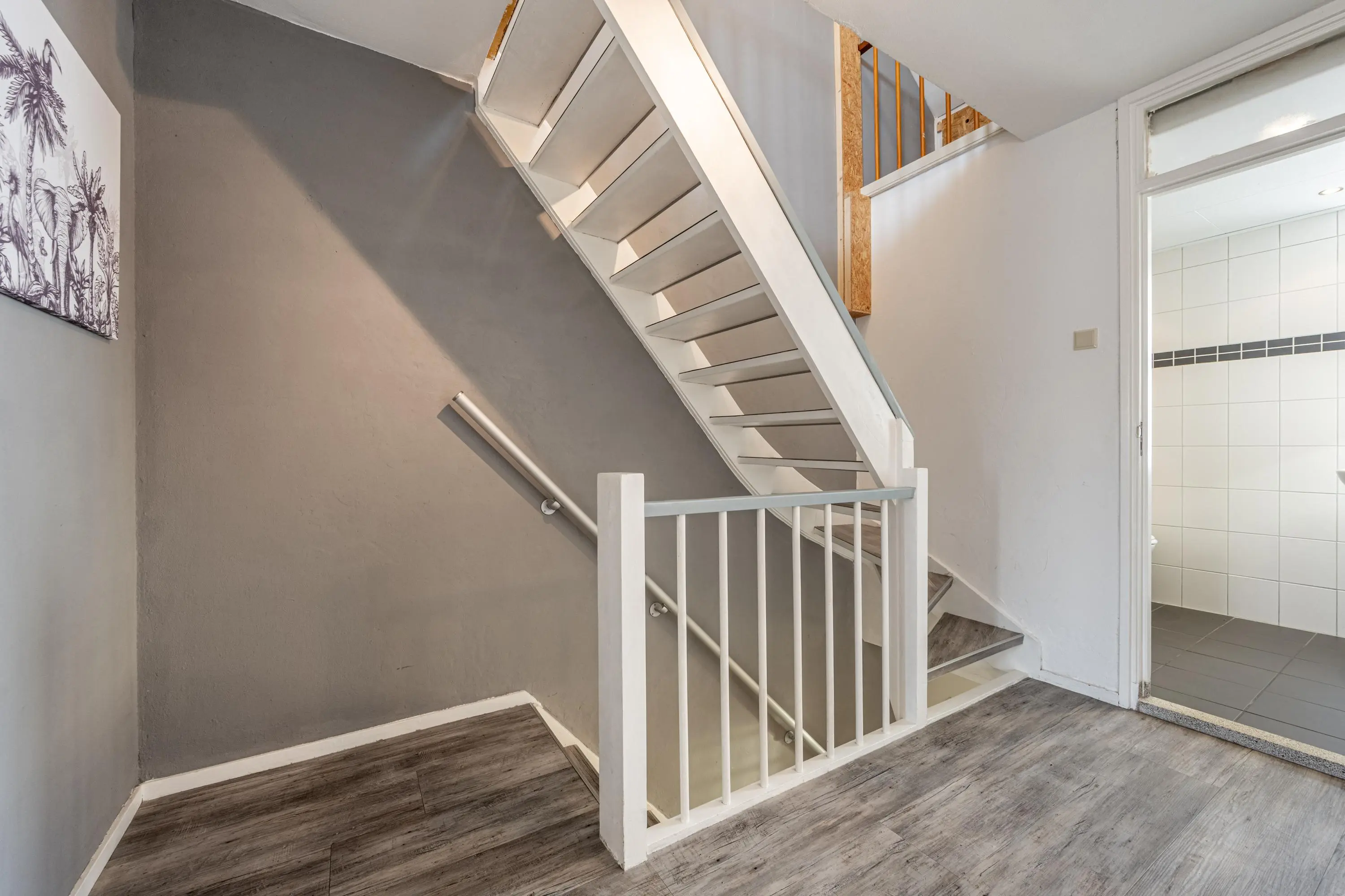 Entree/hal met meterkast, trapopgang met praktische trapkast en een volledig betegelde toiletruimte met fonteintje.