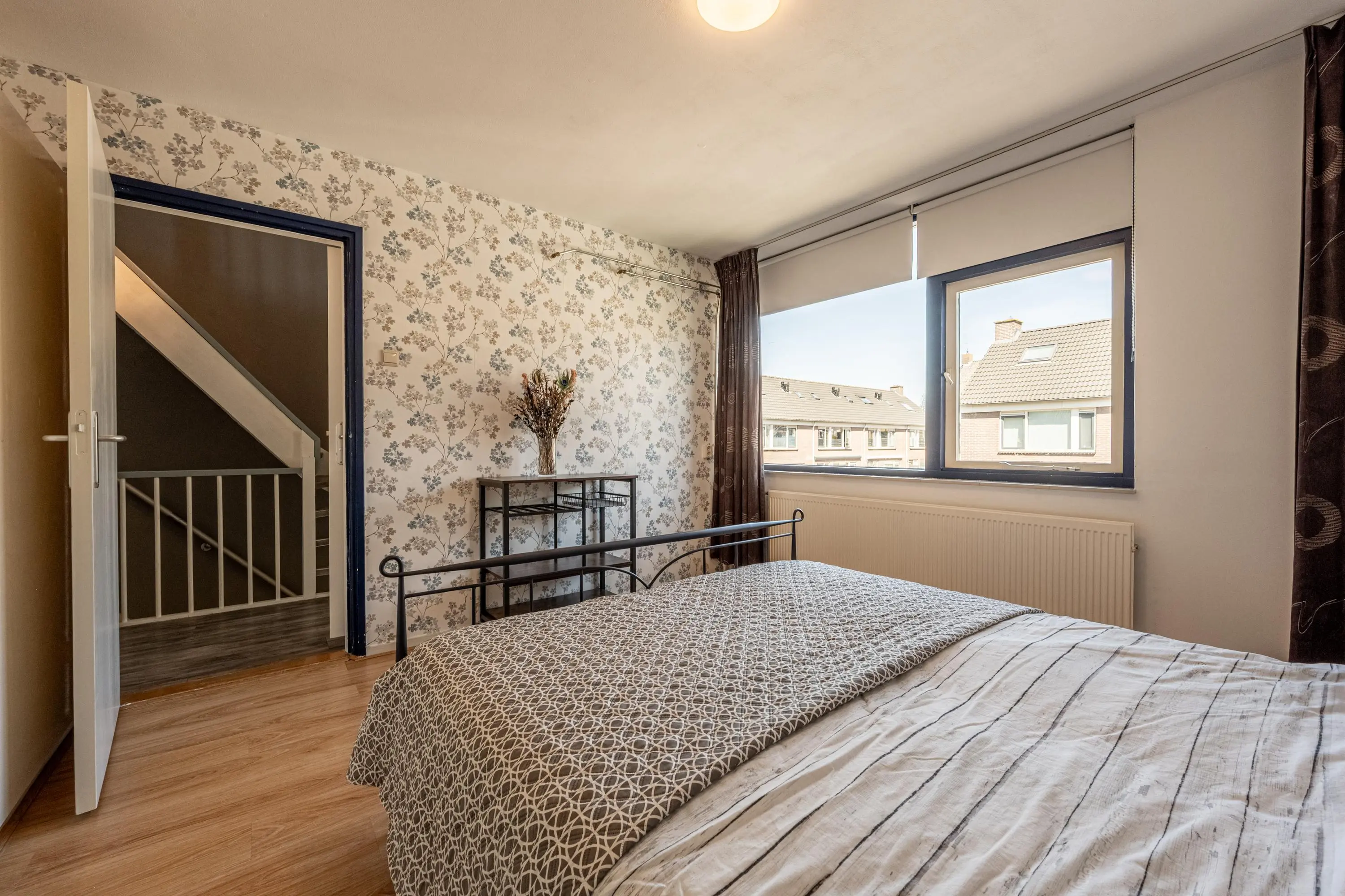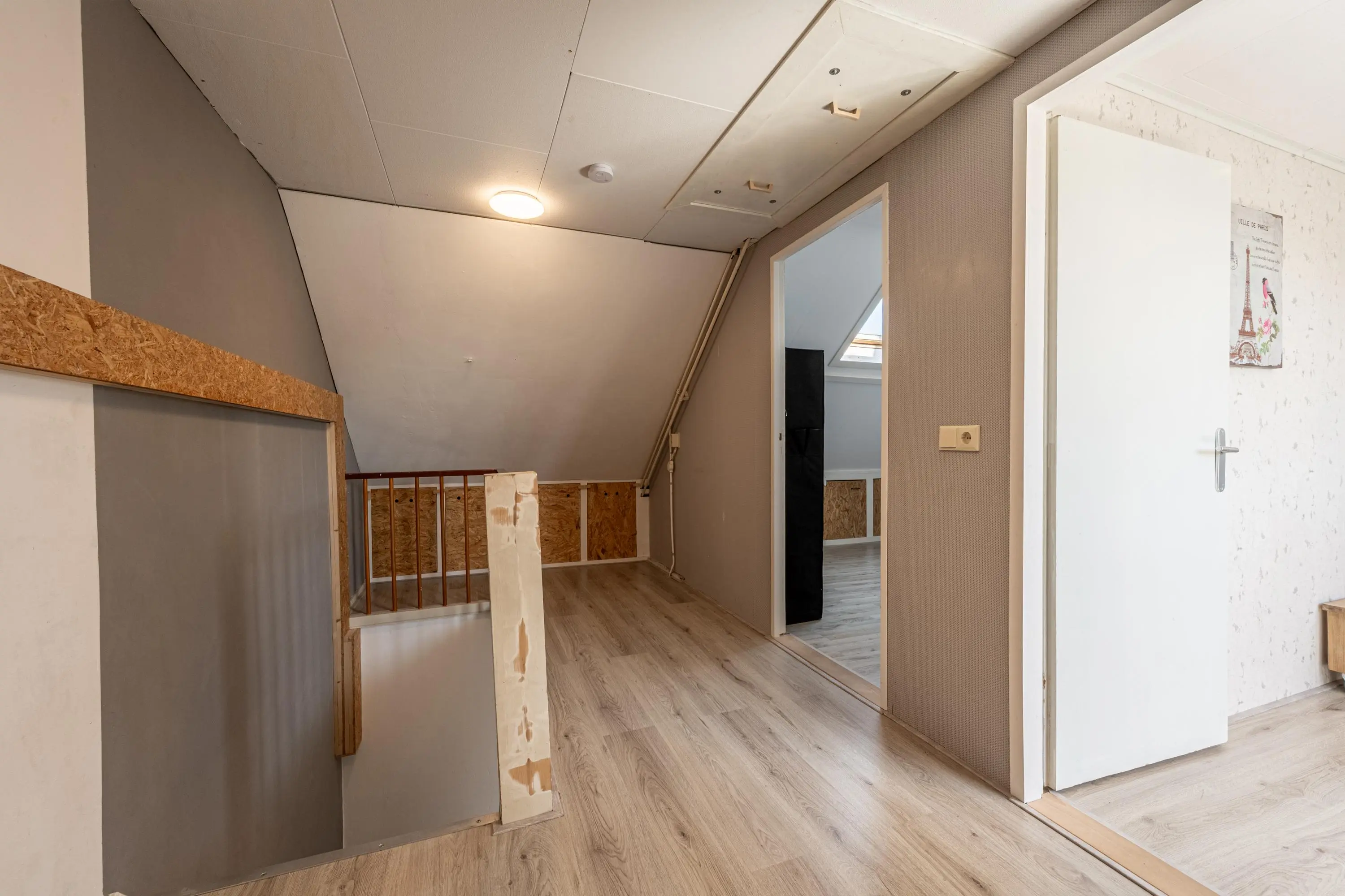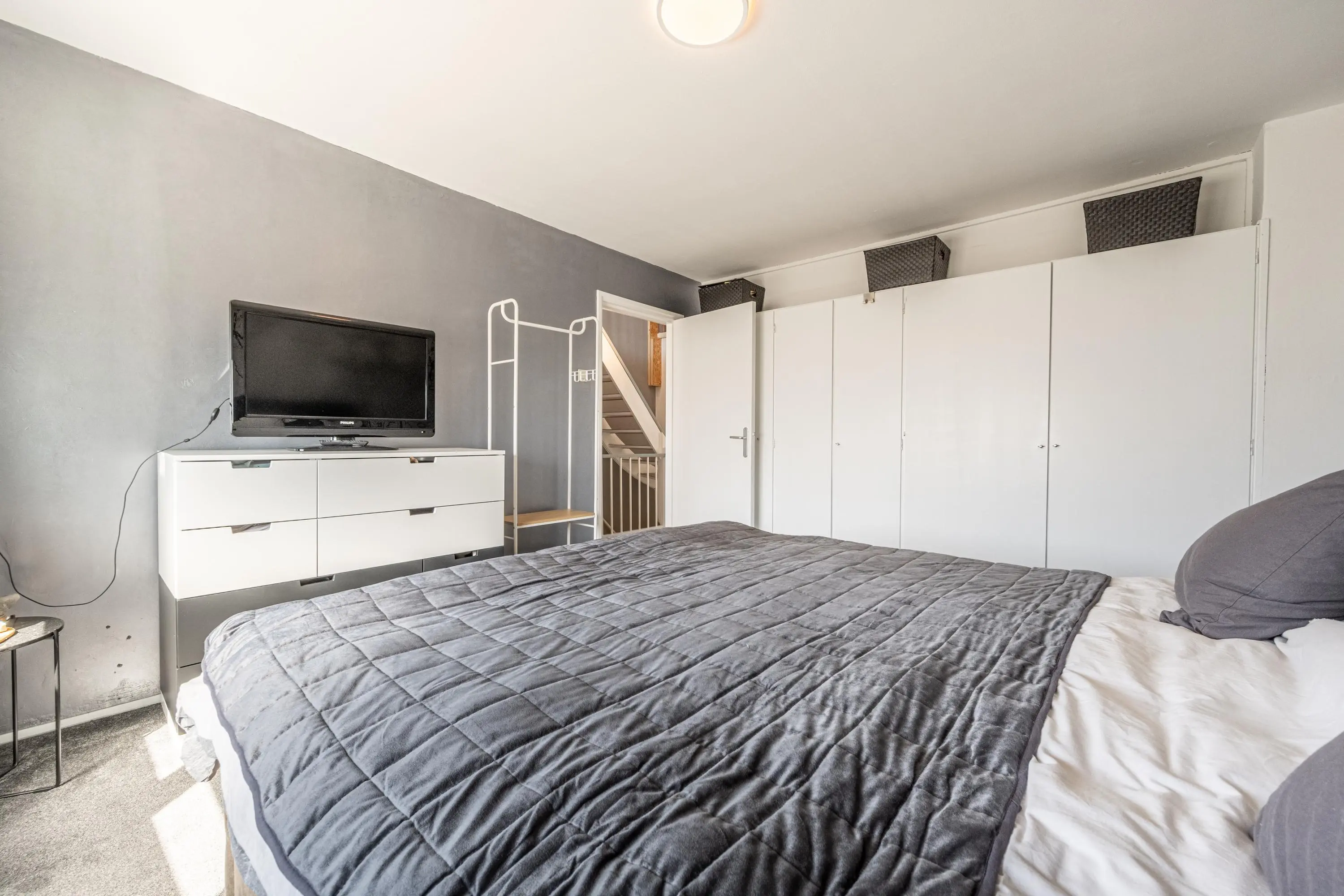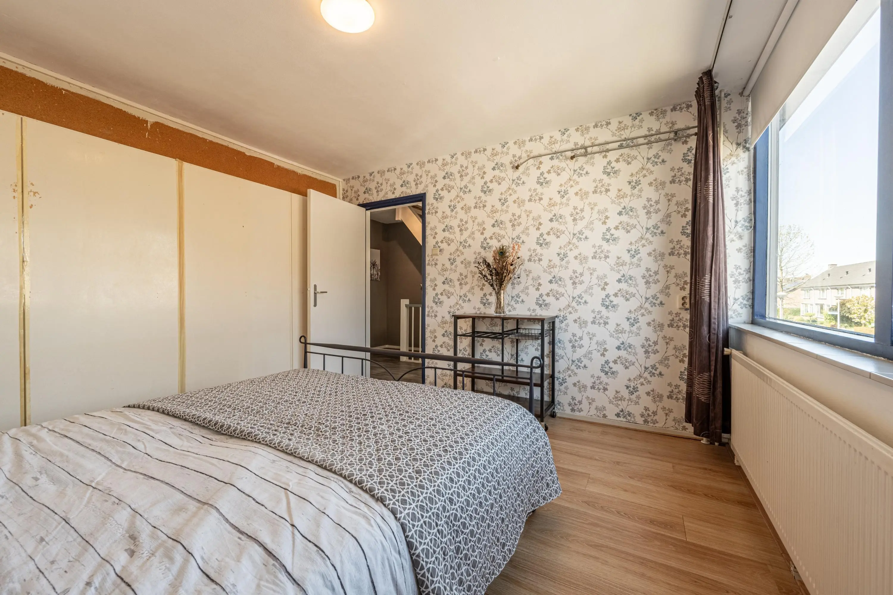 De overloop geeft toegang tot drie slaapkamers en de badkamer. De grootste slaapkamer is voorzien van handige inbouwkasten met volop bergruimte.