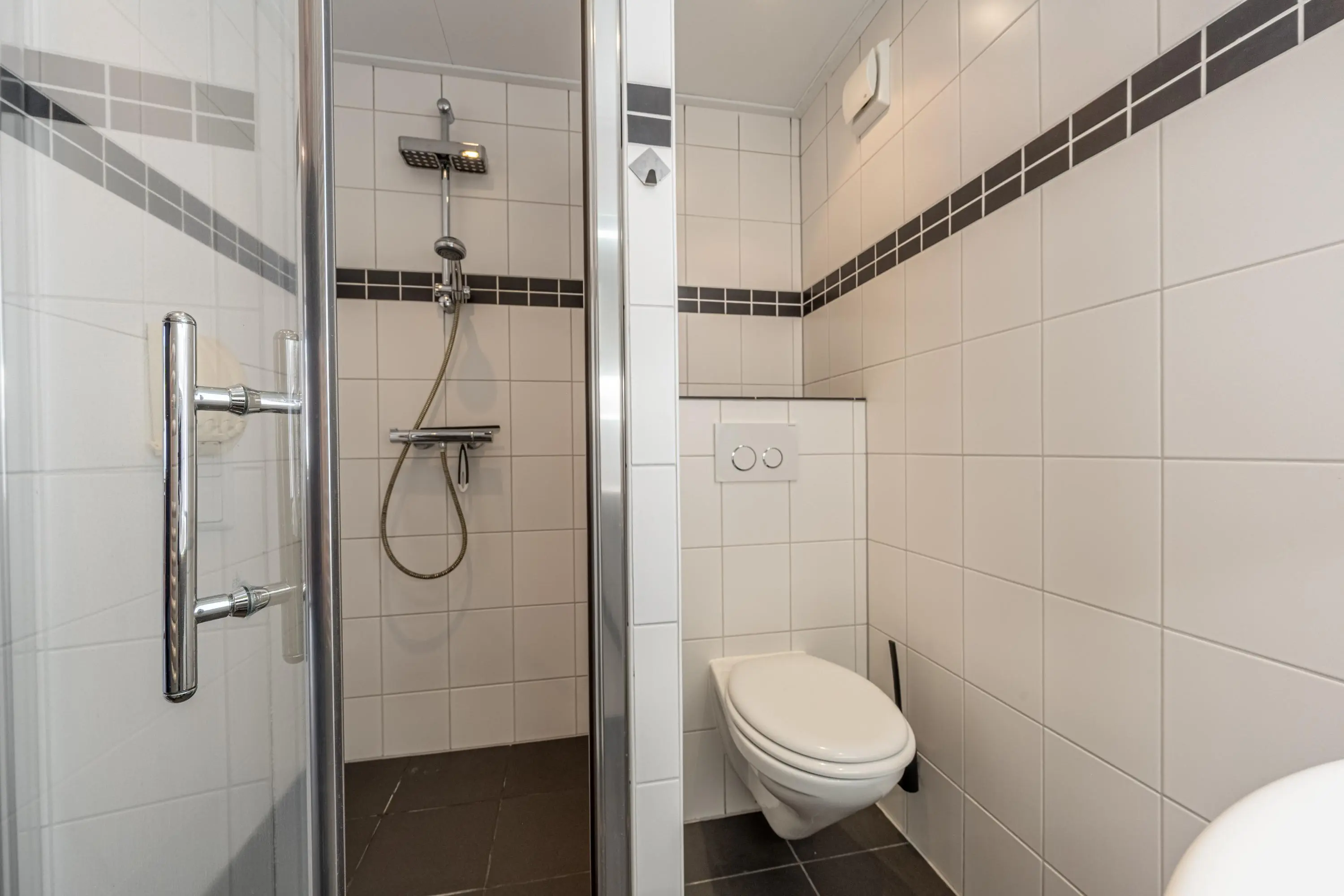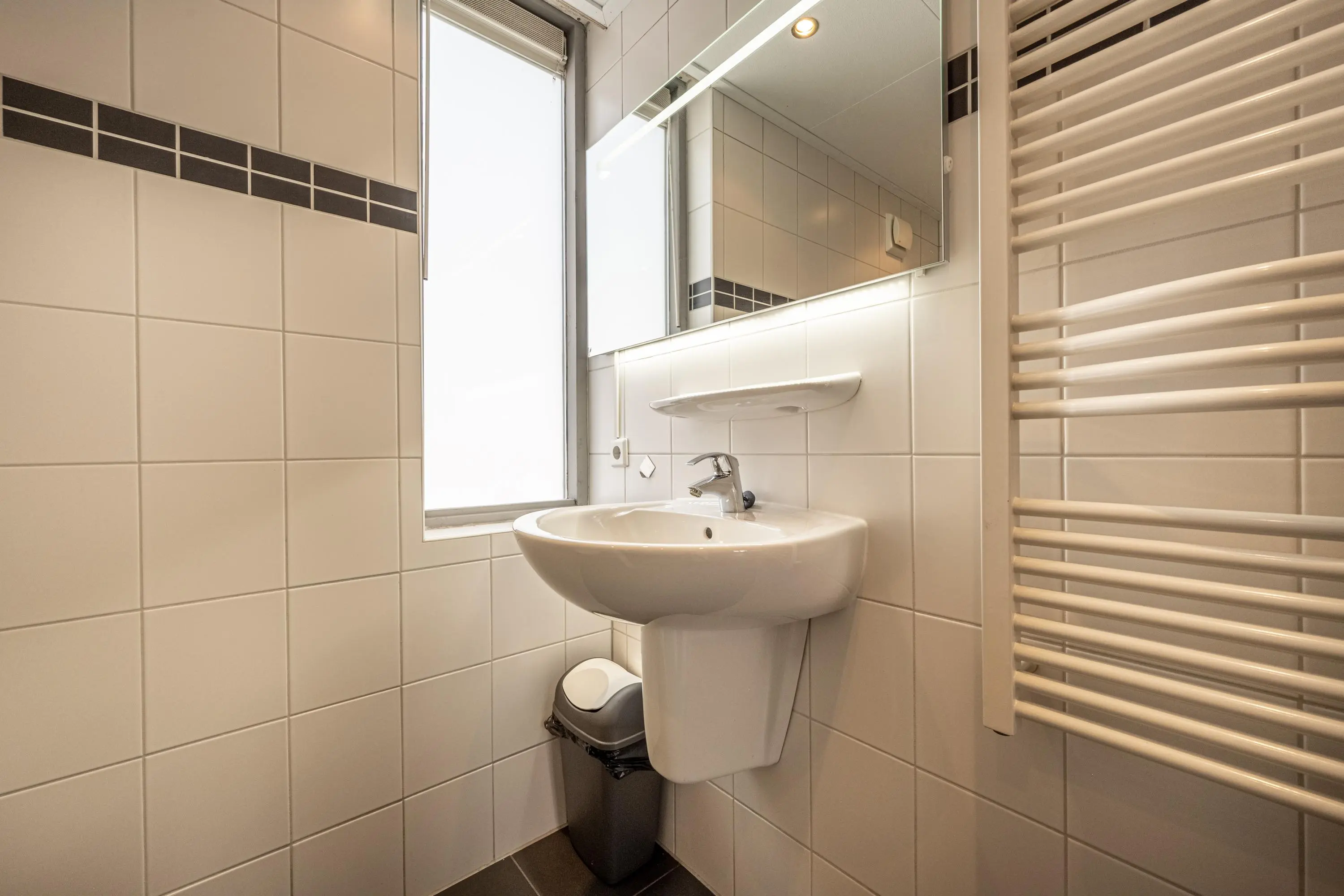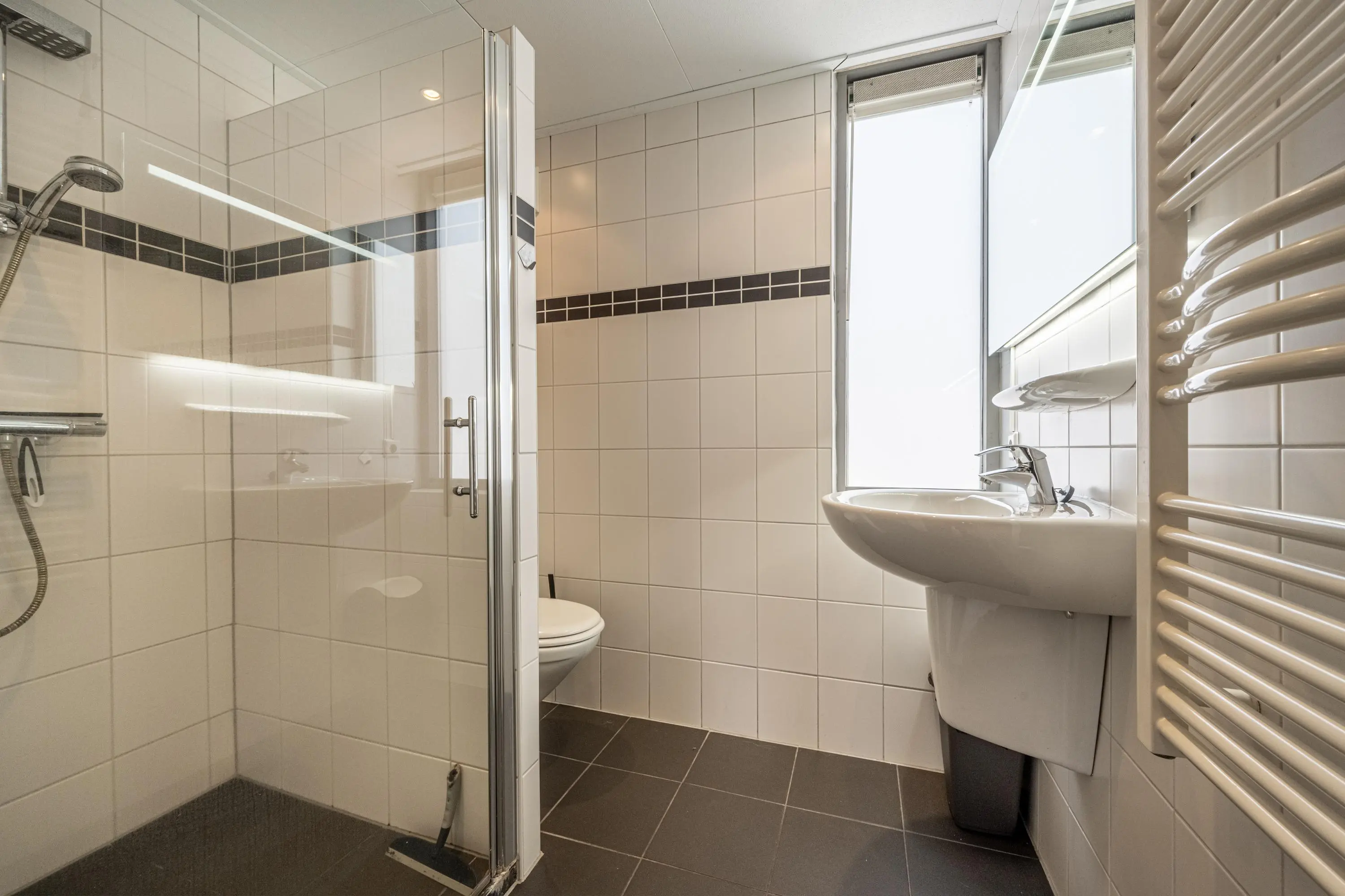 De badkamer is volledig betegeld en ingericht met een douchecabine, zwevend toilet, wastafel en designradiator.