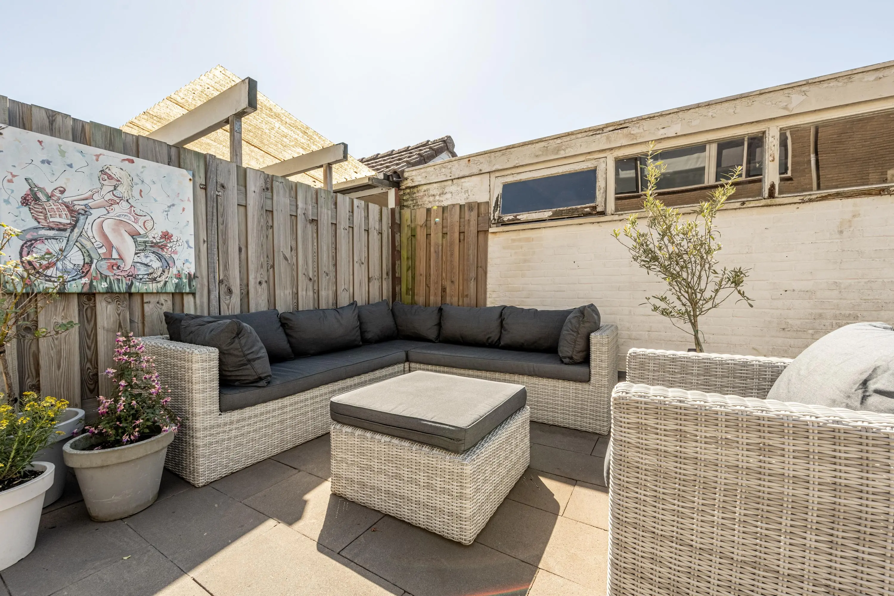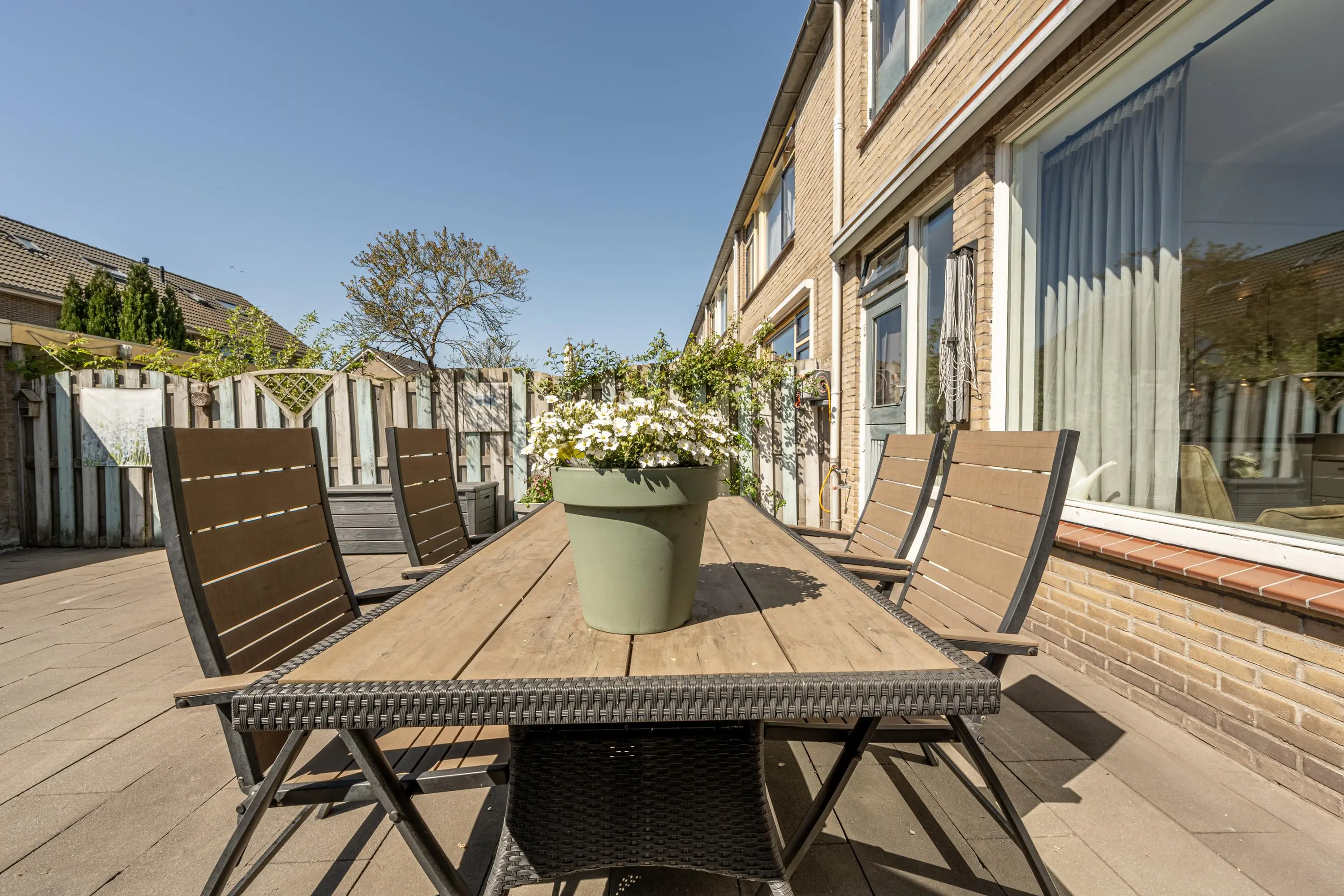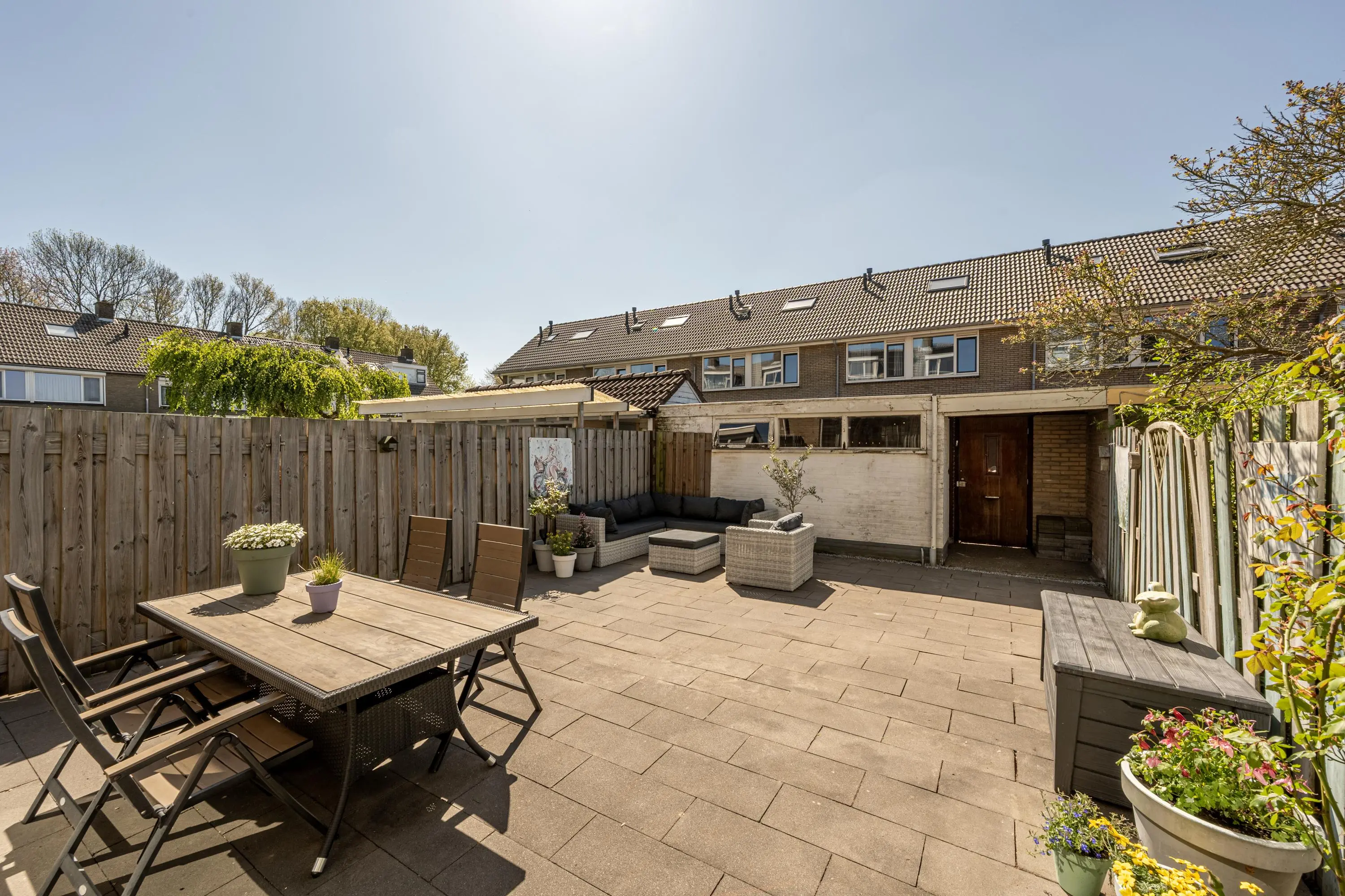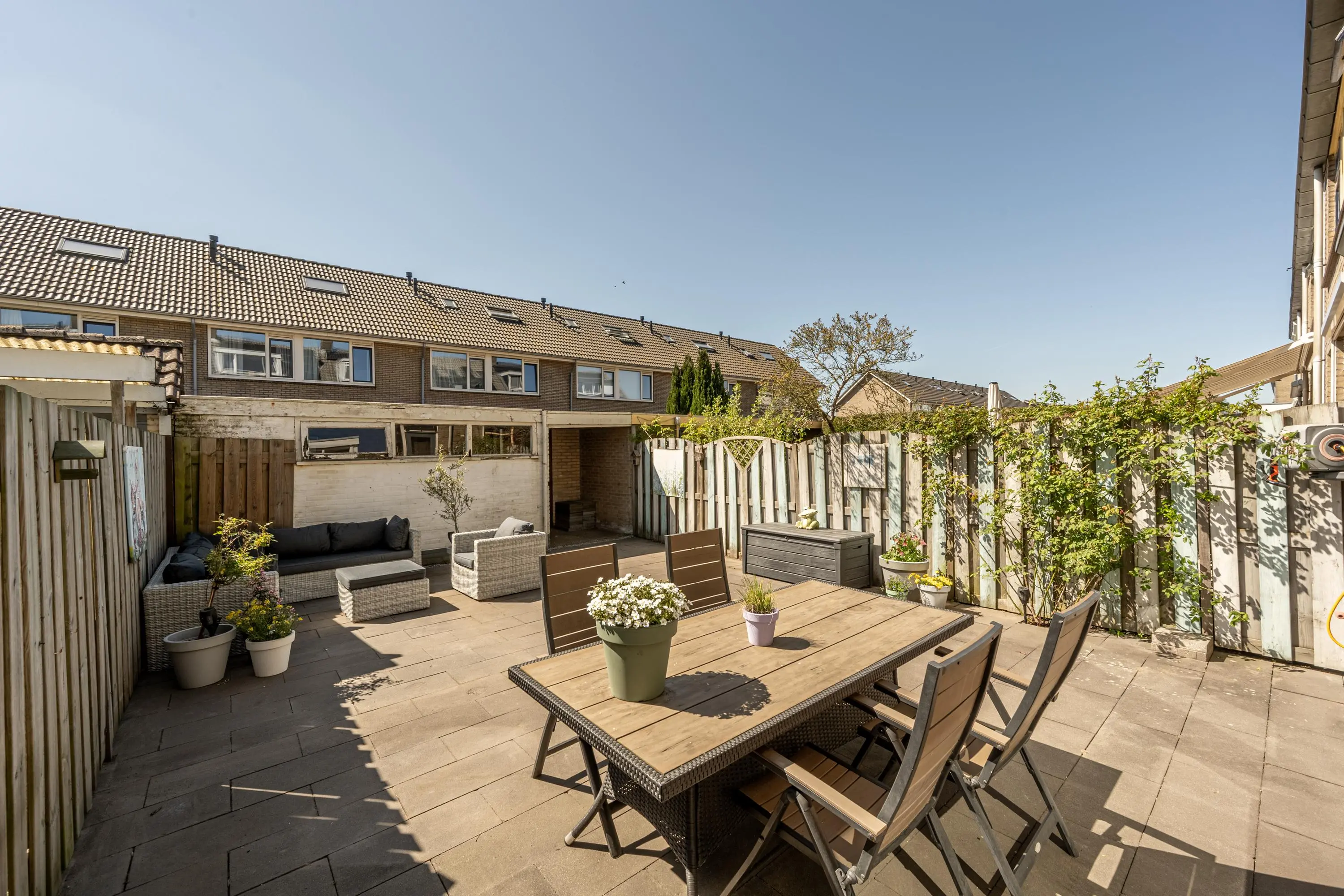 De achtertuin is gunstig gelegen op het zuiden en vormt een heerlijke plek om de hele dag van de zon te genieten. De tuin is ingericht met bestrating, een houten erfafscheiding en beschikt over een elektrisch zonnescherm en een buitenkraan.
