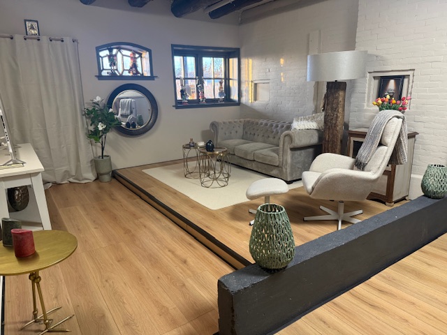 De gehele living is voorzien van een visgraat PVC-vloer met vloerverwarming.