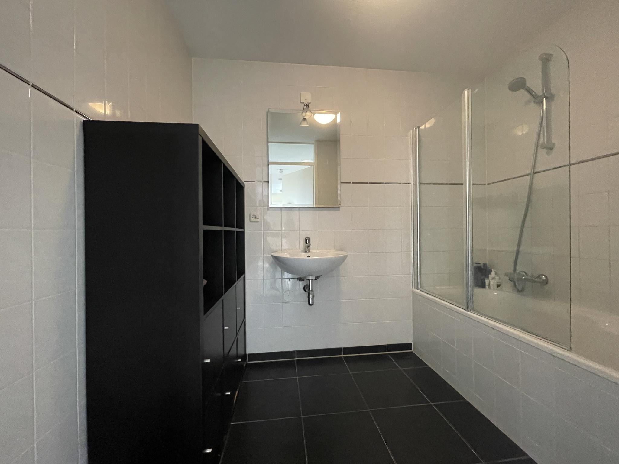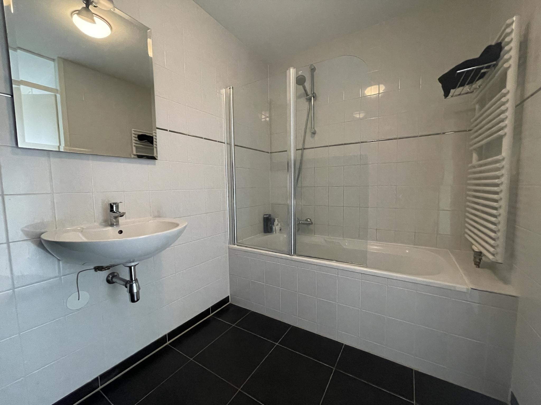 De geheel betegelde badkamer is voorzien van ligbad met douchescherm, wastafel en een design radiator.