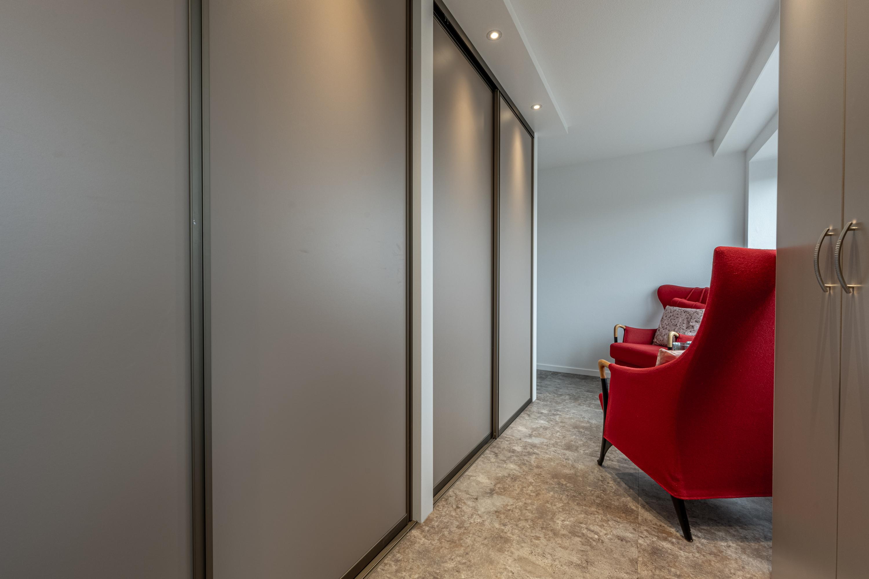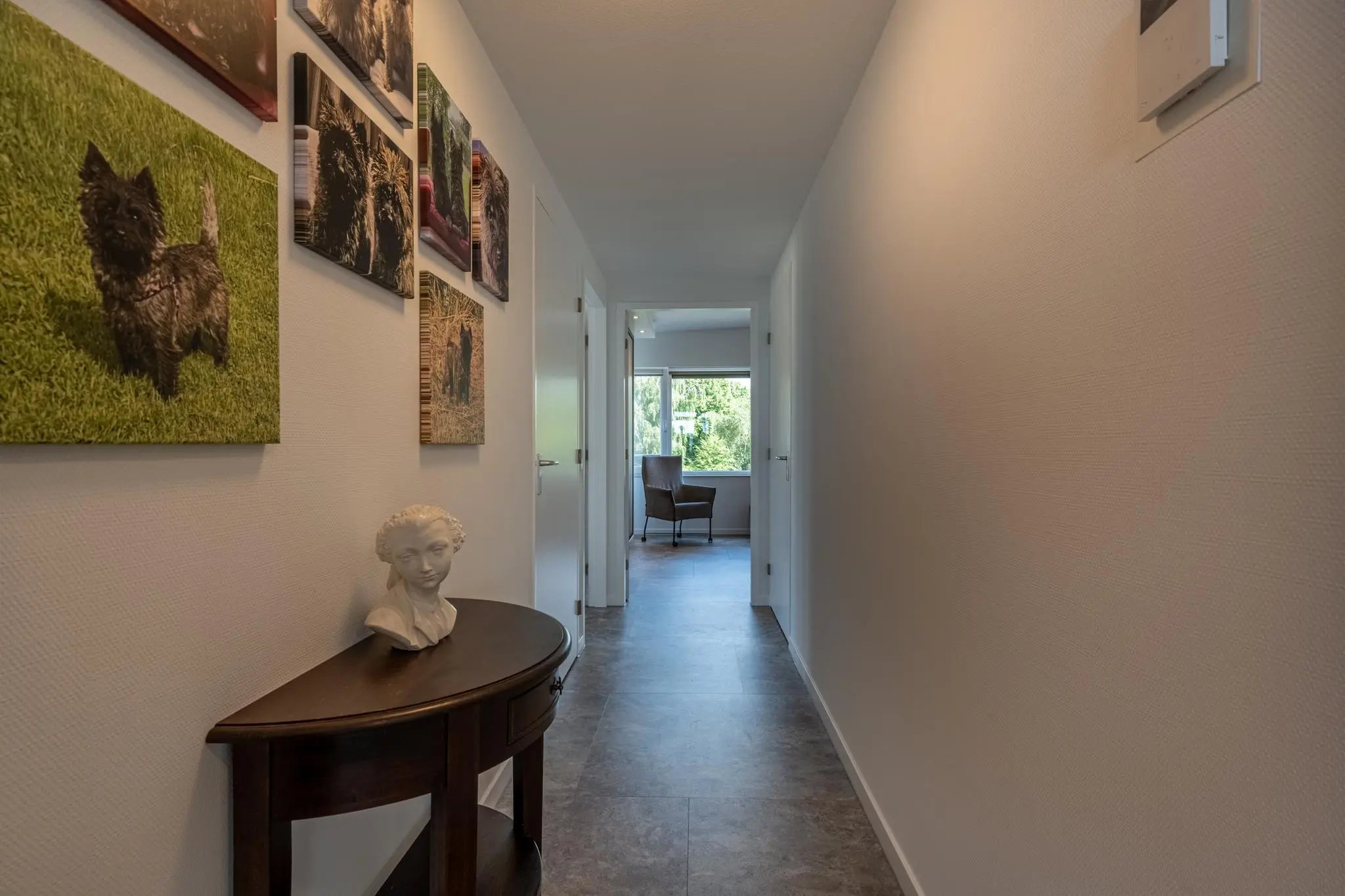 Verderop in de gang bevinden zich 2 slaapkamers en de badkamer.
