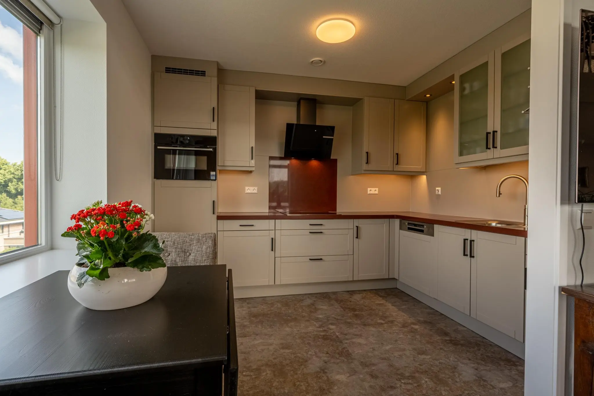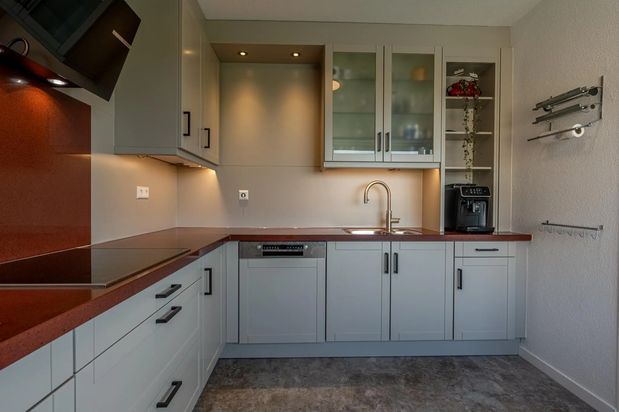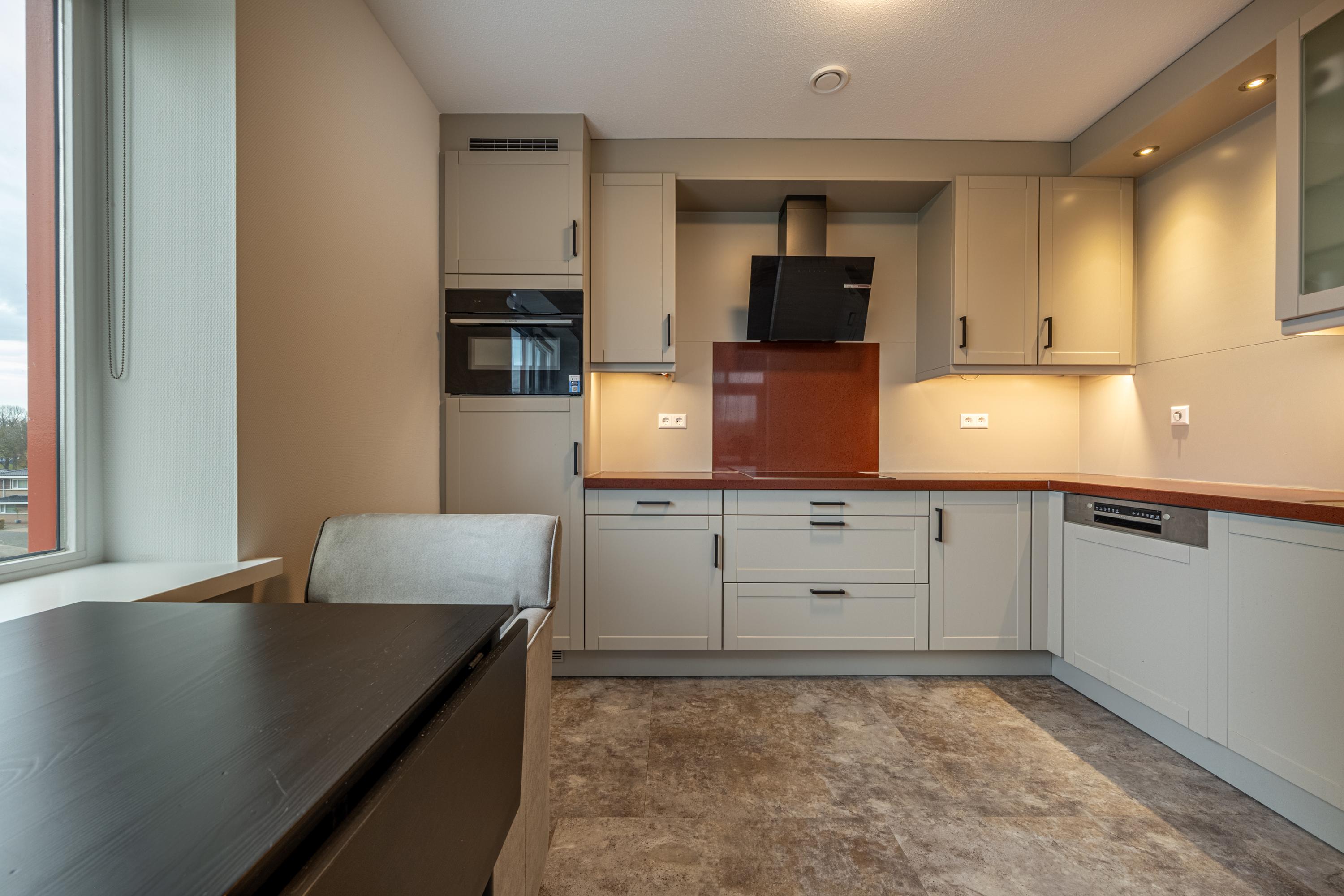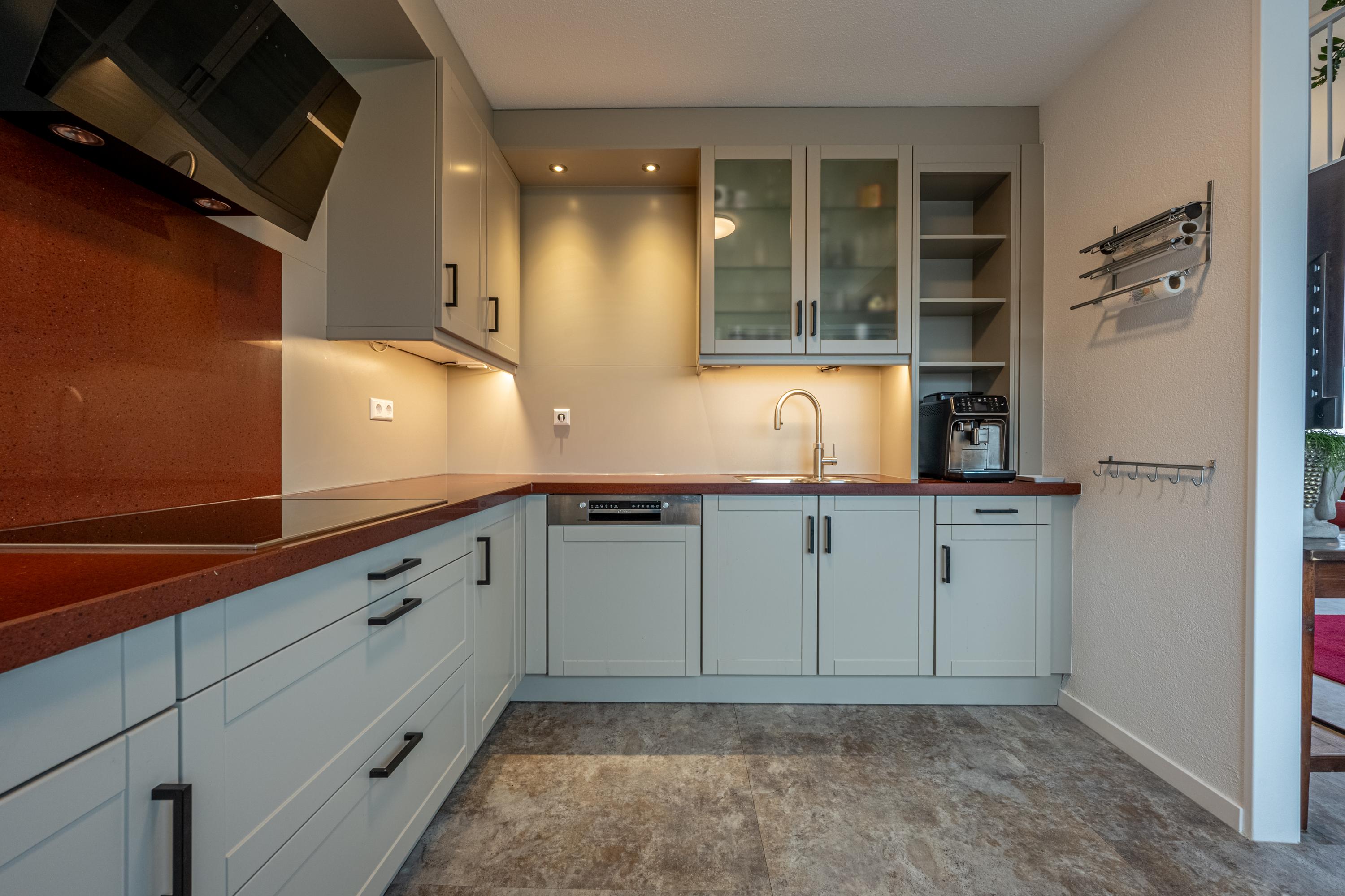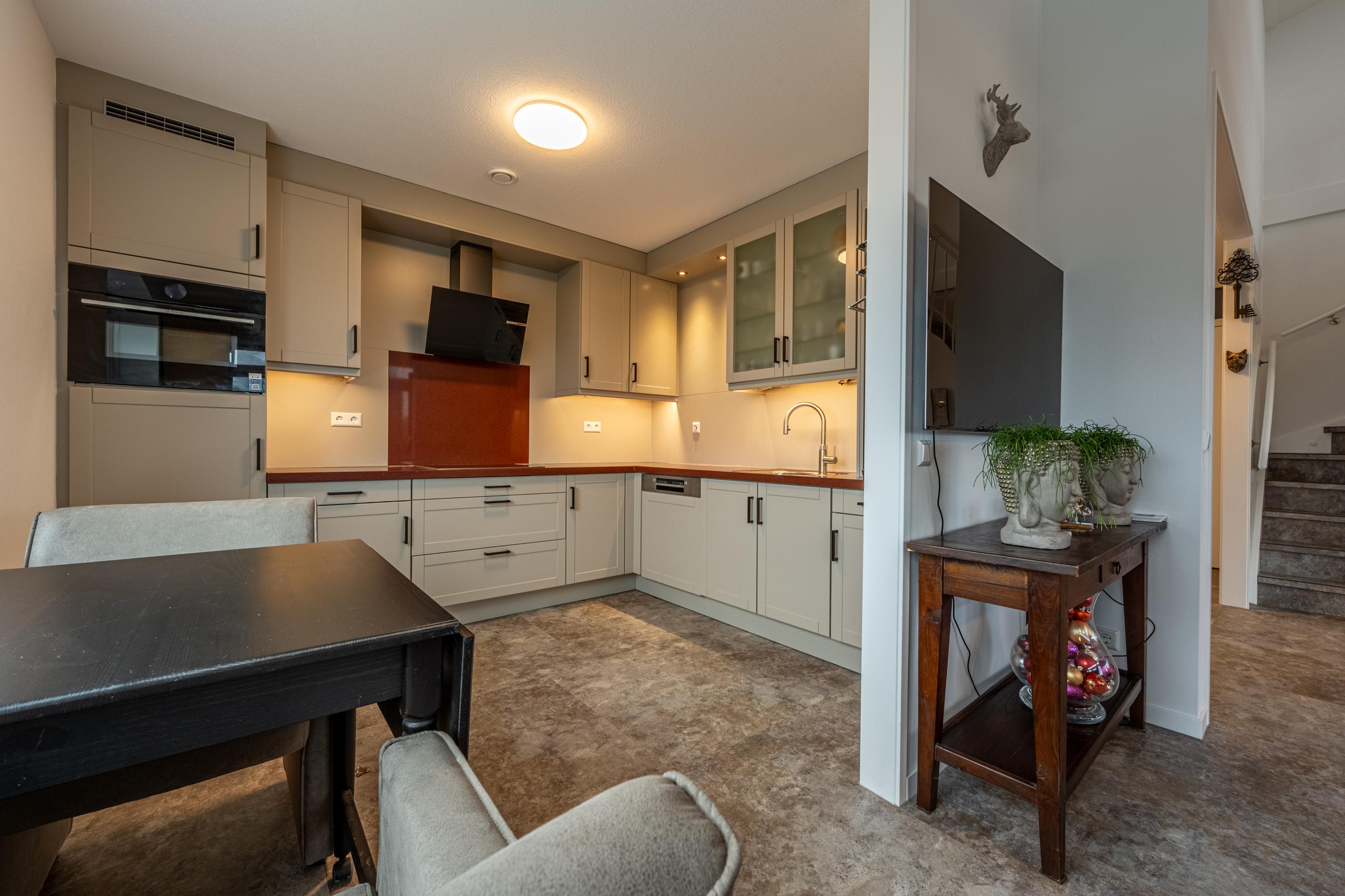 De half open keuken is uitgevoerd in een hoekopstelling met moderne inbouwapparatuur zoals een inductiekookplaat met stijlvolle vlakscherm afzuigkap, een koelkast, combi-oven, vaatwasser en Quooker voor direct kokend of bruisend water.