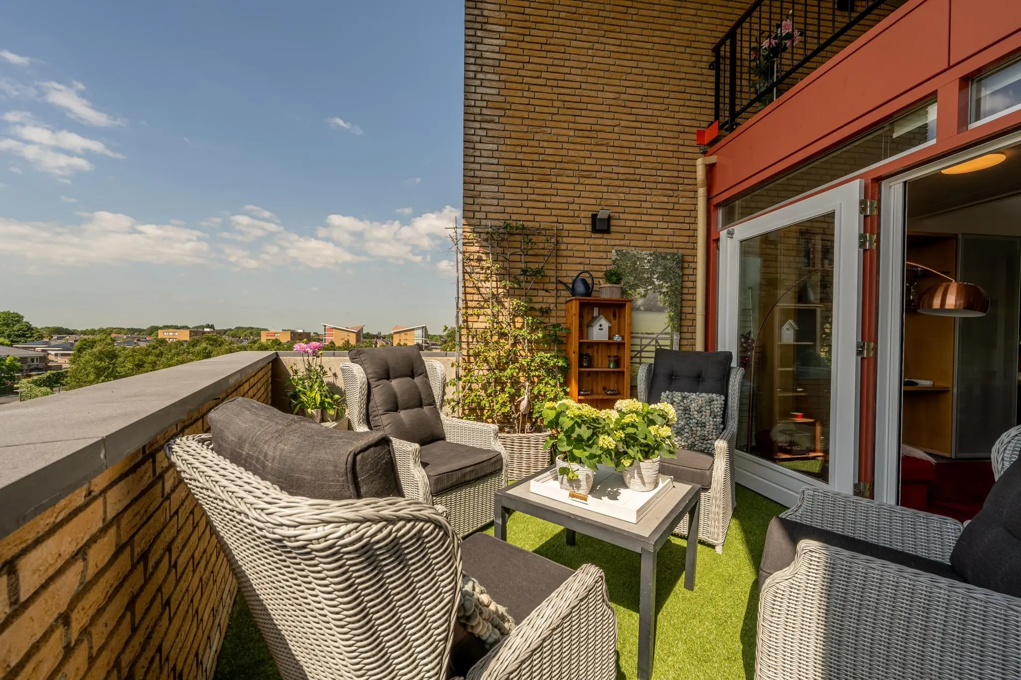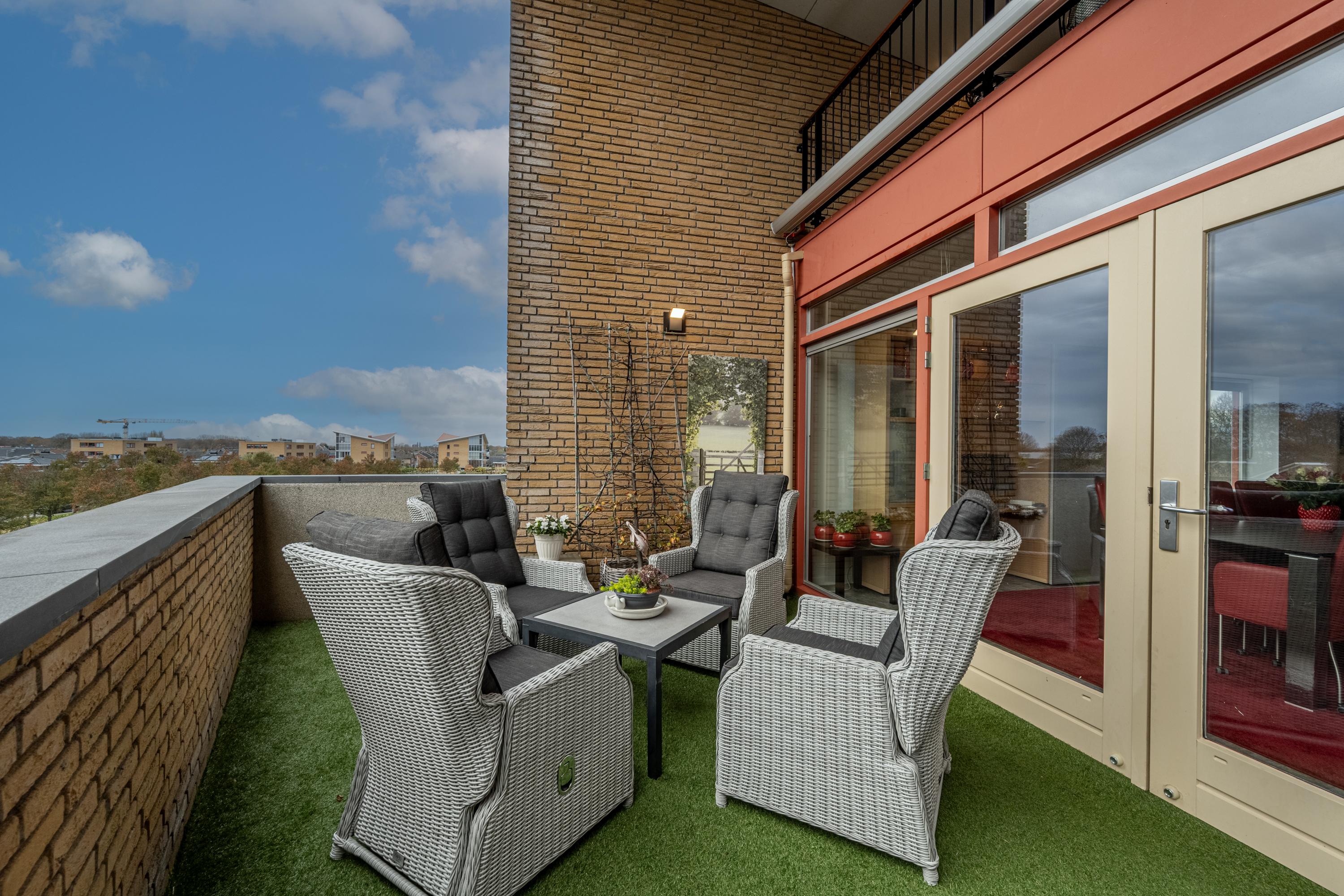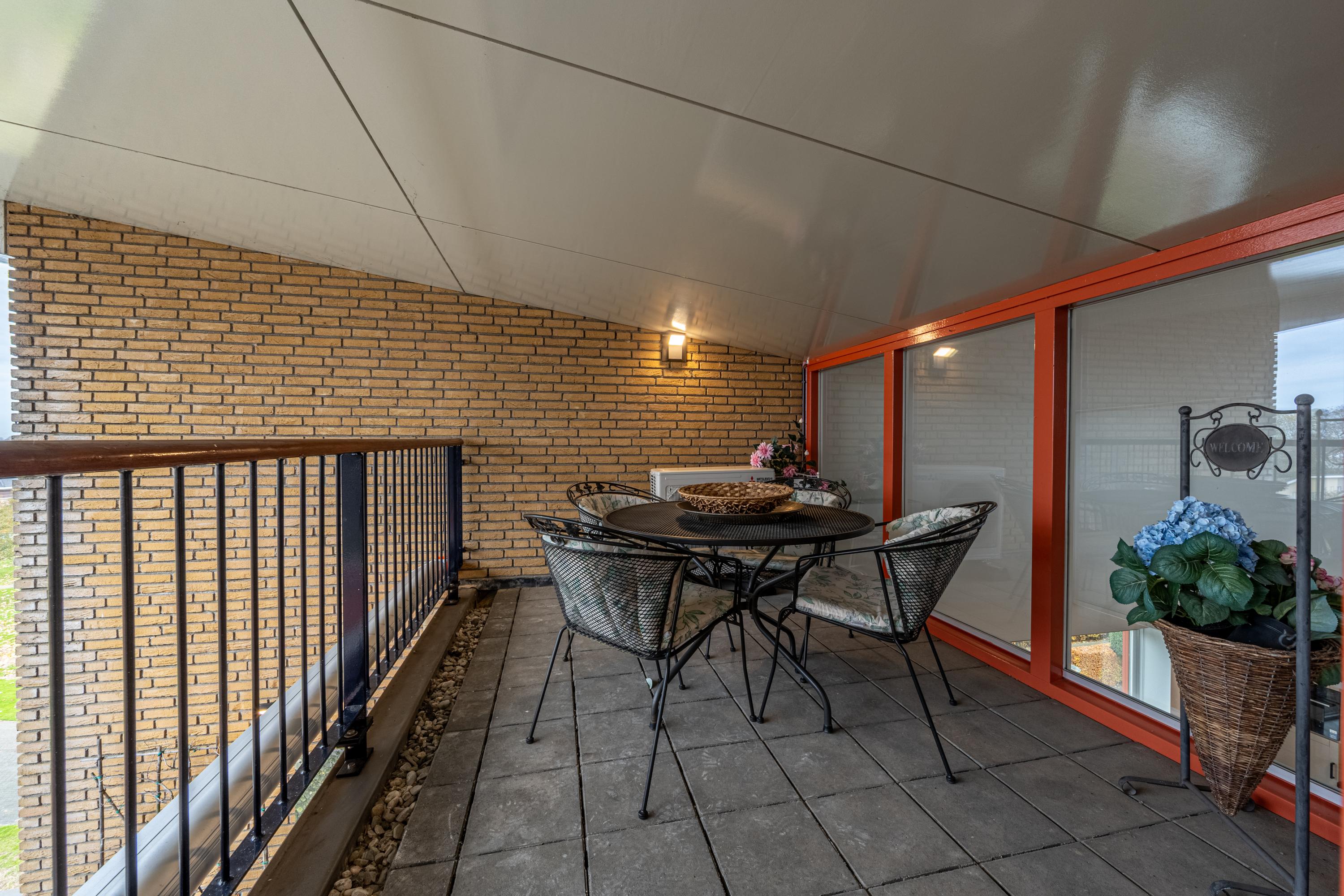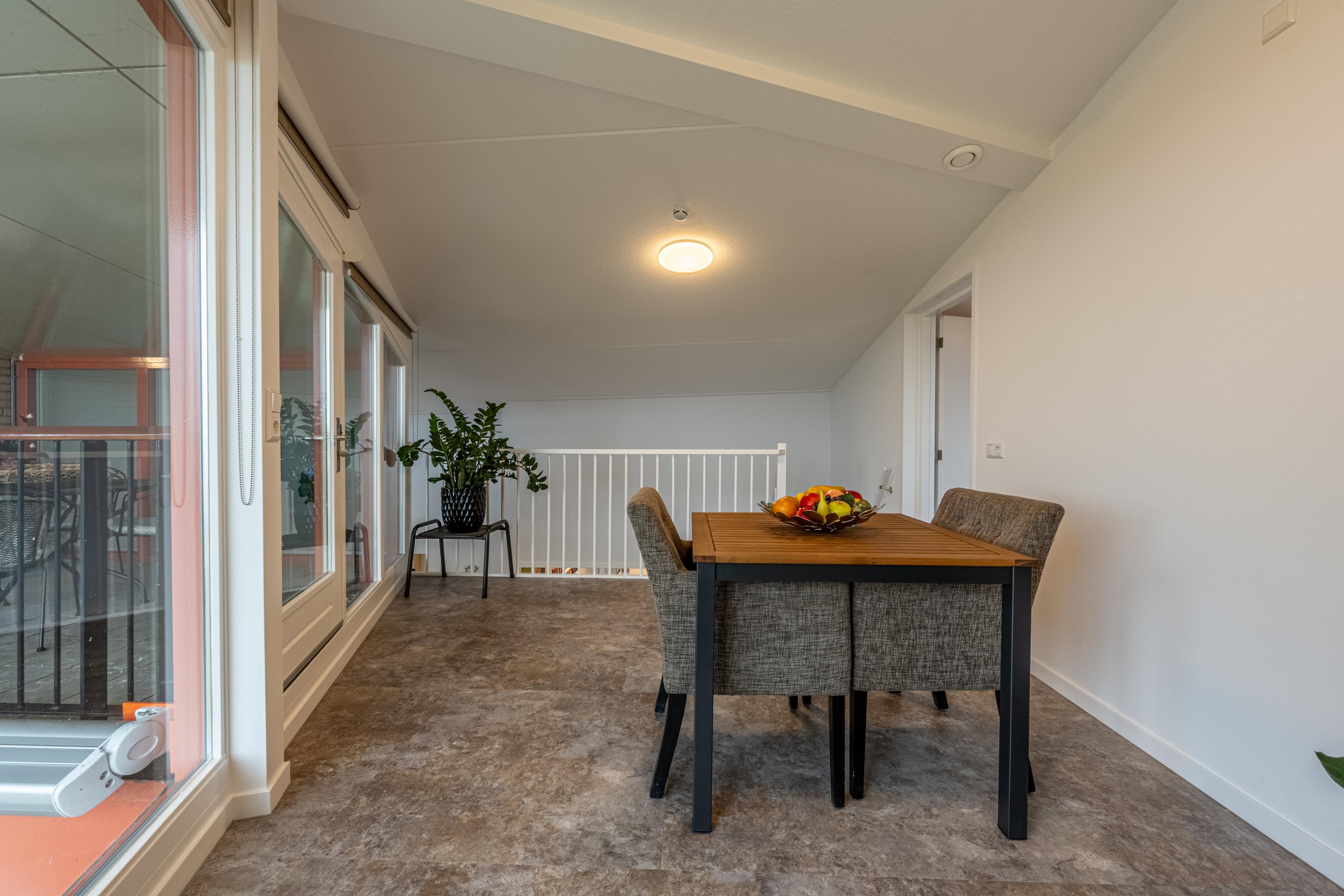 De bovenverdieping biedt extra buitenruimte in de vorm van een tweede inpandig terras. Dankzij de slimme dakconstructie van het complex vindt men hier juist een beschut plekje in de schaduw. Ideaal tijdens warme zomerdagen of om even rustig buiten te zitten.