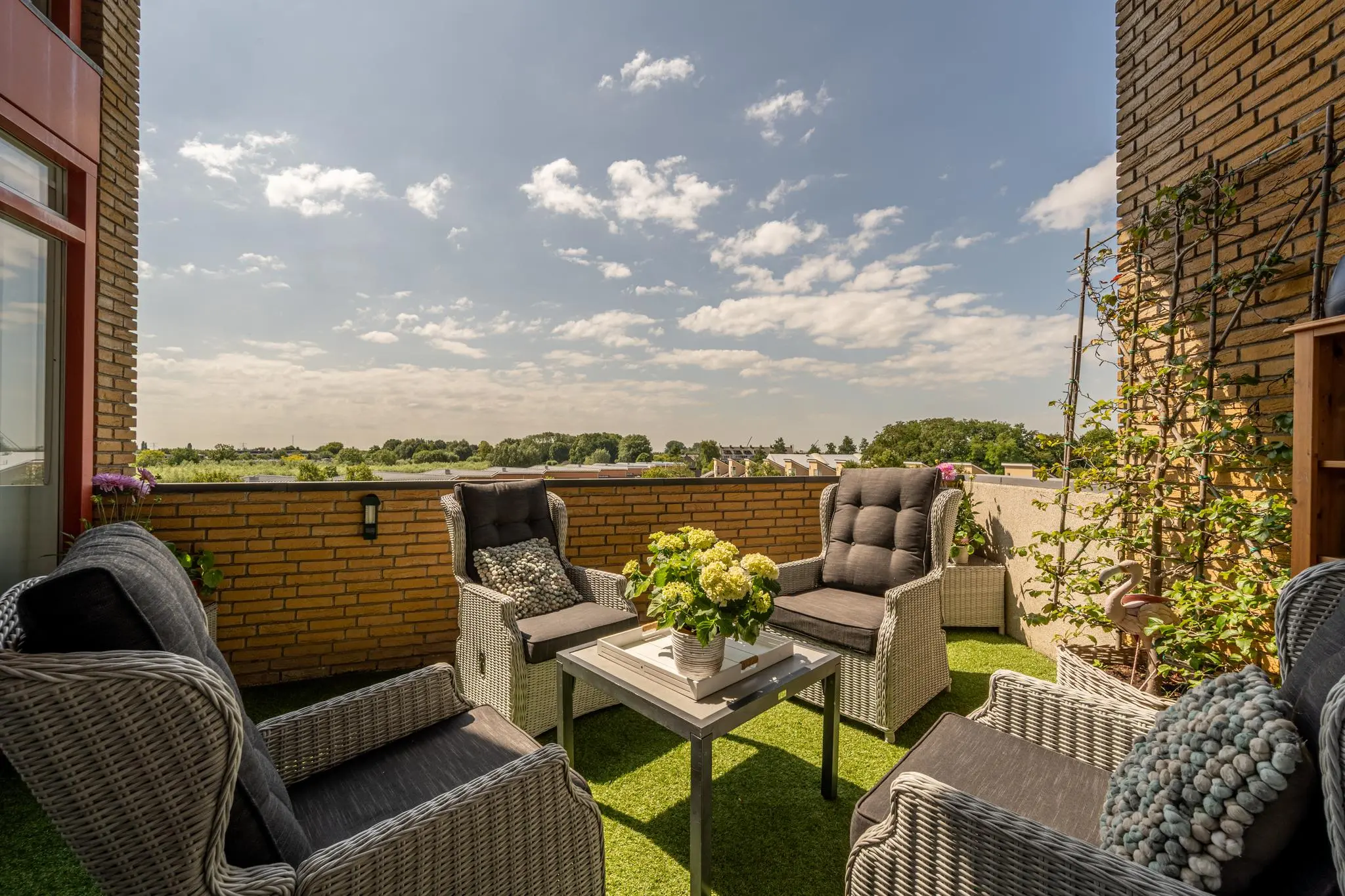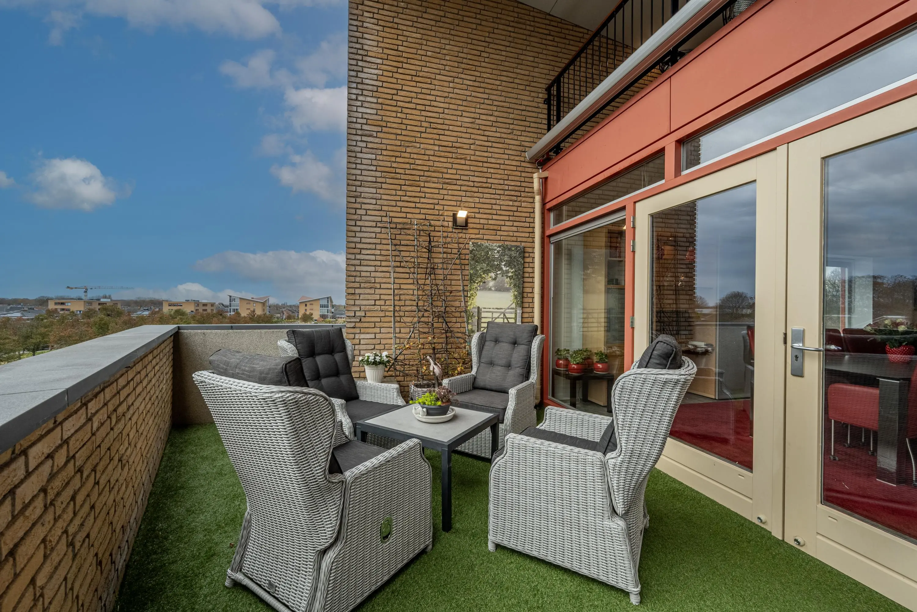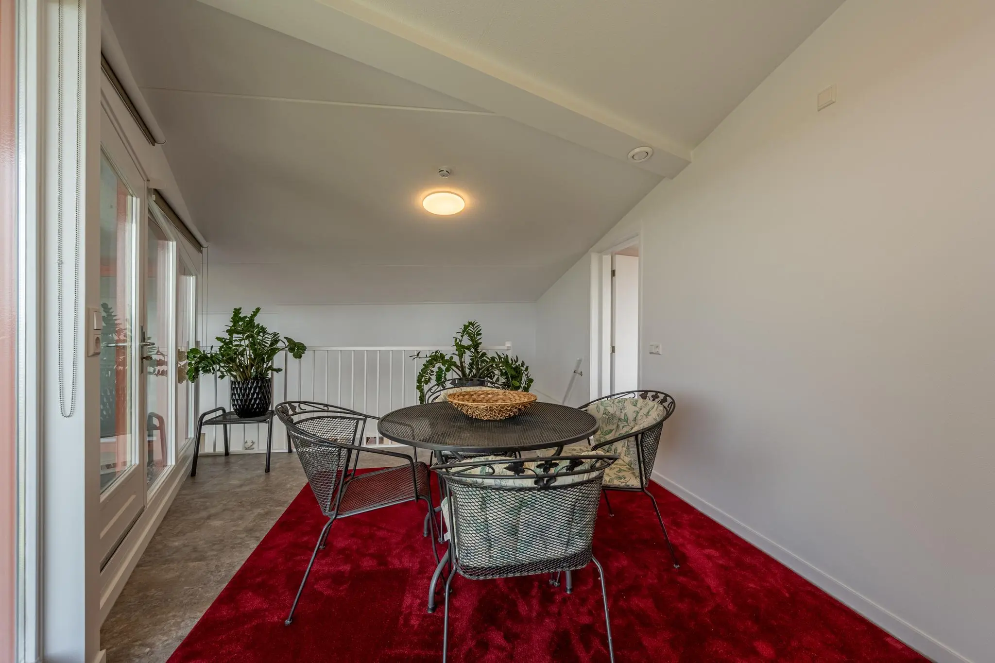 De bovenverdieping biedt extra buitenruimte in de vorm van een tweede inpandig terras. Dankzij de slimme dakconstructie van het complex vindt men hier juist een beschut plekje in de schaduw. Ideaal tijdens warme zomerdagen of om even rustig buiten te zitten.