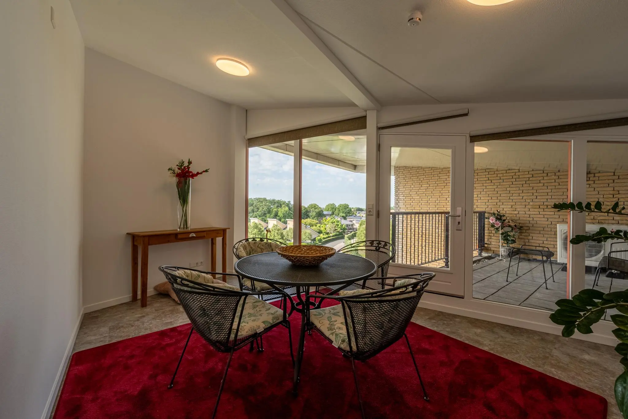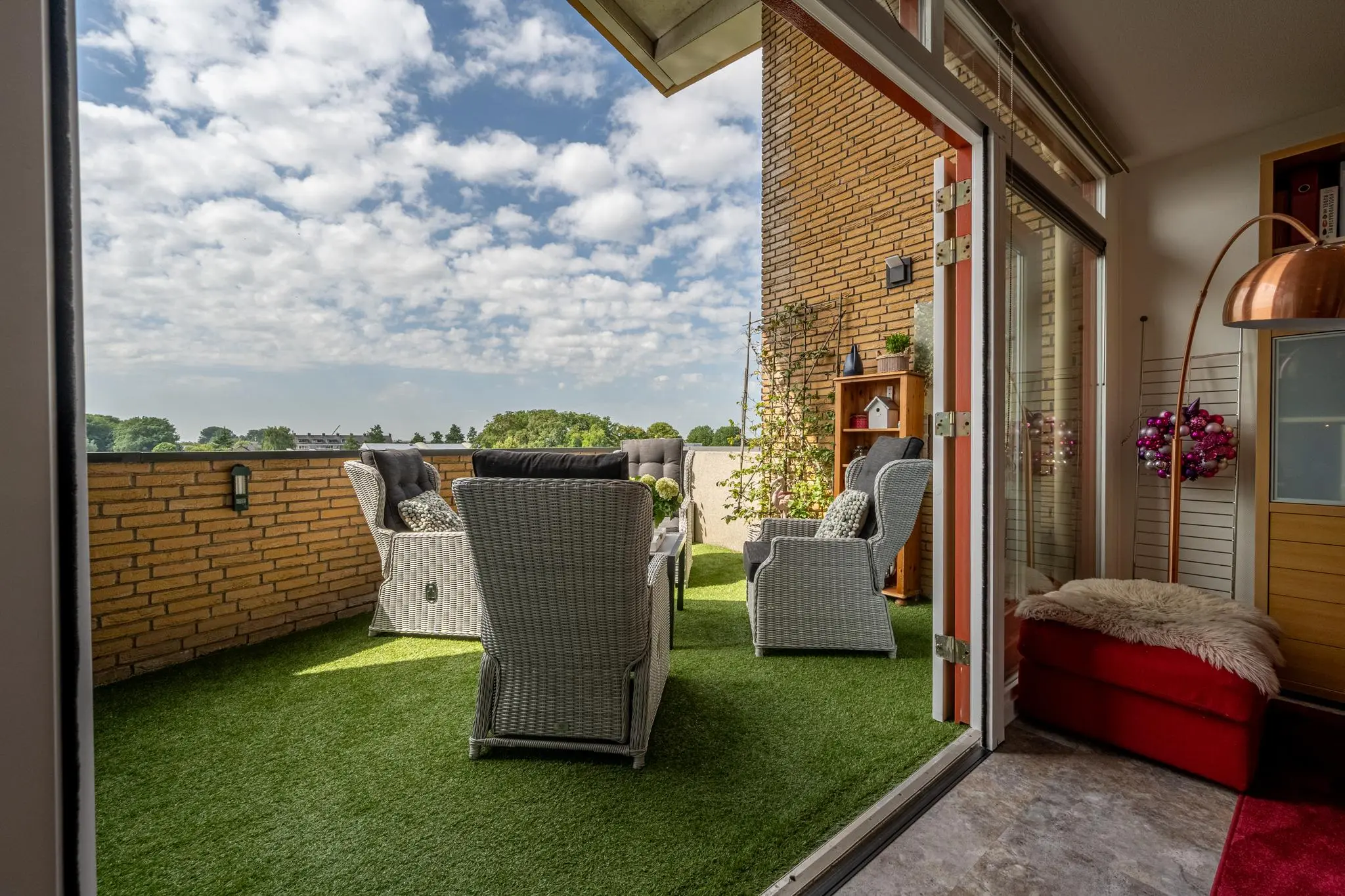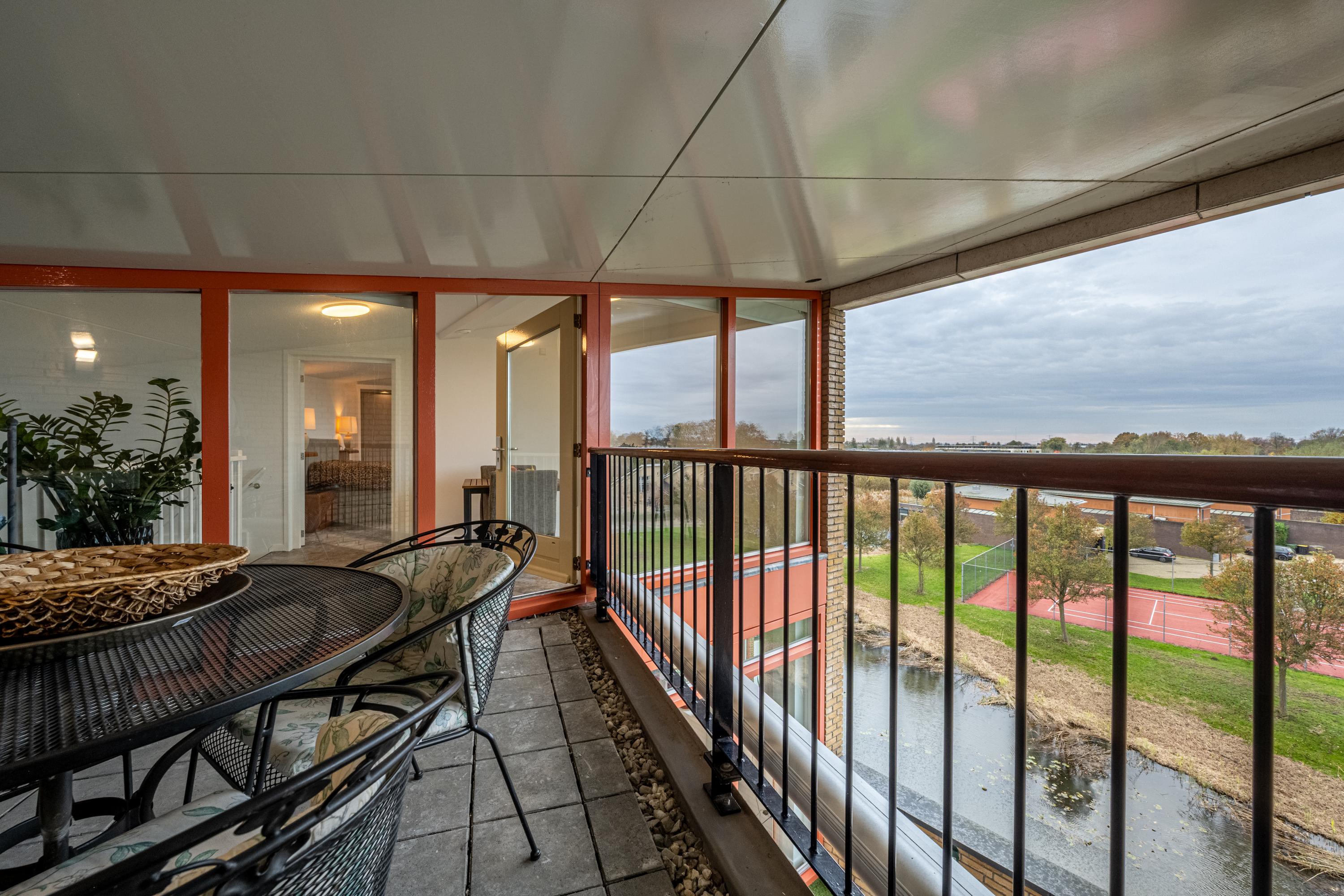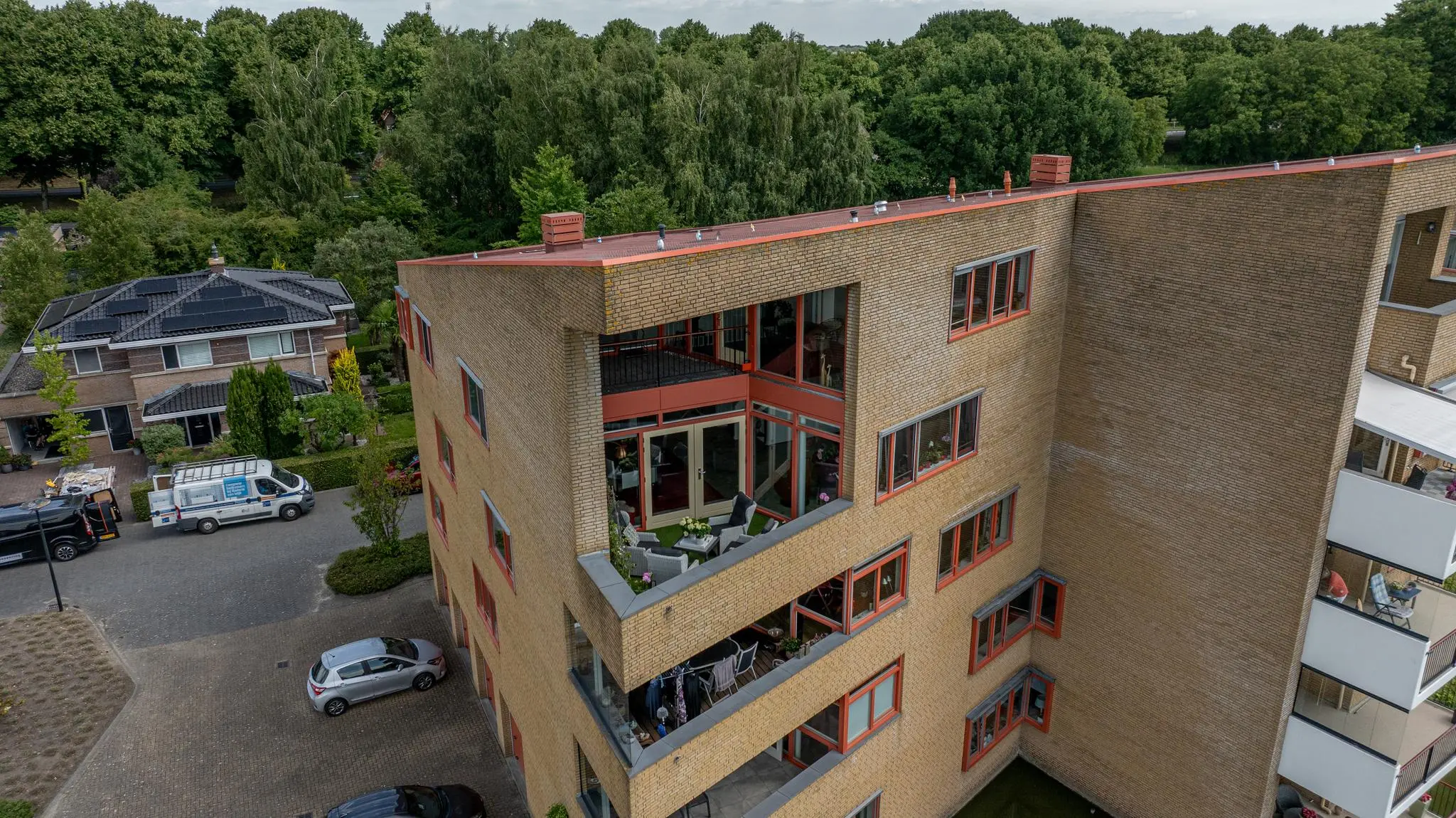 De bovenverdieping biedt extra buitenruimte in de vorm van een tweede inpandig terras. Dankzij de slimme dakconstructie van het complex vindt men hier juist een beschut plekje in de schaduw. Ideaal tijdens warme zomerdagen of om even rustig buiten te zitten.