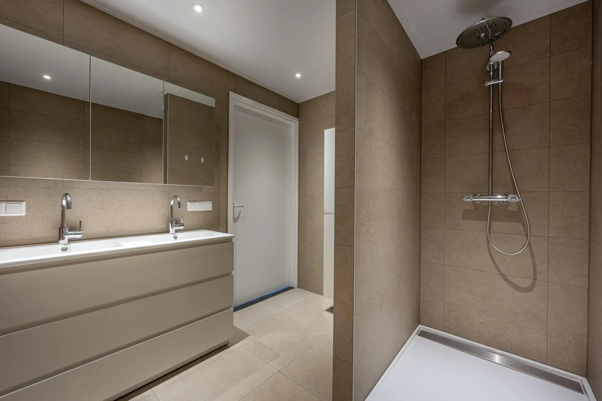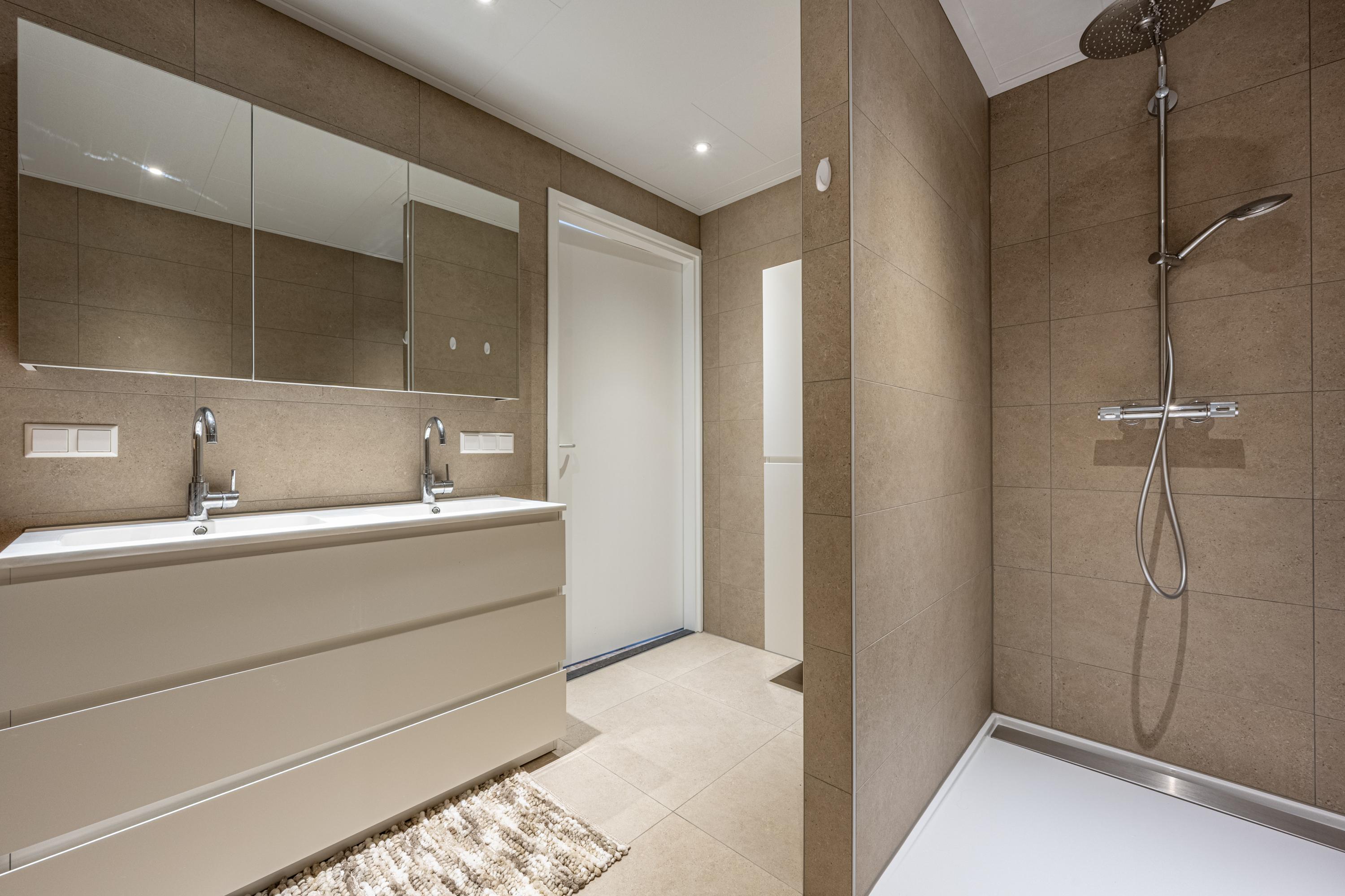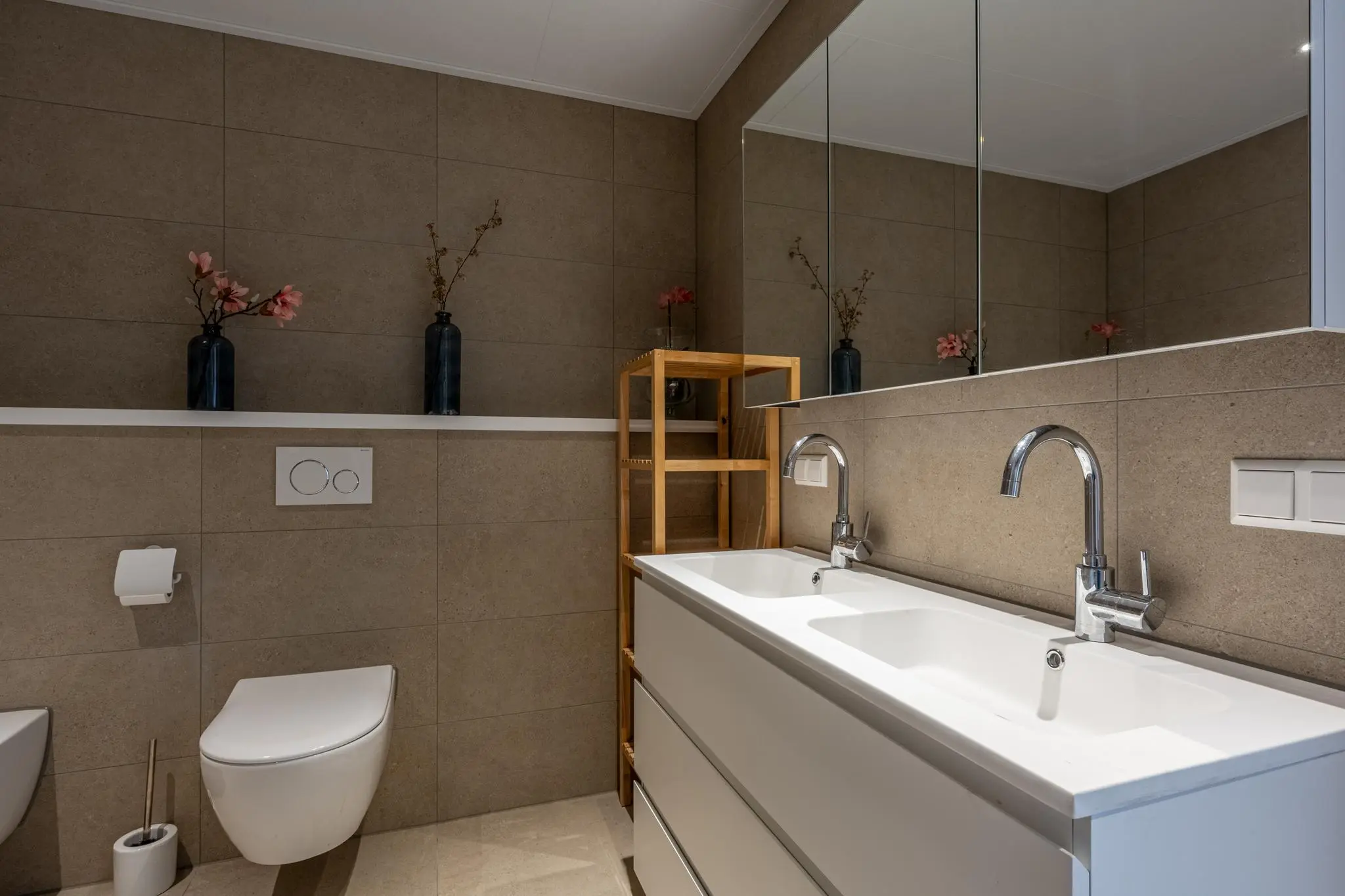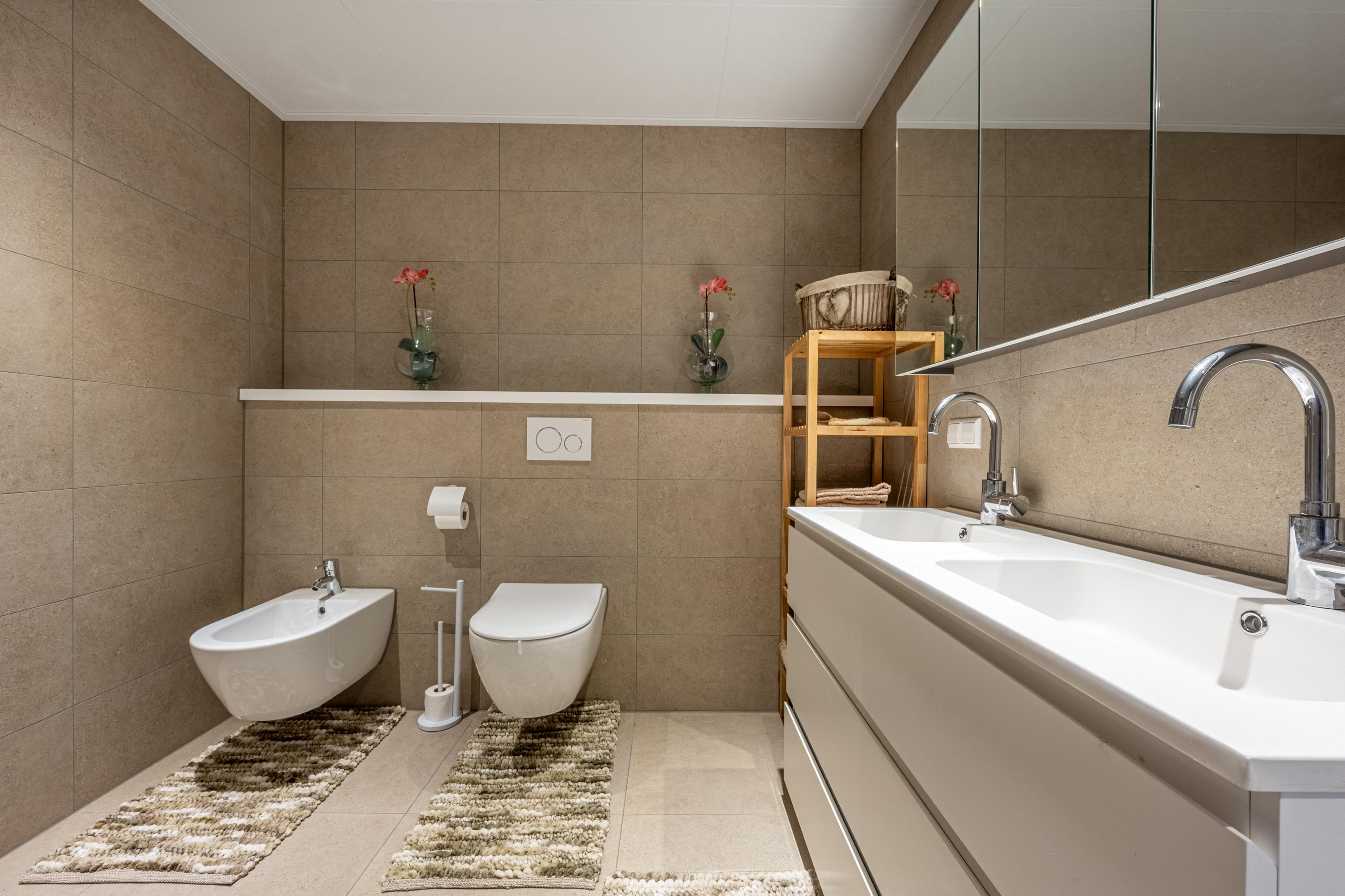De eigentijdse, volledig betegelde badkamer is recent vernieuwd - en dat is te zien. Comfort staat hier centraal met een tweede toilet, bidet, een stijlvol wastafelmeubel met dubbele wastafels en een royale inloopdouche voorzien van regendouche en drainafvoer. Alles aanwezig voor een frisse start of ontspannen afsluiting van de dag.