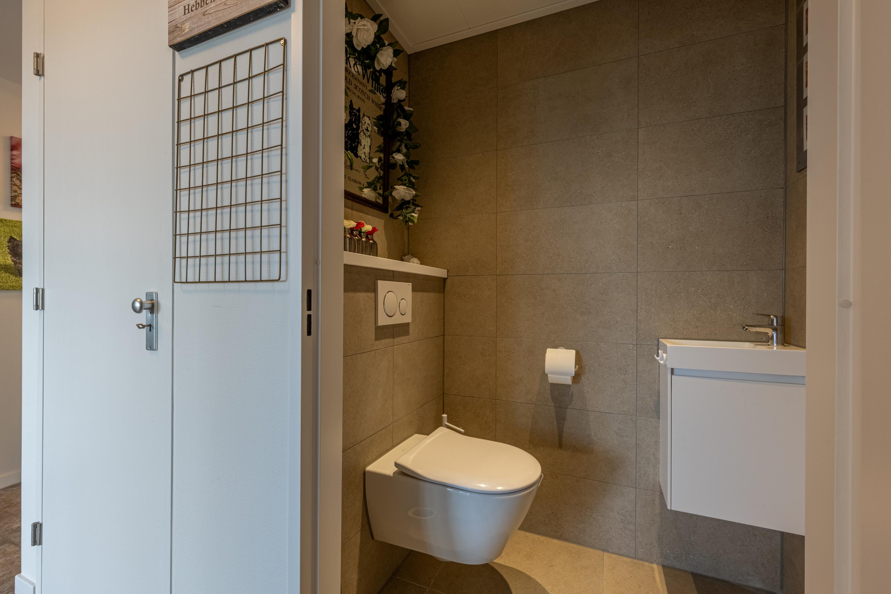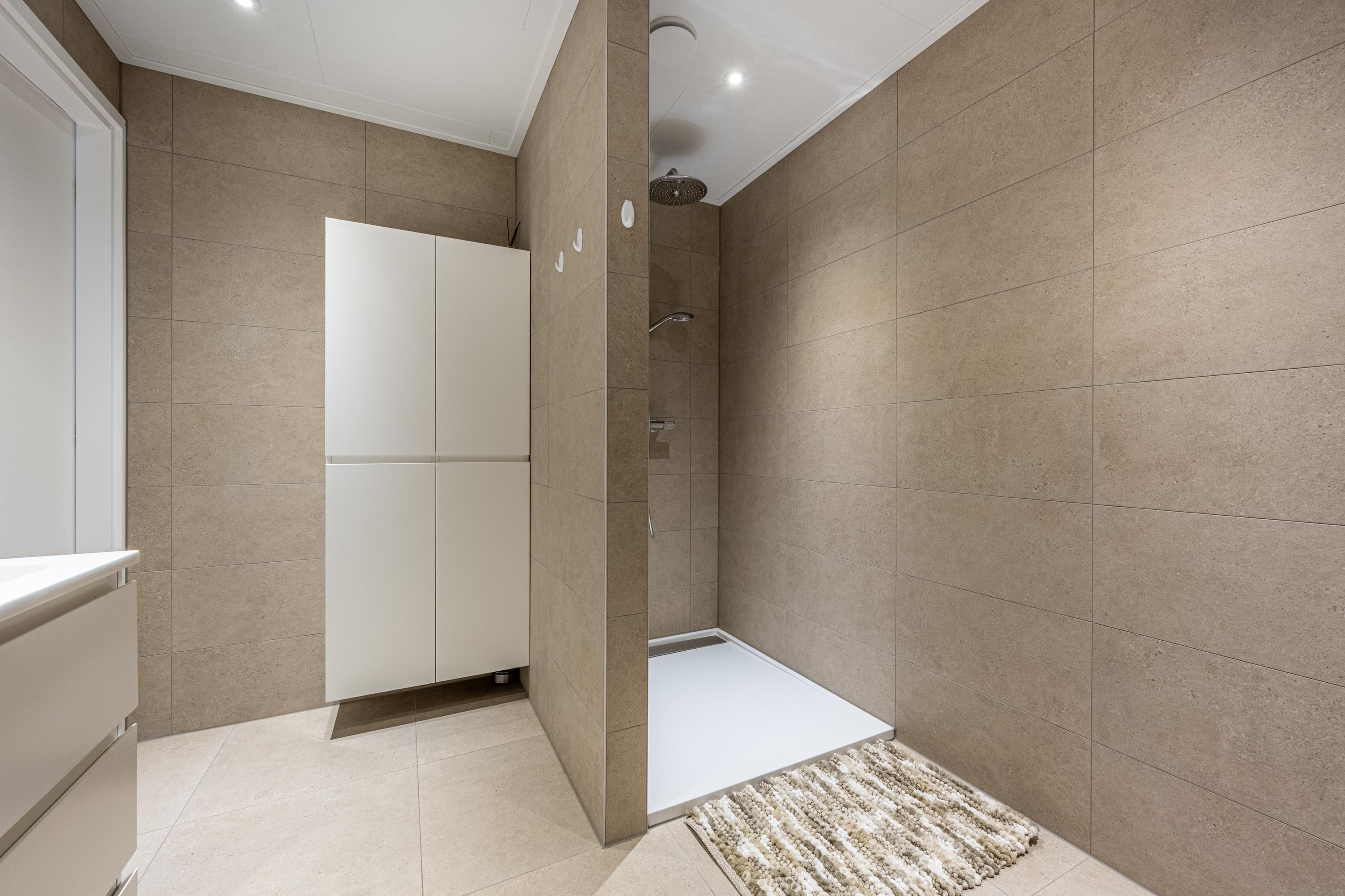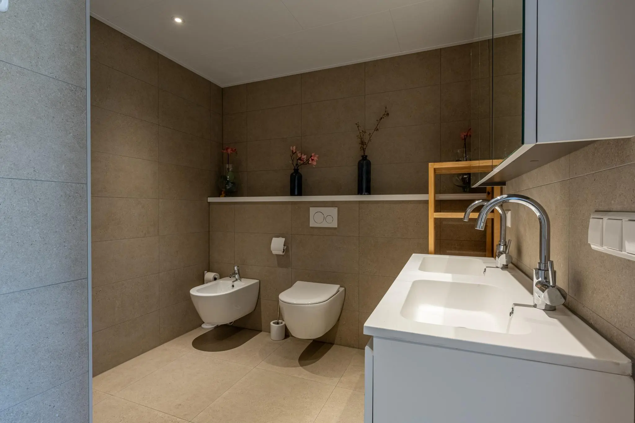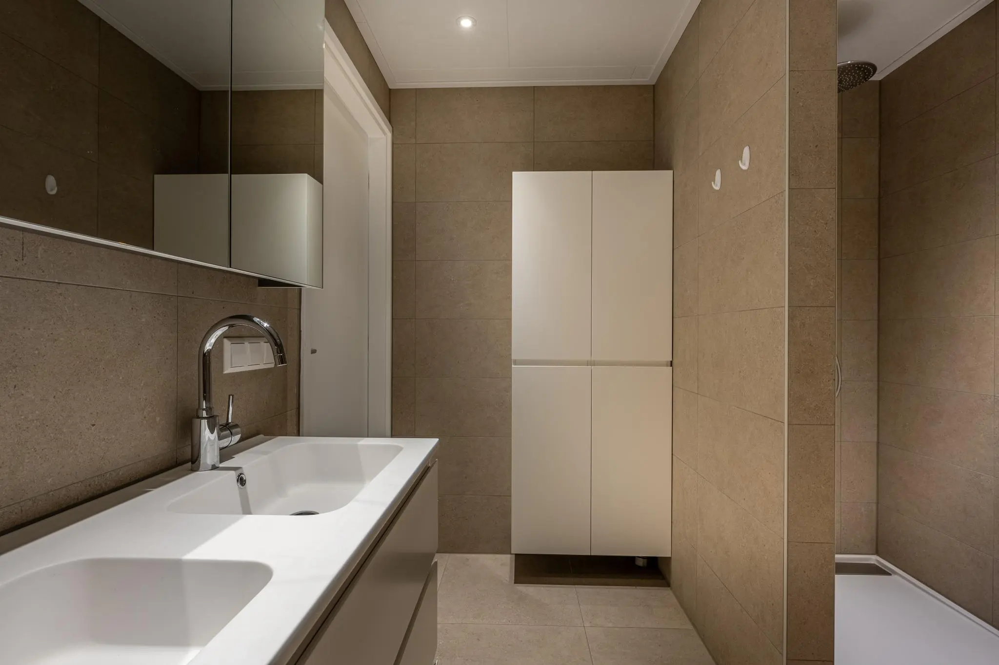 De eigentijdse, volledig betegelde badkamer is recent vernieuwd - en dat is te zien. Comfort staat hier centraal met een tweede toilet, bidet, een stijlvol wastafelmeubel met dubbele wastafels en een royale inloopdouche voorzien van regendouche en drainafvoer. Alles aanwezig voor een frisse start of ontspannen afsluiting van de dag.