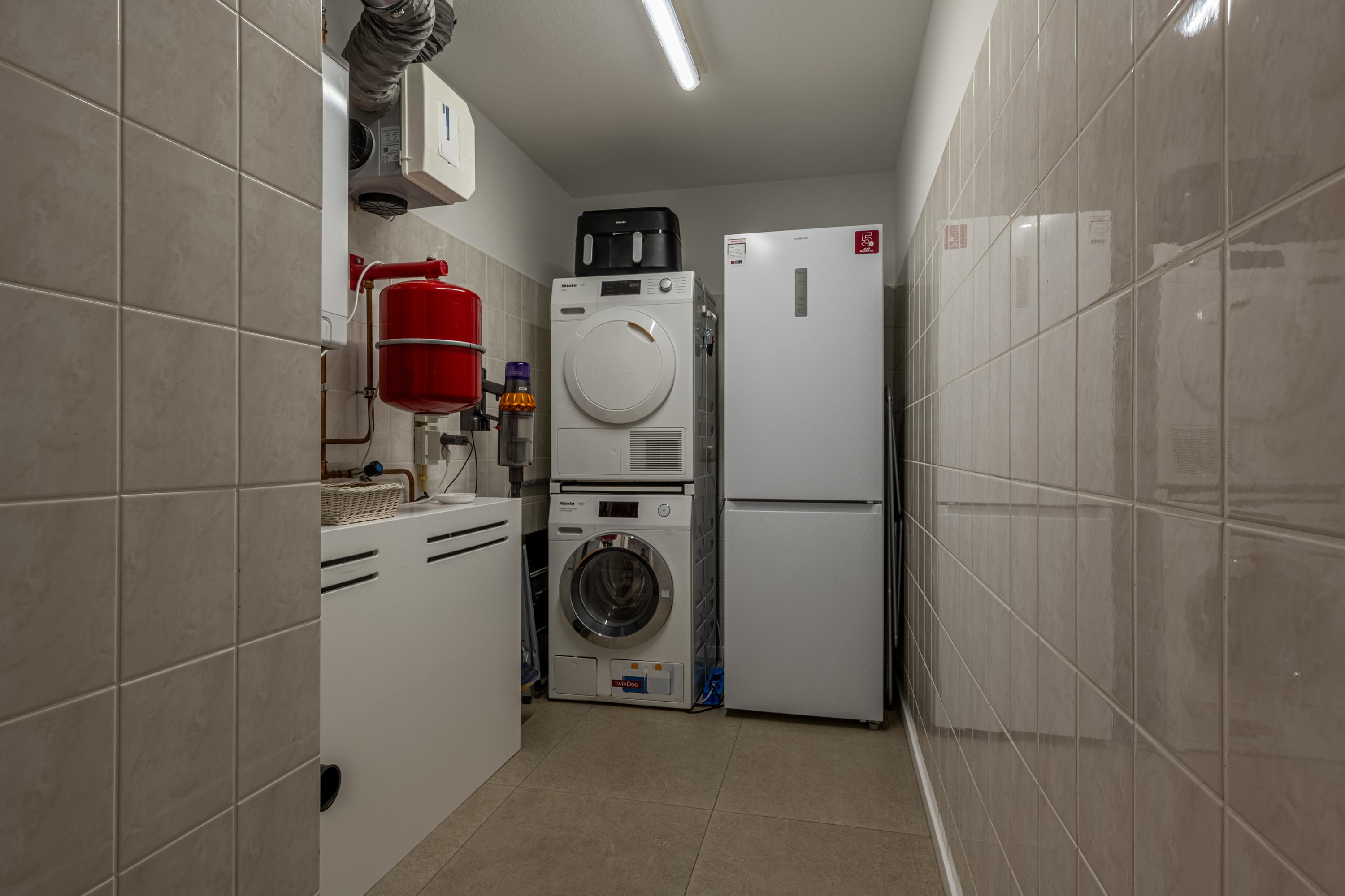 Via de gang bereikt men een praktische berging met de opstelplaats voor de cv-combiketel en de mechanische ventilatie box. Hier zijn ook de aansluitingen voor de wasmachine en droger te vinden.