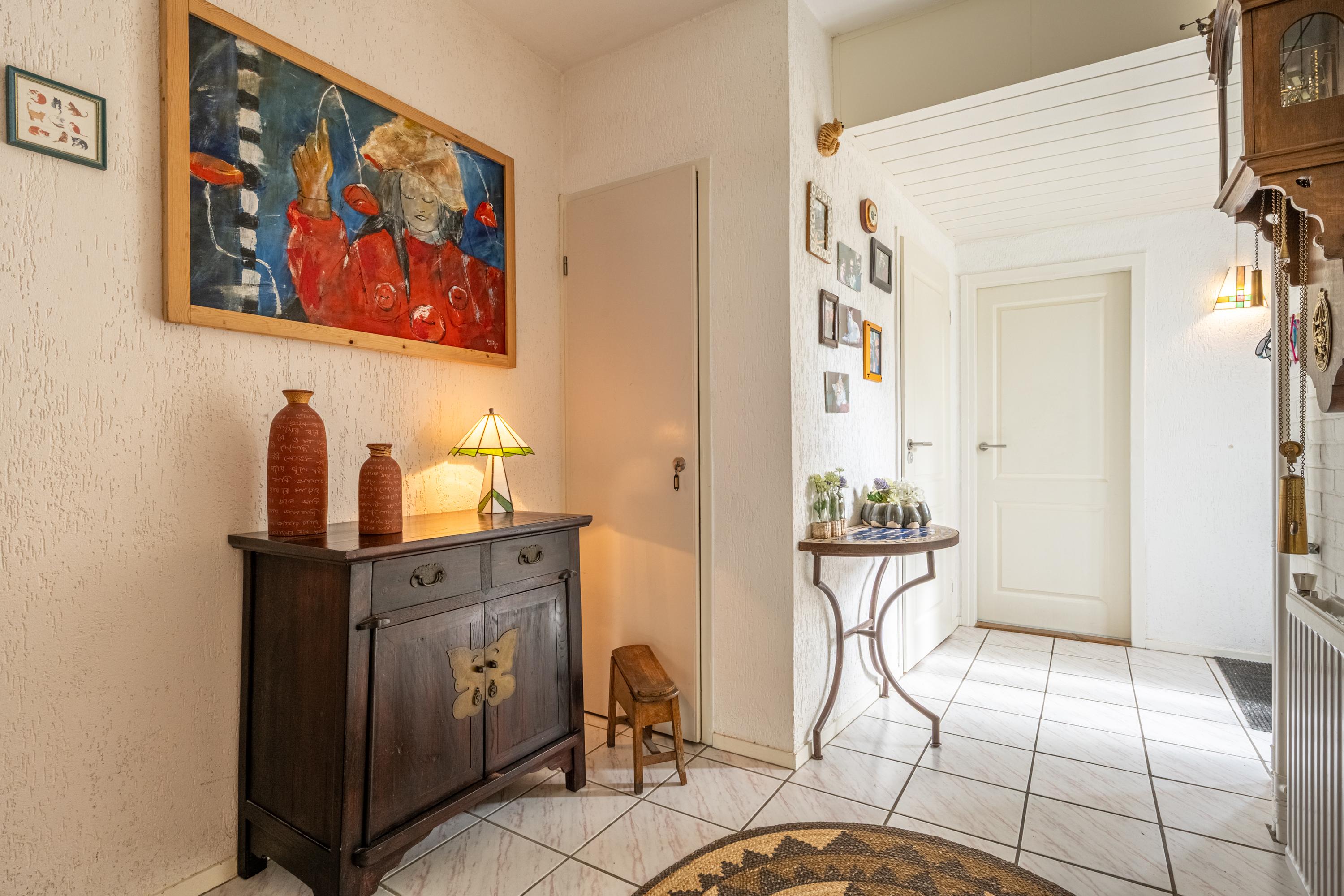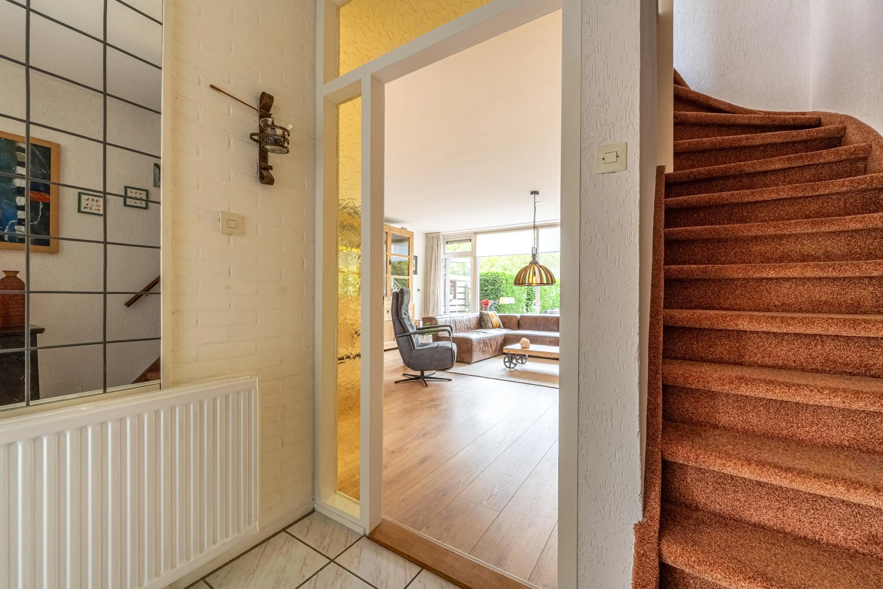 De entree met ruime hal geeft toegang tot de meterkast, de garage met lichtkoepel, een nette toiletruimte met fonteintje, de trapopgang en de woonkamer. De garage beschikt over openslaande deuren en aansluitingen voor de wasapparatuur. Overigens is de garage uitermate geschikt om gebruikt te worden als opslagruimte of hobbyruimte.