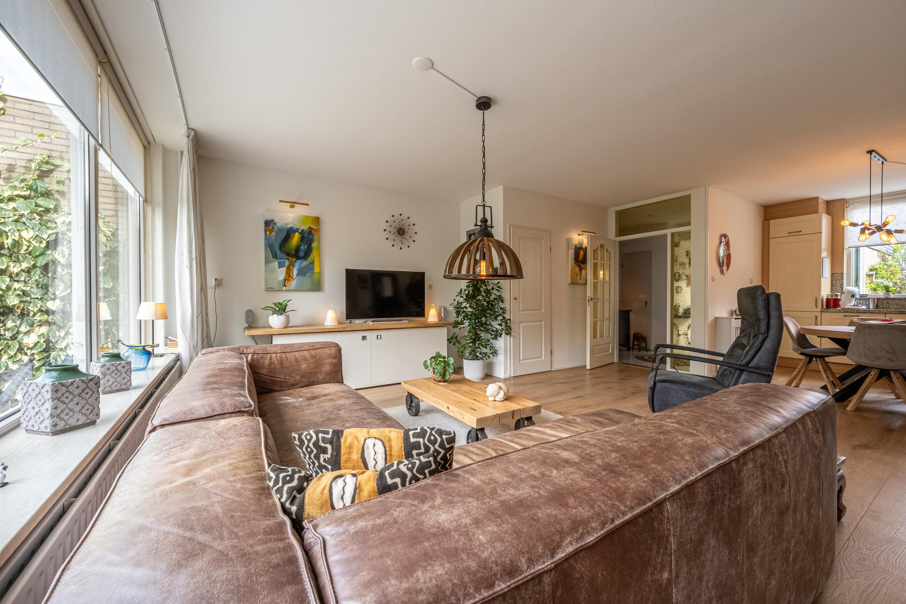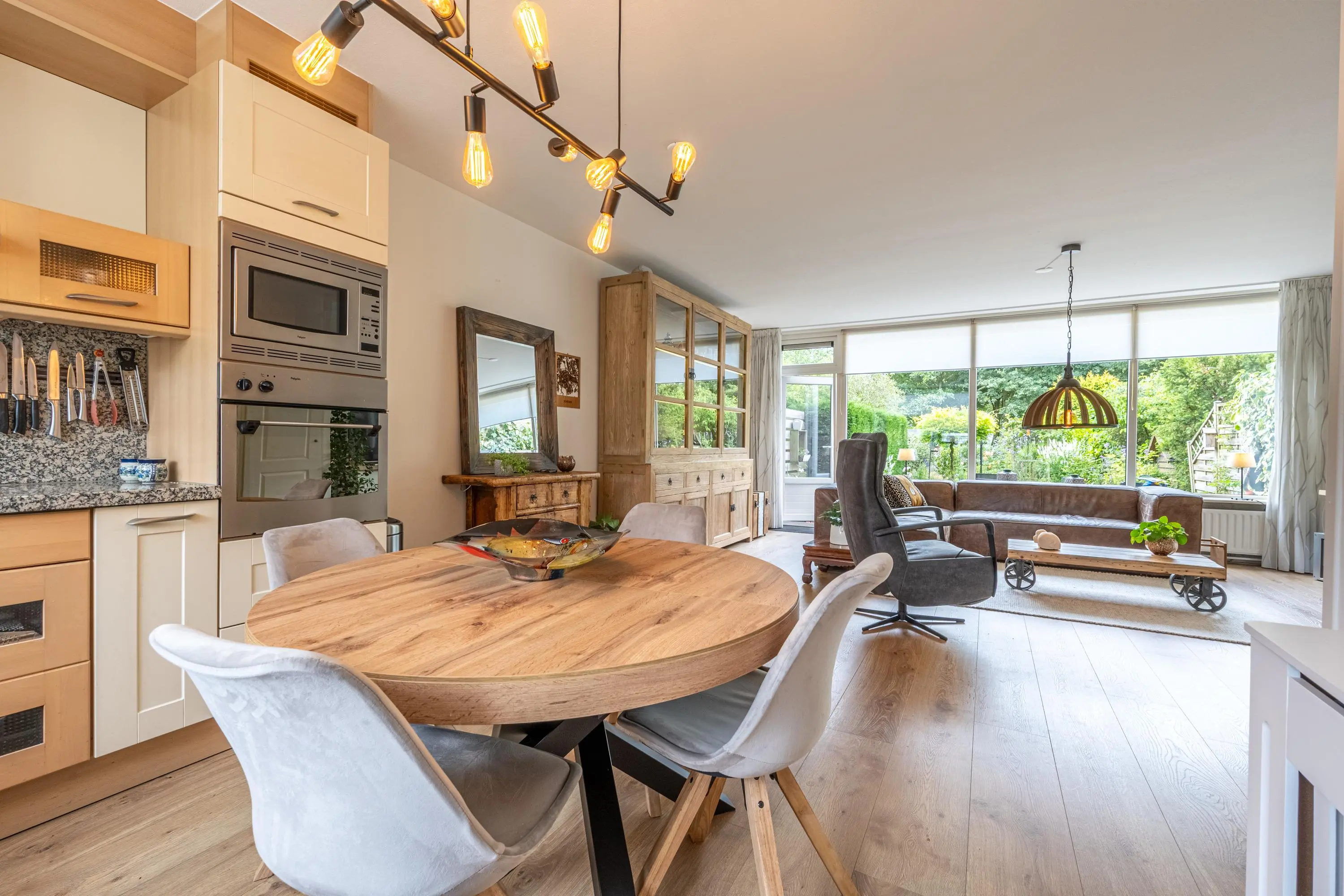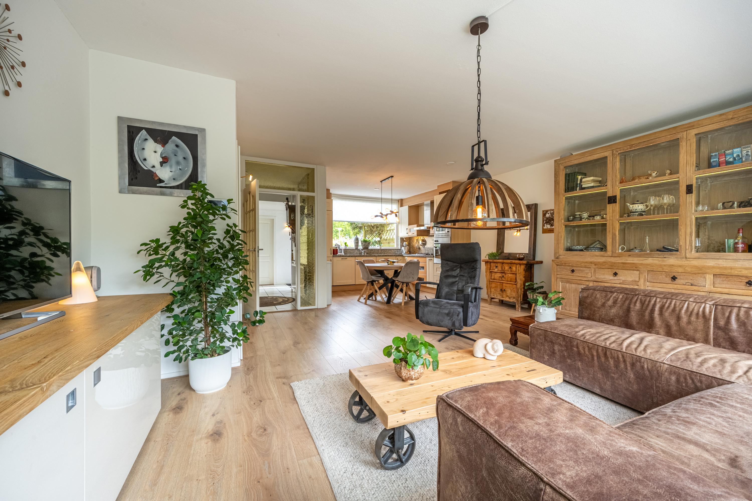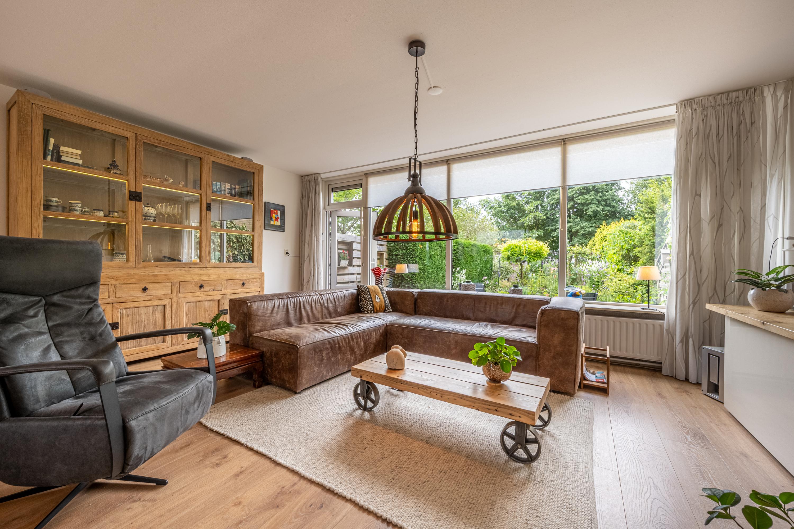 De gemoedelijke living is een plek waar warmte en licht perfect samenkomen. Middels een loopdeur stapt men zo de zonnige achtertuin in.