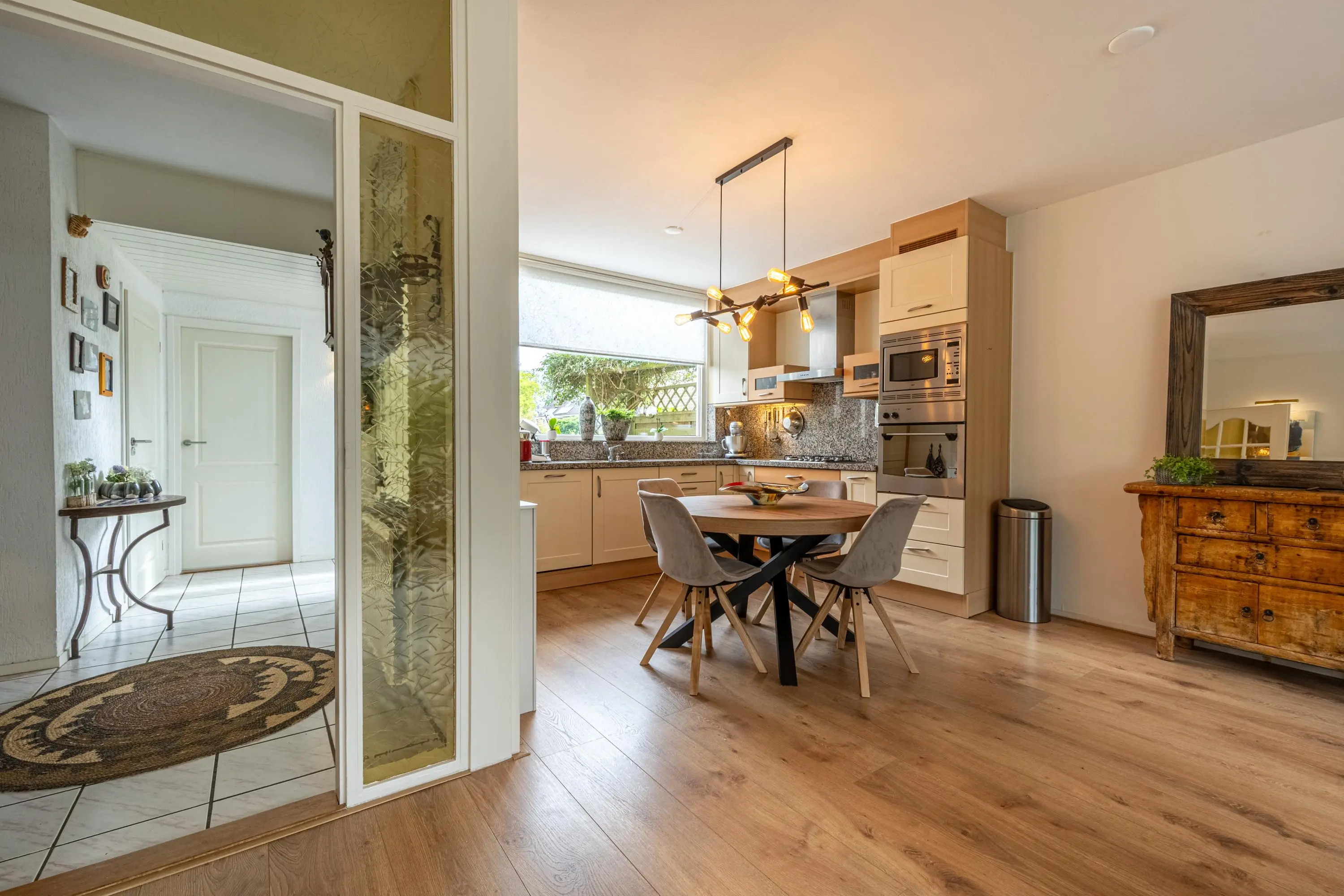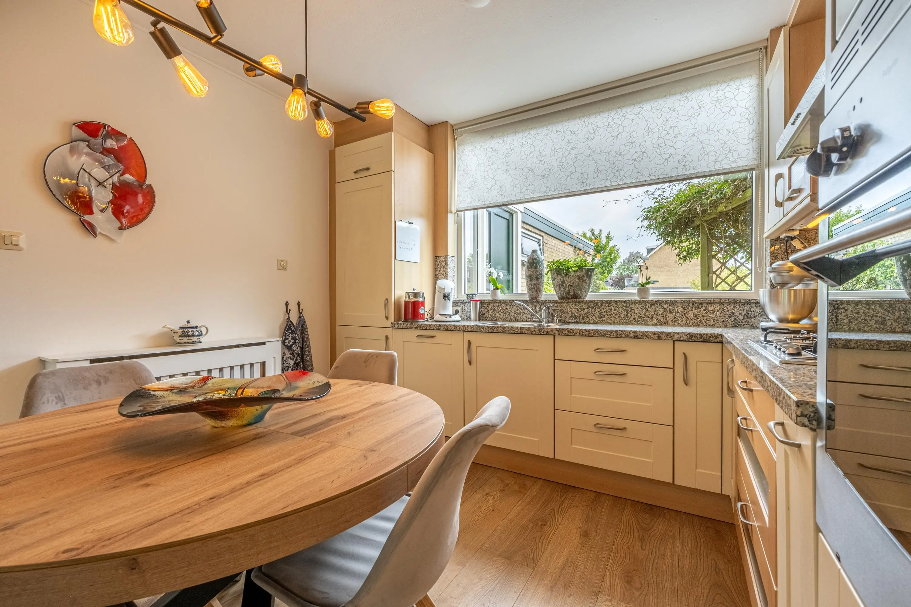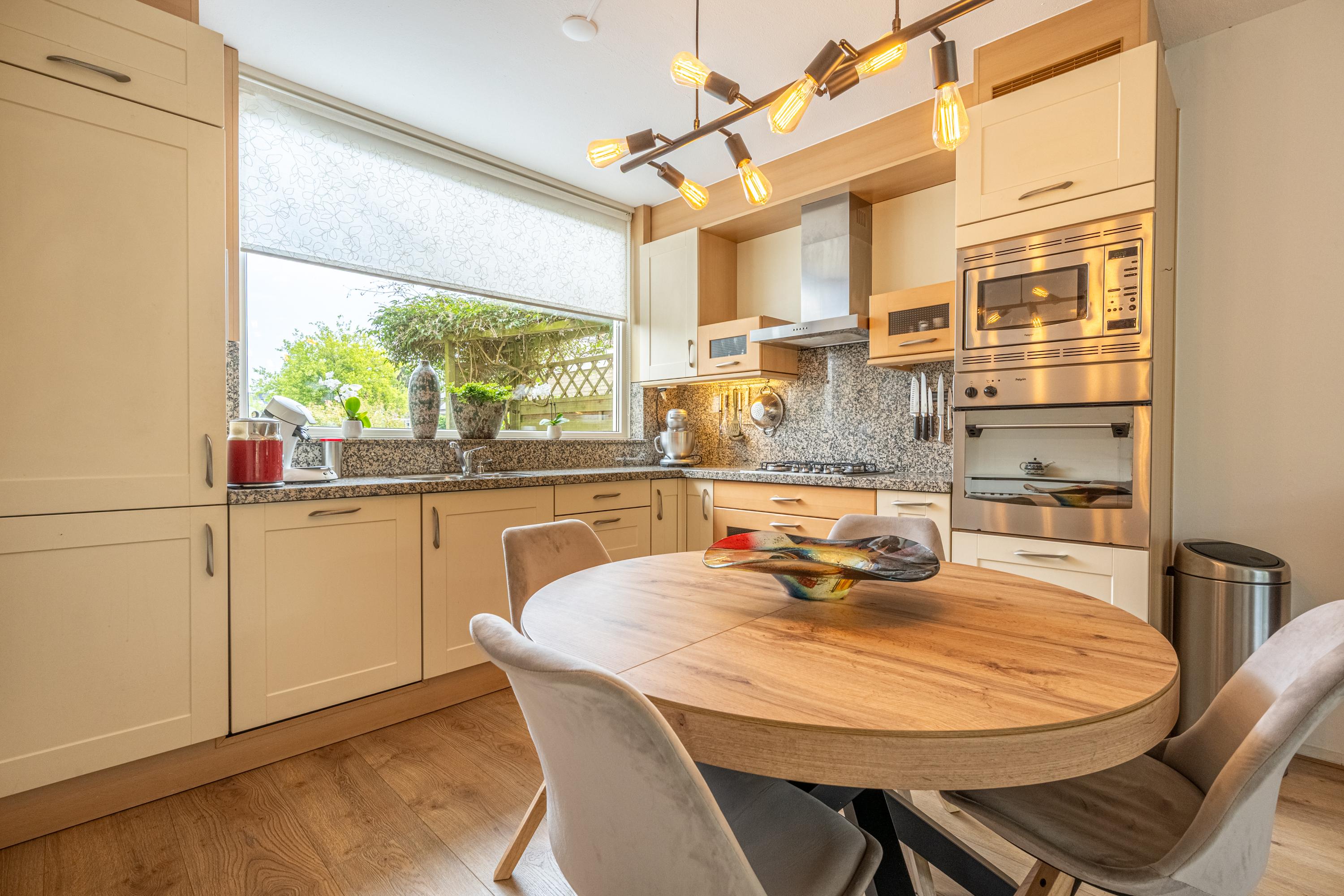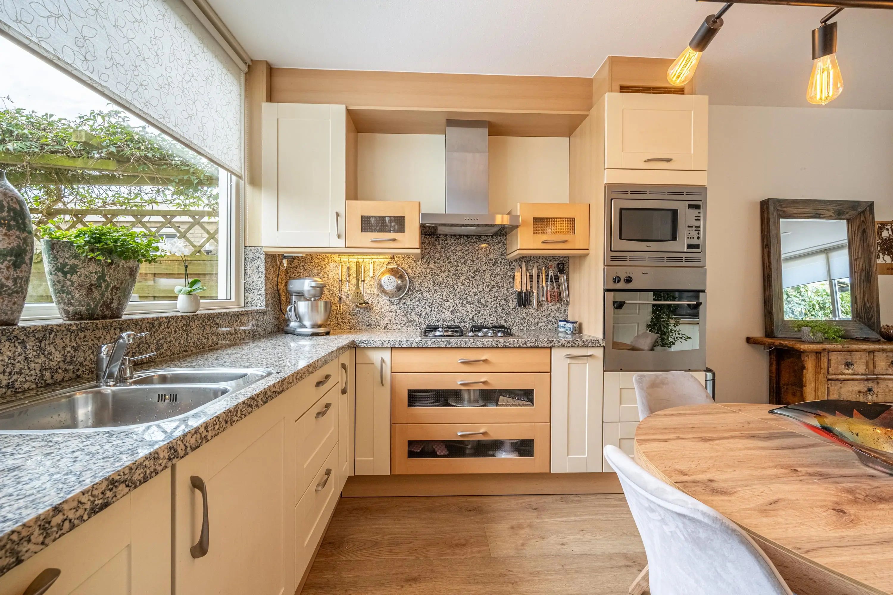 De open keuken is aan de voorzijde van de woning gelegen en heeft een dubbele wandopstelling met een granieten aanrechtblad. De apparatuur bestaat uit een vernieuwde koel-/vriescombinatie, een vaatwasser, een 4-pits gaskookplaat met afzuigkap, een oven en een magnetron. Een handige trapkast en een gezellig zitgedeelte maken het geheel compleet.