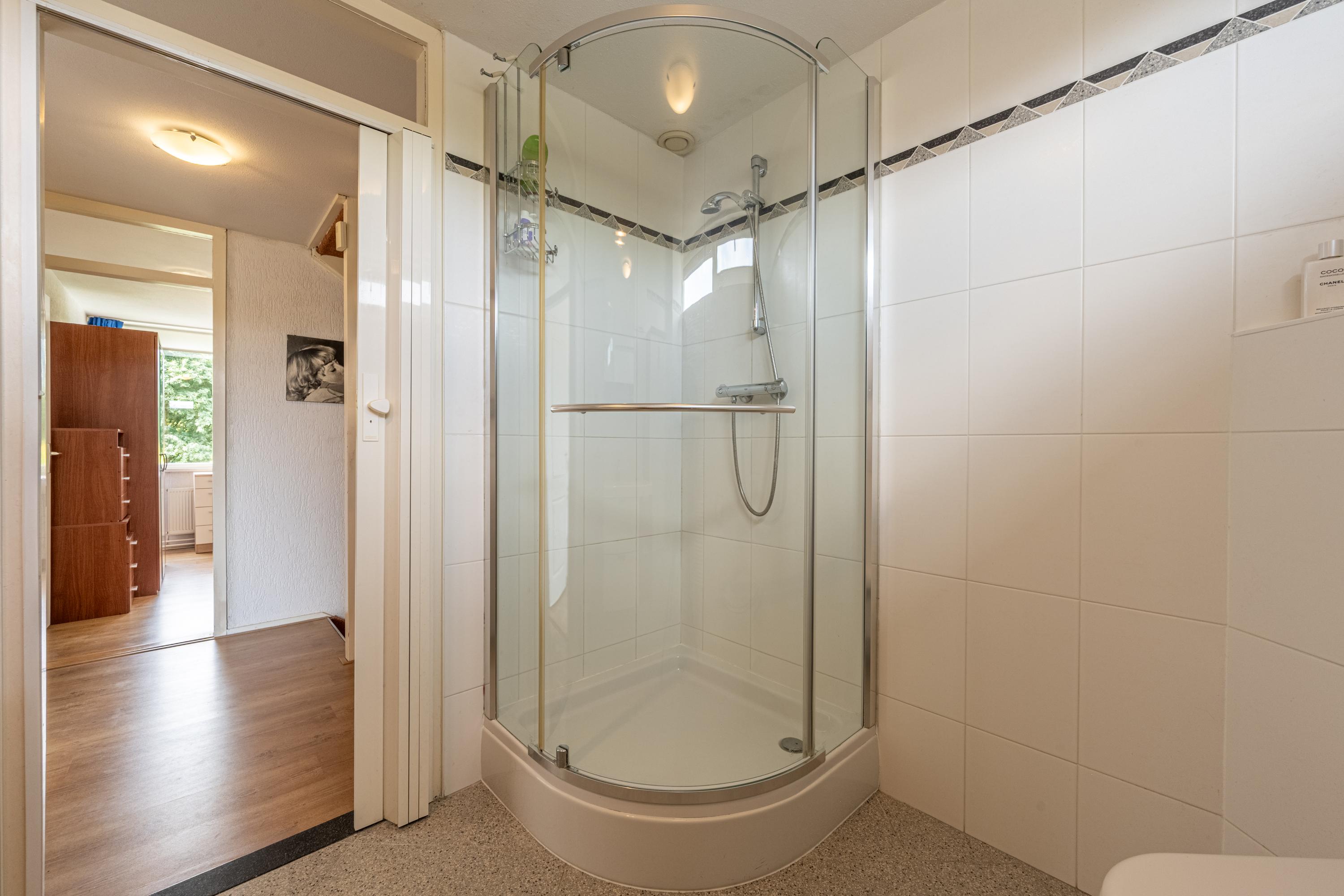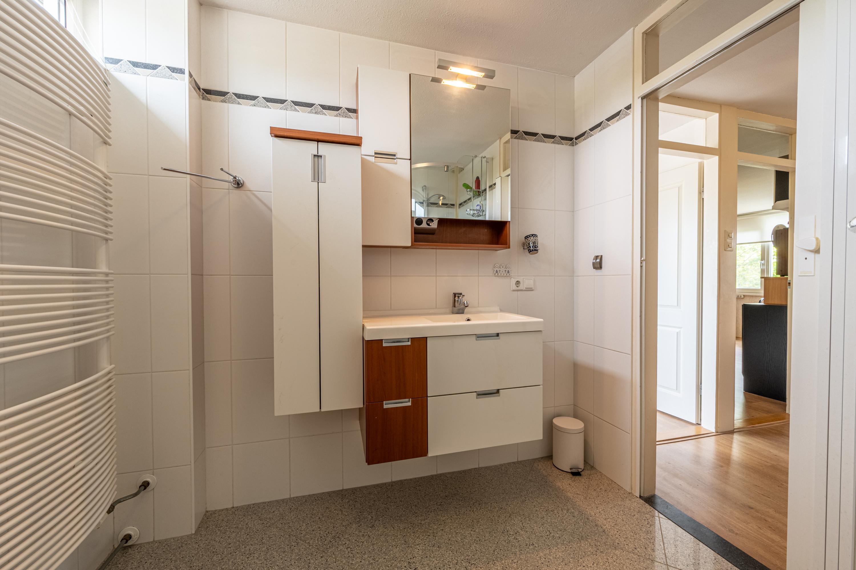 De verzorgde badkamer is volledig betegeld en ingericht met een wastafelmeubel, een 2e toilet, een douchecabine en een designradiator.