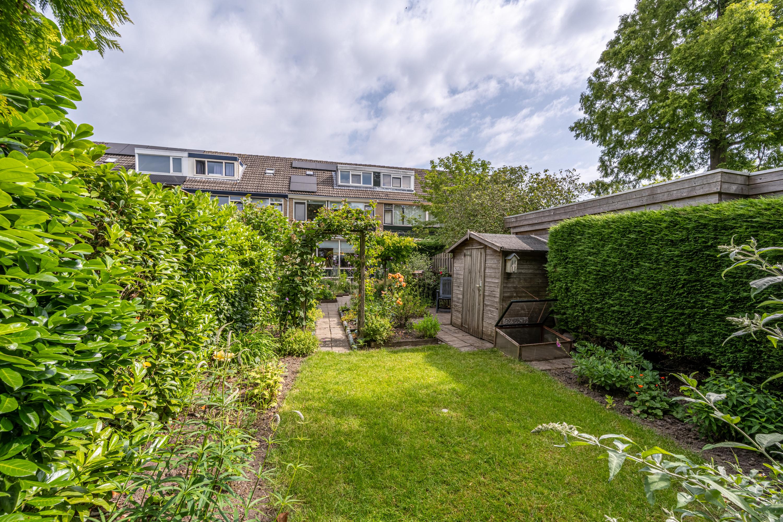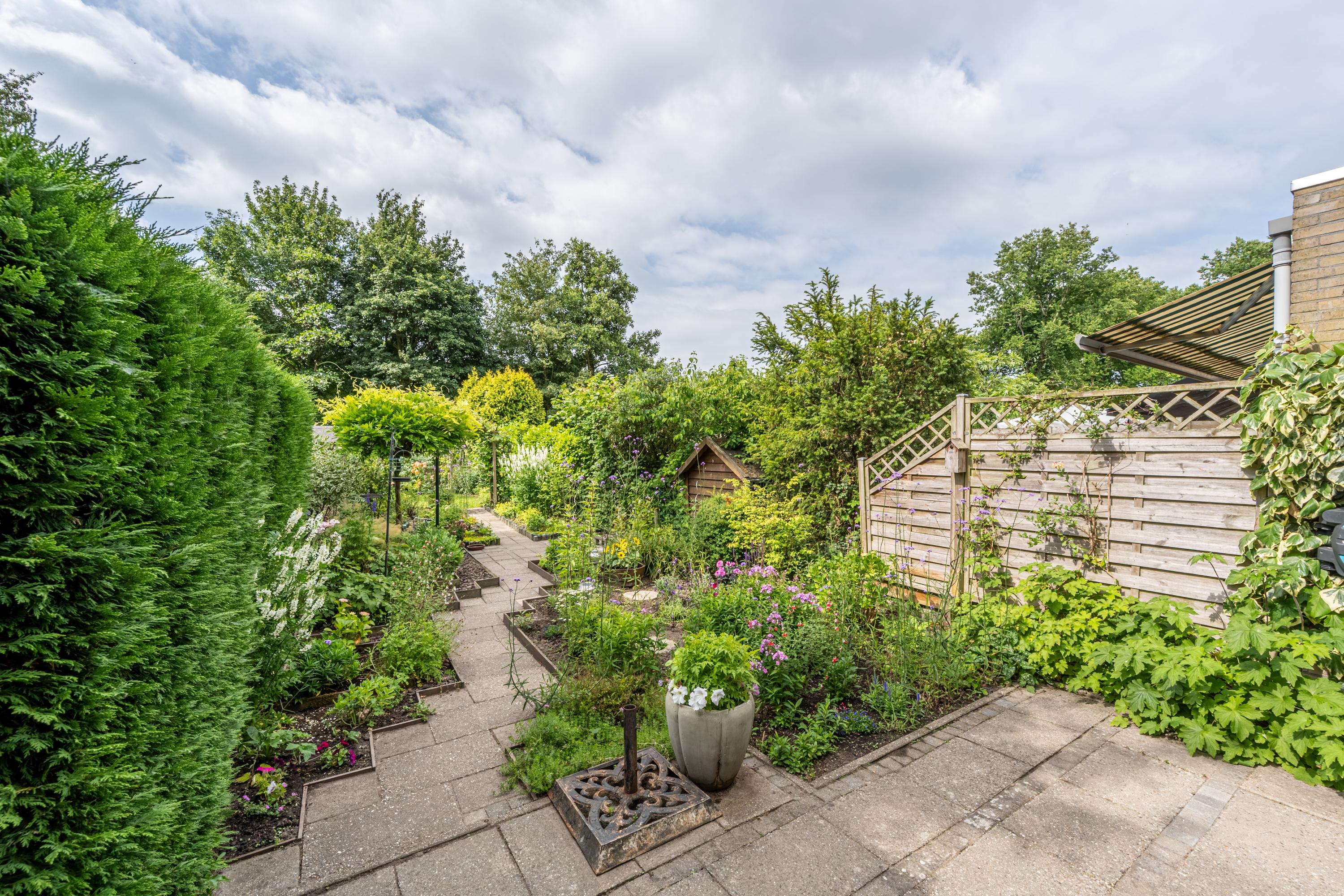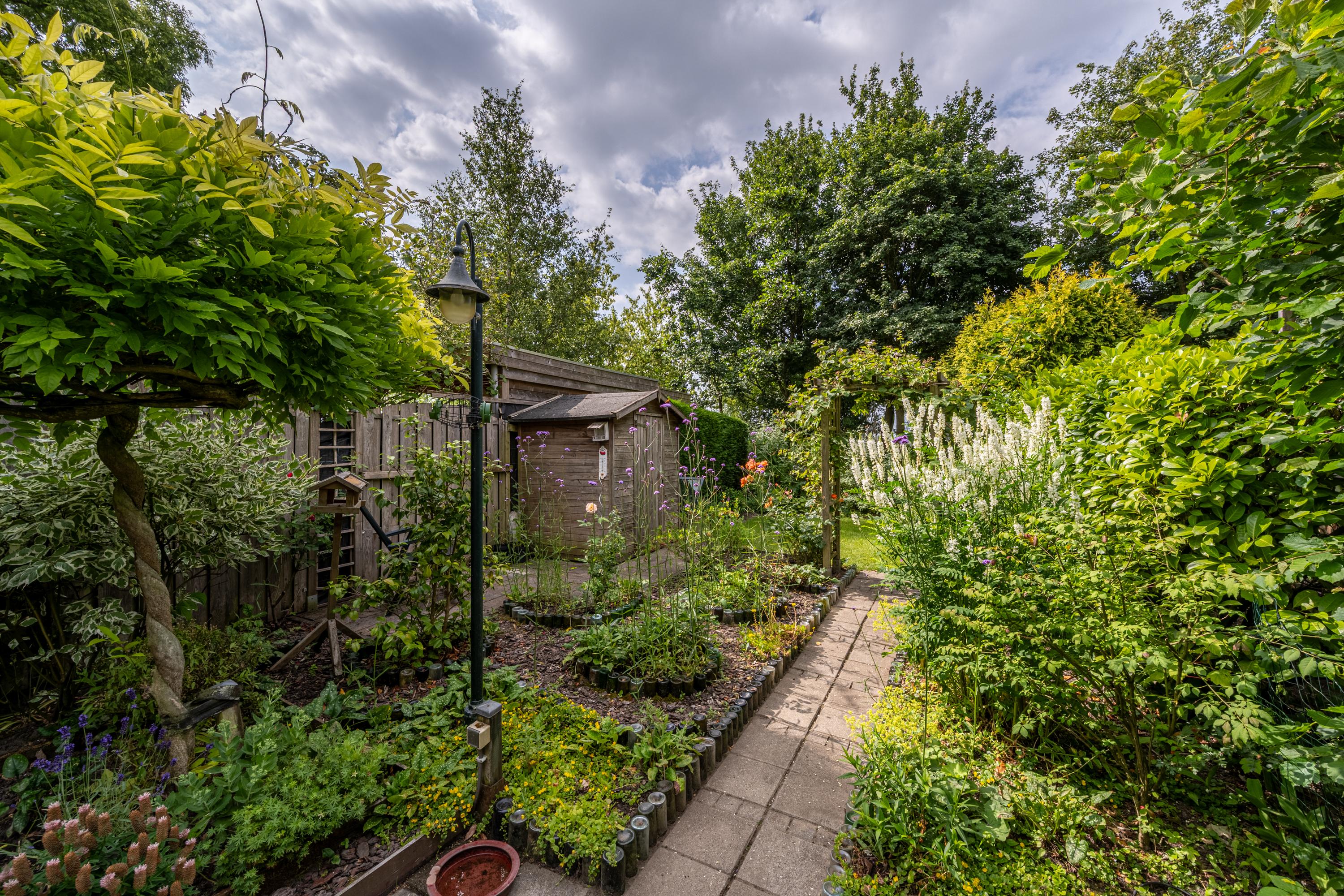 De charmante achtertuin is gelegen op het zonnige zuiden. Dankzij het elektrisch zonnescherm creëert men in een handomdraai een aangename schaduwplek. De tuin is netjes aangelegd met sierbestrating en gevarieerde beplanting, wat zorgt voor een verzorgde en sfeervolle uitstraling. Achterin de tuin staat een praktisch houten schuurtje – ideaal voor bijvoorbeeld tuinspullen.