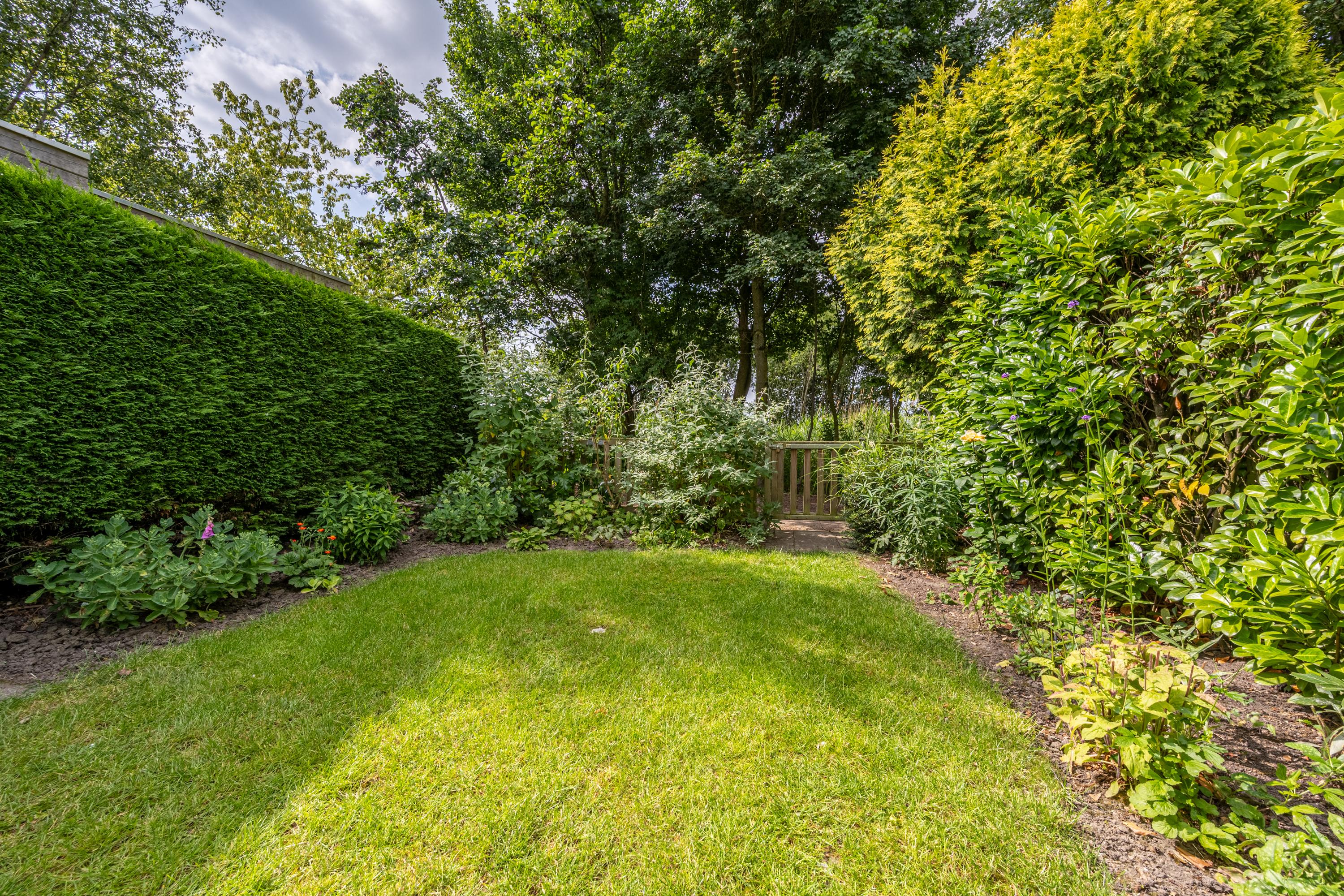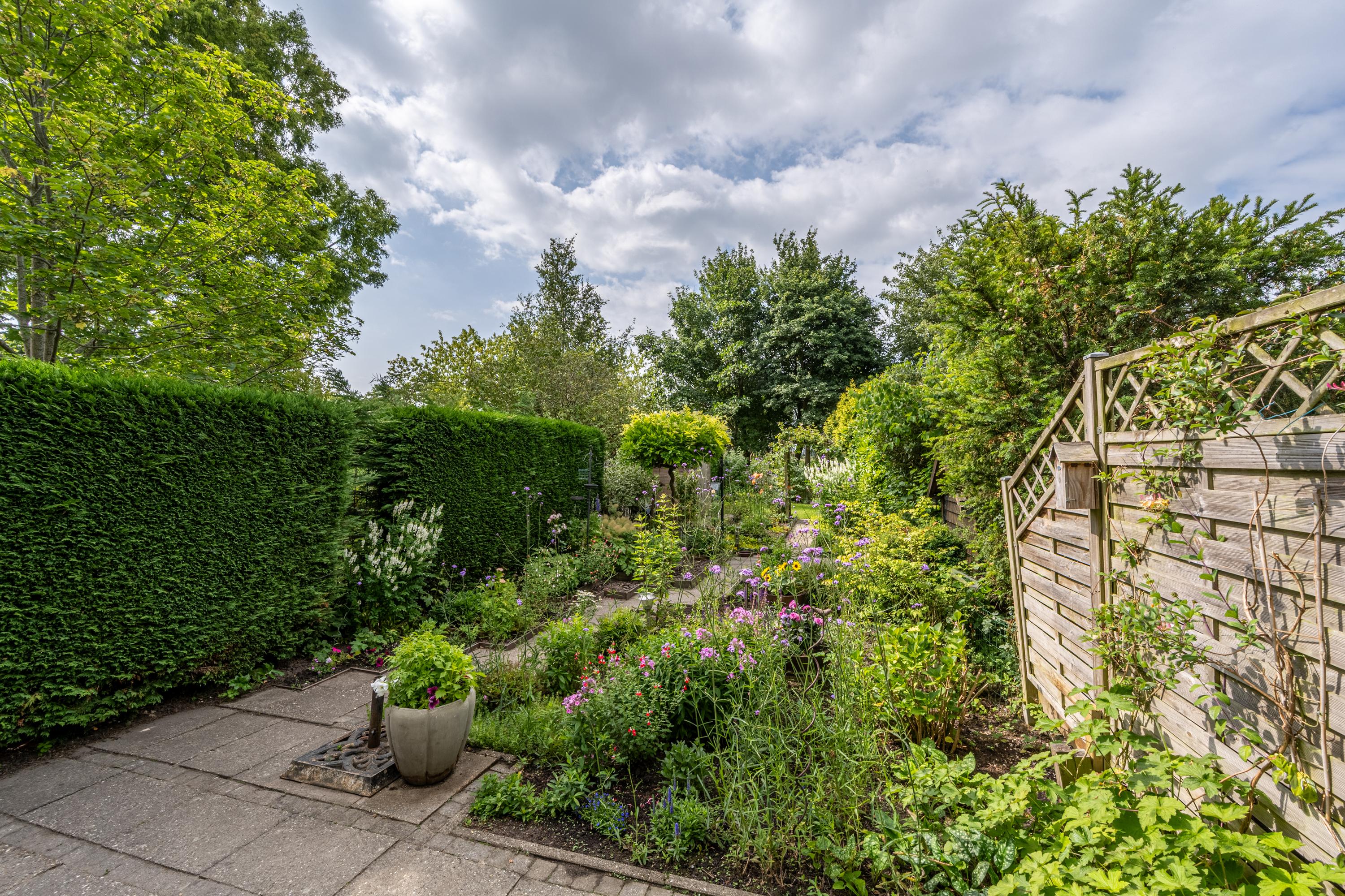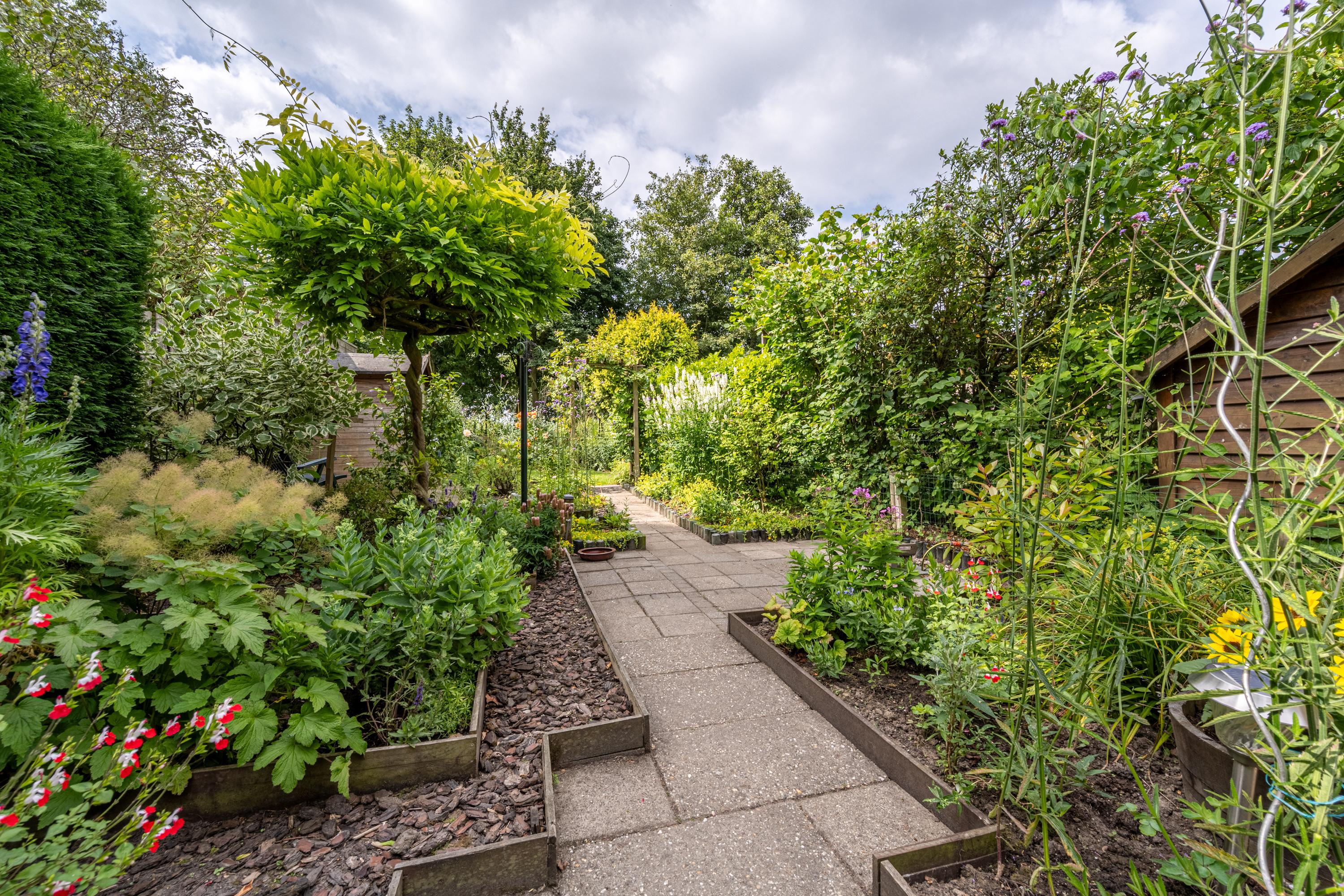 De charmante achtertuin is gelegen op het zonnige zuiden. Dankzij het elektrisch zonnescherm creëert men in een handomdraai een aangename schaduwplek. De tuin is netjes aangelegd met sierbestrating en gevarieerde beplanting, wat zorgt voor een verzorgde en sfeervolle uitstraling. Achterin de tuin staat een praktisch houten schuurtje – ideaal voor bijvoorbeeld tuinspullen.