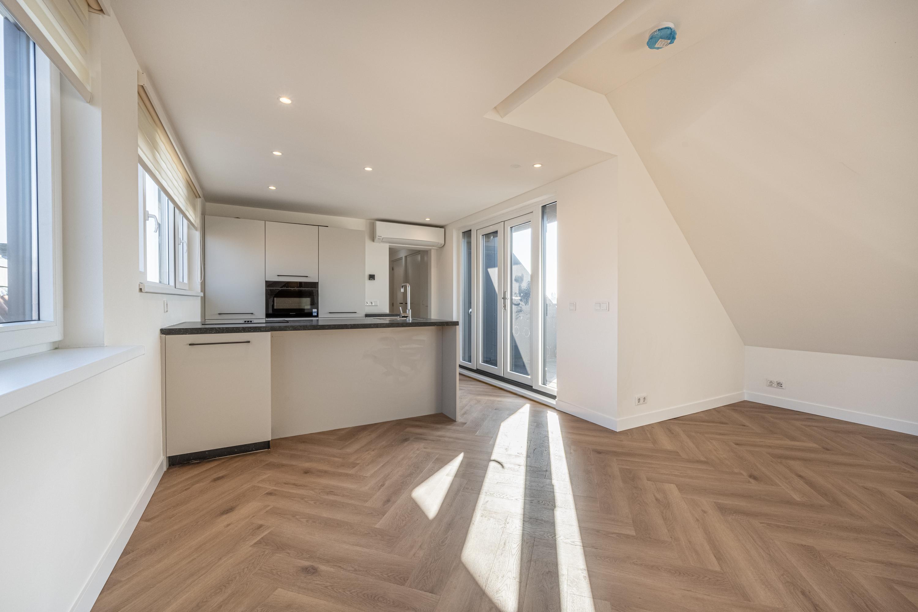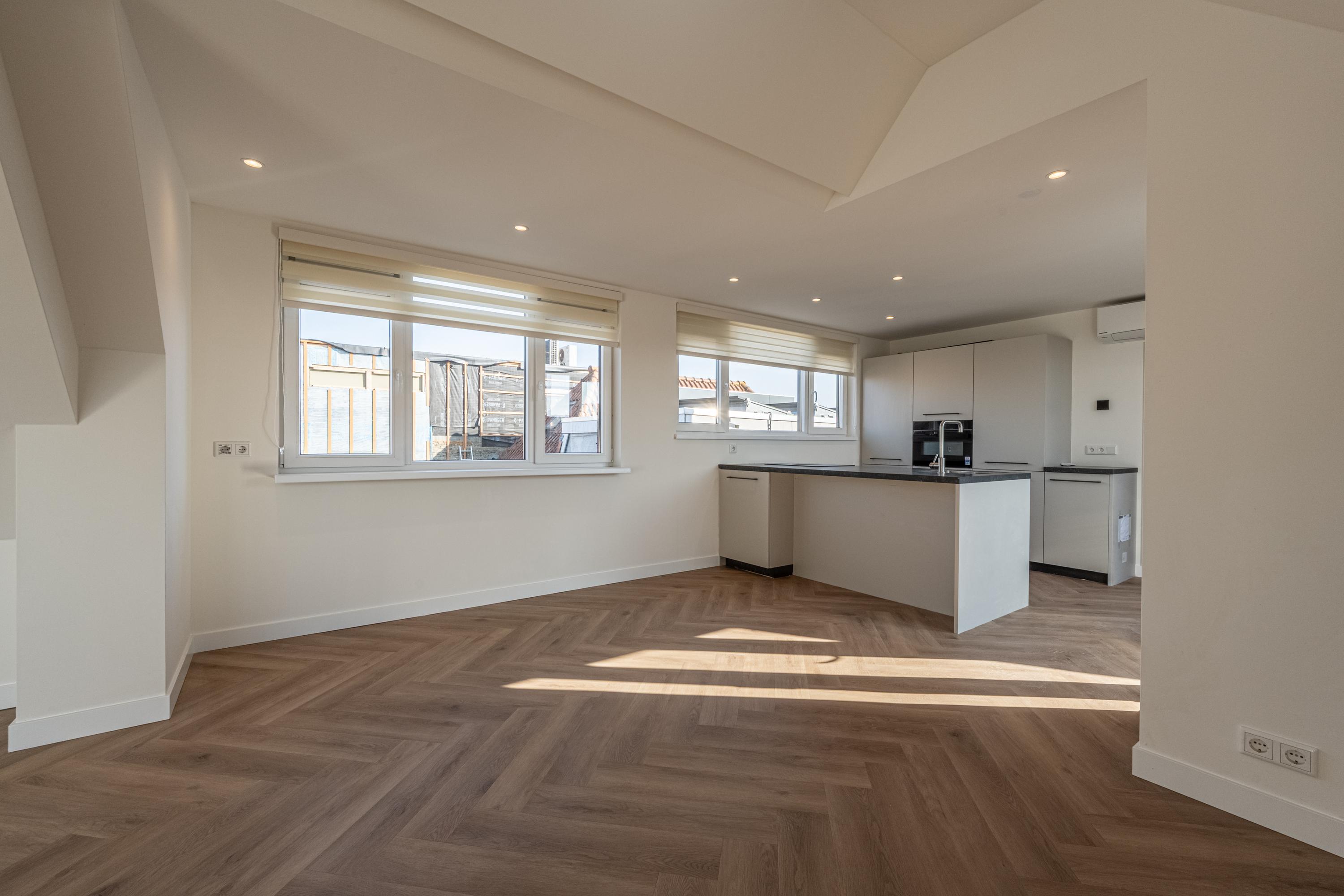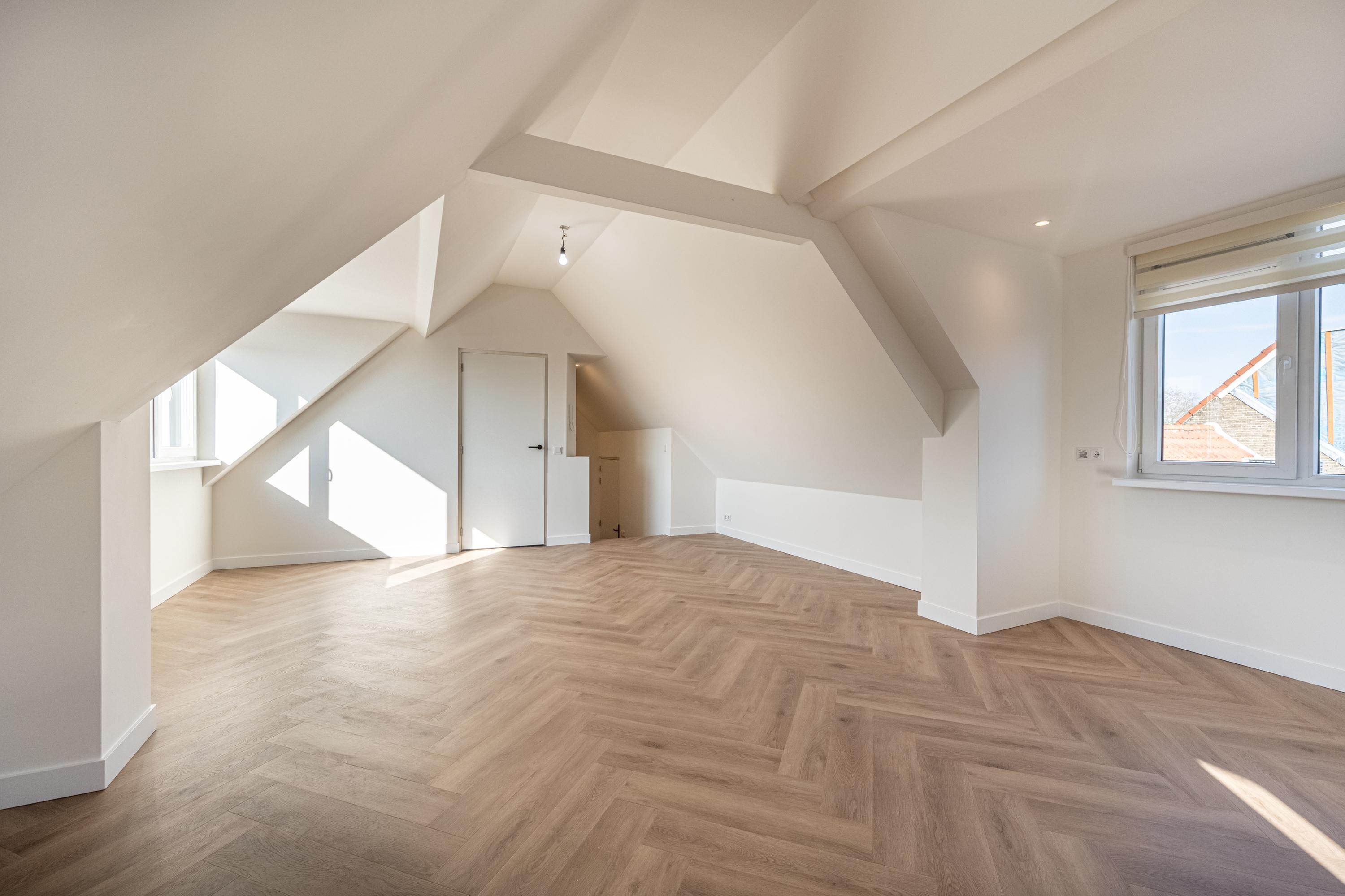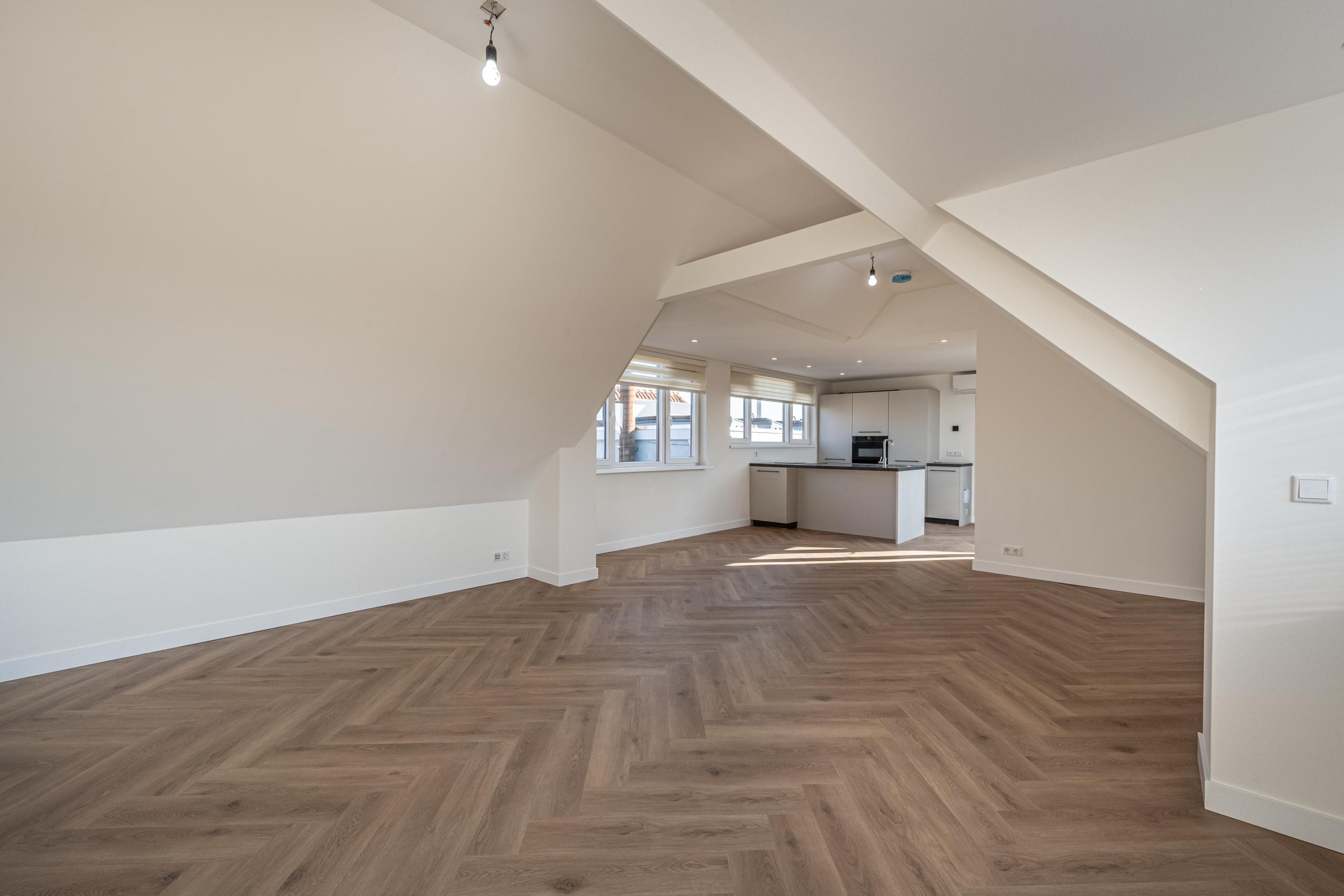 De woonkamer en keuken vormen samen een open en samenhangende ruimte. De afwerking kenmerkt zich door strak gestucte wanden en plafonds, inbouwspots en een in visgraat gelegde PVC-vloer met hoge plinten die in vrijwel de gehele woning is doorgelegd. Meerdere dakkapellen zorgen voor extra ruimte en daglicht.