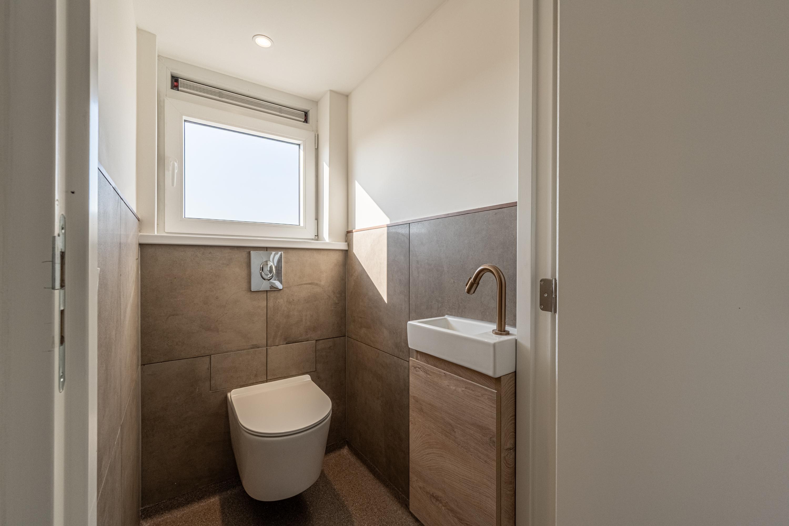 Via de keuken bereikt u de hal, waar zich de groepenkast, een bergkast met opstelplaats van de boiler, een moderne toiletruimte met zwevend toilet en fonteintje en een separate ruimte met aansluitingen voor wasmachine en droger bevinden.