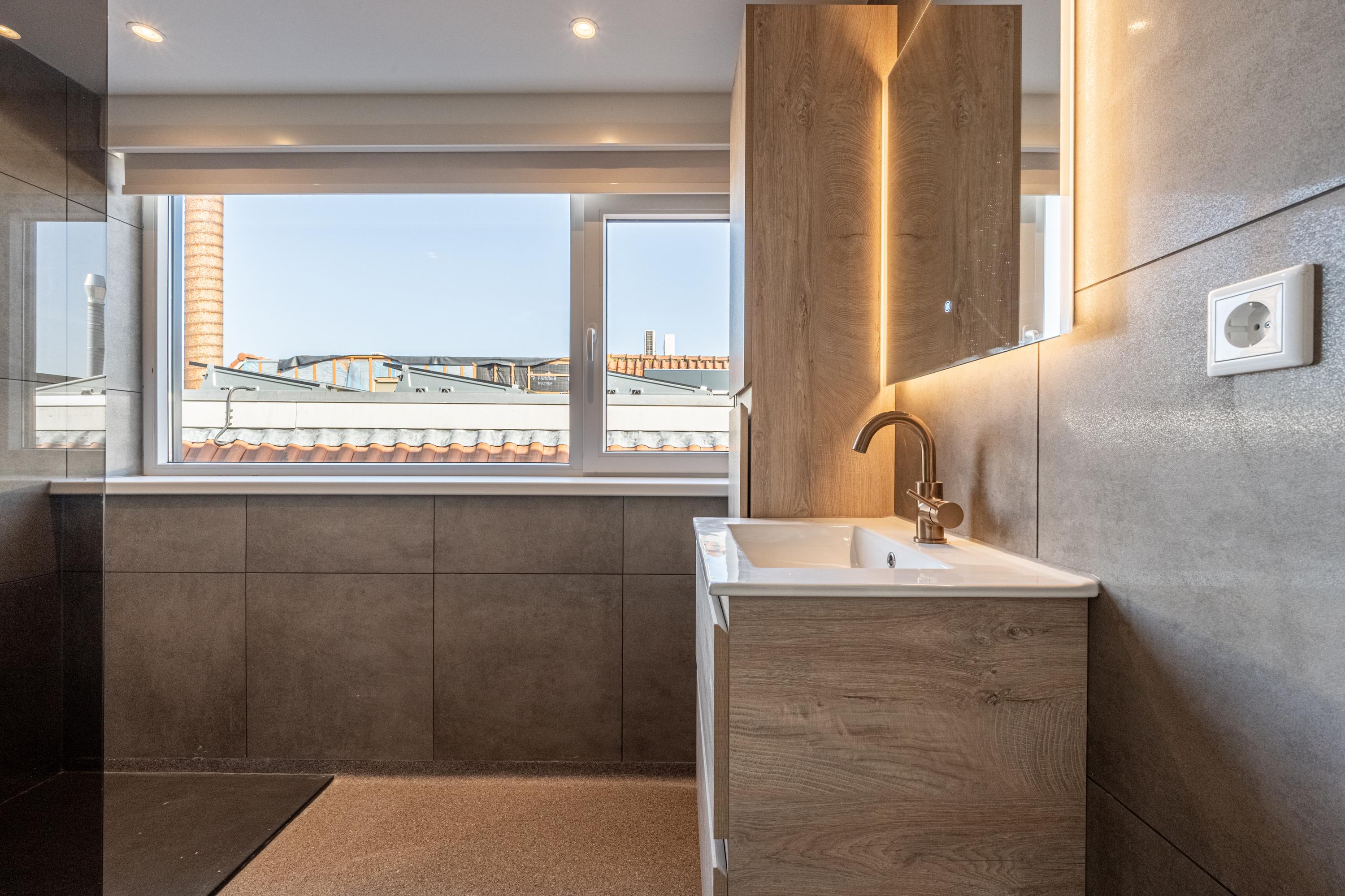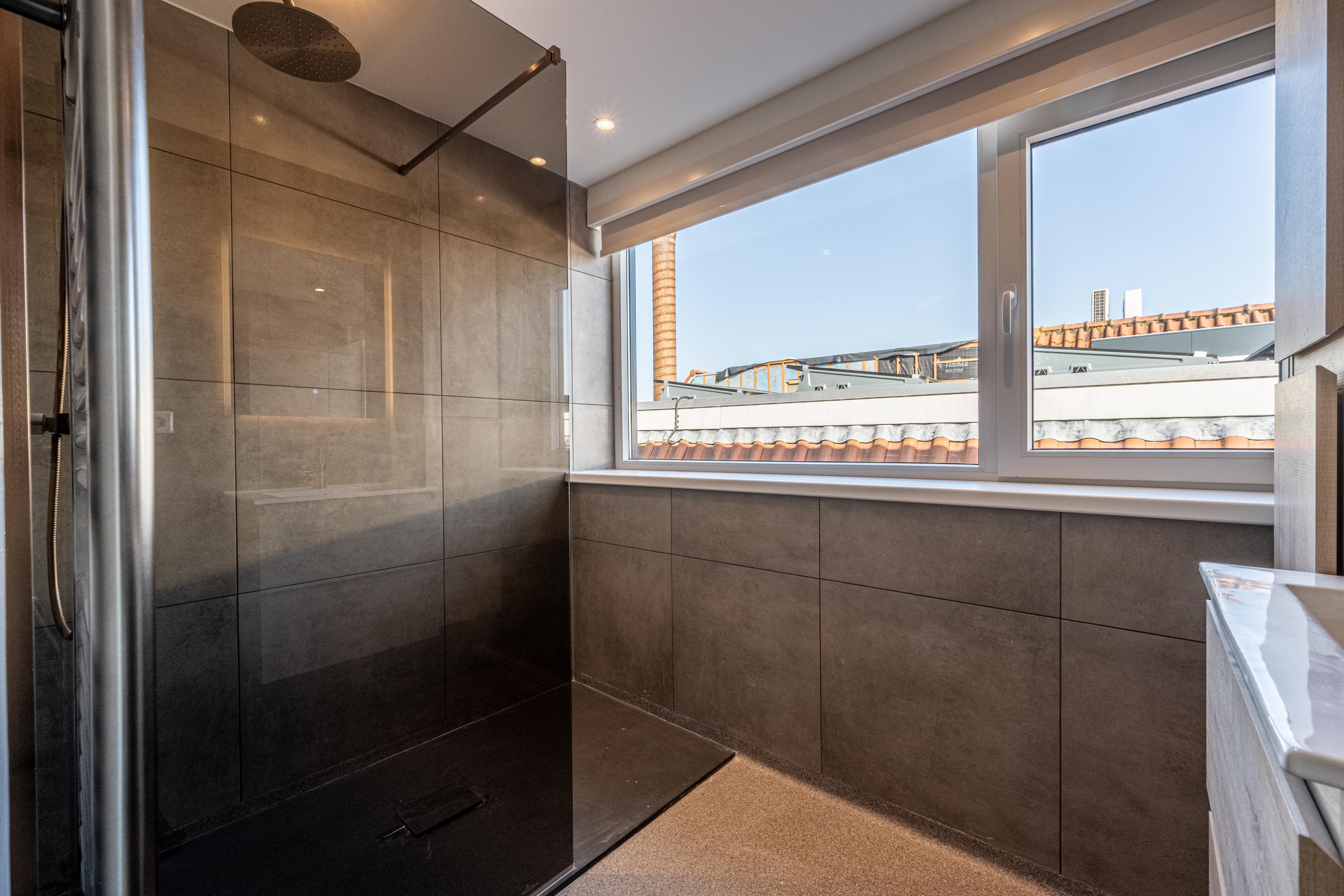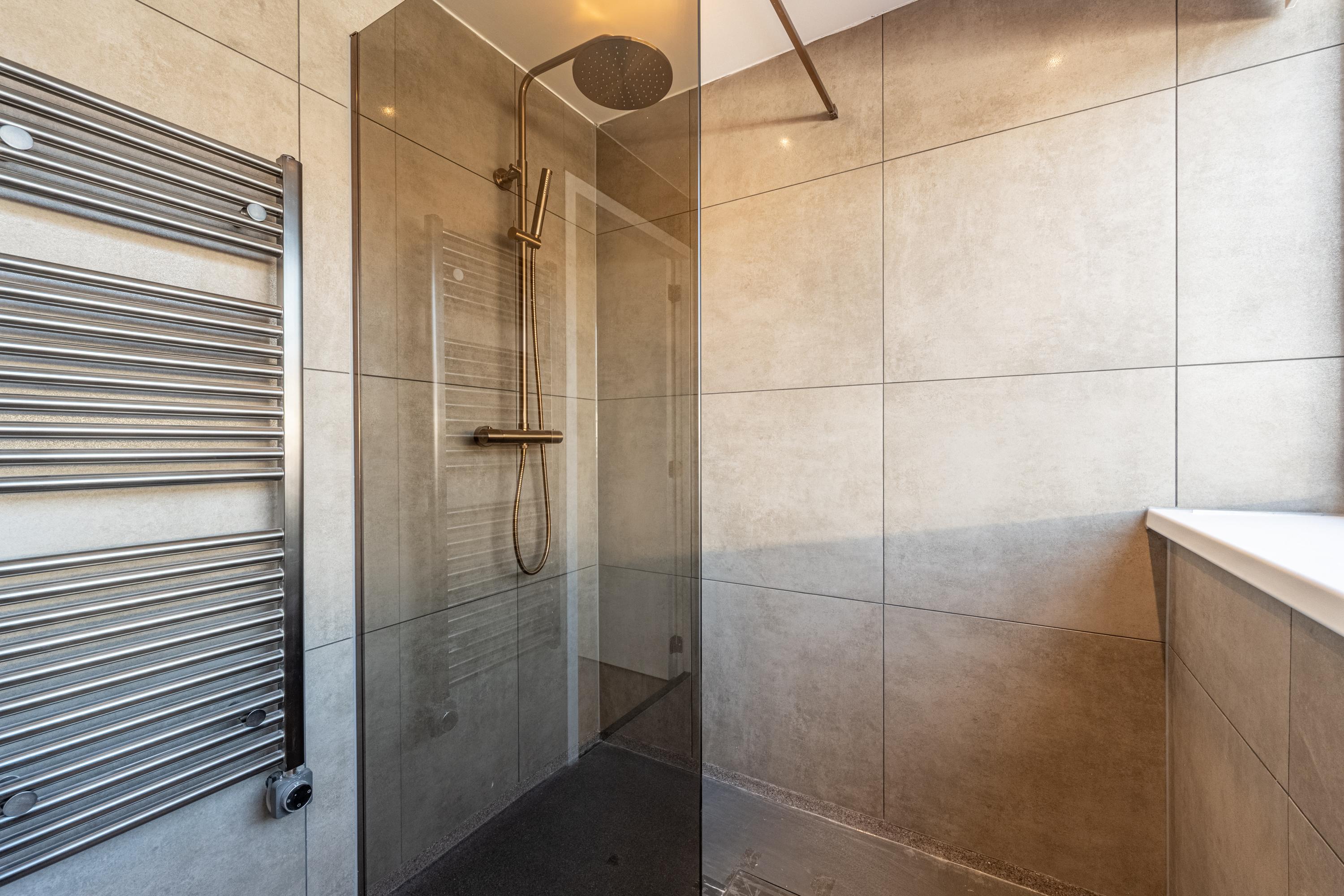 De badkamer is modern uitgevoerd en beschikt over een inloopdouche met hand- en stortdouche, een designradiator en een wastafelmeubel met opbergruimte en spiegel met verlichting. De wanden zijn volledig betegeld en de vloer is afgewerkt met een waterdichte gietvloer.