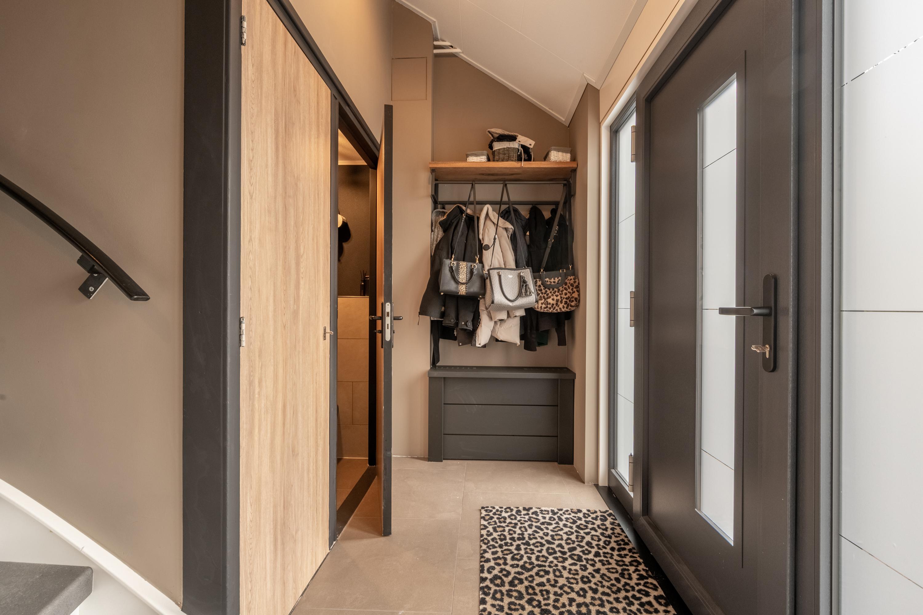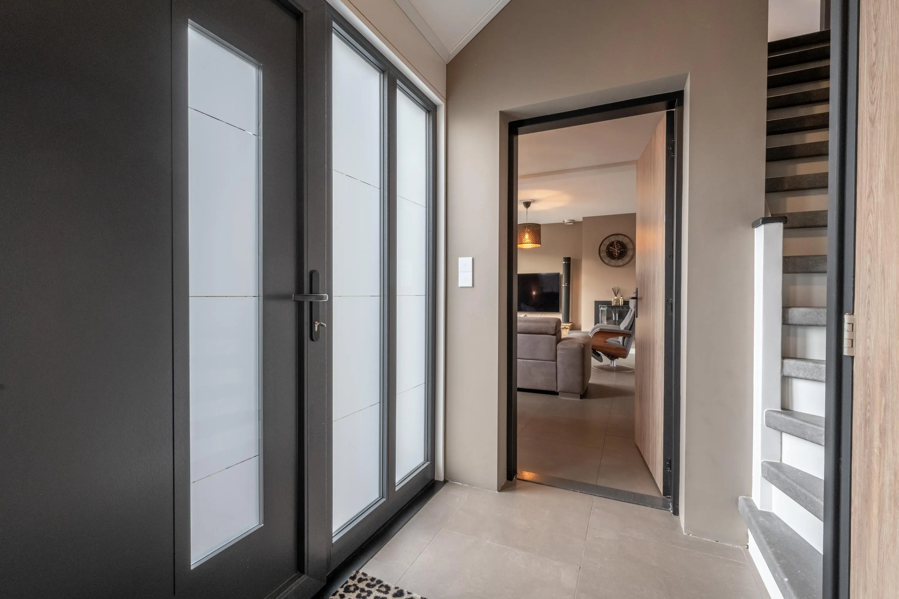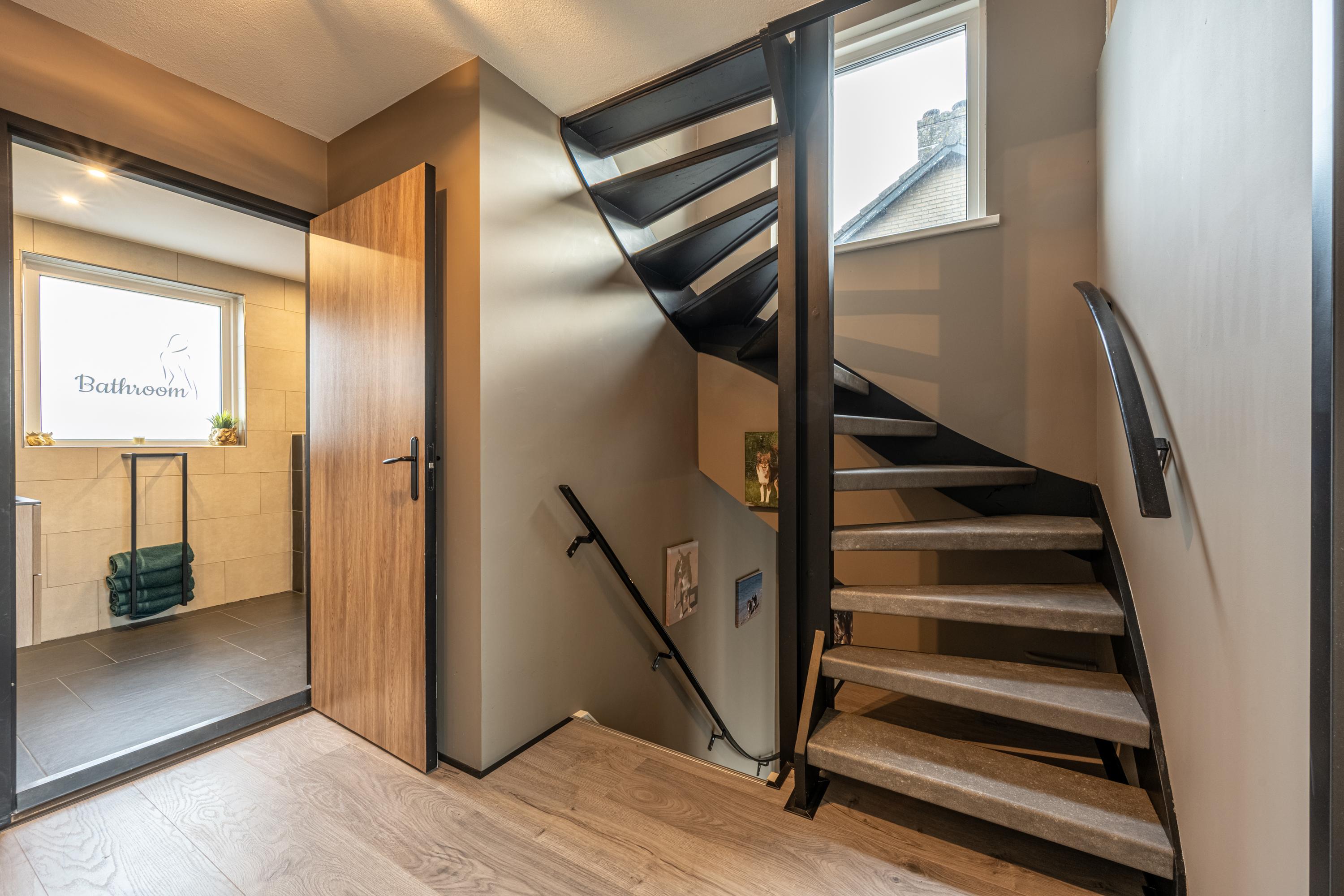 Via de entree met toiletruimte, meterkast en trapopgang bereik je de sfeervolle woonkamer. Grote raampartijen zorgen voor een zee aan licht, terwijl de praktische trapkast extra bergruimte biedt.