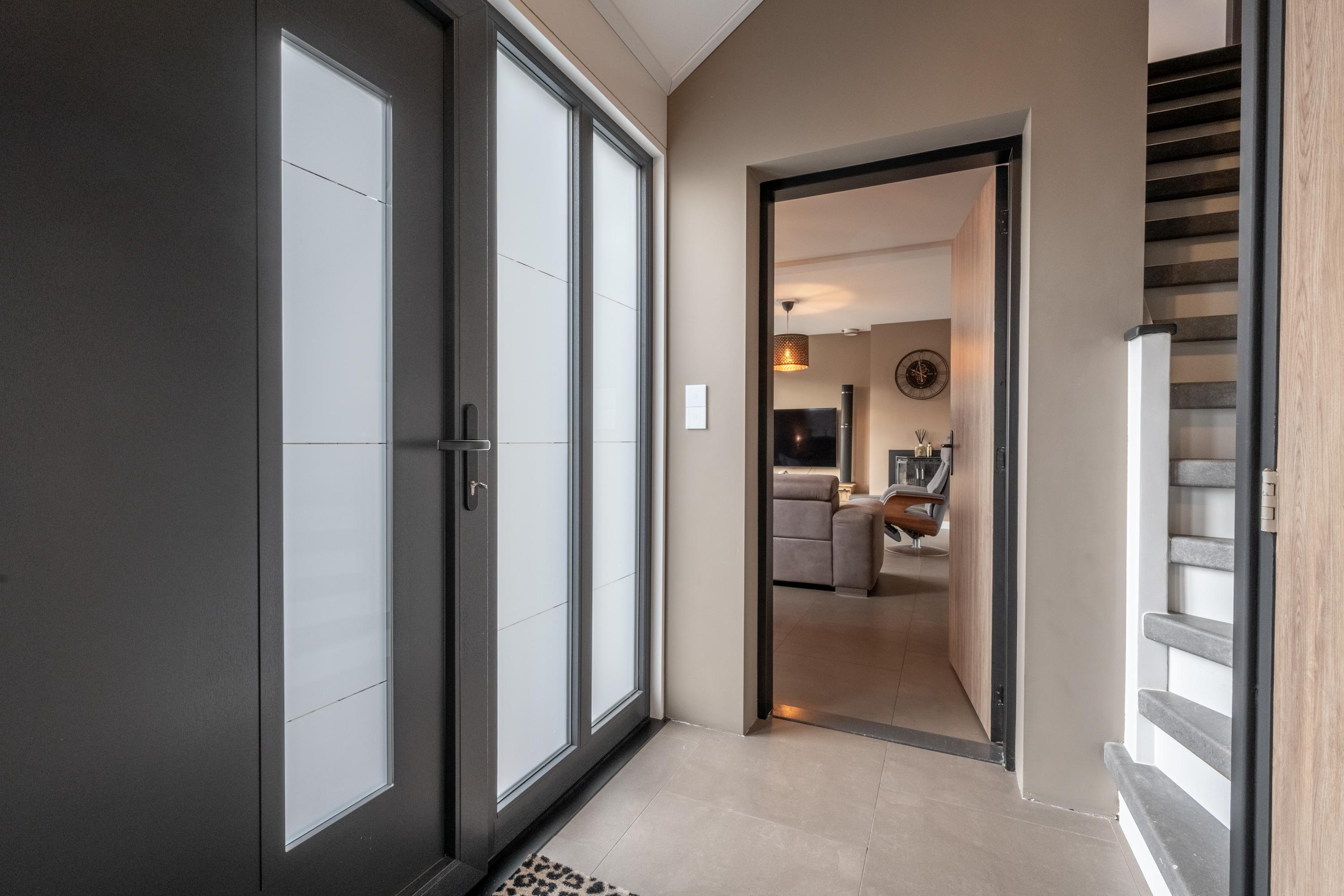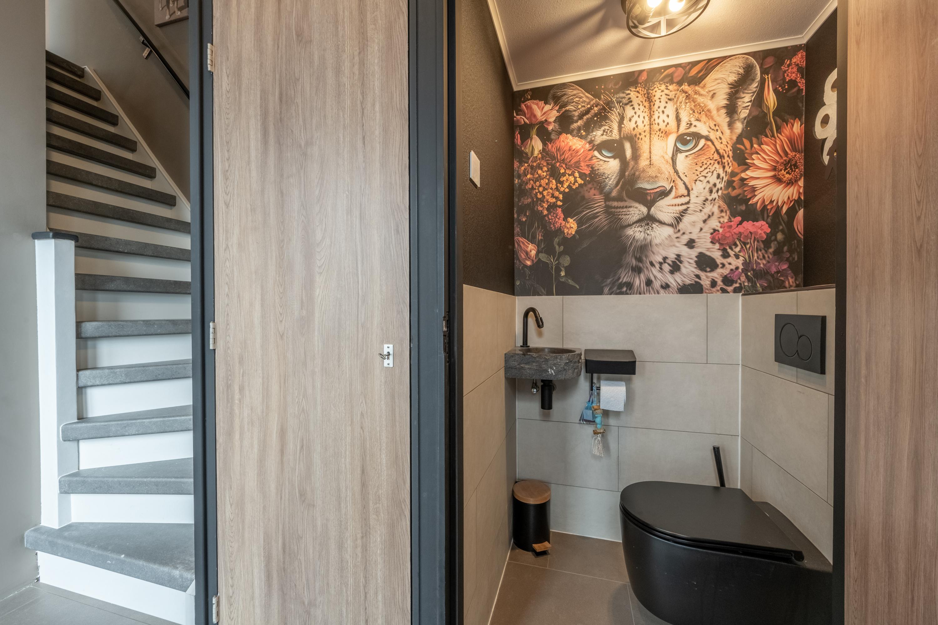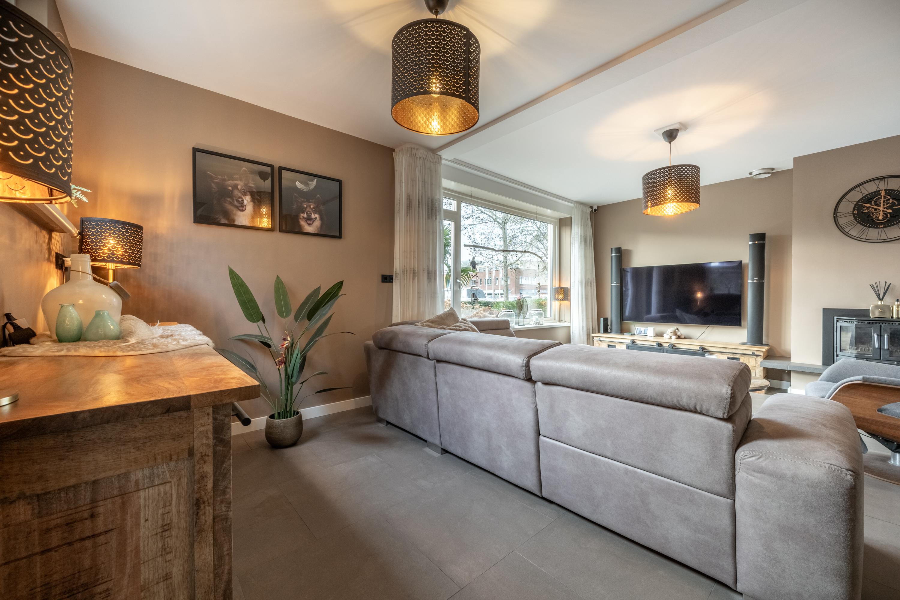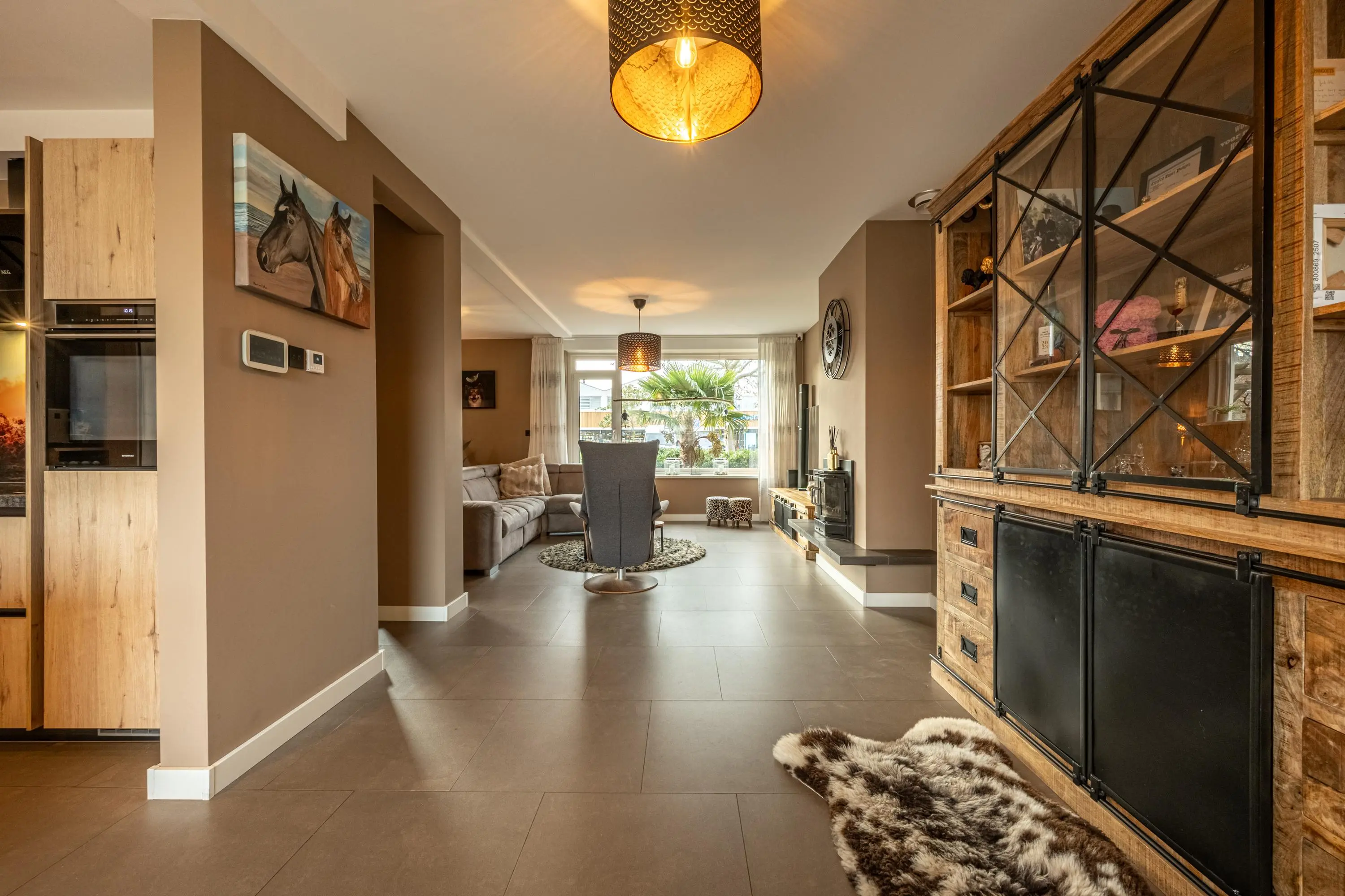 Via de entree met toiletruimte, meterkast en trapopgang bereik je de sfeervolle woonkamer. Grote raampartijen zorgen voor een zee aan licht, terwijl de praktische trapkast extra bergruimte biedt.
