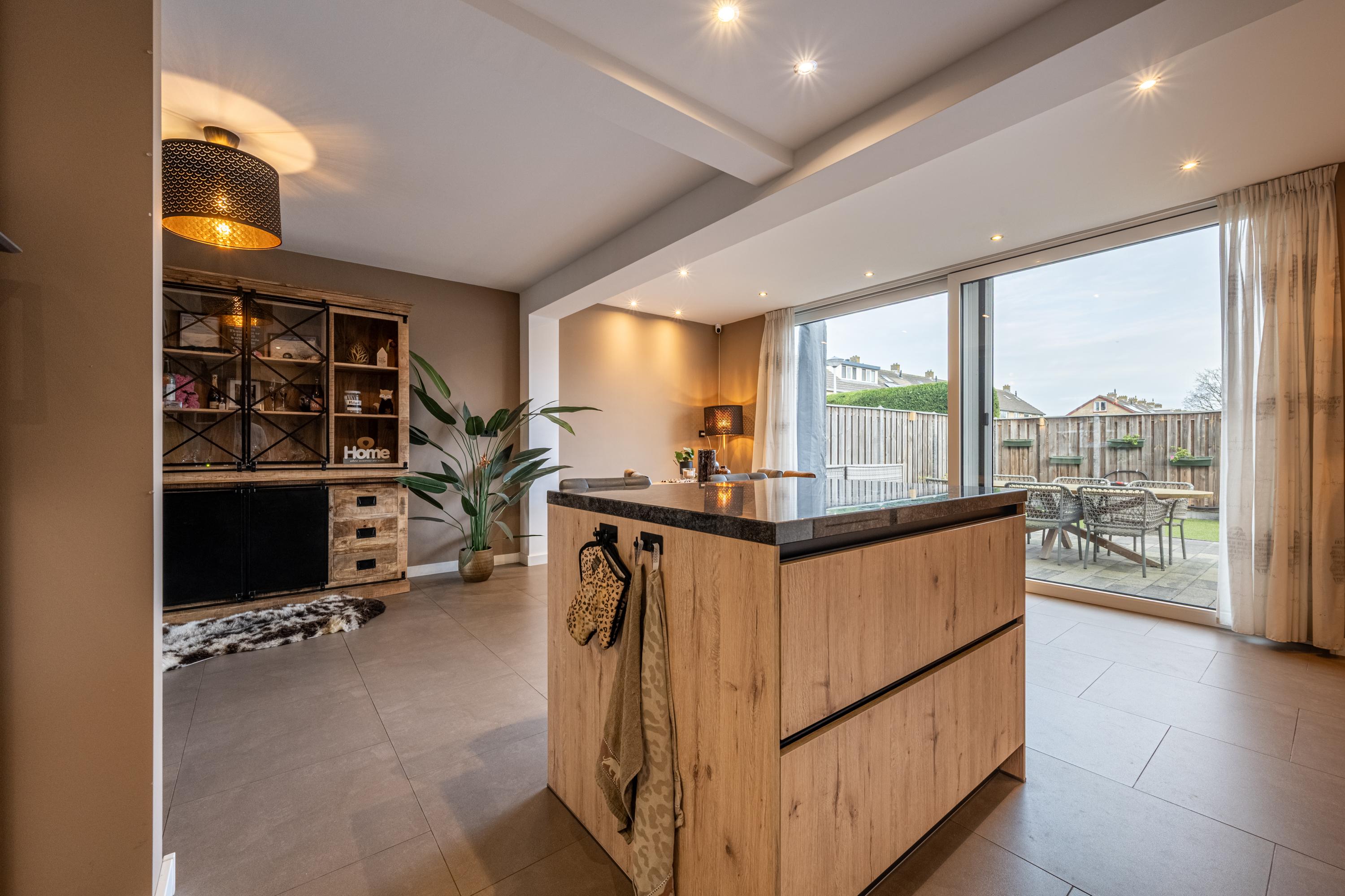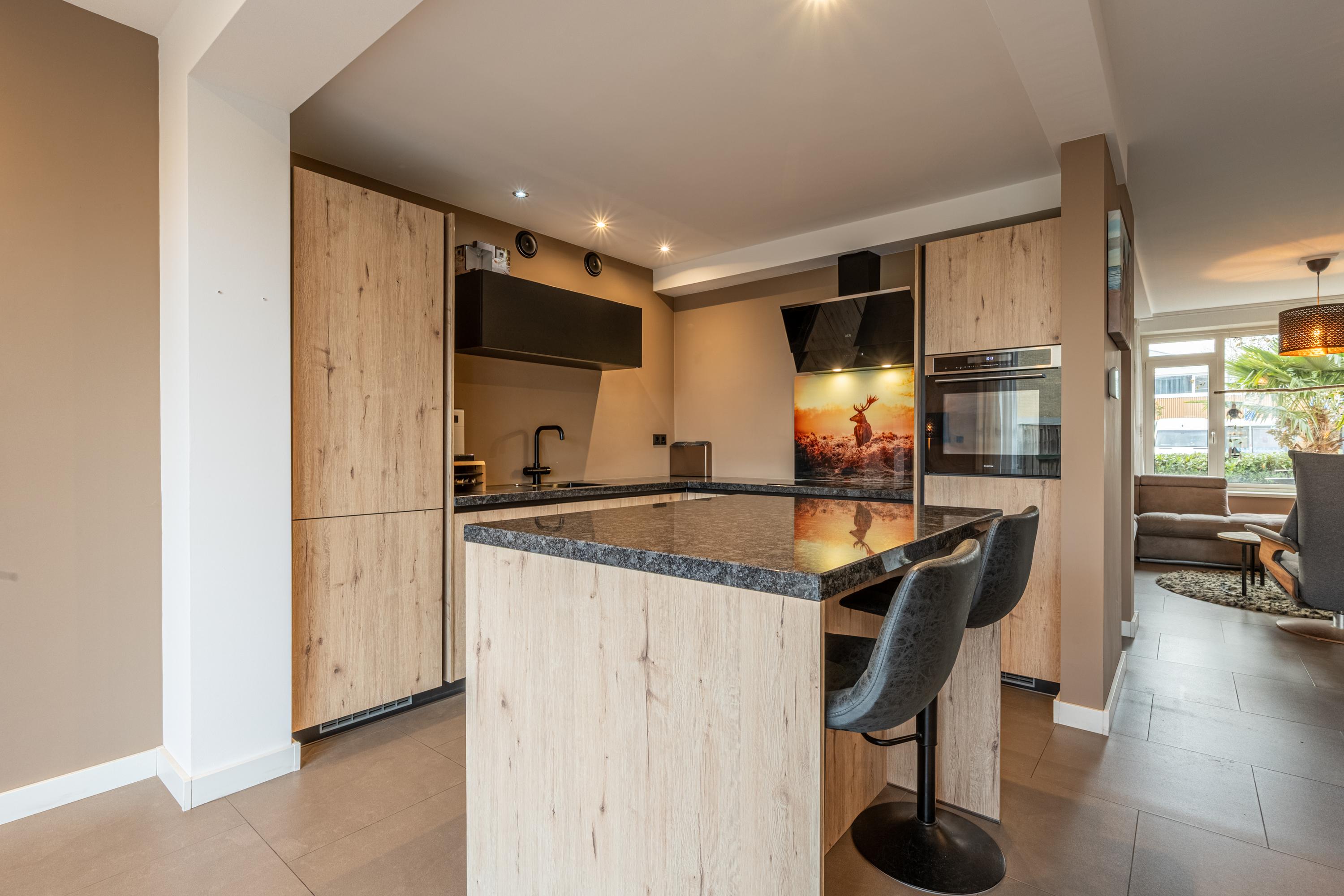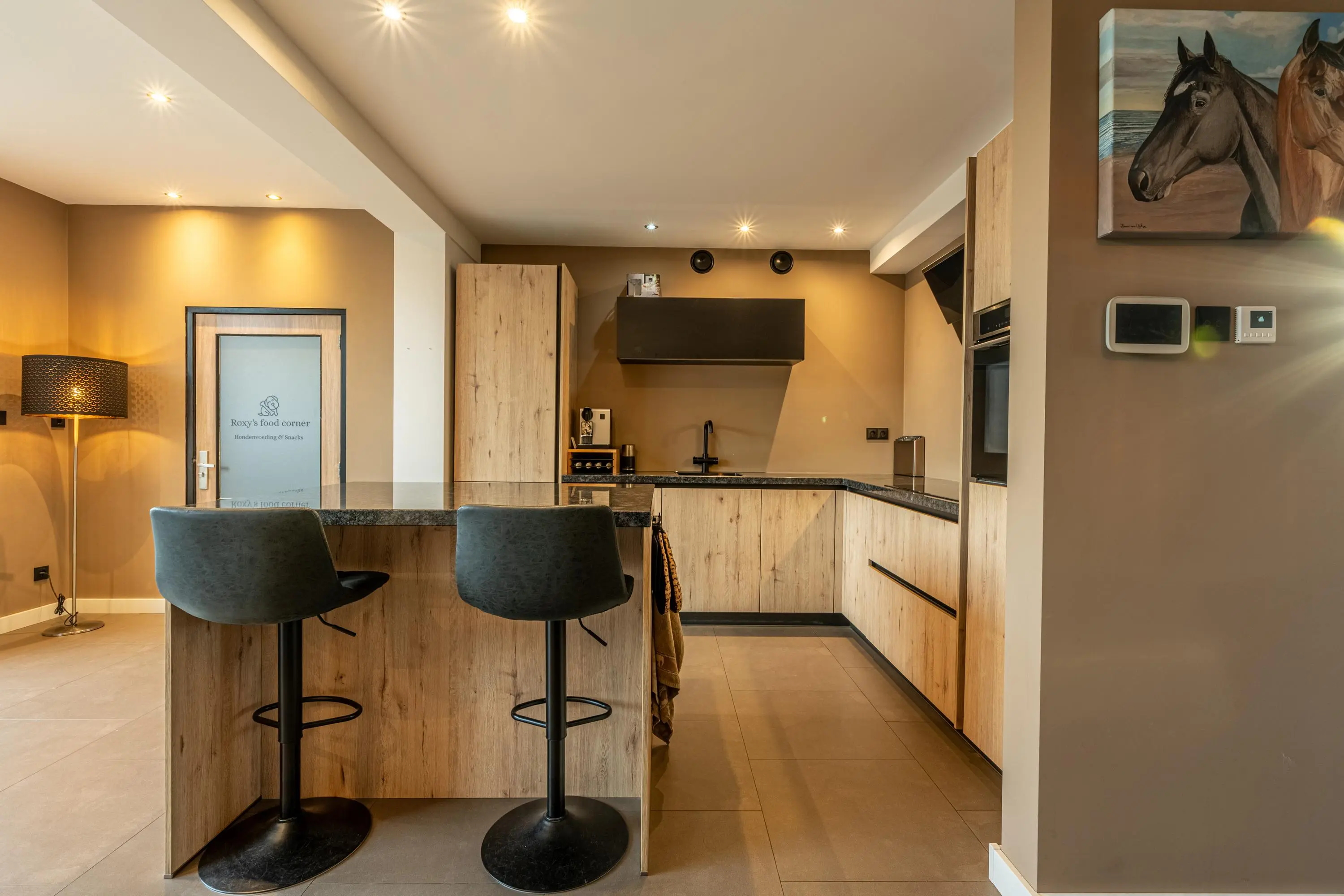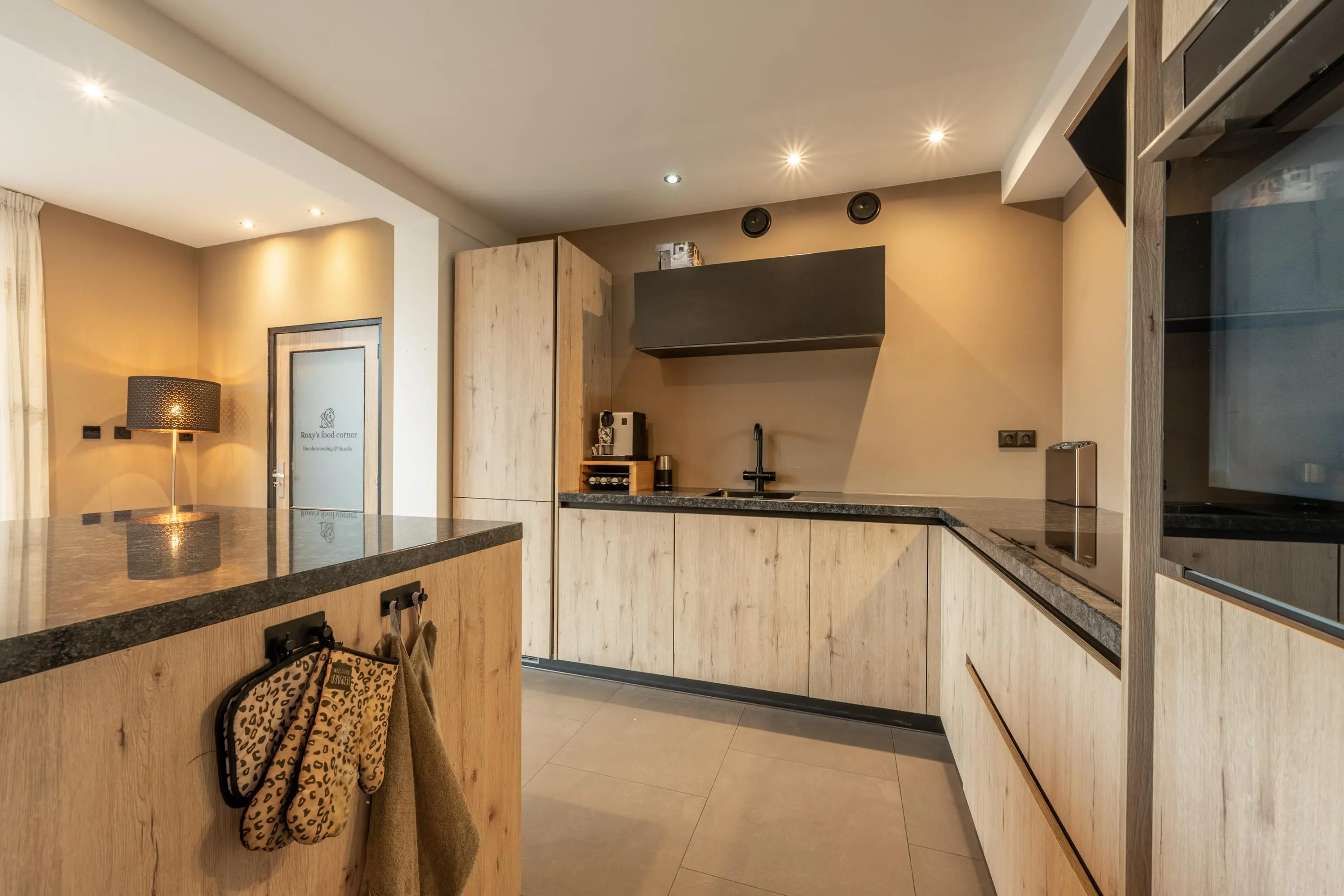 Aan de achterzijde bevindt zich de in 2021 vernieuwde woonkeuken, uitgerust met inductiekookplaat, afzuigscherm, vaatwasser, koelkast, vriezer, combimagnetron en Howat-kraan. Dankzij vloerverwarming en airco is het hier het hele jaar door comfortabel.