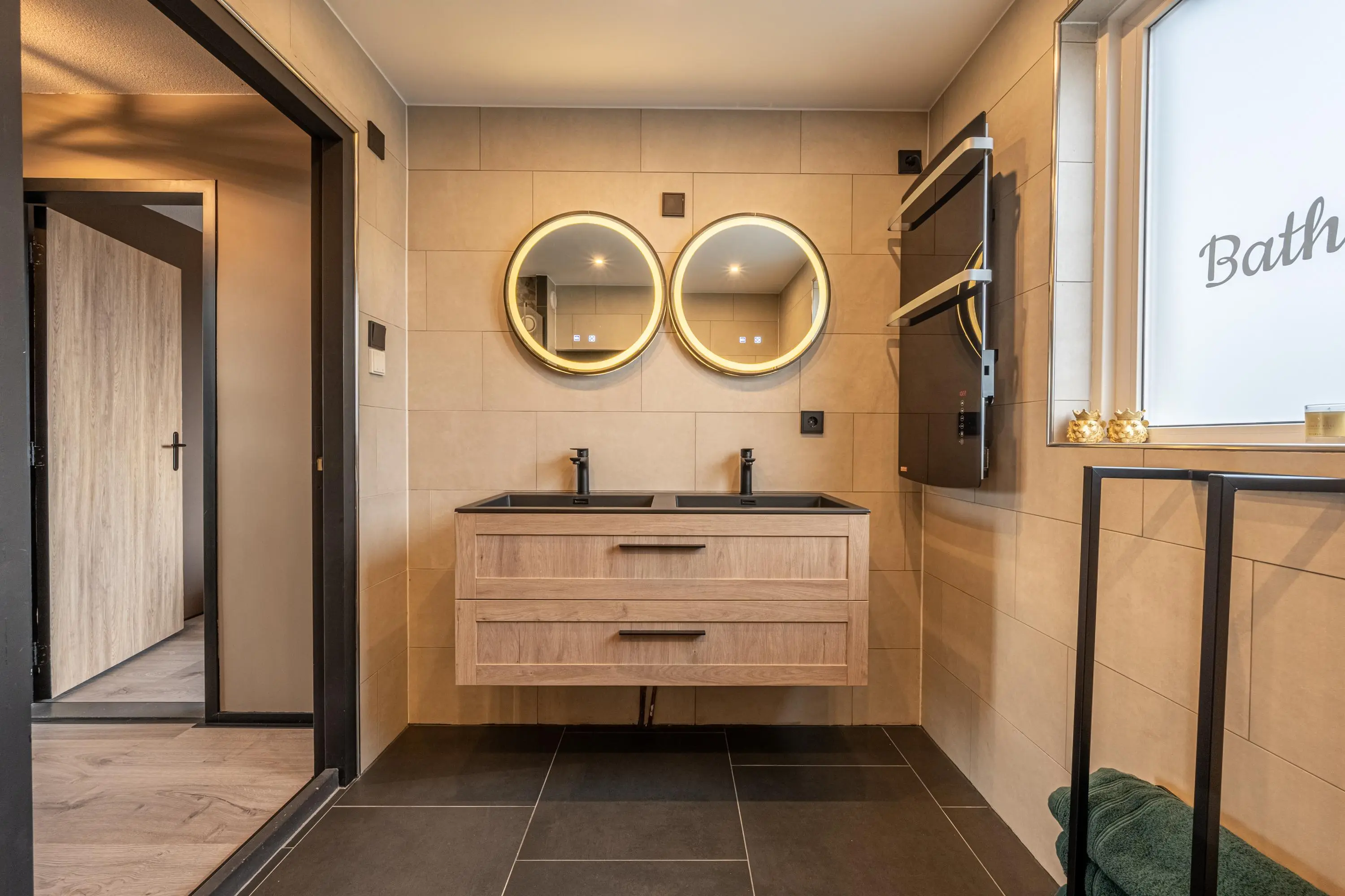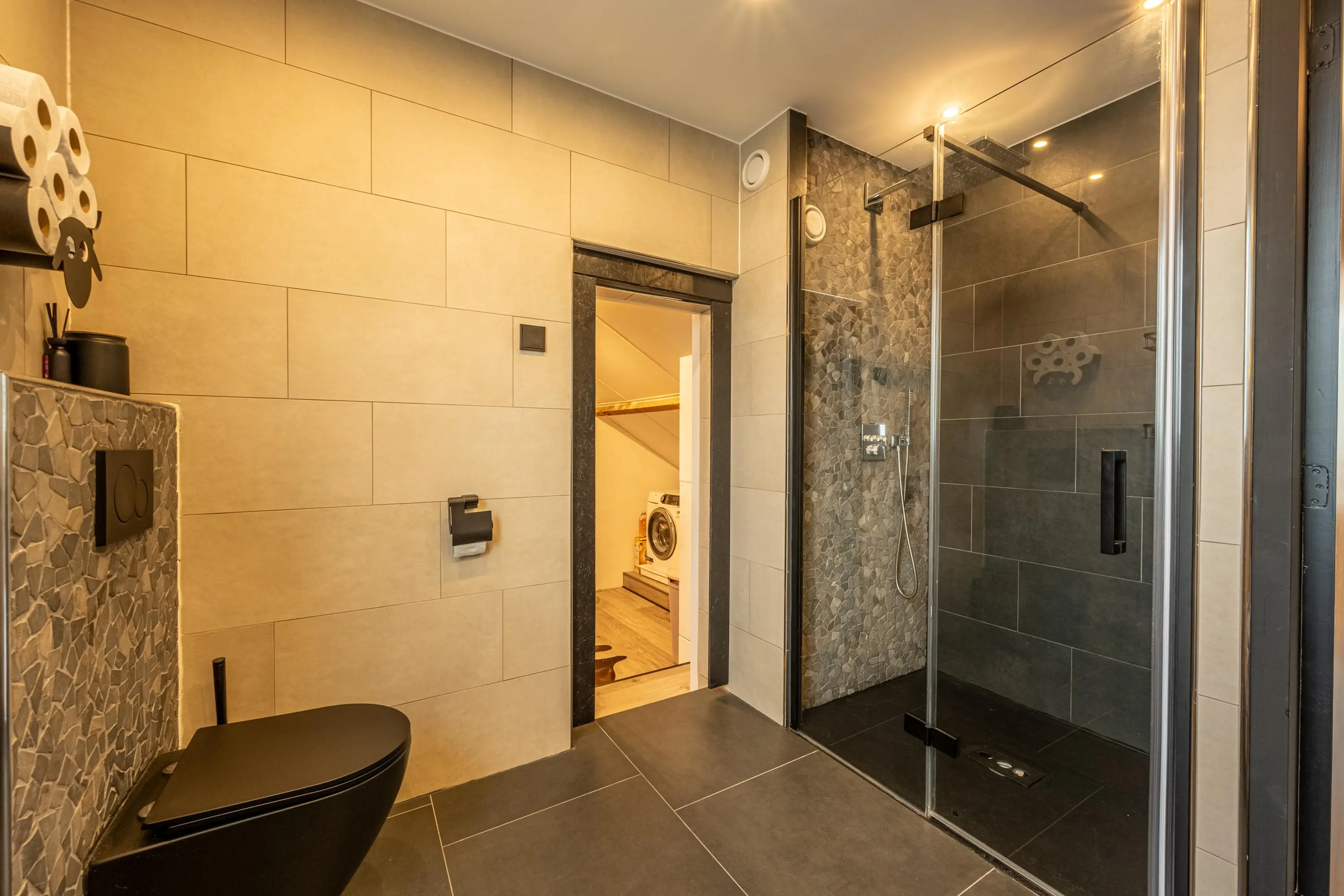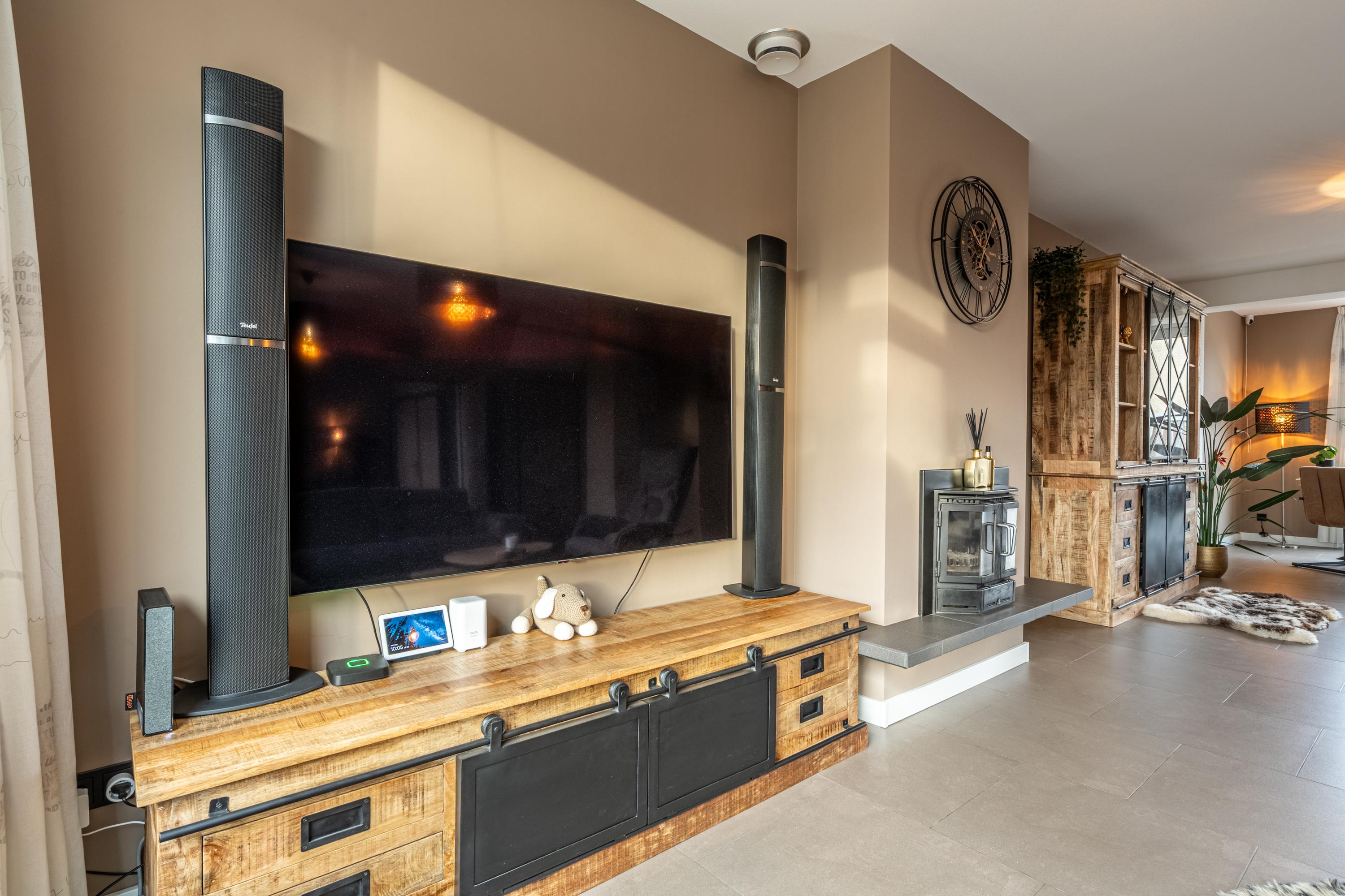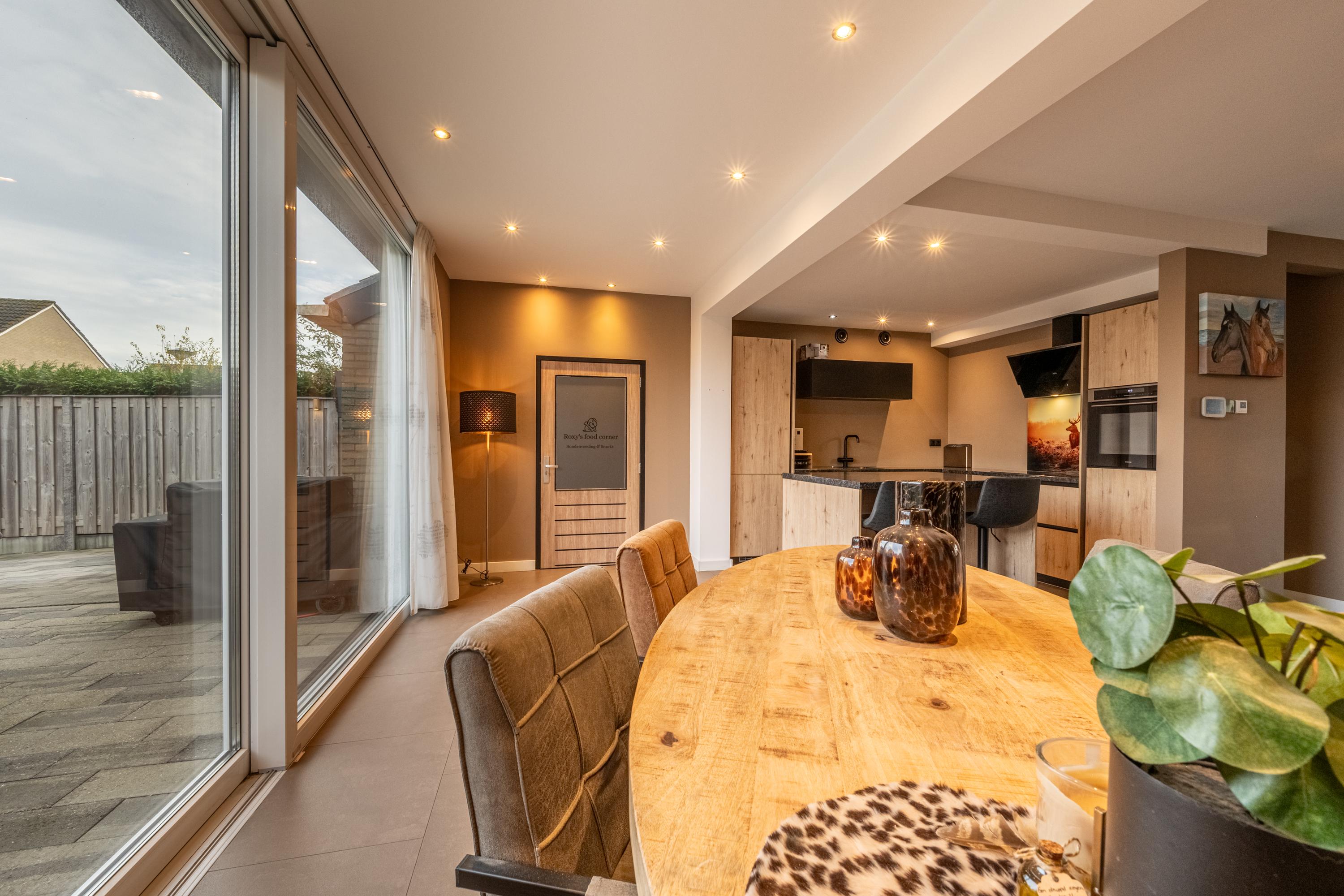 Aan de achterzijde bevindt zich de in 2021 vernieuwde woonkeuken, uitgerust met inductiekookplaat, afzuigscherm, vaatwasser, koelkast, vriezer, combimagnetron en Howat-kraan. Dankzij vloerverwarming en airco is het hier het hele jaar door comfortabel.