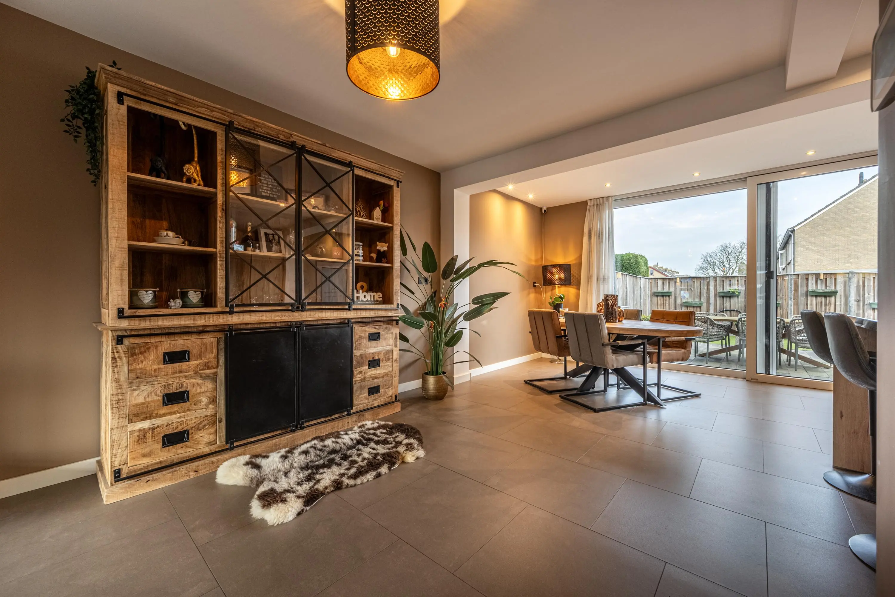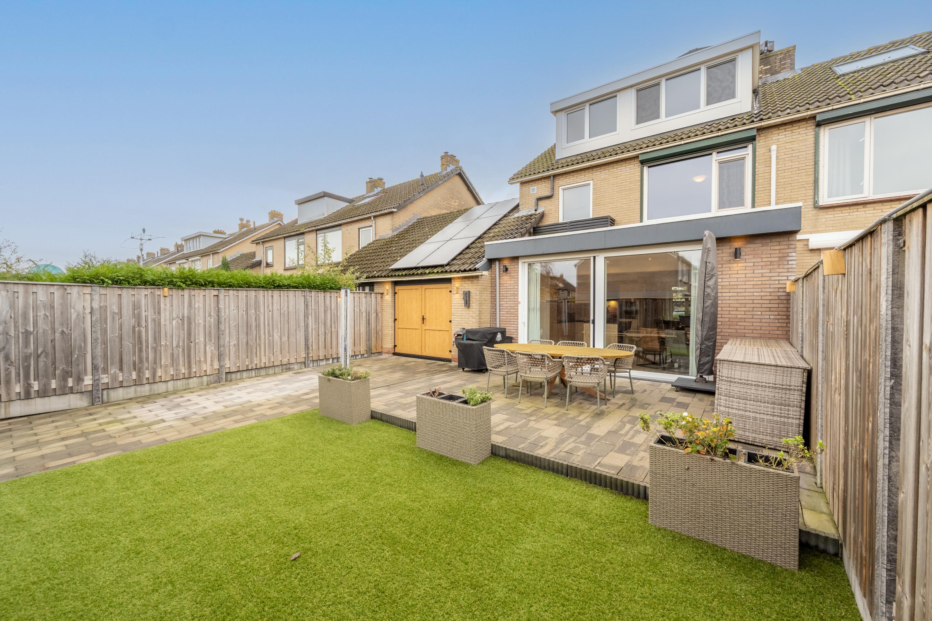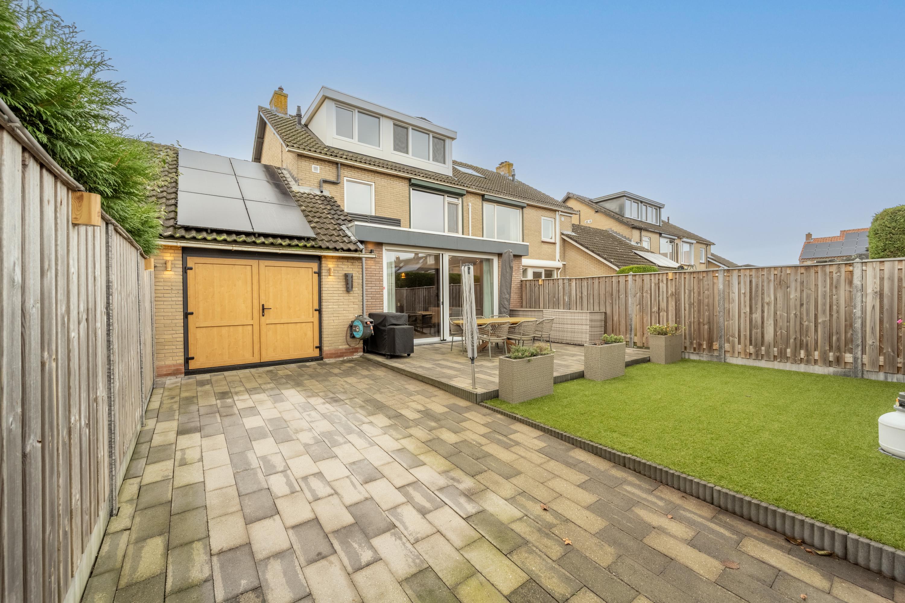 Via de schuifpui of de garage, met openslaande deuren, bereik je de achtertuin. Warmtepomp en warmteboiler zijn netjes weggewerkt in de kastenwand van de garage.