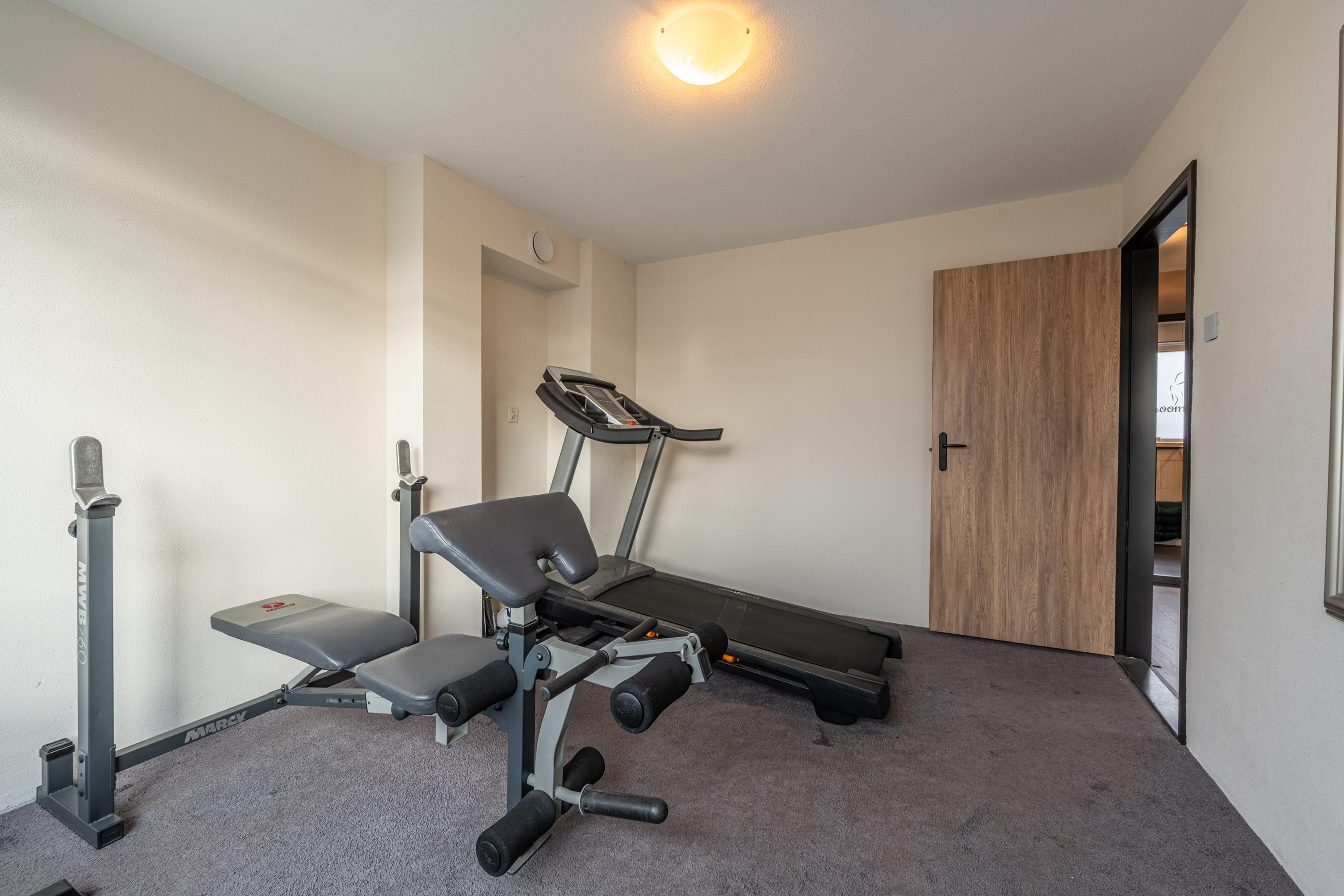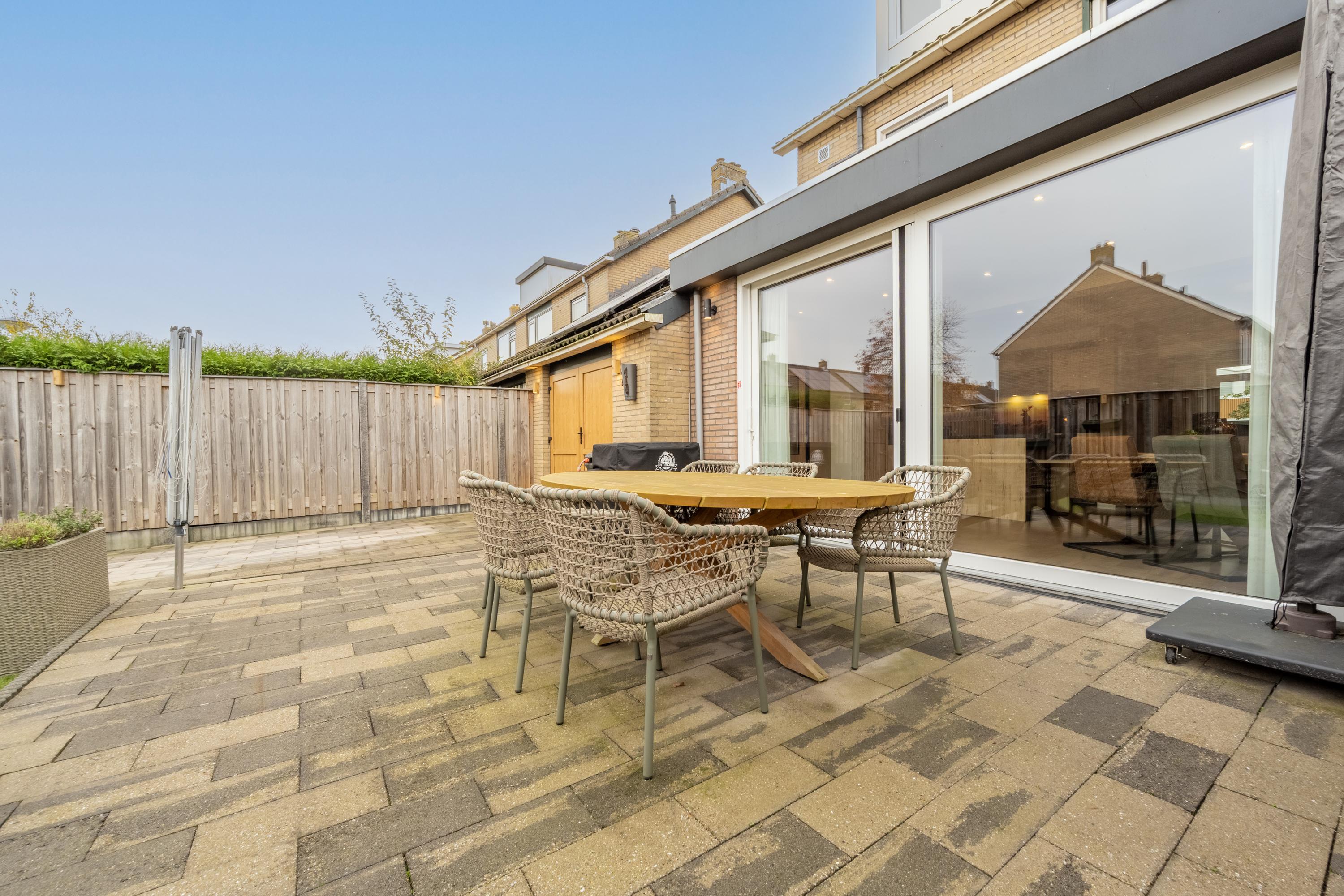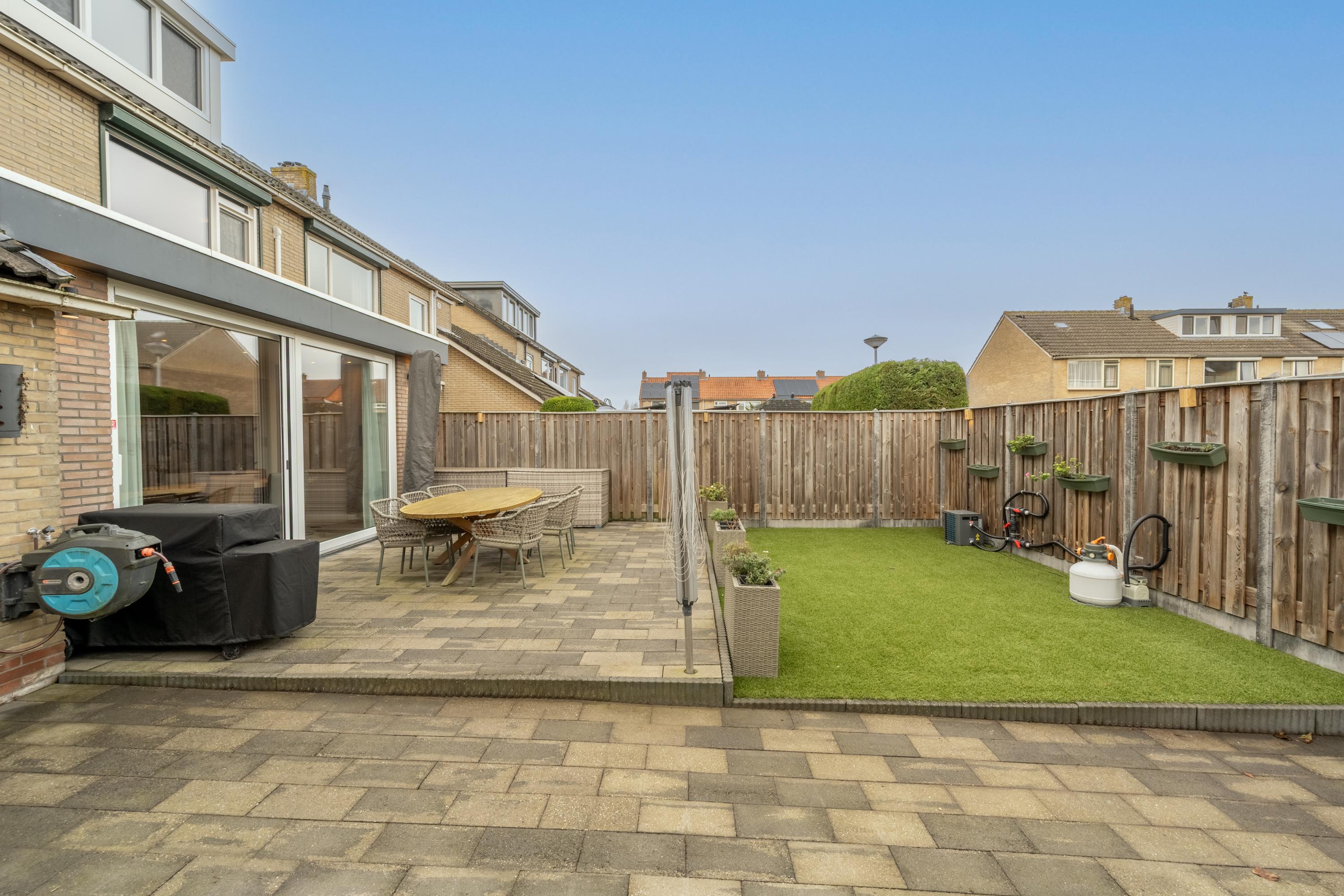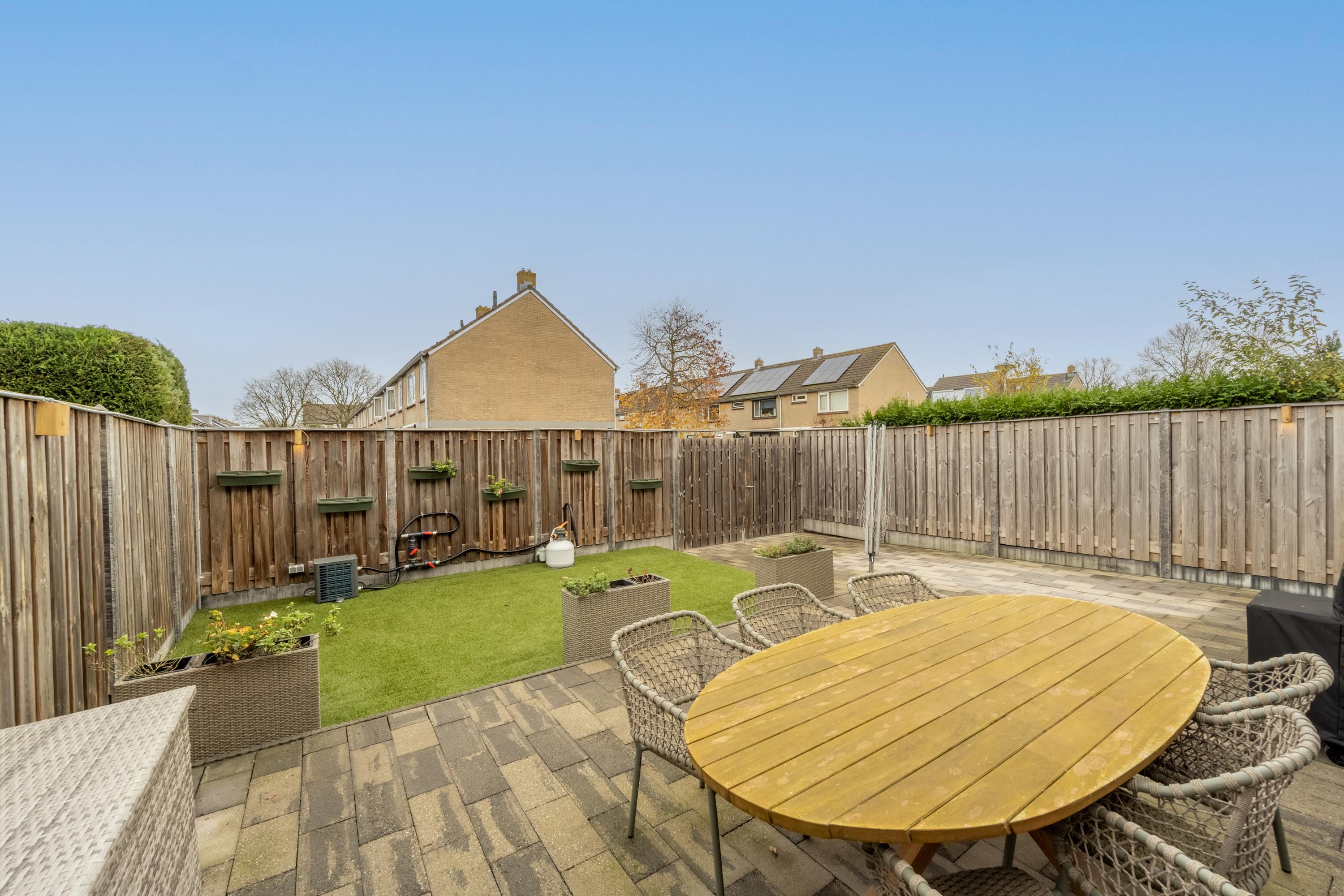 Via de schuifpui of de garage, met openslaande deuren, bereik je de achtertuin. Warmtepomp en warmteboiler zijn netjes weggewerkt in de kastenwand van de garage.