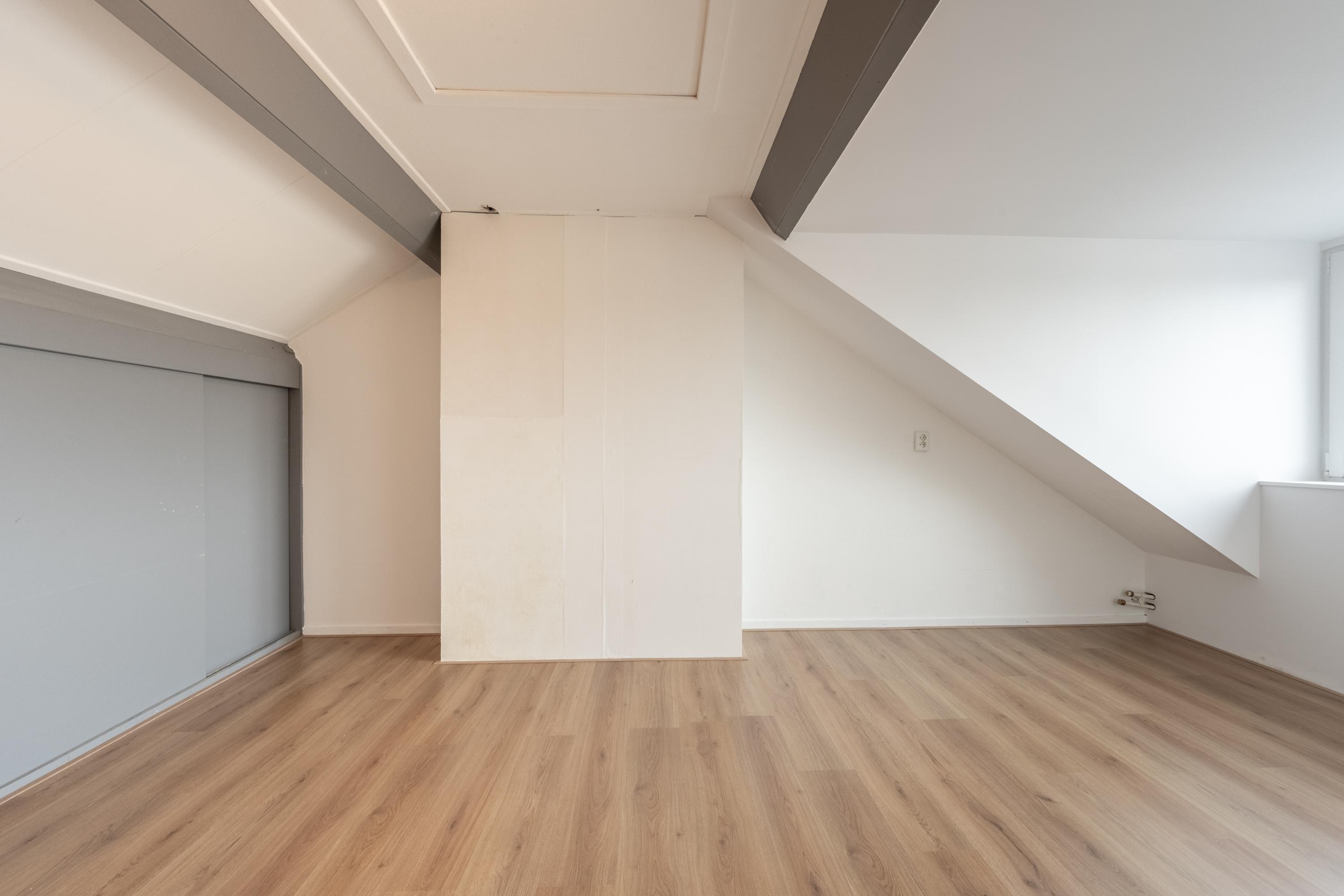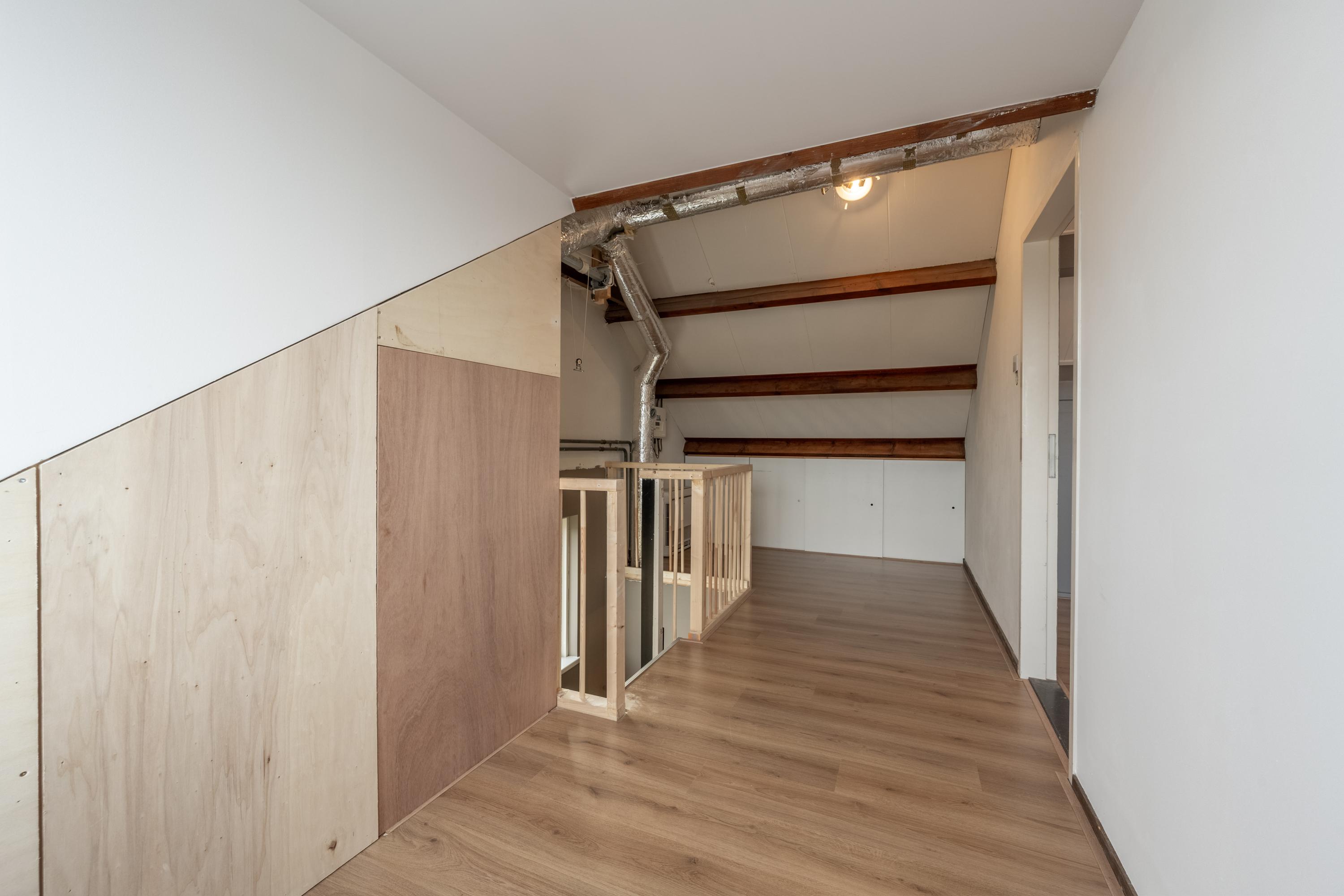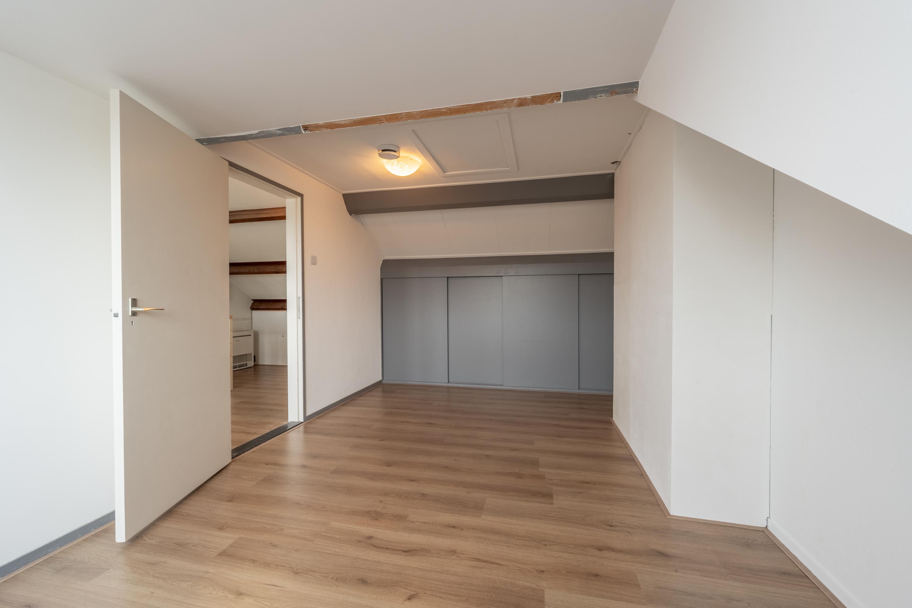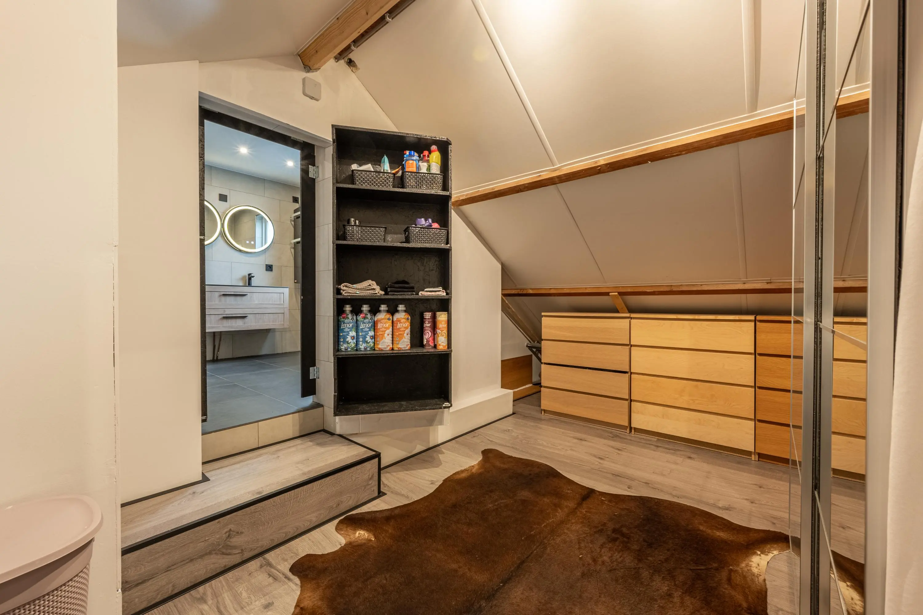 Dankzij de brede kunststof dakkapel is deze verdieping ruim en licht. Hier vind je een voorzolder met WTW-unit en bergruimte achter knieschotten, en een royale (slaap)kamer met toegang tot de bergzolder en extra bergruimte achter schuifdeuren.