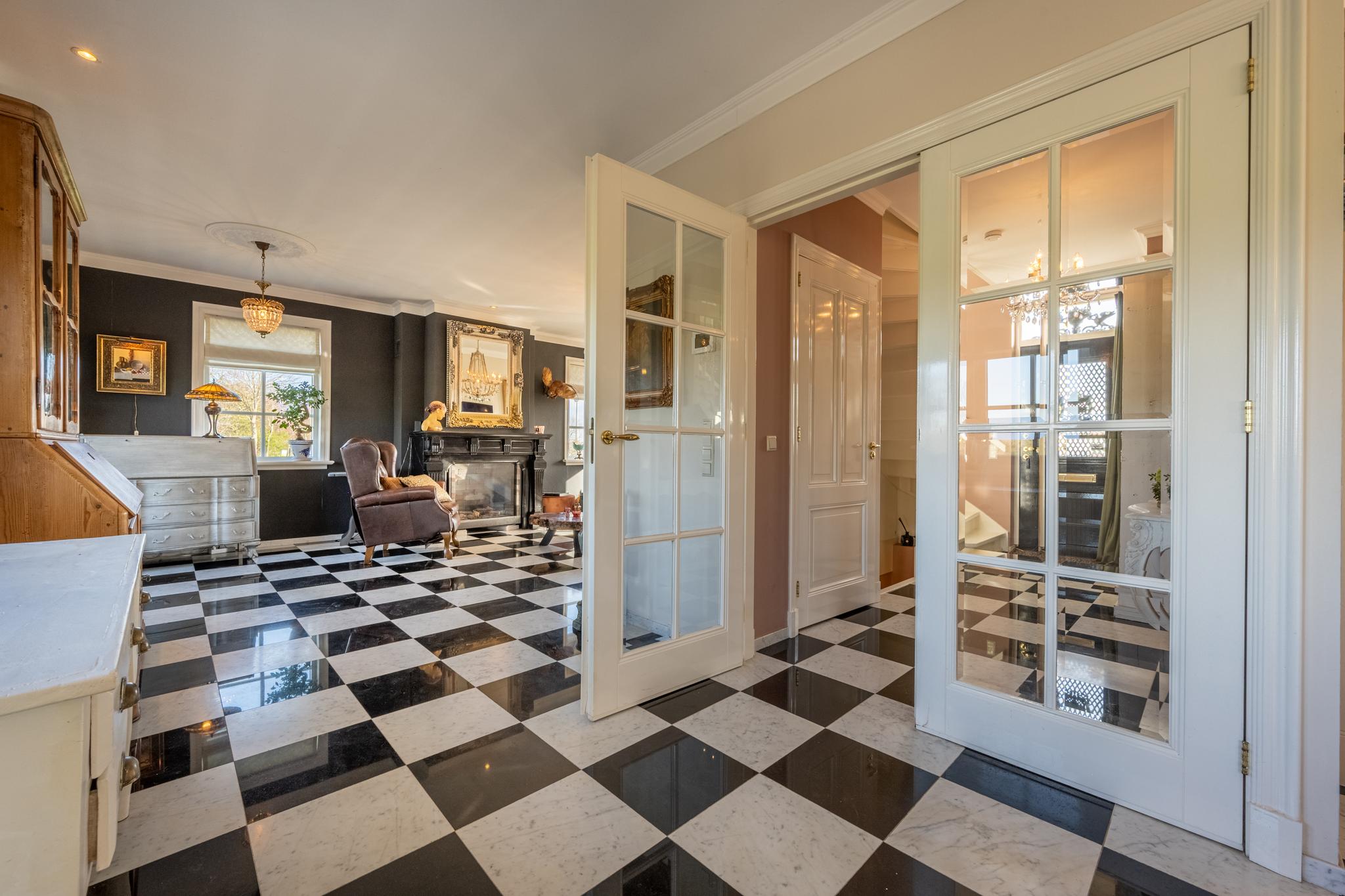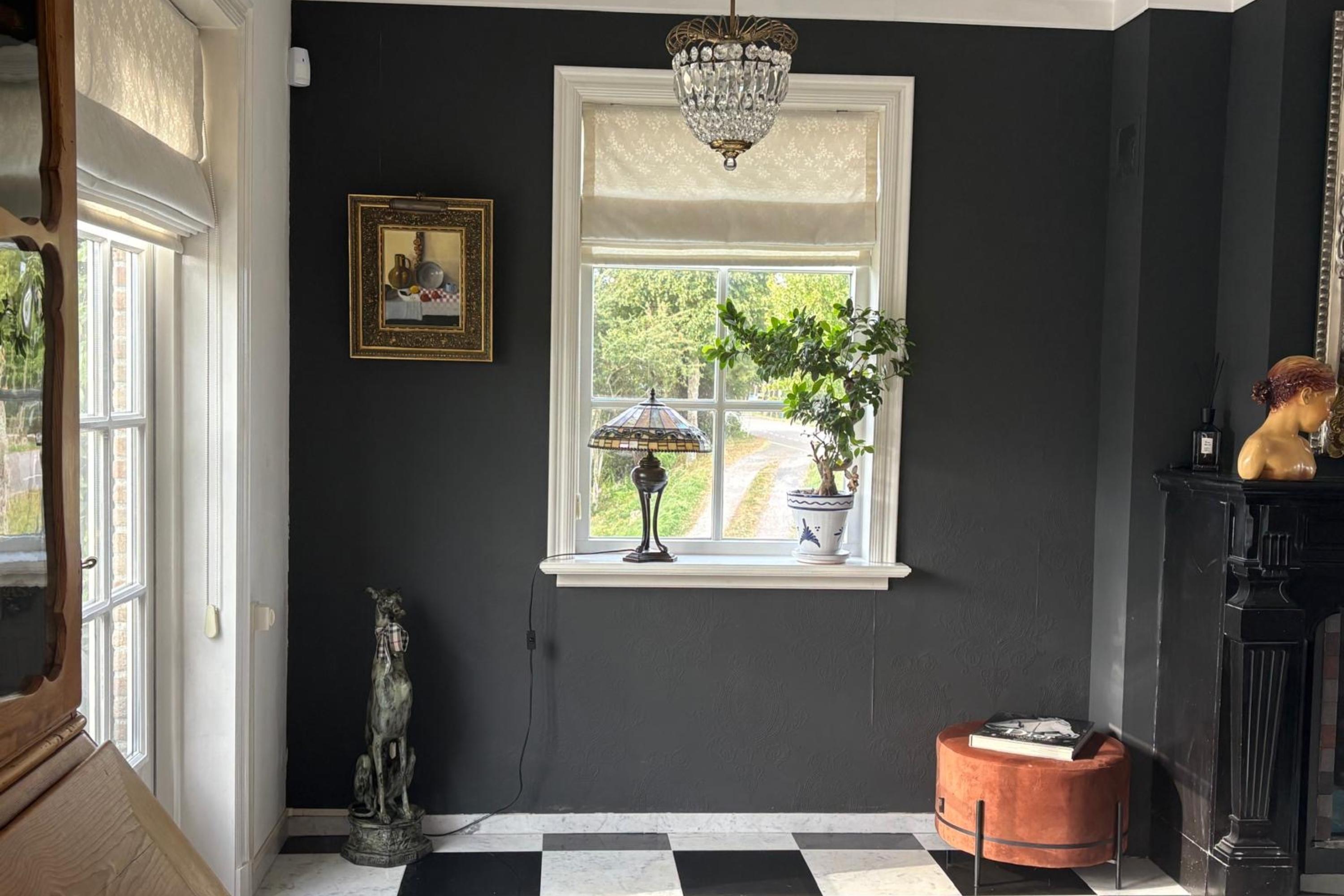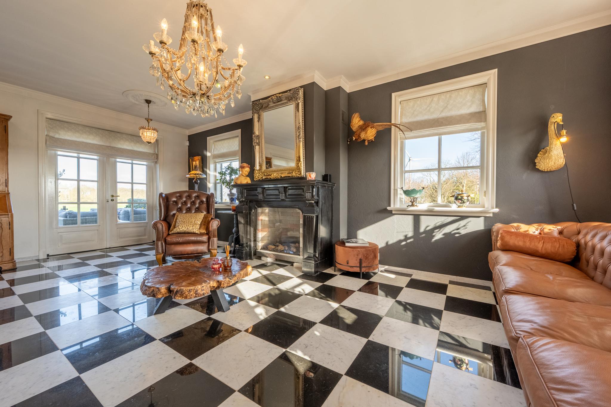 Via de dubbele openslaande deuren betreedt u de L-vormige woonkamer, een sfeervolle ruimte met een fraaie haard en karakteristieke schouw. Dankzij de vele raampartijen geniet u hier van een overvloed aan natuurlijk licht en een prachtig uitzicht op de omgeving.