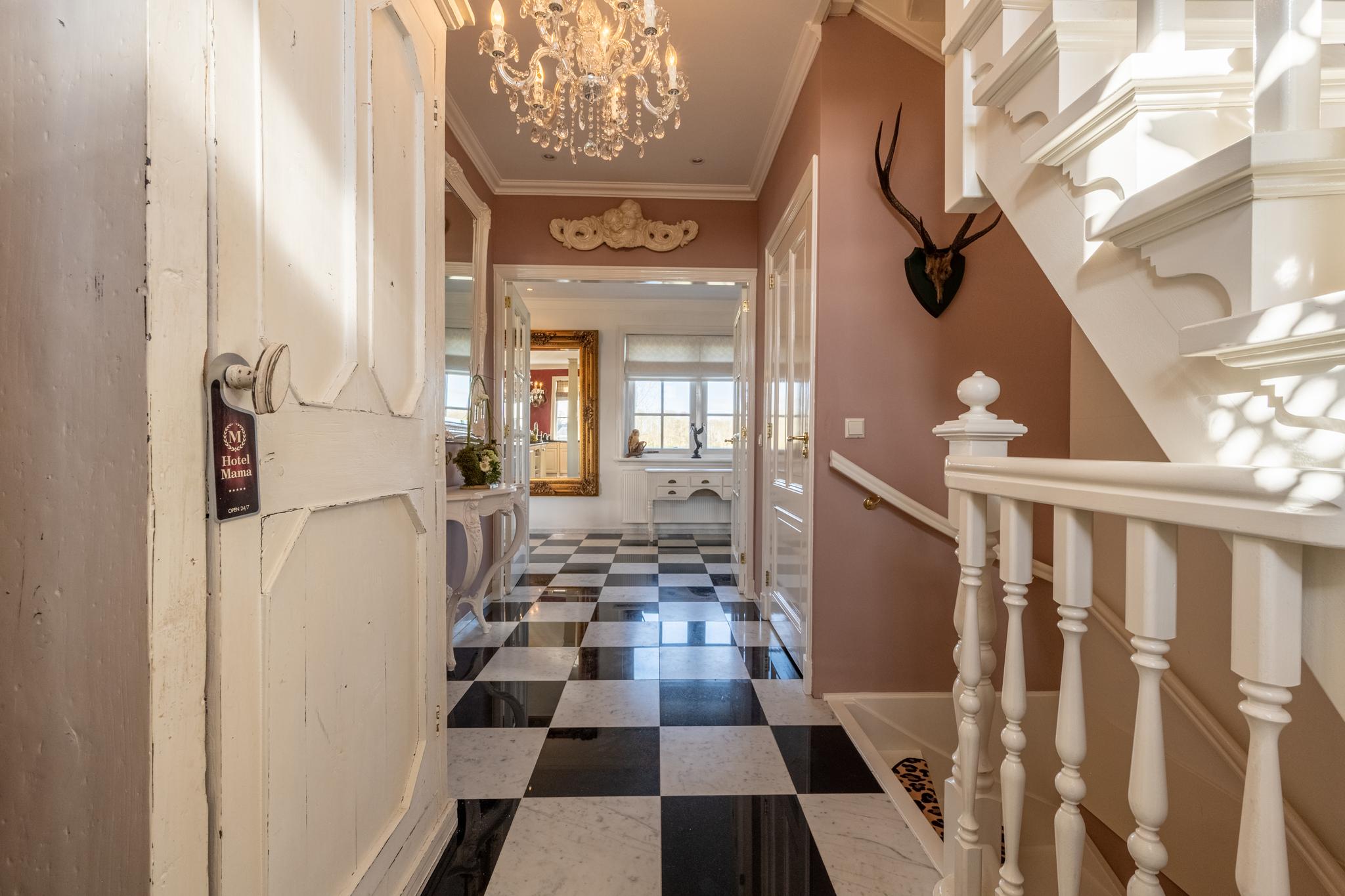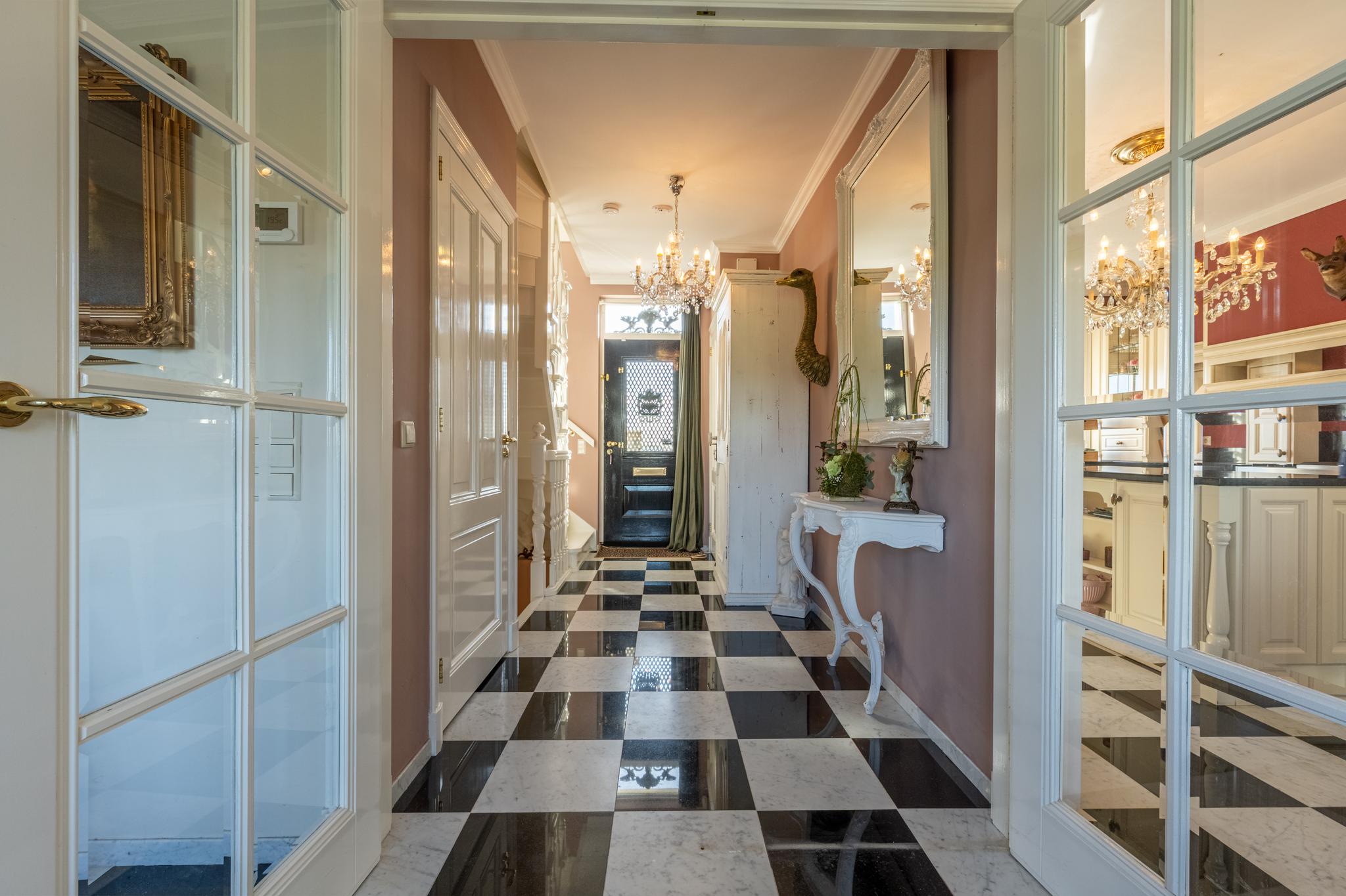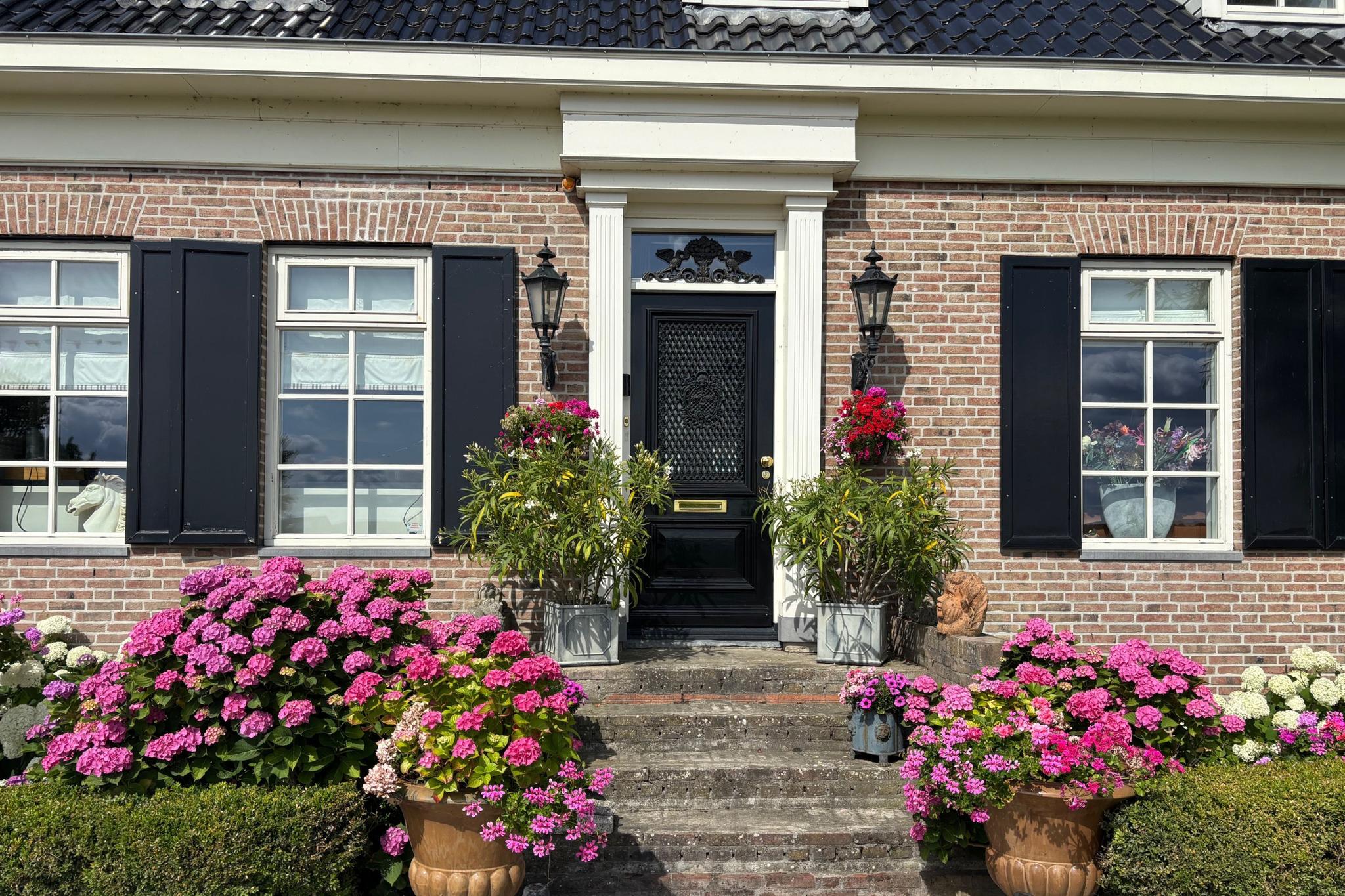 Via de dubbele openslaande deuren betreedt u de L-vormige woonkamer, een sfeervolle ruimte met een fraaie haard en karakteristieke schouw. Dankzij de vele raampartijen geniet u hier van een overvloed aan natuurlijk licht en een prachtig uitzicht op de omgeving.