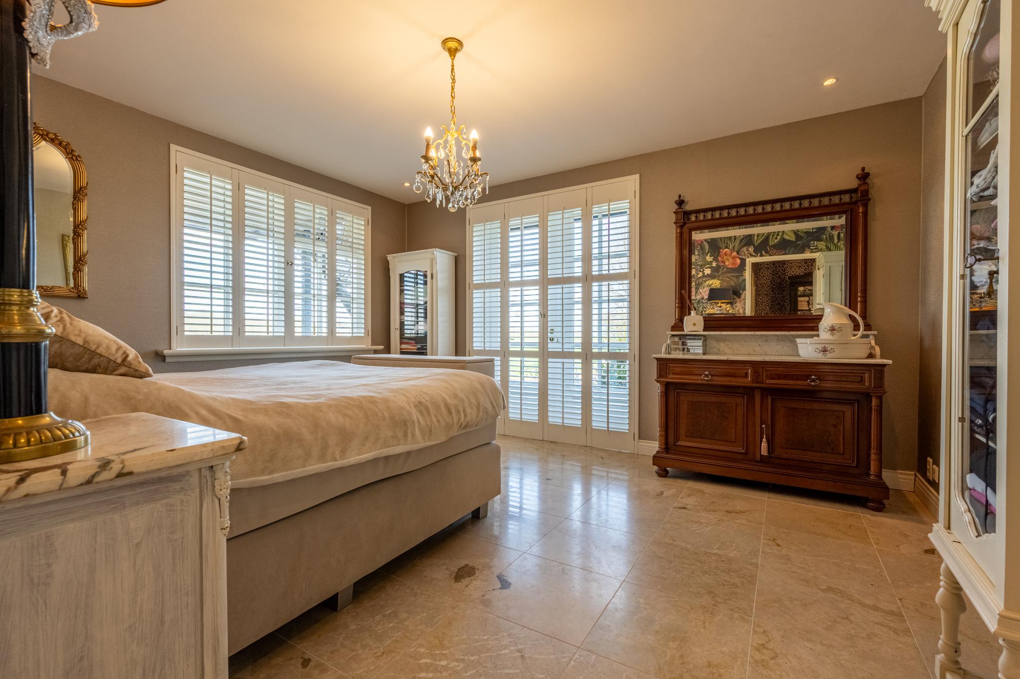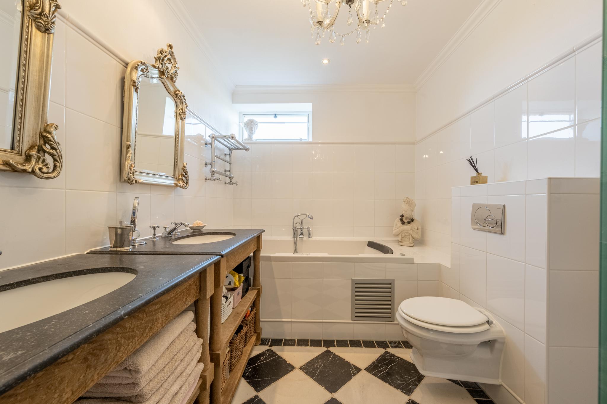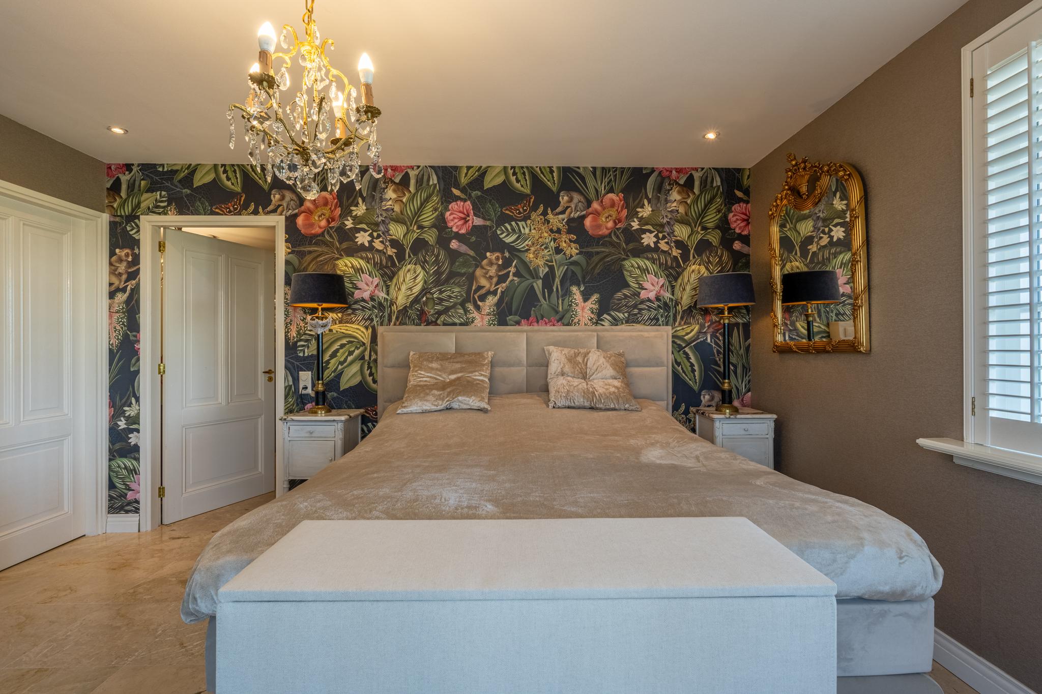De master bedroom bevindt zich eveneens in het onderhuis en biedt een luxe en-suite badkamer. Deze badkamer is uitgerust met een Whirlpool ligbad, een inloopdouche, een derde toilet en dubbele wastafels – een echte privé-wellness binnen handbereik.
