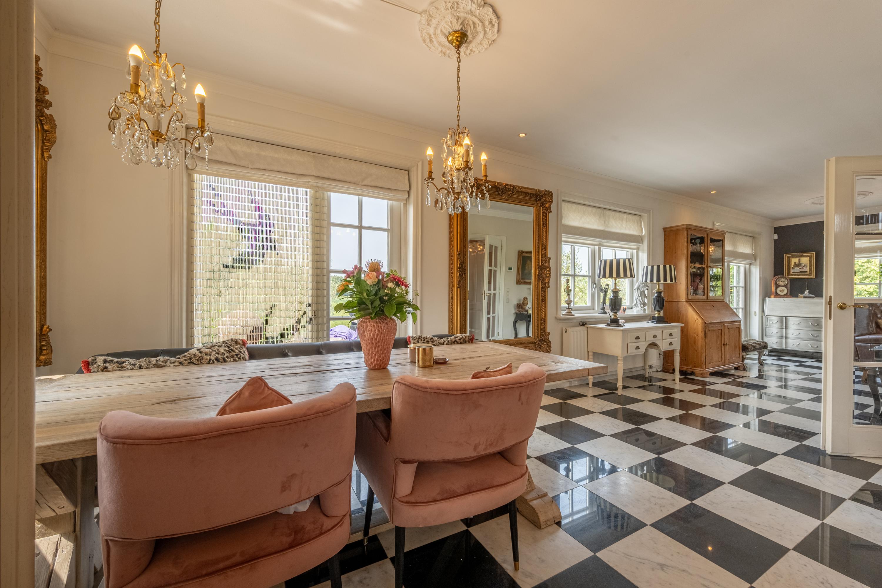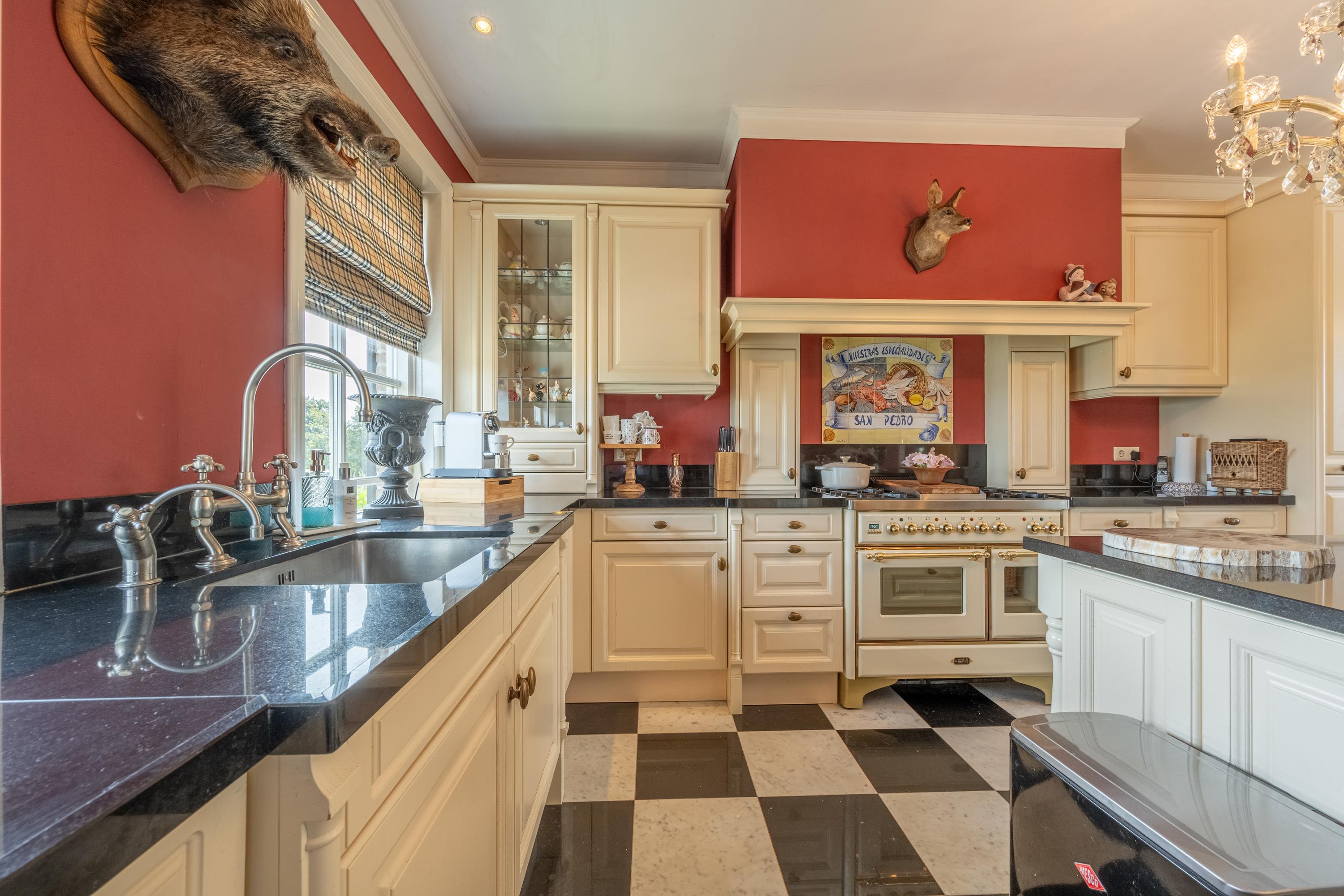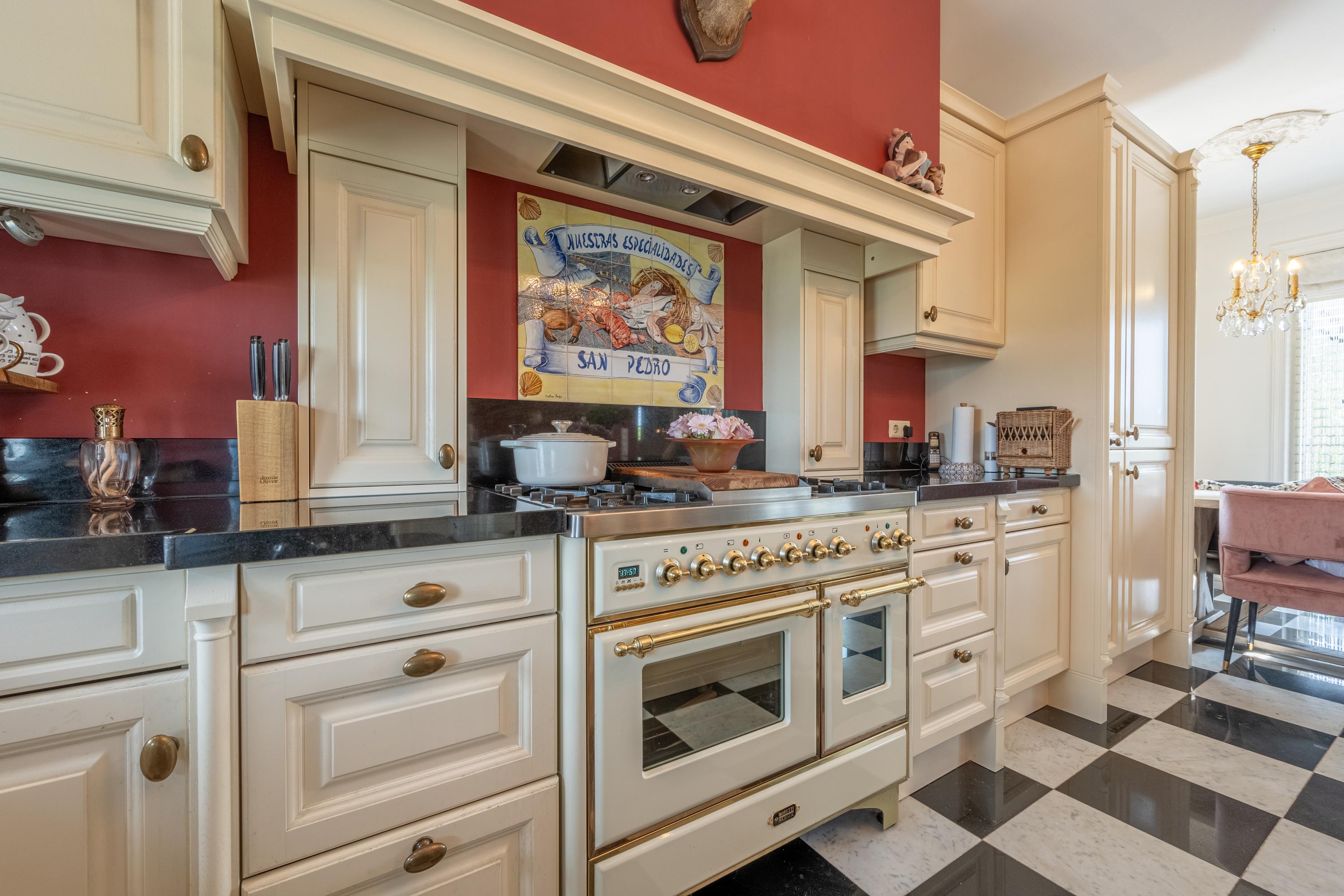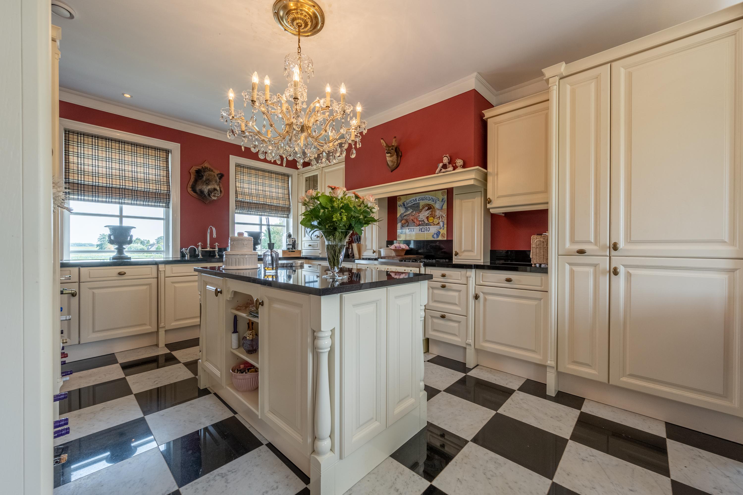 De royale leefkeuken in landhuisstijl is een echte eyecatcher. Deze U-vormige keuken met werkeiland is voorzien van hoogwaardige inbouwapparatuur, waaronder een Quooker, vaatwasser, koel- en vriescombinatie, 6-pits gaskookplaat met afzuigschouw en een oven. Een ideale plek om uitgebreid te koken en te genieten van gezellige momenten.