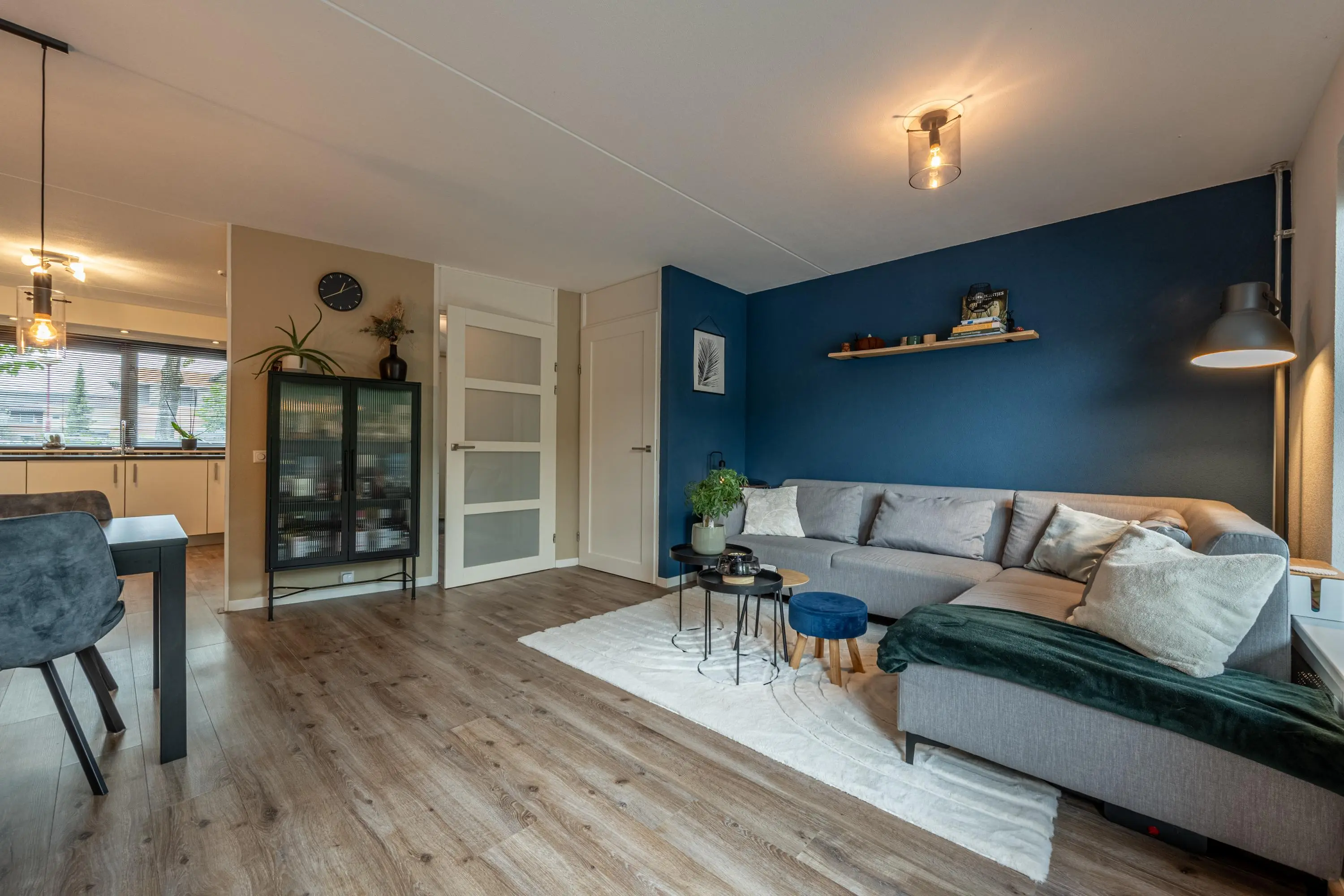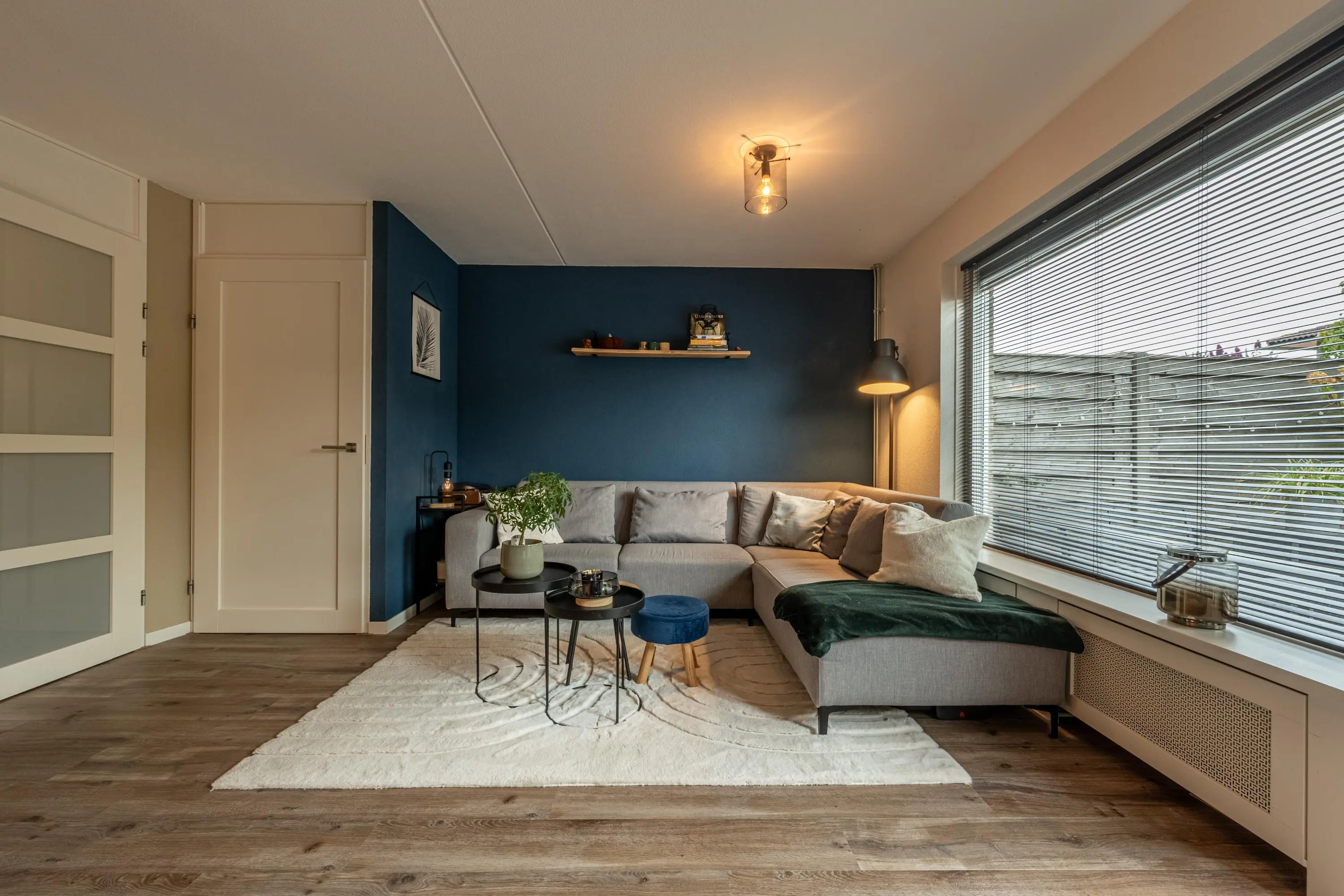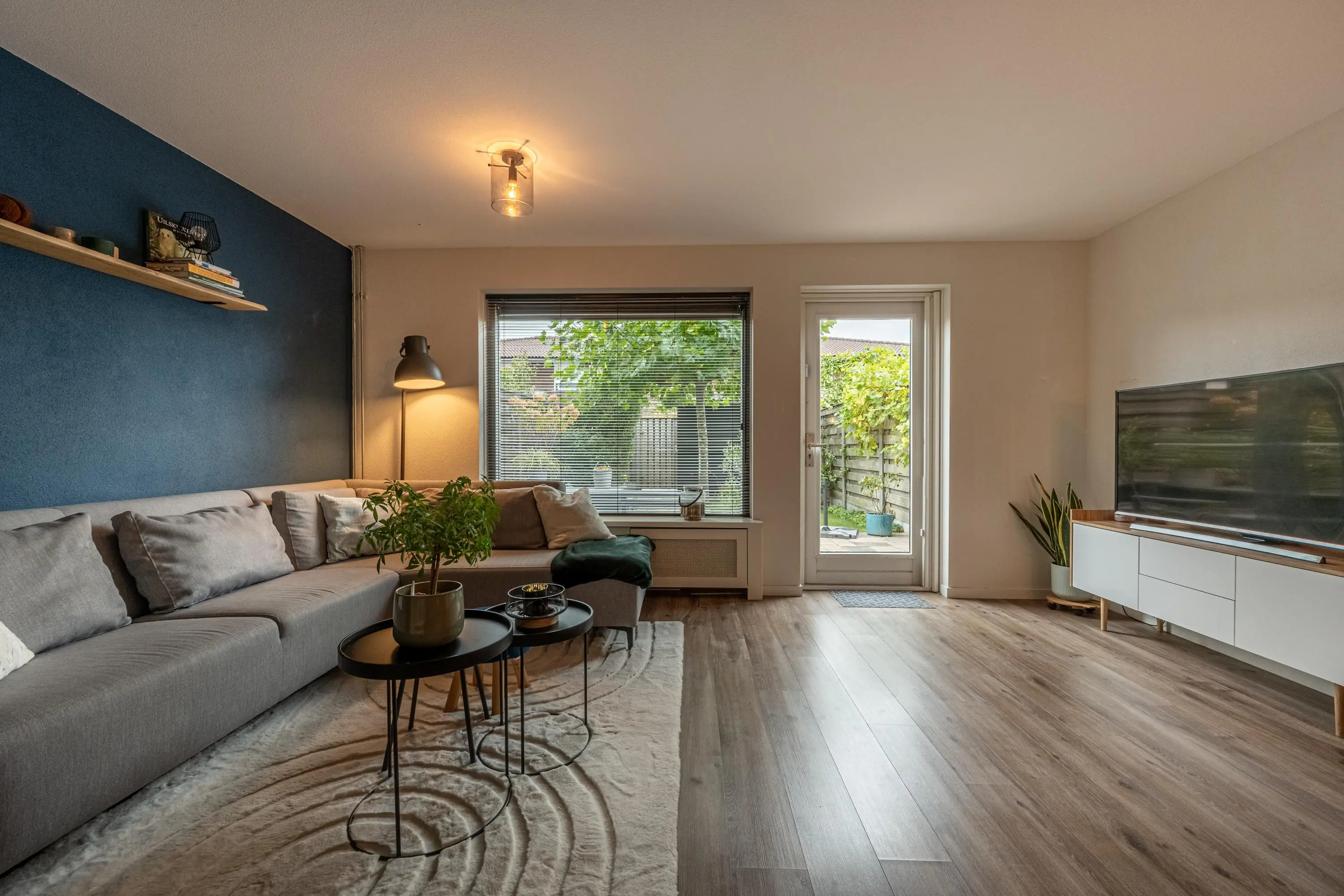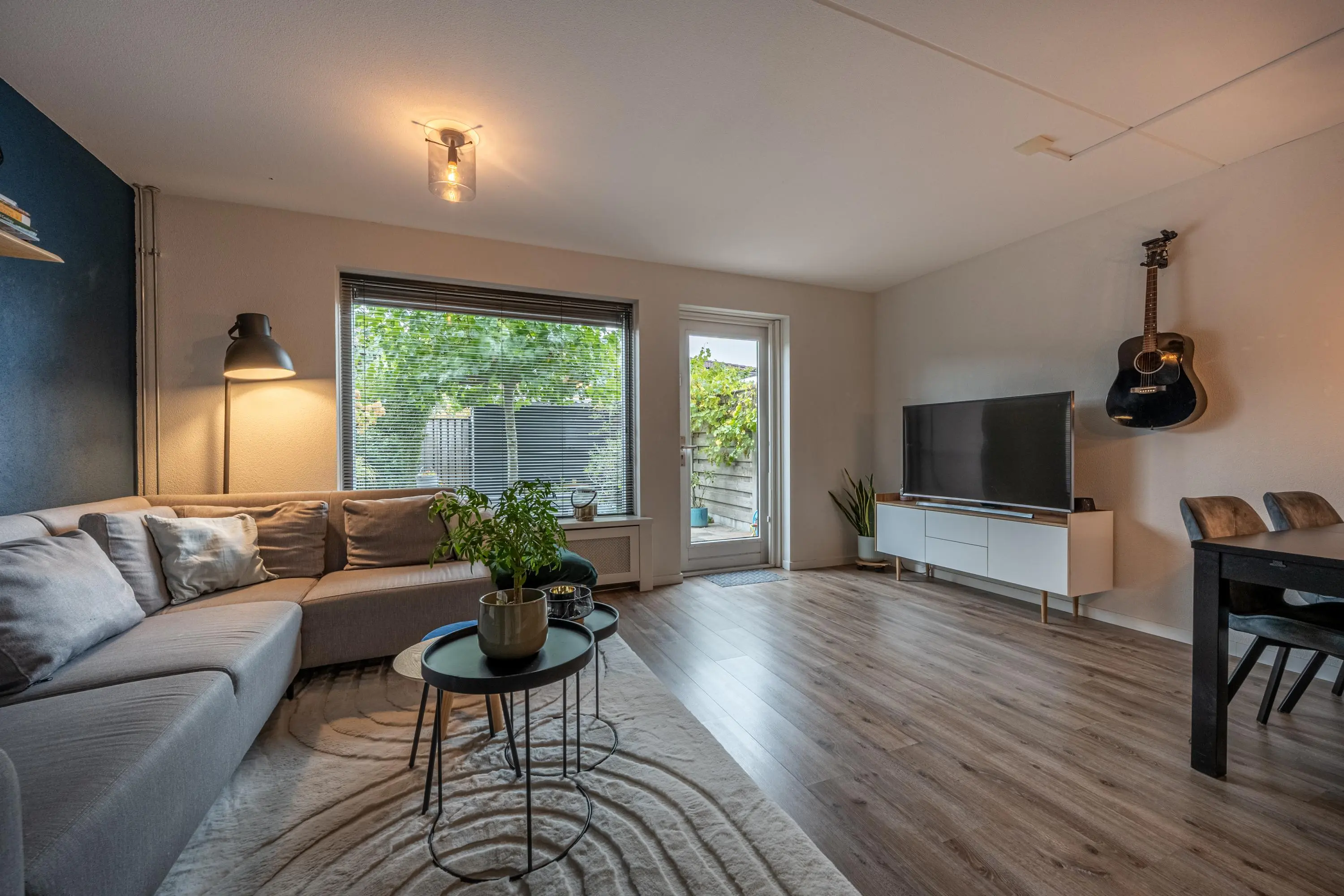 De net afgewerkte woonkamer heeft een handige bergkast en veel lichtinval vanwege de grote raampartij aan de achterzijde. Er is een loopdeur naar de achtertuin.