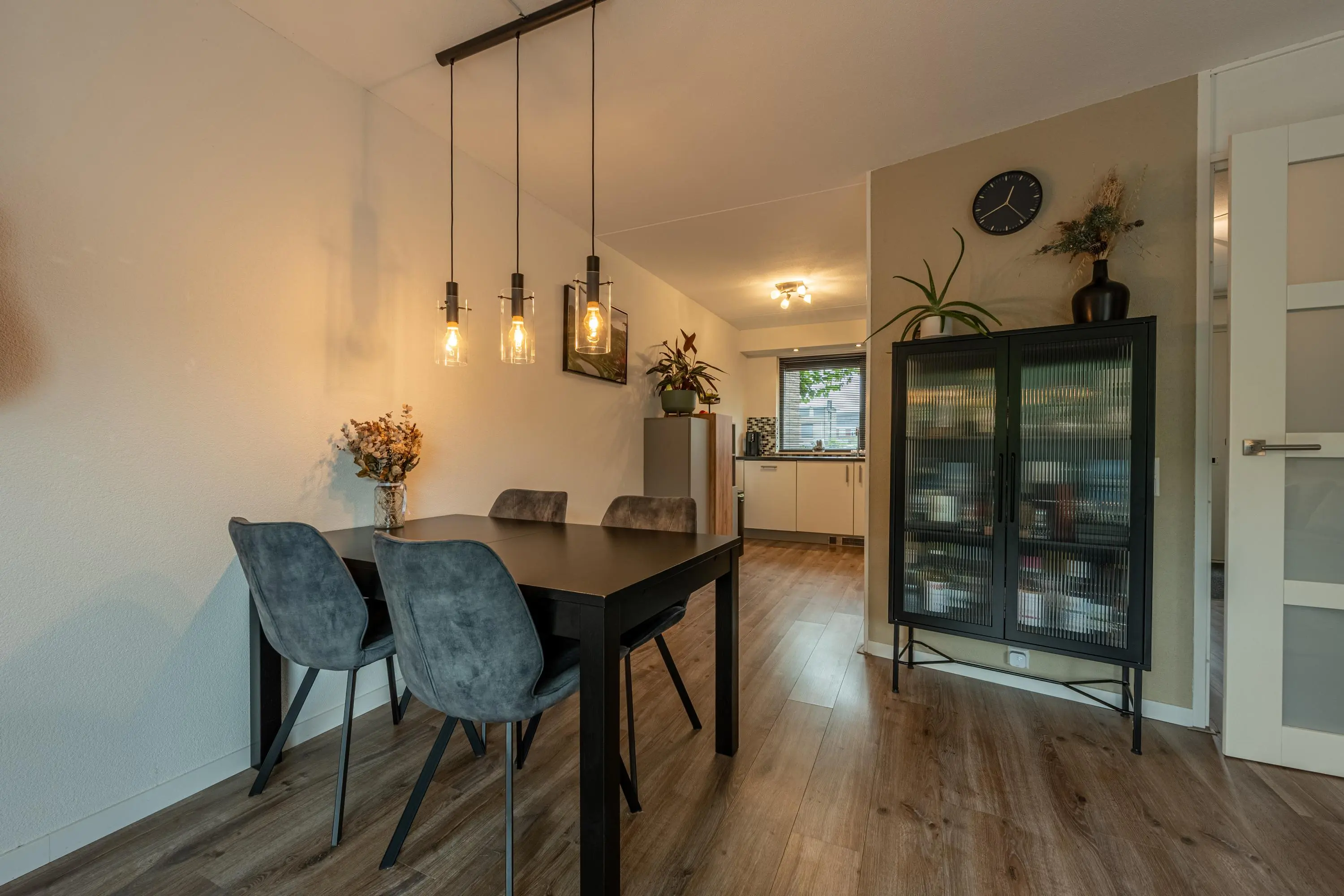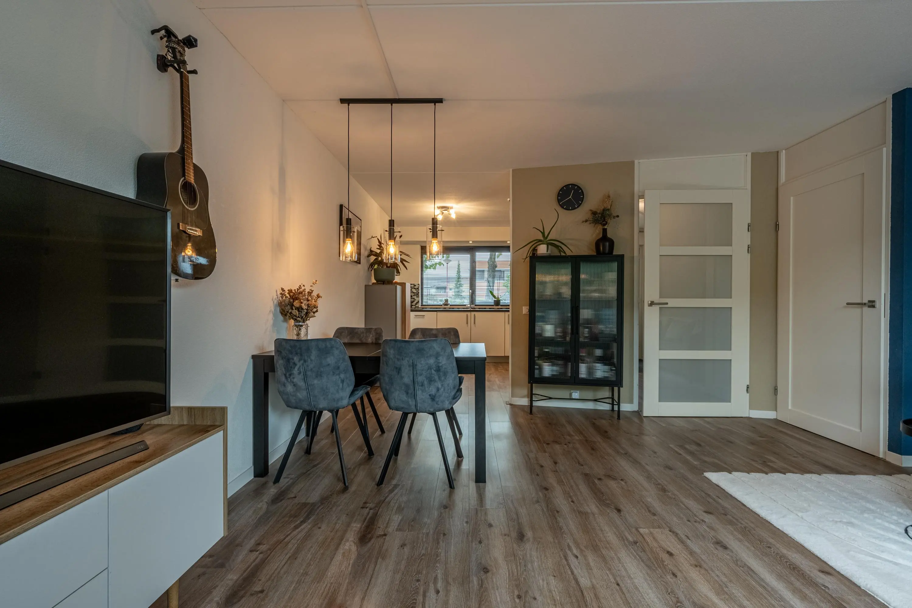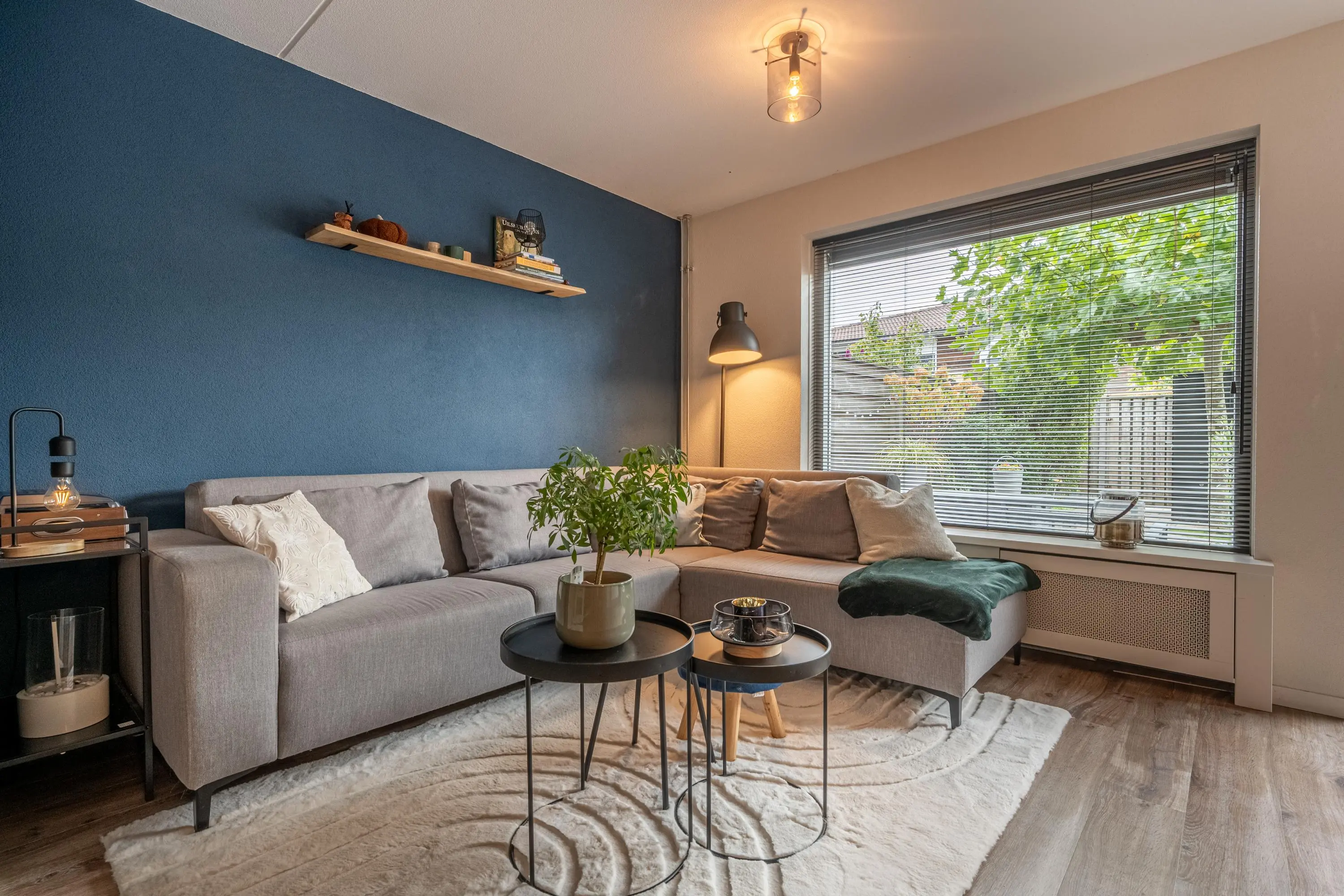 De net afgewerkte woonkamer heeft een handige bergkast en veel lichtinval vanwege de grote raampartij aan de achterzijde. Er is een loopdeur naar de achtertuin.