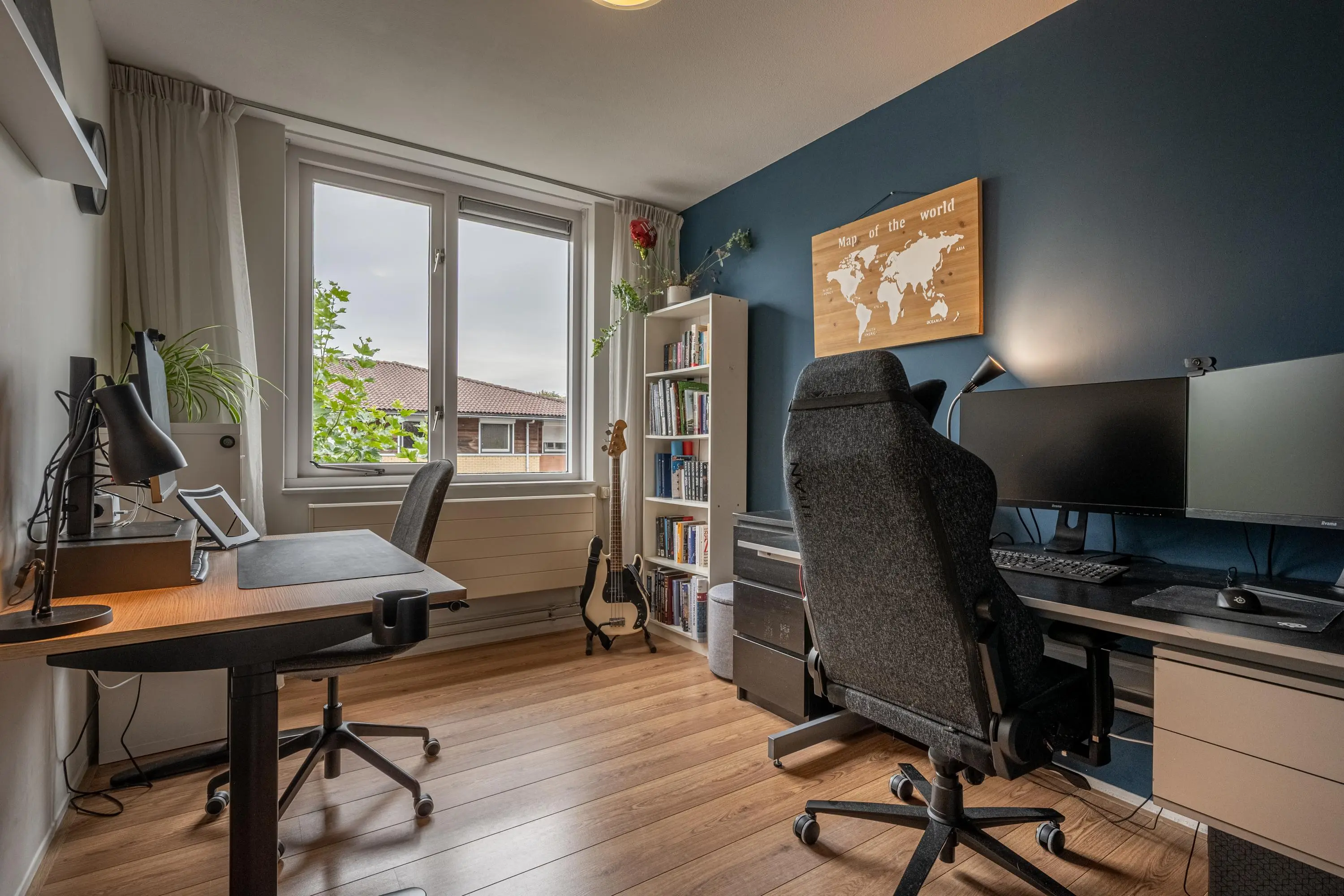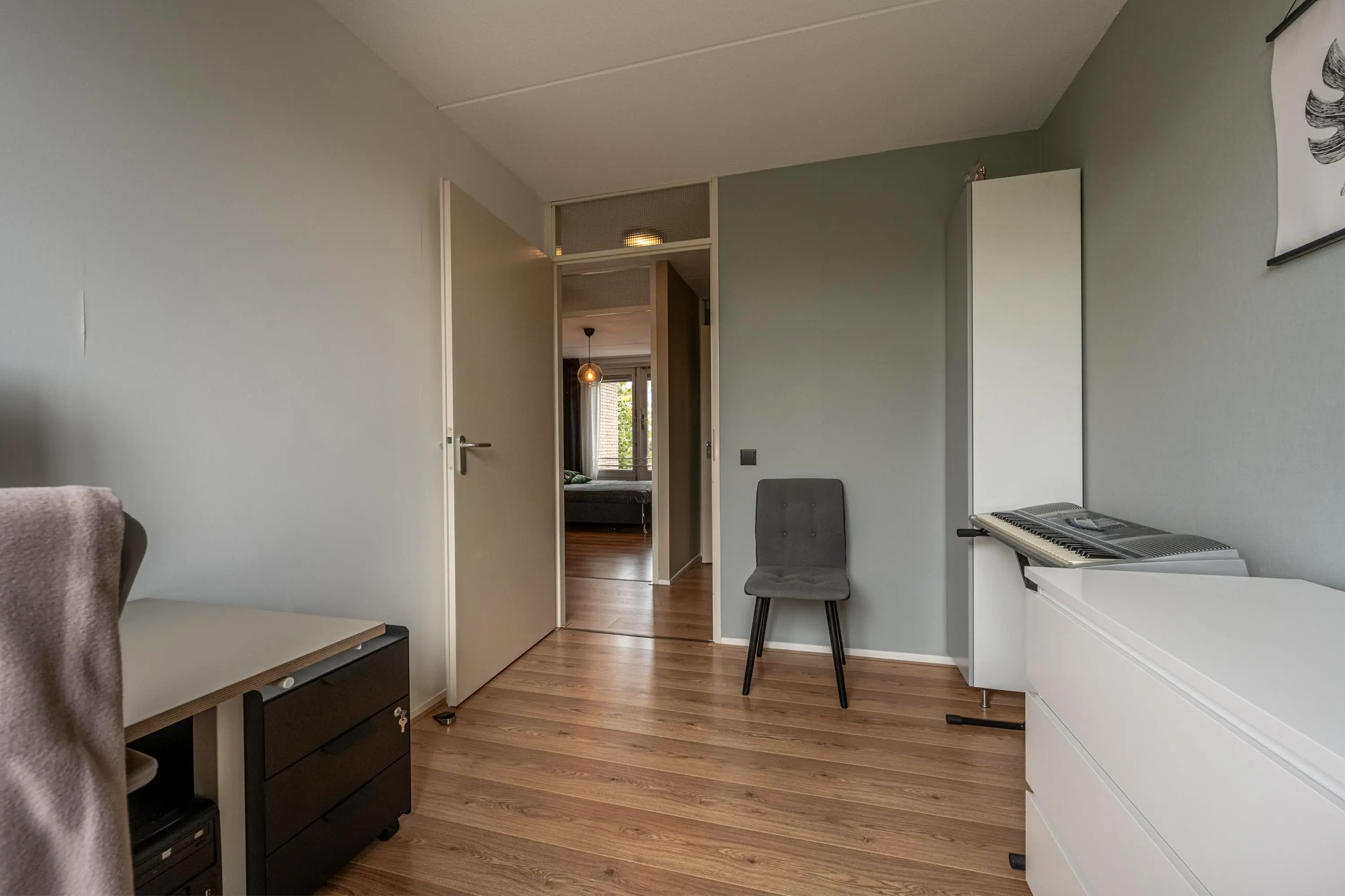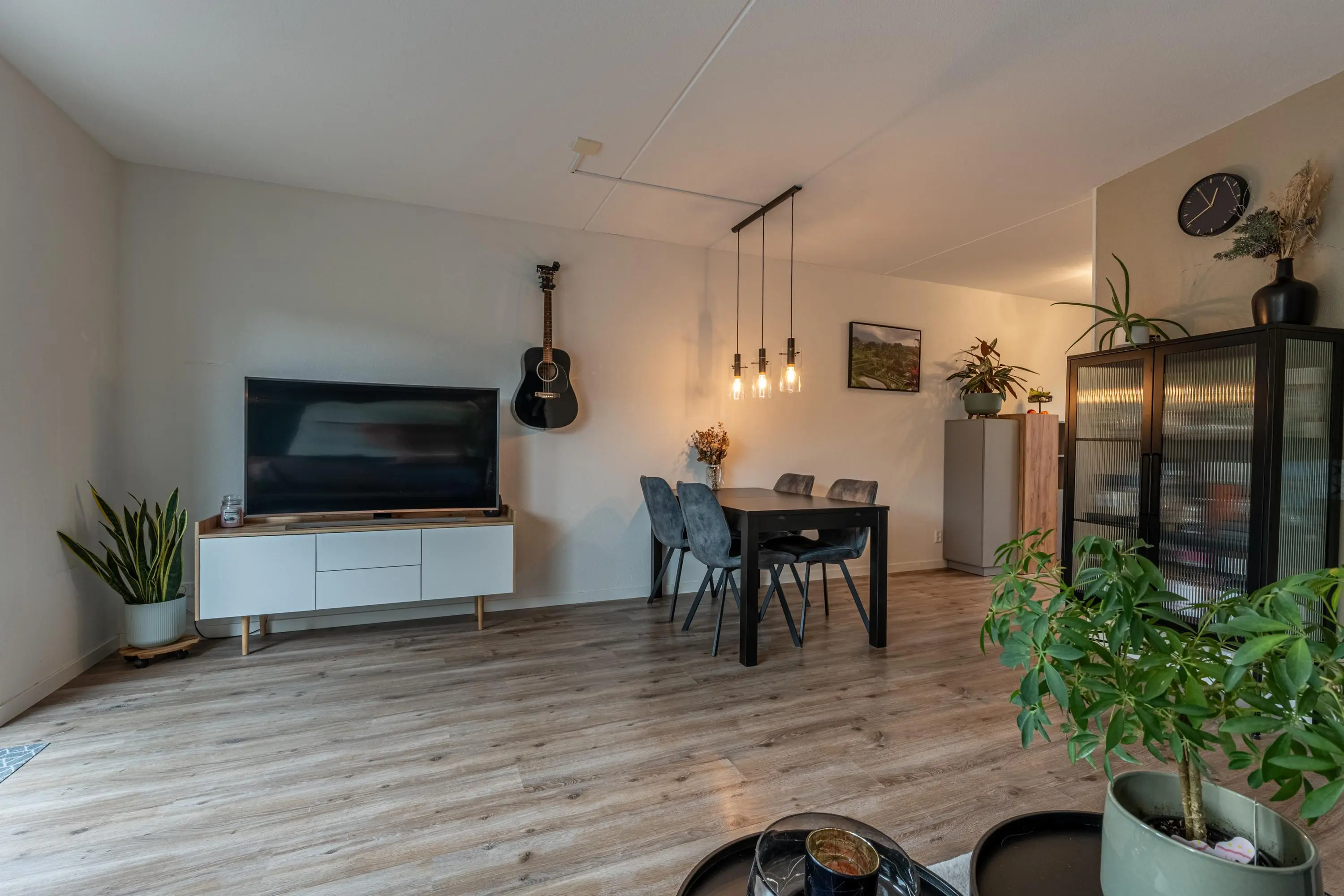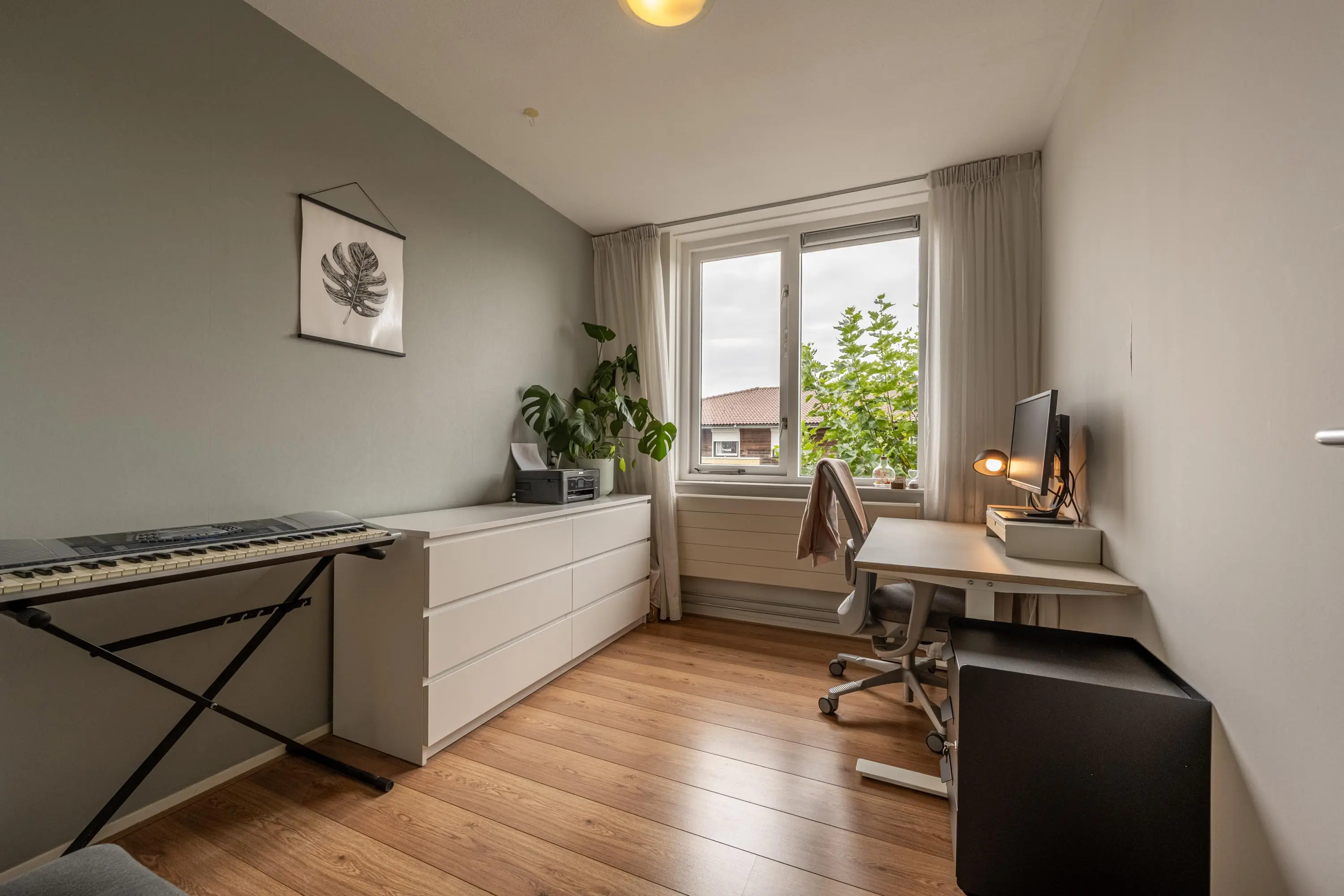 De net afgewerkte woonkamer heeft een handige bergkast en veel lichtinval vanwege de grote raampartij aan de achterzijde. Er is een loopdeur naar de achtertuin.