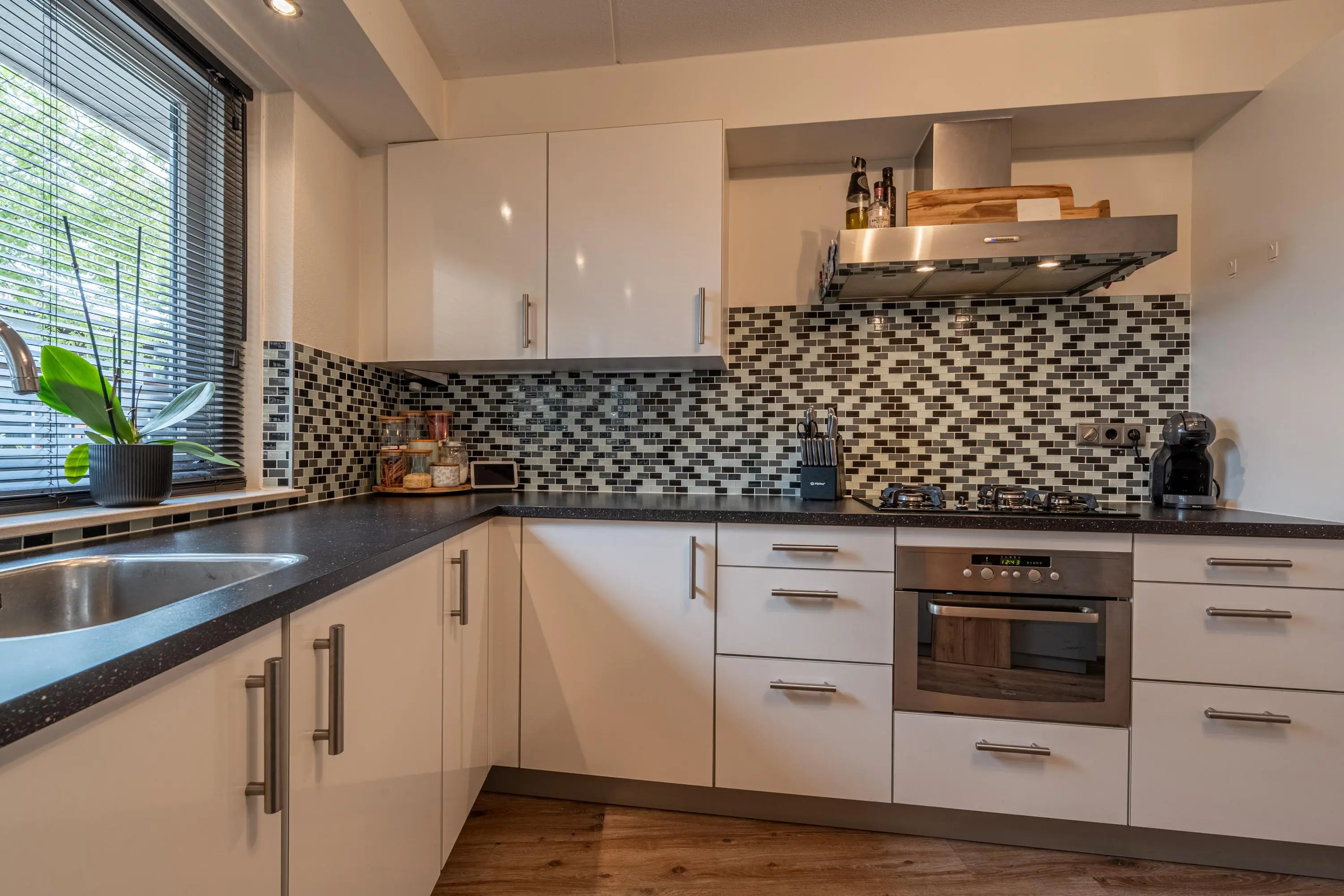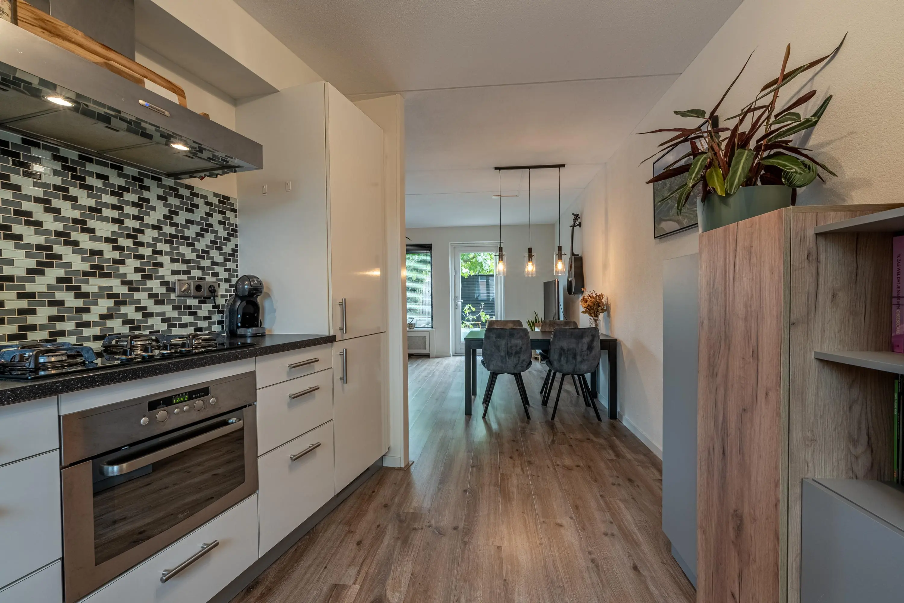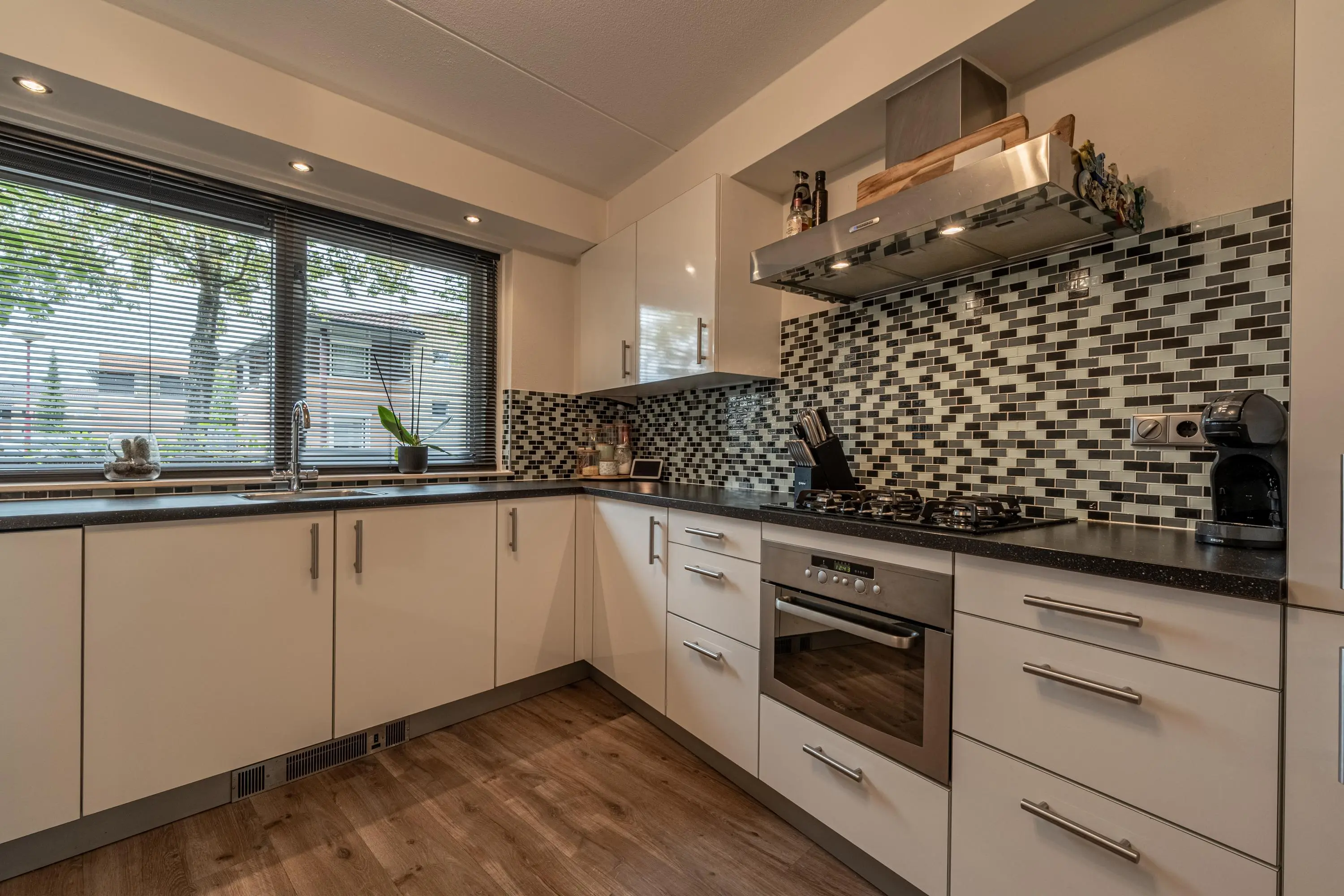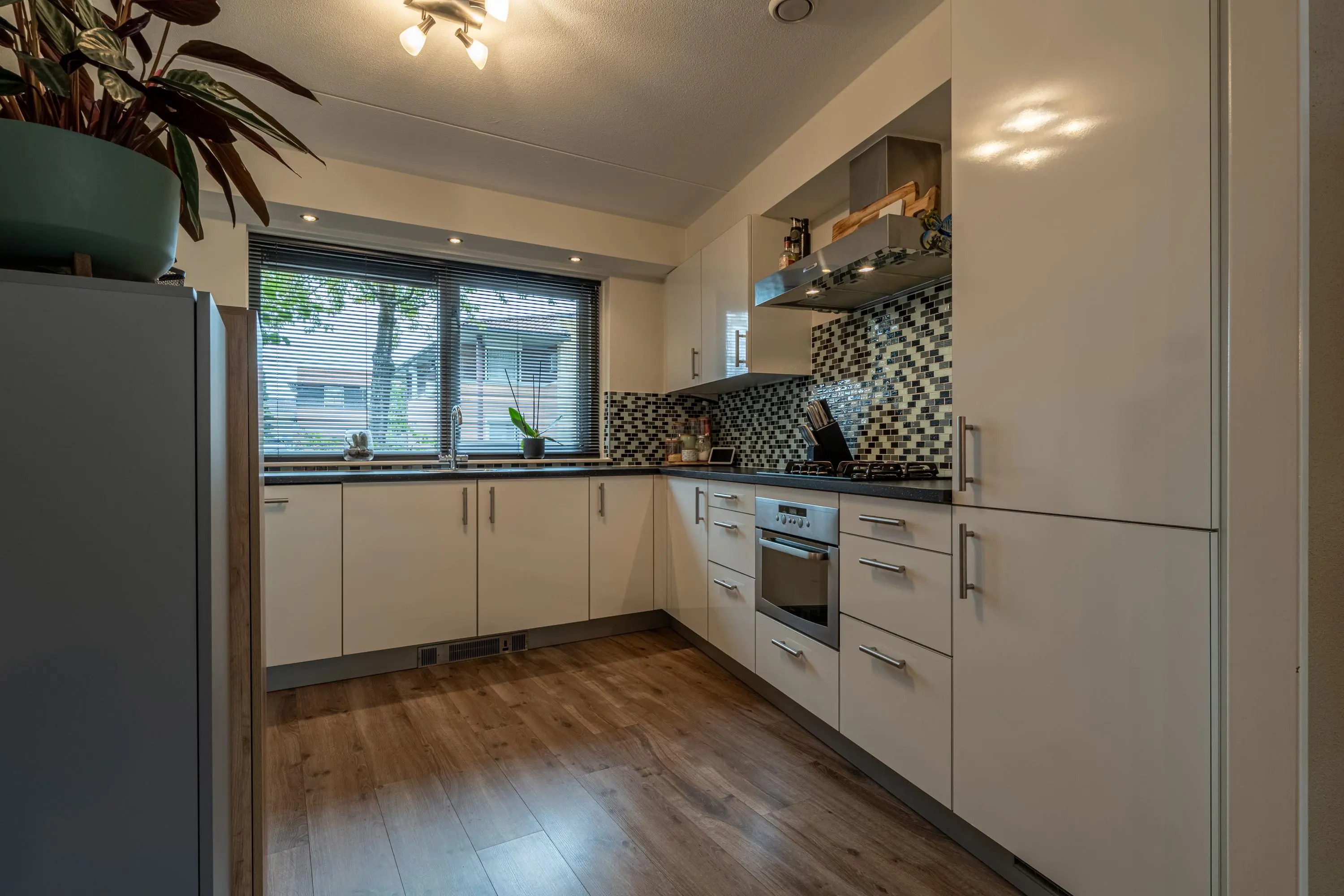 De open keuken is aan de voorzijde van de ruime woning gelegen en is voorzien van een nette hoekopstelling met inbouwapparatuur, zoals een vaatwasser (2022), combimagnetron, 4-pits gas-op-glas kookcomfort en koel-/ vriescombinatie.