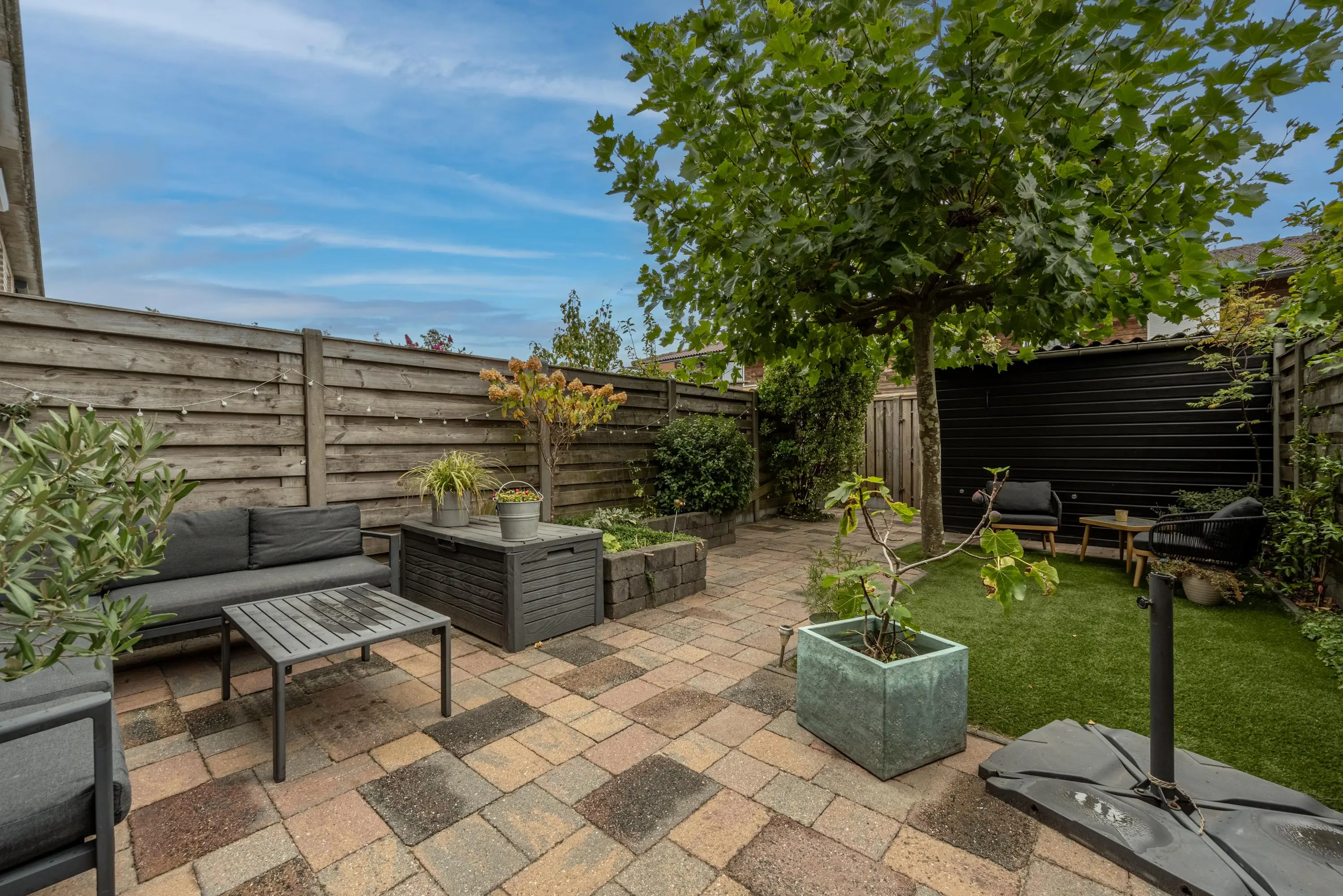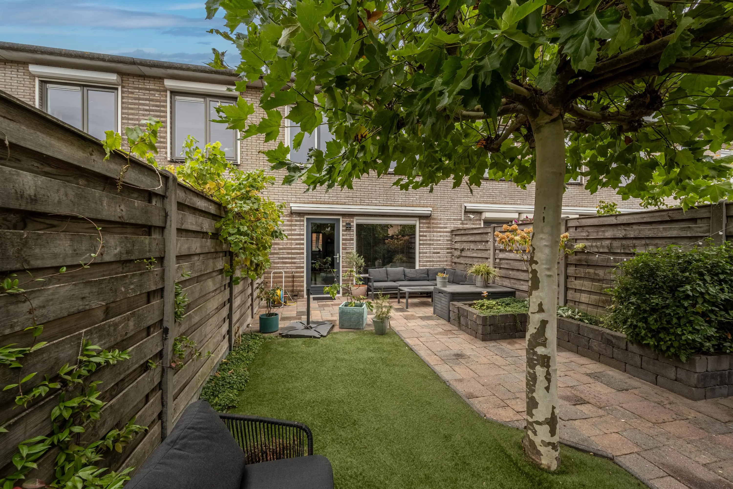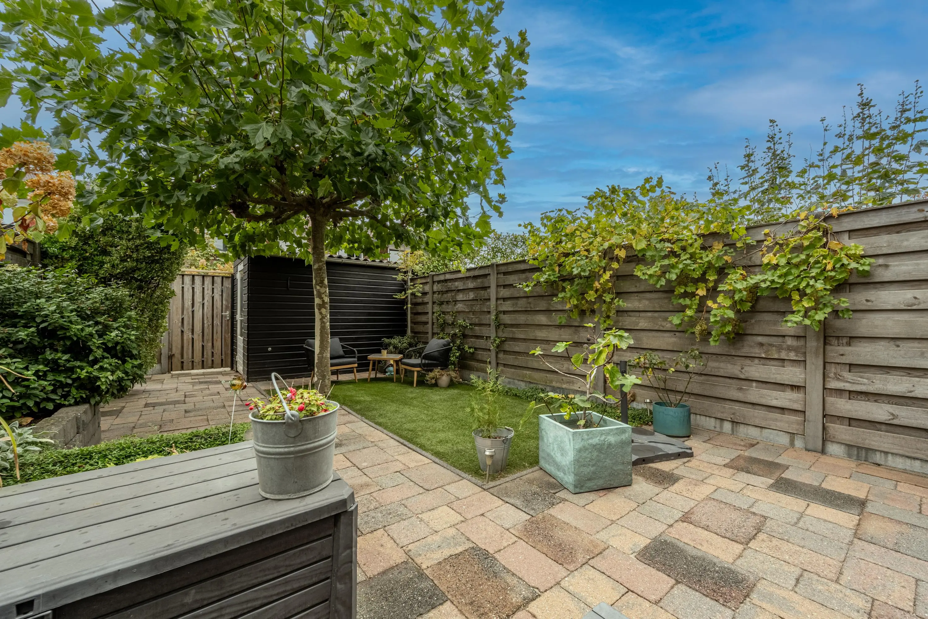 De achtertuin is gelegen op het zonnige zuiden en voorzien van een groot terras, gazon van kunstgras, houten schuttingen, waterkraan, zonnescherm en een houten berging. Via een houten poort is het achtergelegen pad bereikbaar.