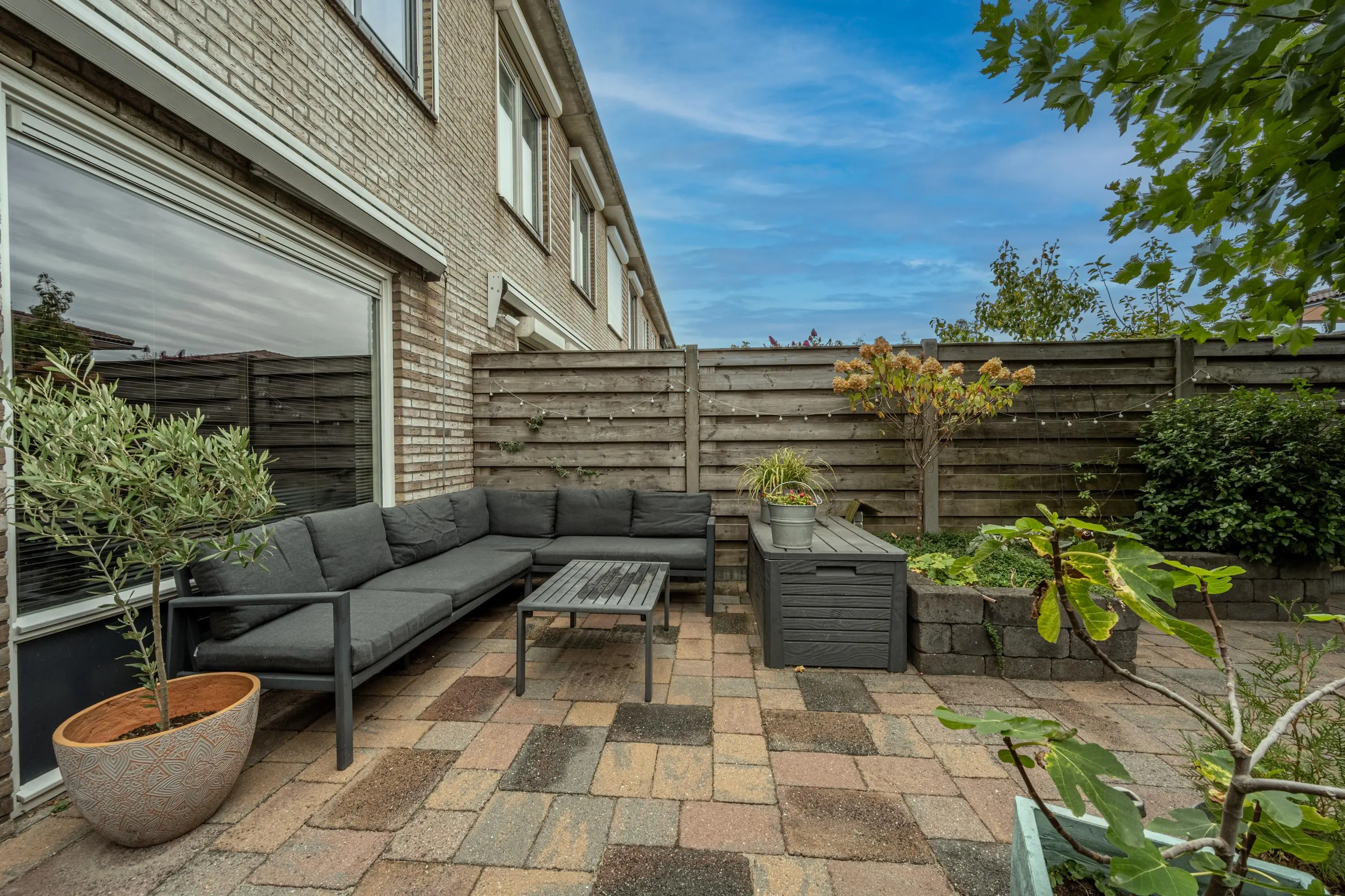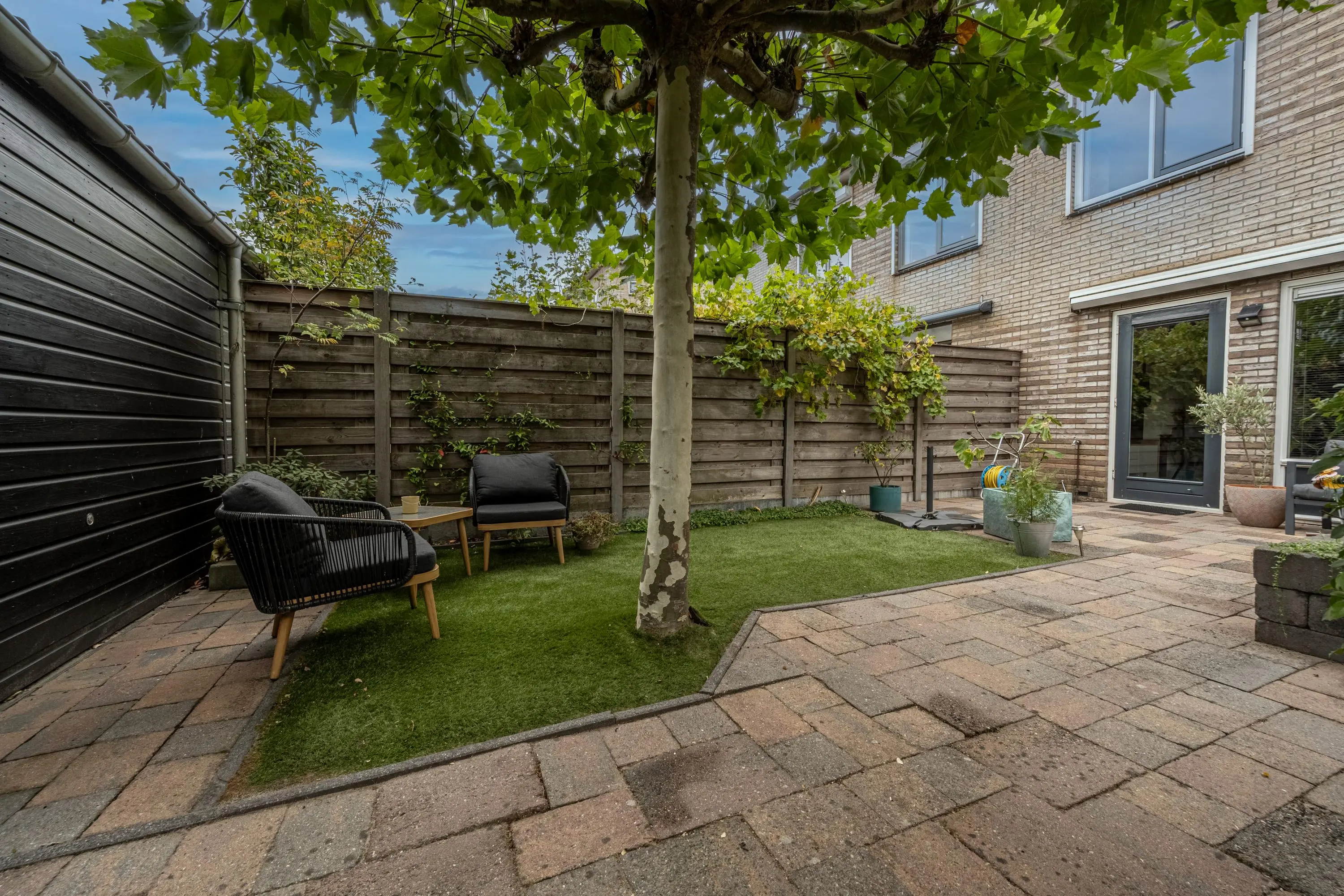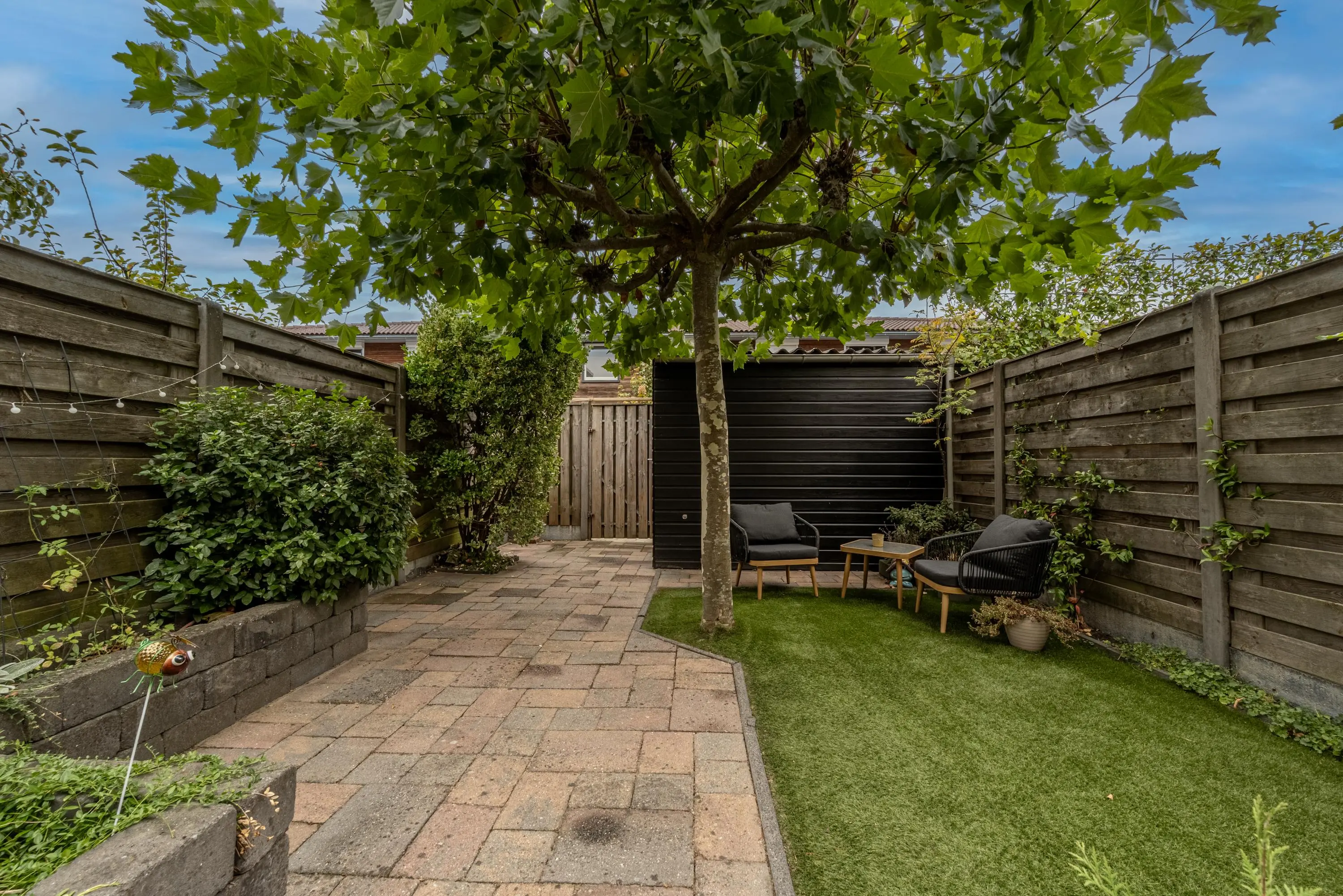 De achtertuin is gelegen op het zonnige zuiden en voorzien van een groot terras, gazon van kunstgras, houten schuttingen, waterkraan, zonnescherm en een houten berging. Via een houten poort is het achtergelegen pad bereikbaar.