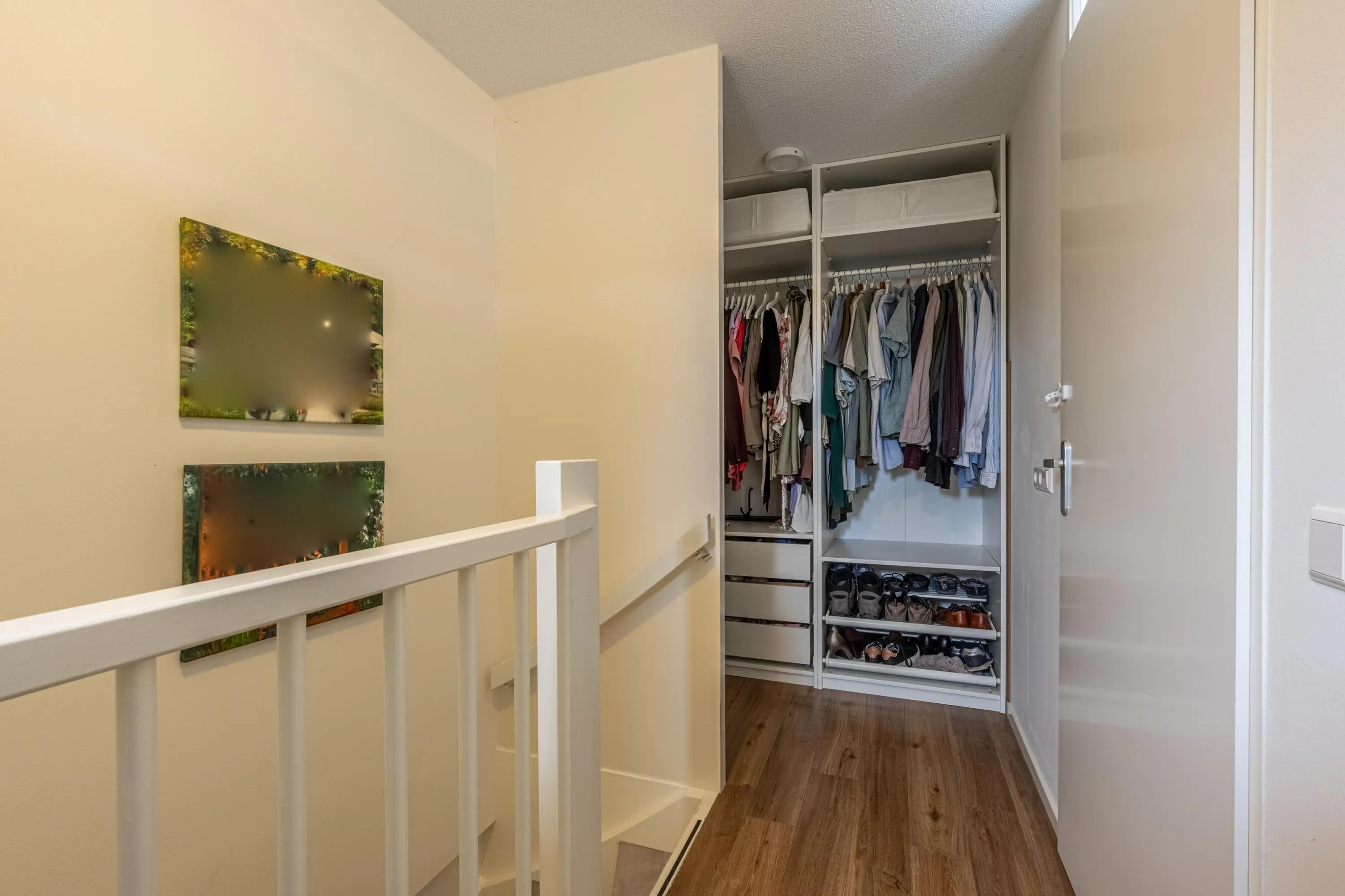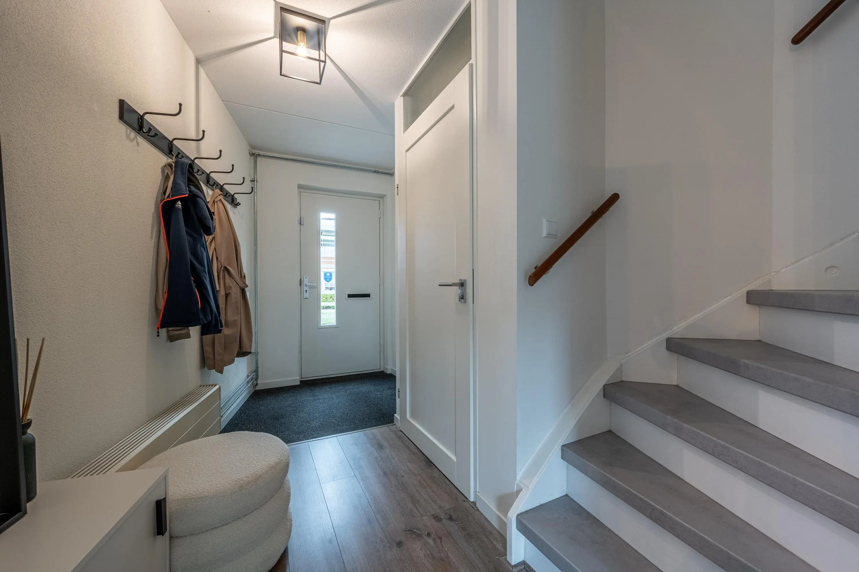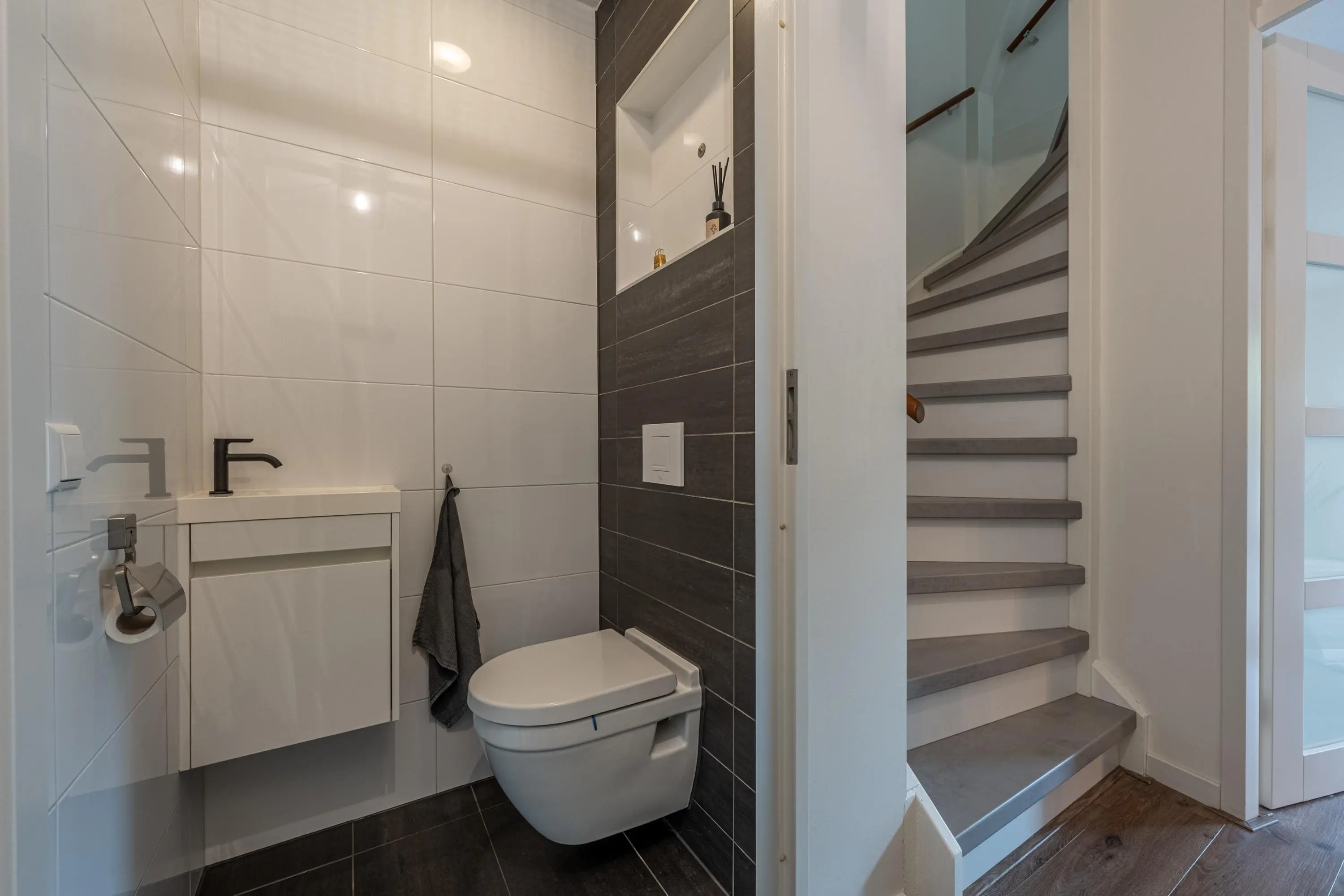 Entree, hal met meterkast, moderne toiletruimte met volledige betegeling, zwevend toilet en een fonteintje met meubel. De gerenoveerde trapopgang (2025) naar de eerste verdieping en toegang tot de fijne en tuingerichte woonkamer.