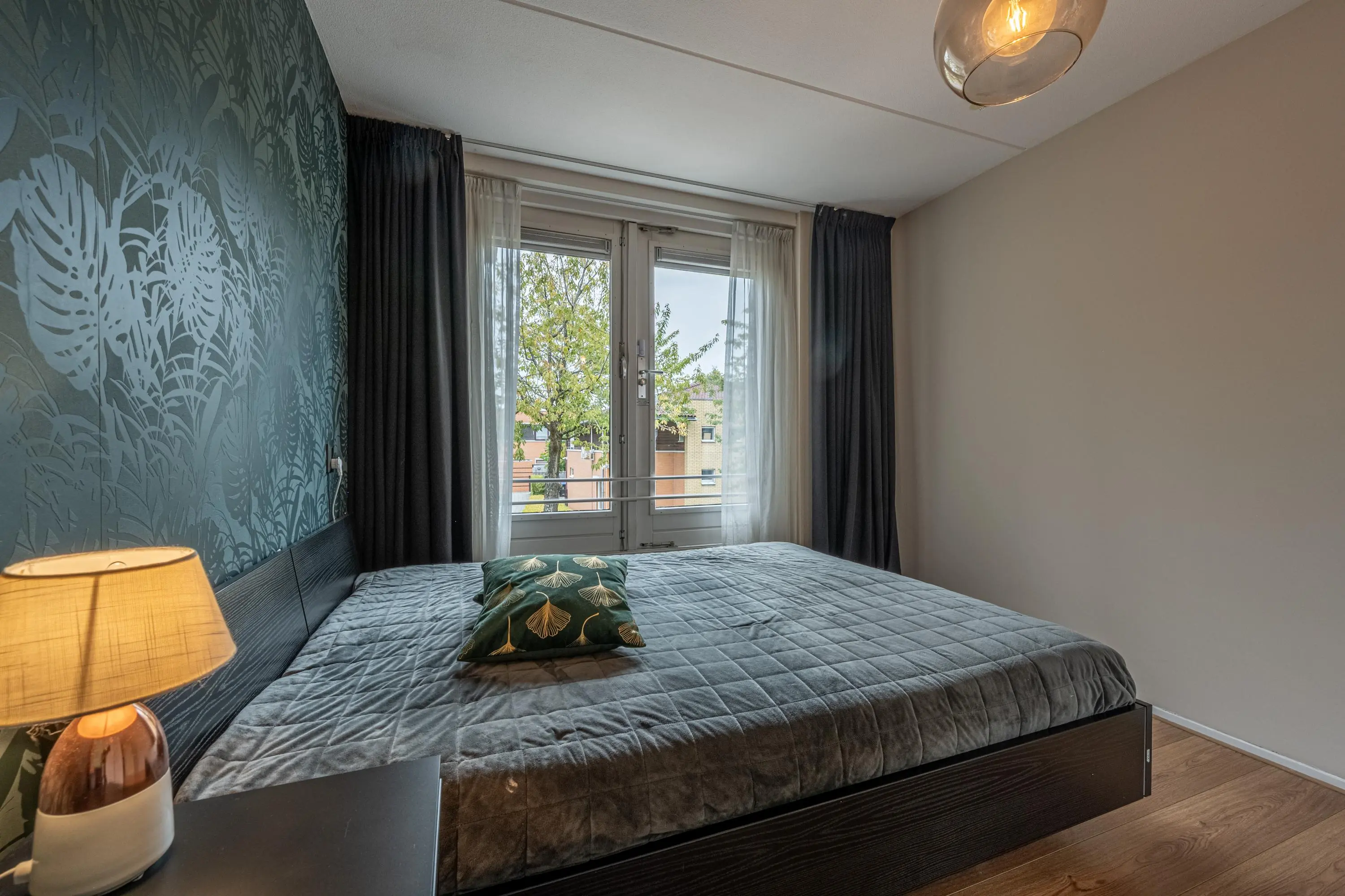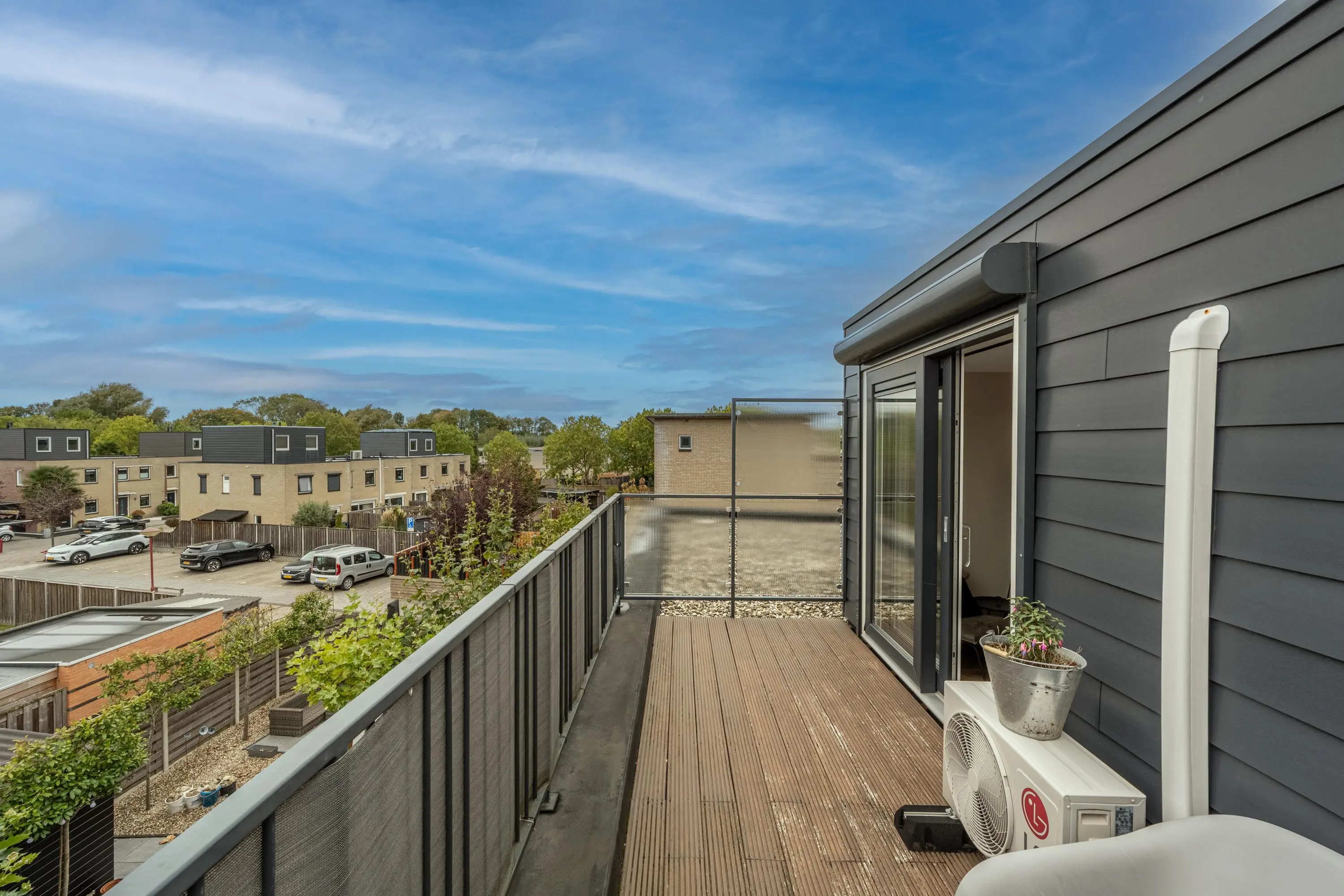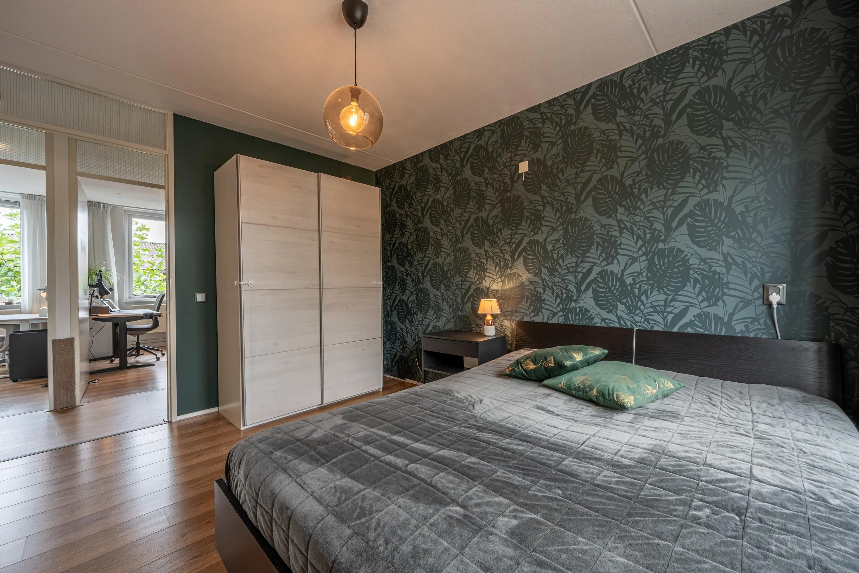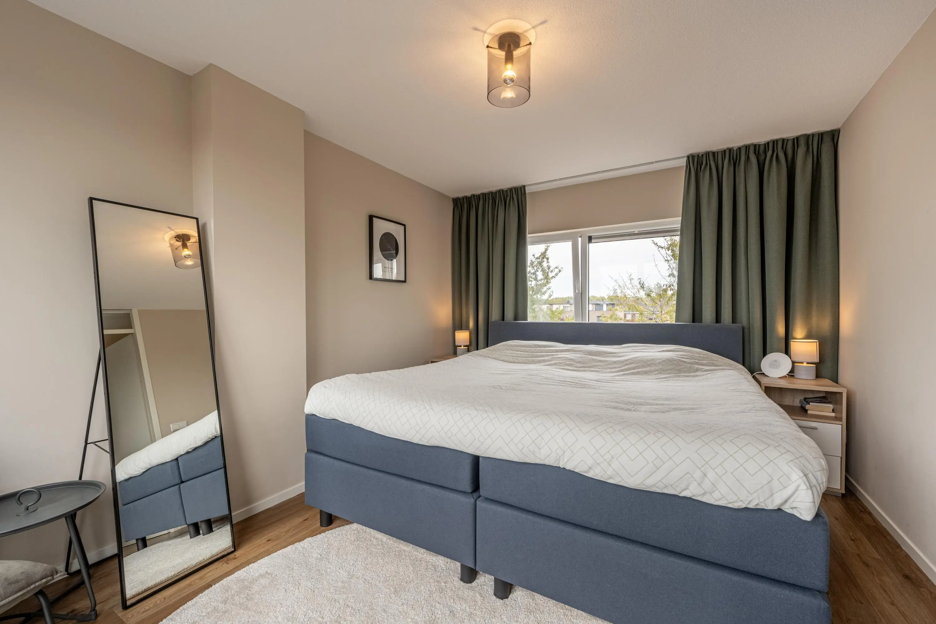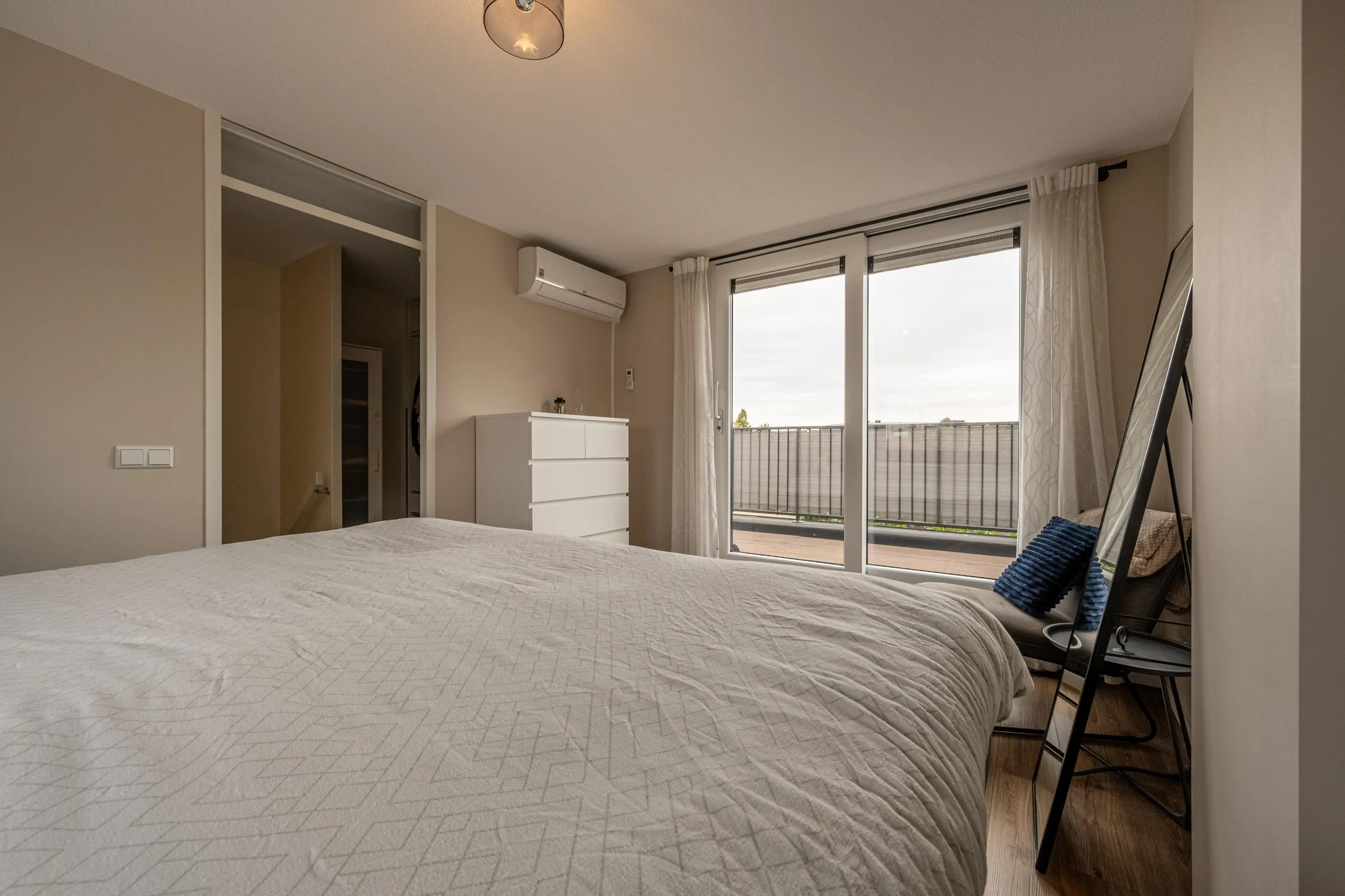 De riante slaapkamer met airconditioning heeft een groot raampartij aan de voorzijde en een schuifpui naar de achterzijde, waar gebruik wordt gemaakt van een zonneterras.