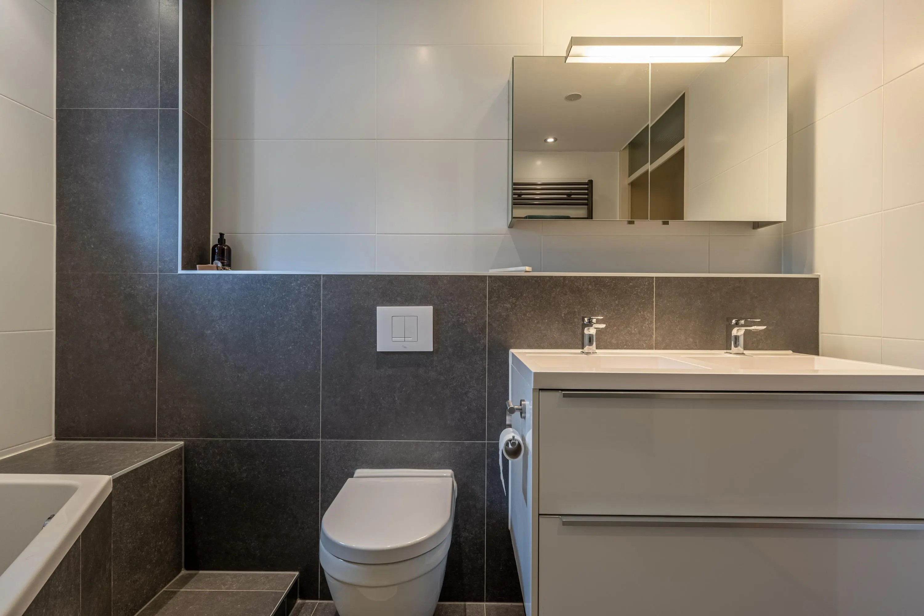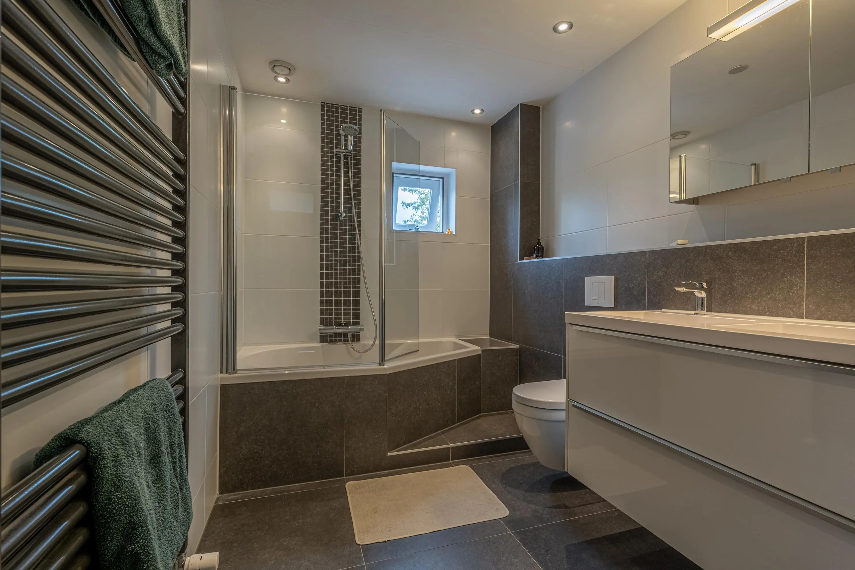 De fraaie badkamer heeft lichte en grijze wand-/vloertegels en is compleet voorzien van een zwevend toilet, een breed wastafelmeubel met dubbele kranen, een ligbad met douche en spatscherm. De inbouwspots en -speakers met bluetooth maken de badkamer op stijlvolle wijze af.