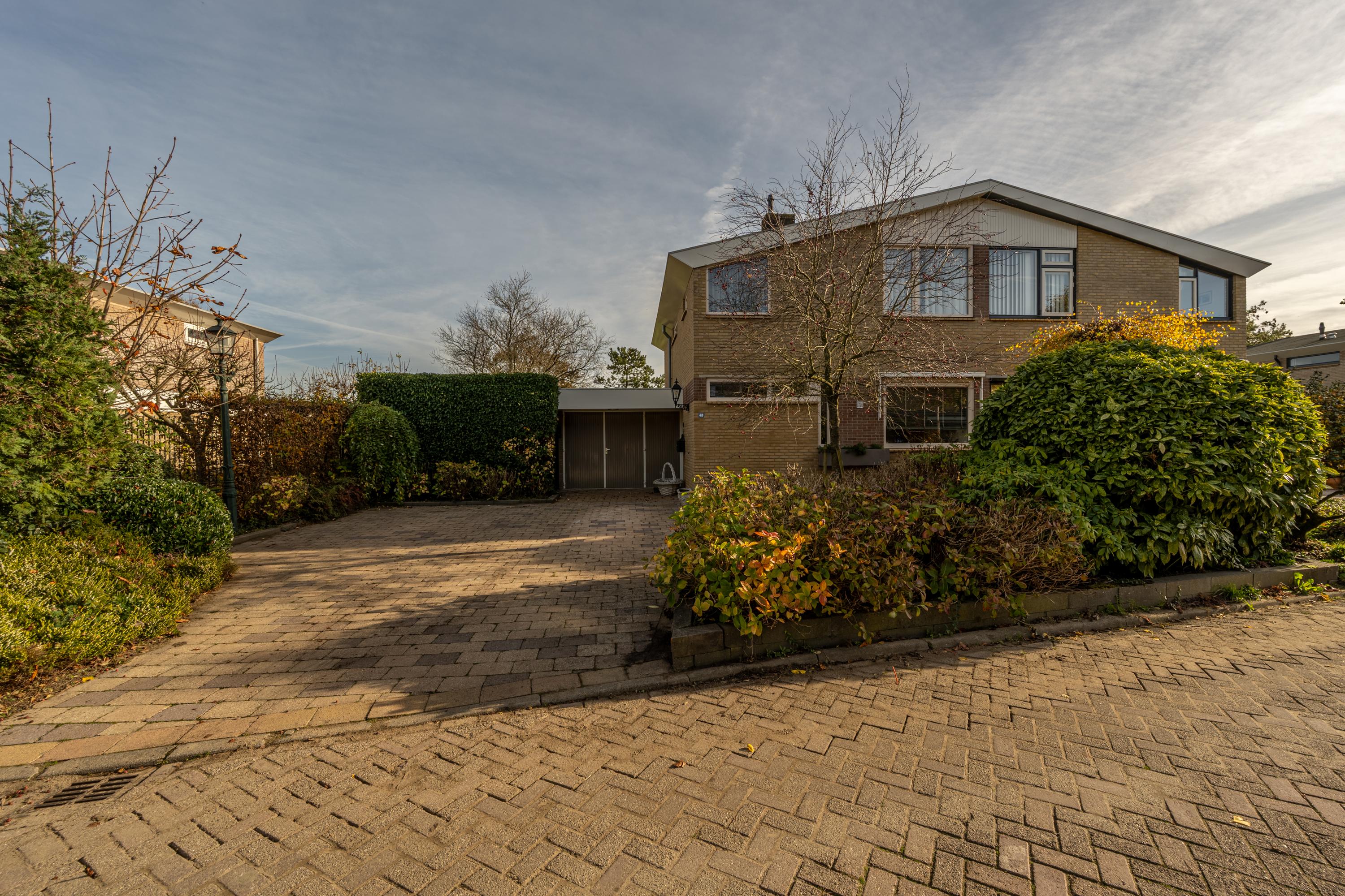 De voortuin is fraai ingericht met sierbestrating en diverse beplanting en biedt ruimte voor het parkeren van een auto op eigen terrein.