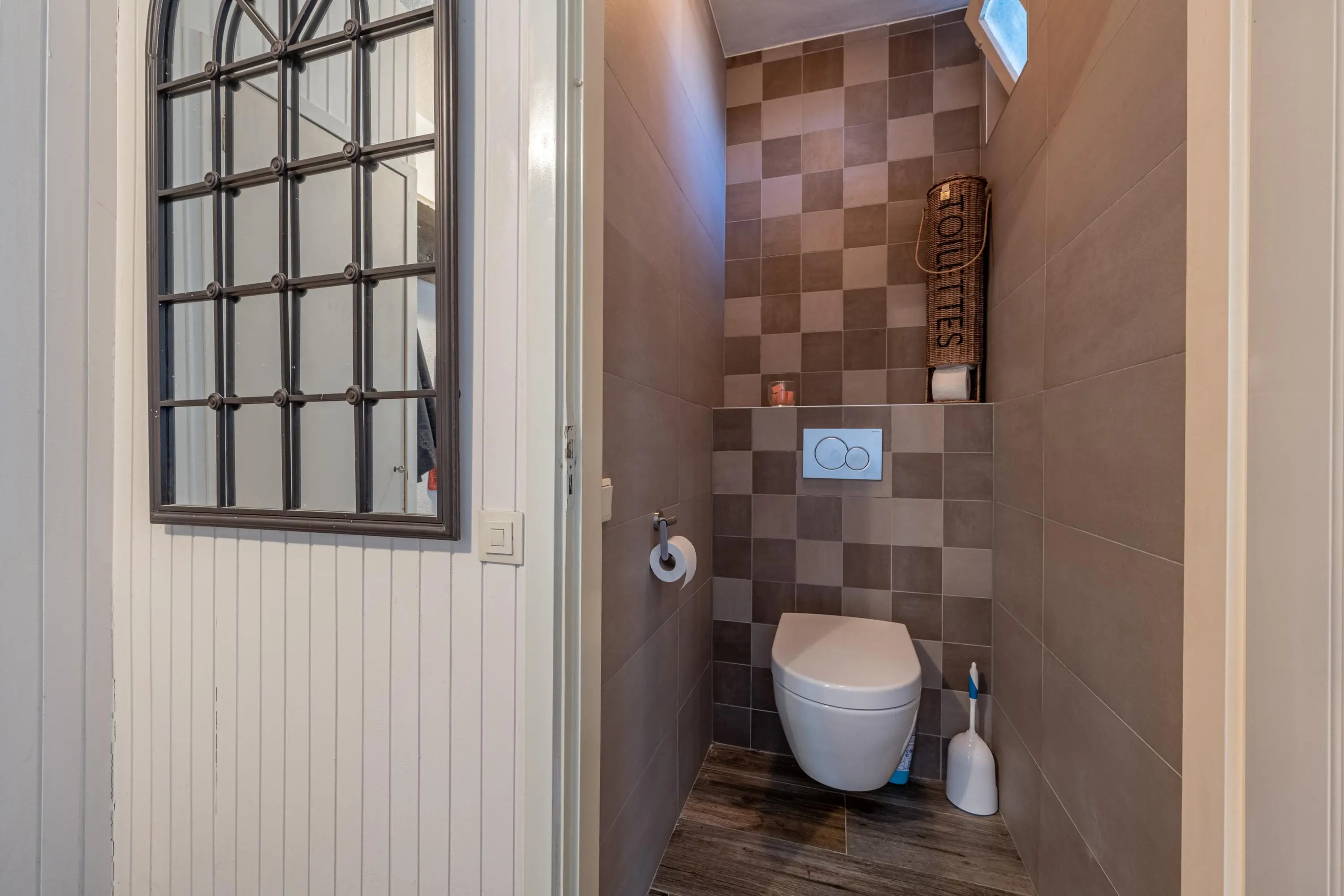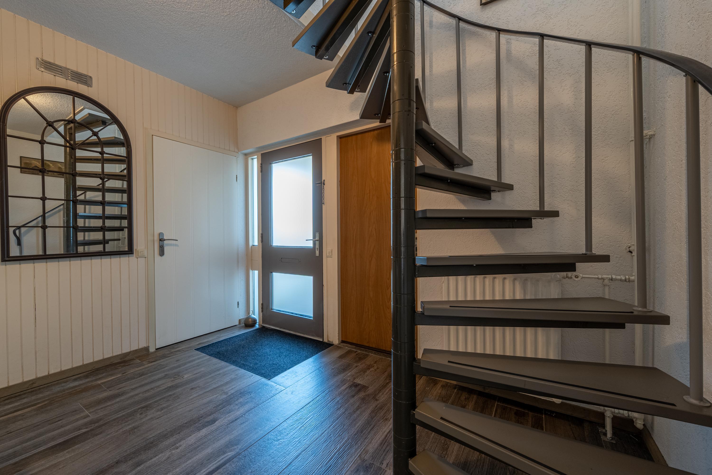 Via de ruime entree met garderobe, meterkast en moderne toiletruimte met zwevend toilet is er toegang tot zowel de living als de garage.