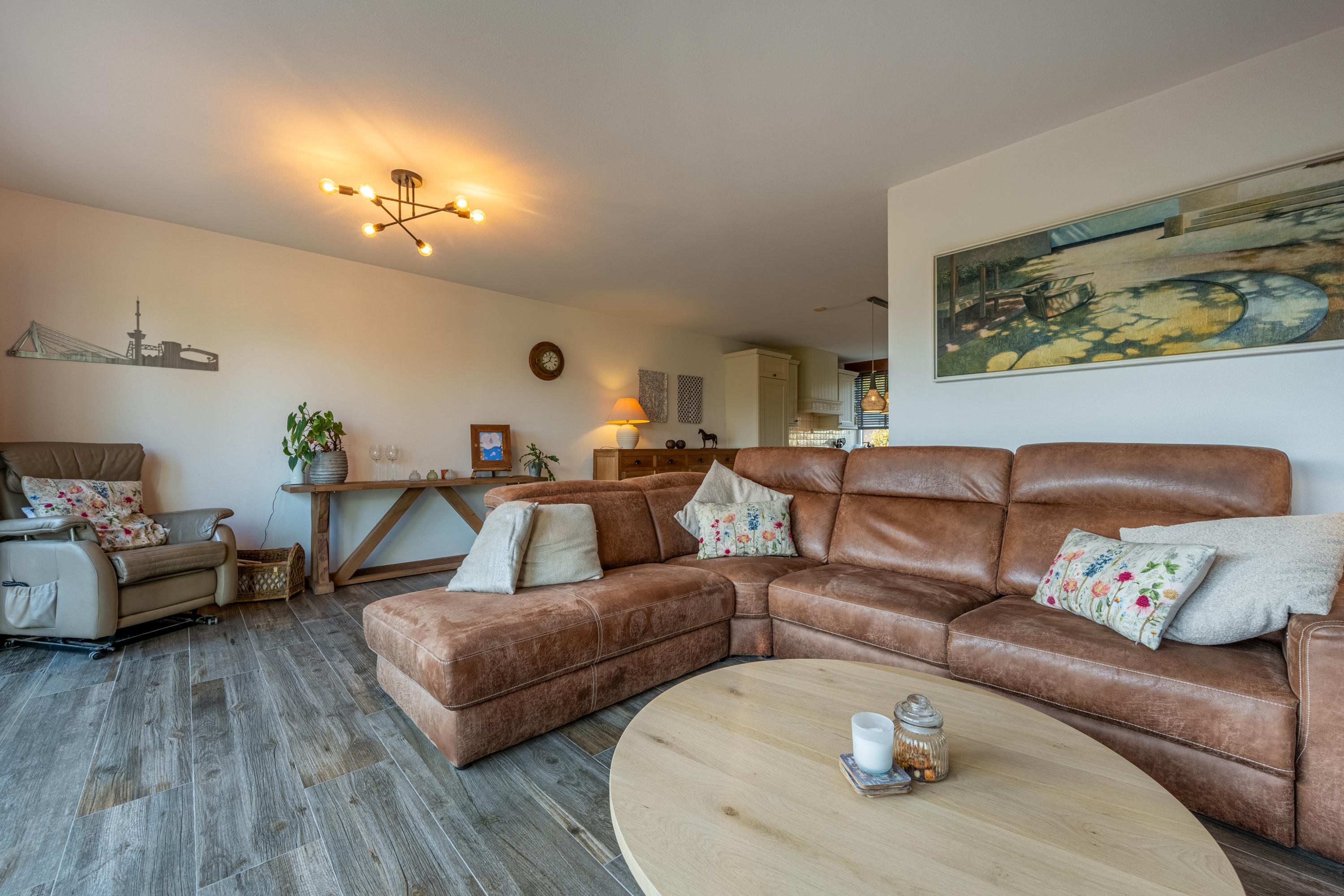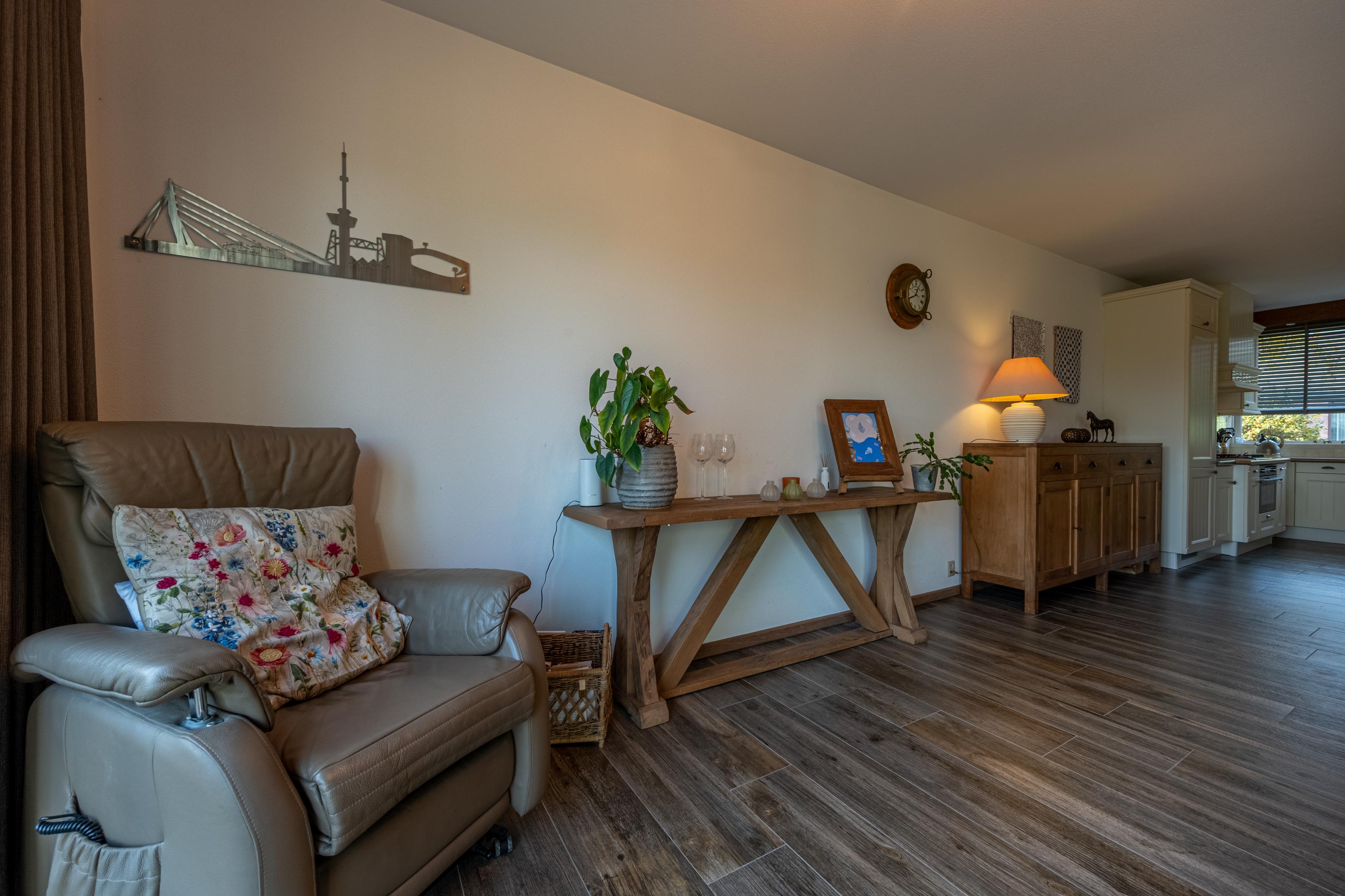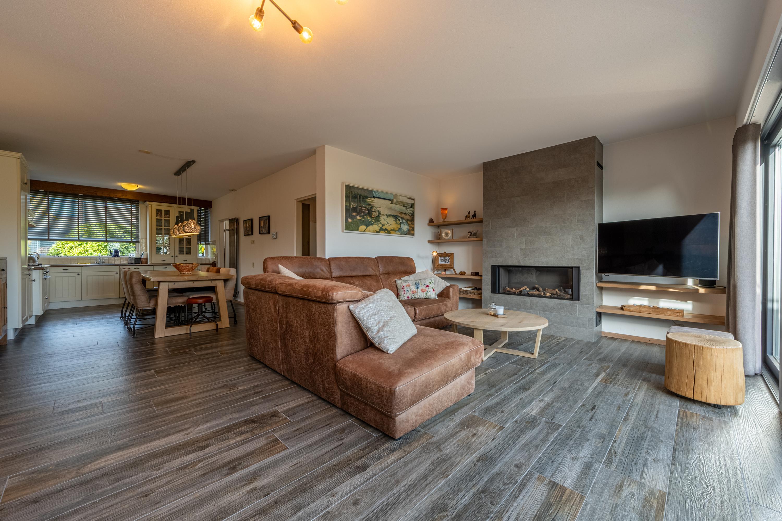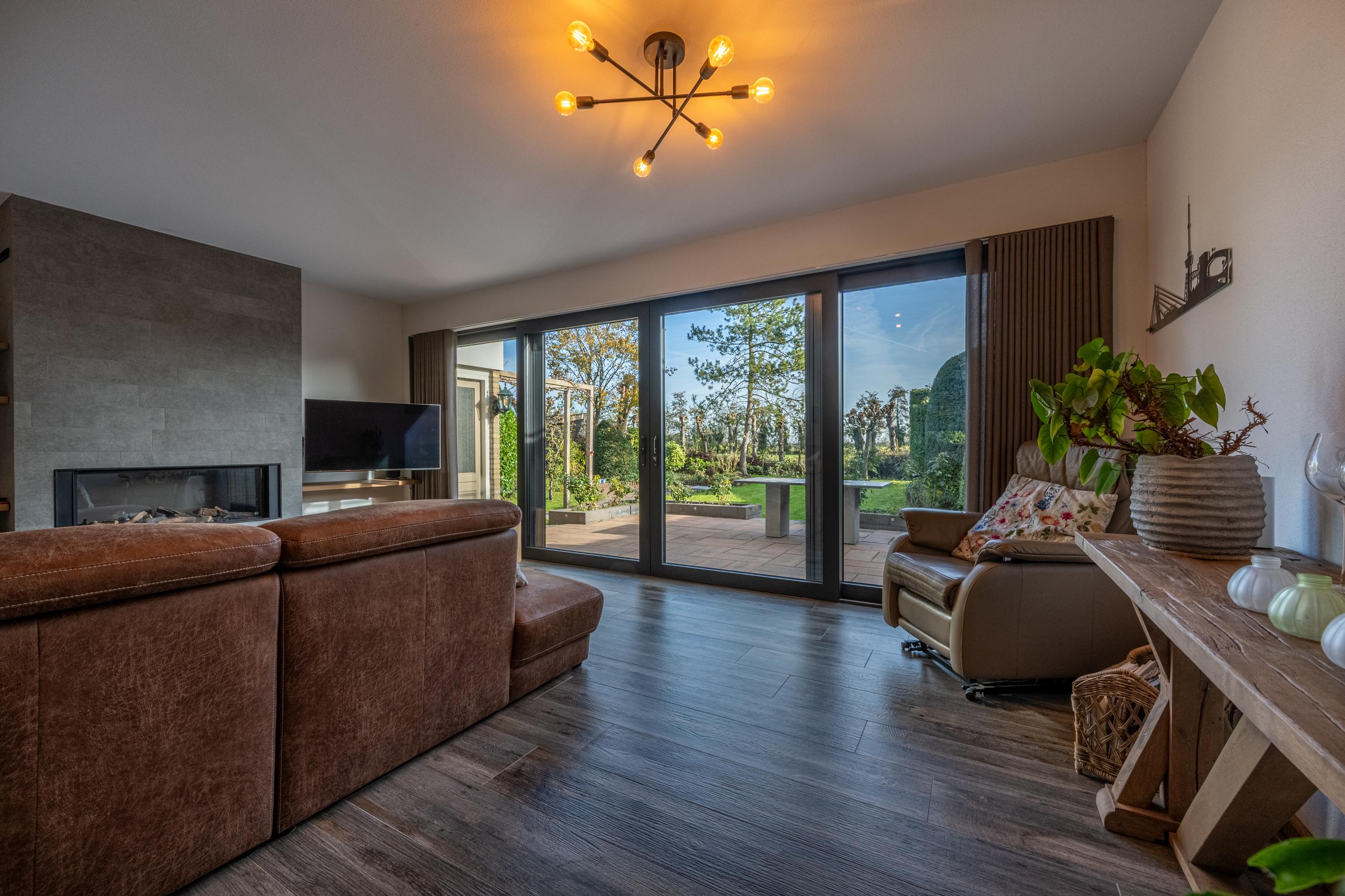 Het zitgedeelte is gesitueerd aan de achterzijde van de woning en valt op door de brede aluminium schuifpui, het fraaie lichtinval en de sfeervolle gashaard. Vanuit hier is er prettig zicht op de tuin.