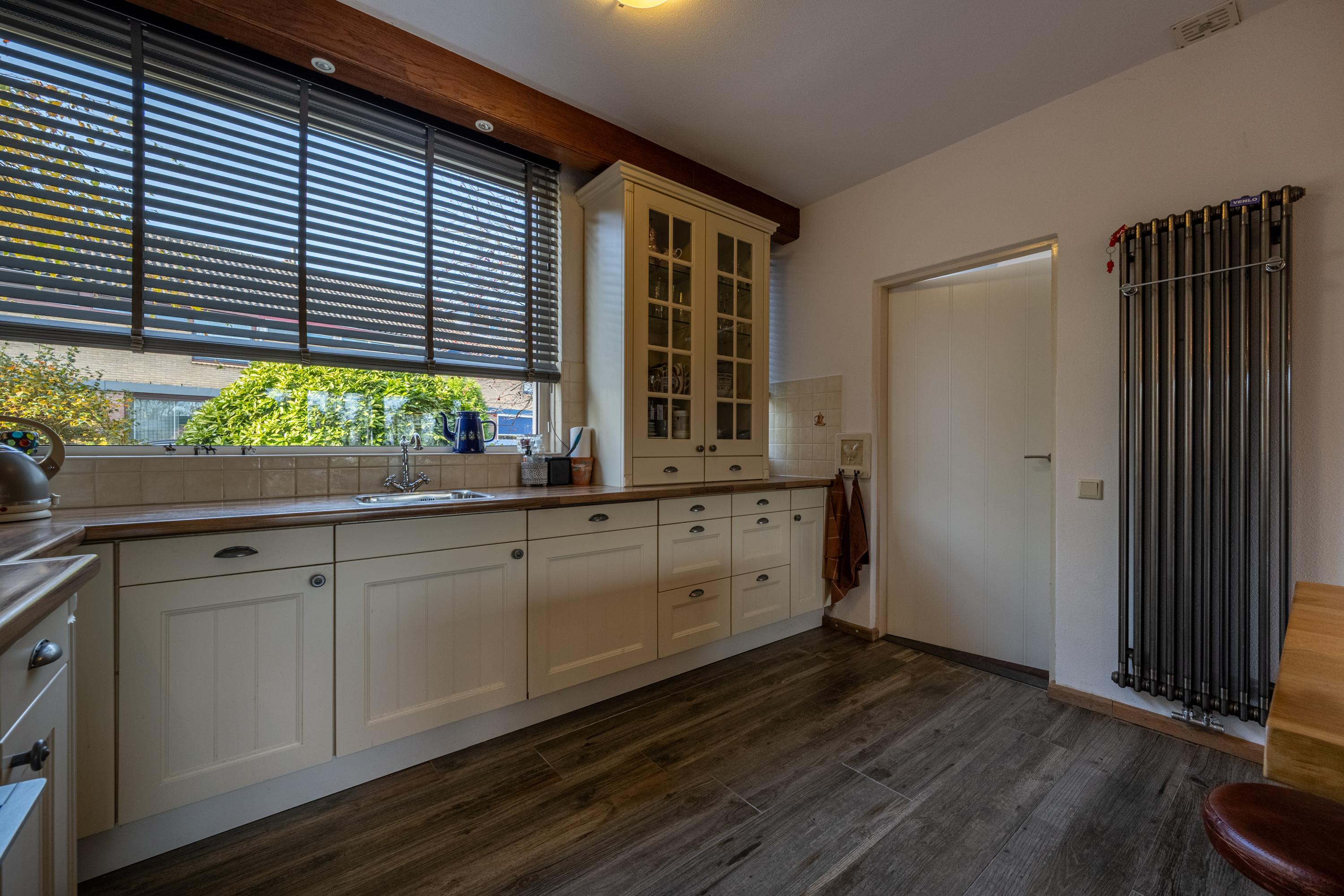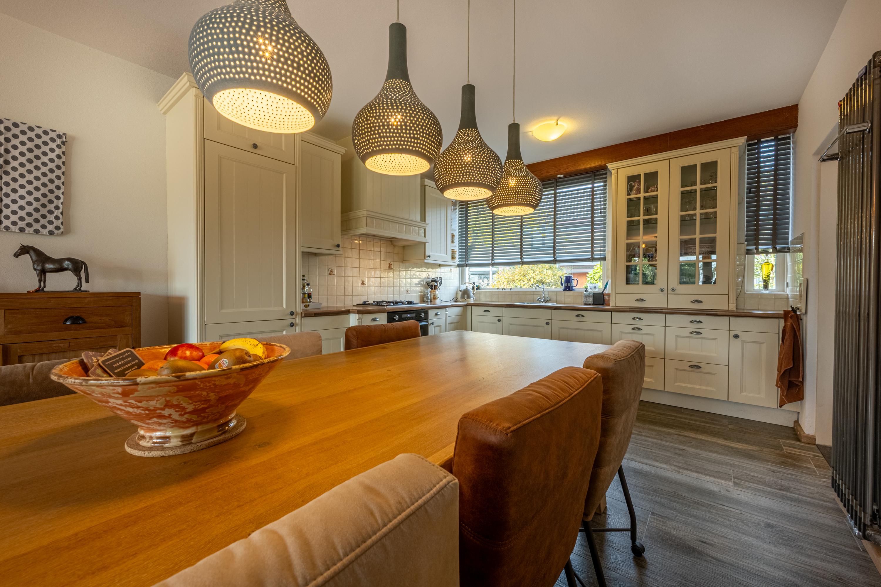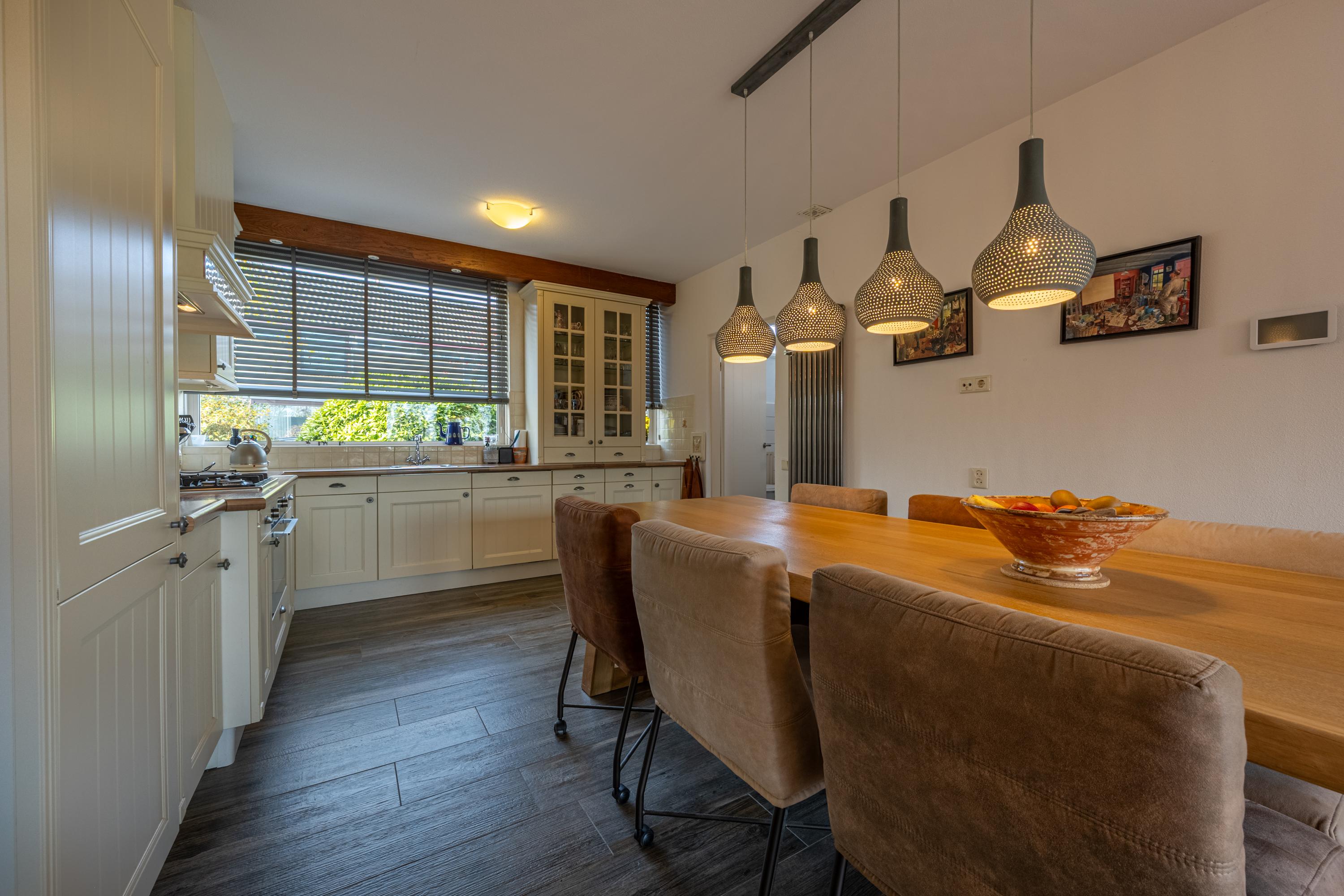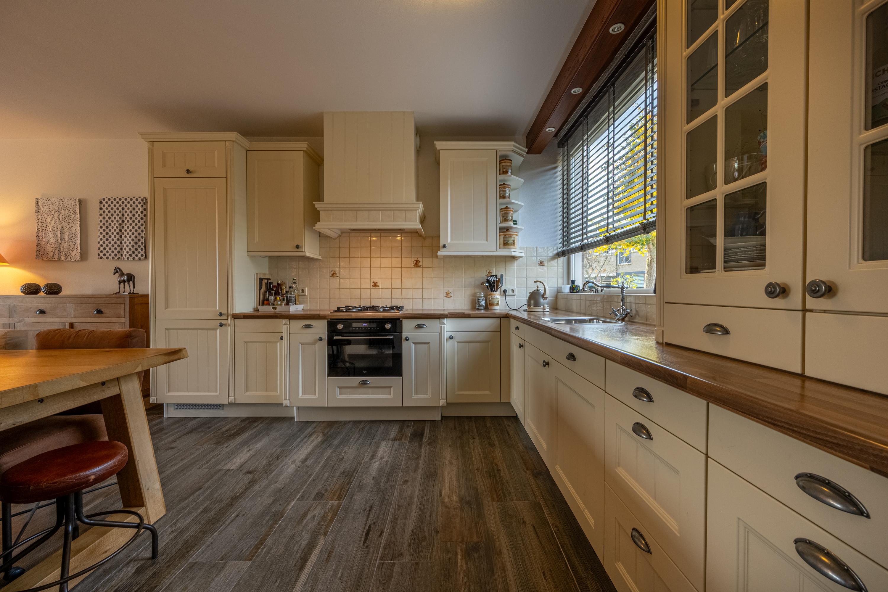 De keuken bevindt zich aan de voorzijde van de woning en is uitgevoerd in een lichte hoekopstelling met een klassiek-landelijke uitstraling. De keuken beschikt over diverse inbouwapparatuur, waaronder een koel-/vriescombinatie, 4-pits gaskookplaat, afzuigschouw, oven en vaatwasser. Vanuit de keuken is tevens de bijkeuken bereikbaar, waar zich de aansluitingen voor wasmachine en droger bevinden, evenals de opstelplaats van de cv-combiketel.